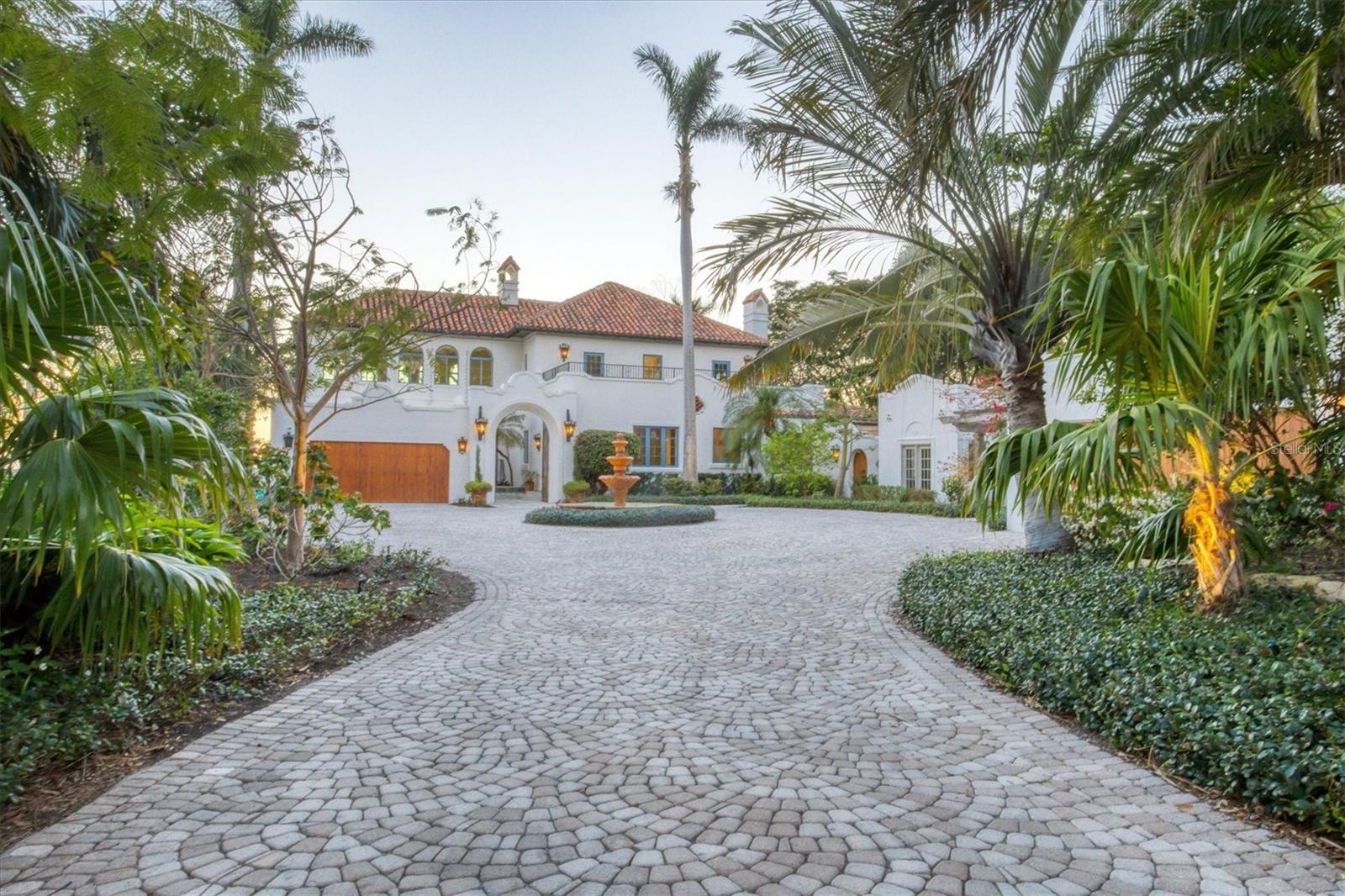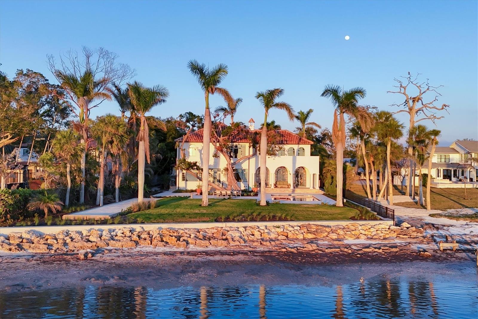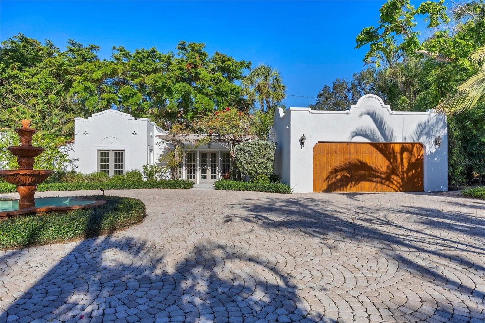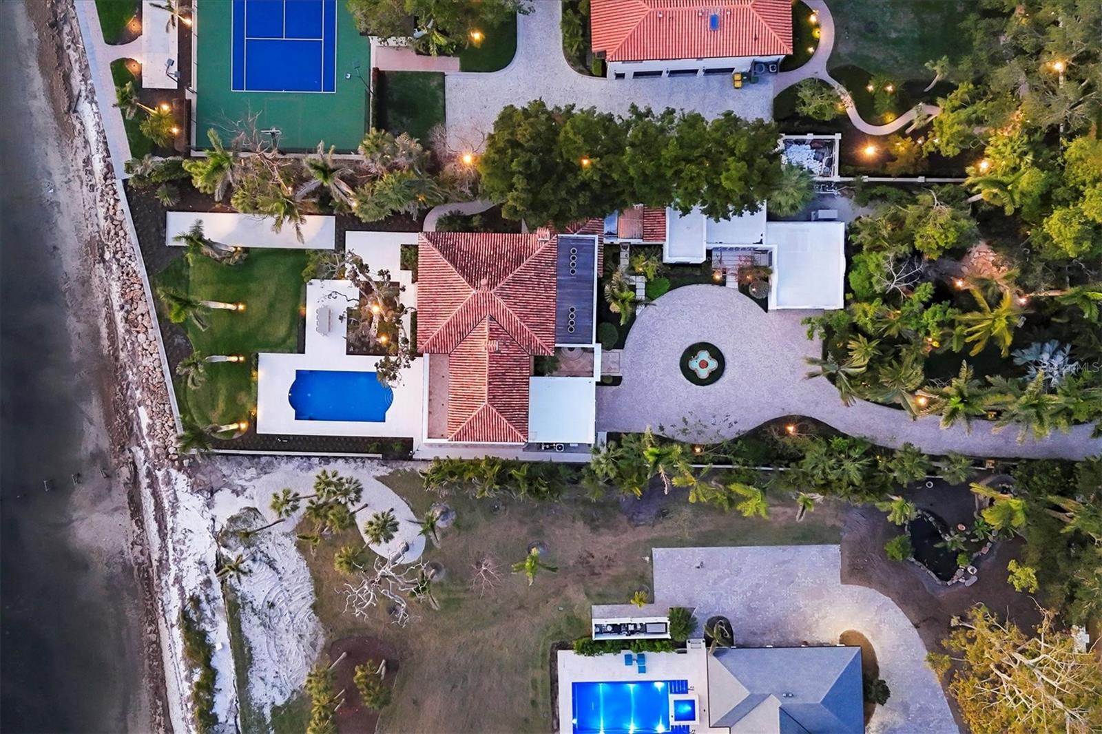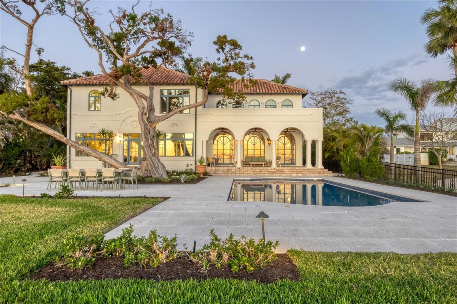 Nestled on nearly three-quarters of an acre, this meticulously updated 1925 Mediterranean Revival residence offers breathtaking, panoramic views of Sarasota Bay, encompassing the downtown skyline, Ringling Bridge and the northern tip of Longboat Key. While preserving its historic charm and original elegance, the home seamlessly integrates modern upgrades designed for both gracious living and entertaining. Upon entering through the gated entry, visitors are greeted by a serene garden with a koi pond and a spacious circular driveway featuring a central fountain, providing ample parking. The gated courtyard leads to a welcoming foyer, which serves as a gateway to the home’s expansive living spaces. To one side lies the formal living room, adorned with a coffered ceiling and an ornate fireplace, while the opposite side reveals a newly renovated kitchen, thoughtfully designed with a Sub-Zero refrigerator, AGA induction range, dolomite countertops, galley sinks and a cozy breakfast area. The formal dining room is perfect for hosting friends and family, offering bay views, a hand-painted recessed ceiling, a marble fireplace and custom built-ins for storage, display and serving. Adjacent to the dining room, the office/den provides tranquil spaces with views of the pool and bay. The great room, with its soaring ceilings, stately fireplace and 10-foot arched doors creates a stunning venue for entertaining, flowing effortlessly onto a spacious covered terrace perfect for sunset views. The second floor boasts three generously sized en-suite bedrooms, each with access to private terraces that showcase captivating vistas. The primary suite, completely reimagined in 2021, epitomizes luxury and relaxation with a custom-trimmed ceiling, a large window for endless Gulf of Mexico views, two French doors leading to an expansive terrace and a custom-organized walk-in closet. The primary bathroom is a retreat with an oversized walk-in shower, floating vanity, a free-standing soaking tub and stunning details and finishes throughout. Designed by renowned landscape architect Michael Gilkey, the grounds have been transformed into distinct outdoor "rooms," featuring a bocce court, expansive patios and a beautifully tiled, heated pool. A charming guesthouse, located adjacent to one of the two two-car garages, includes two rooms, two bathrooms and a kitchenette. With a pocket door, the space can be configured as two separate en-suite bedrooms for ultimate flexibility. Additional enhancements include updated HVAC systems, air conditioning for the garages, upgraded electrical systems, LED and Lutron lighting and hurricane-impact windows and doors. Conveniently located in Indian Beach and Sapphire Shores, this residence is close to downtown Sarasota, SRQ Airport and numerous dining and shopping options. Known as Casa Arula, this remarkable property harmoniously blends historical significance with modern sophistication, creating a truly exceptional place to call home.