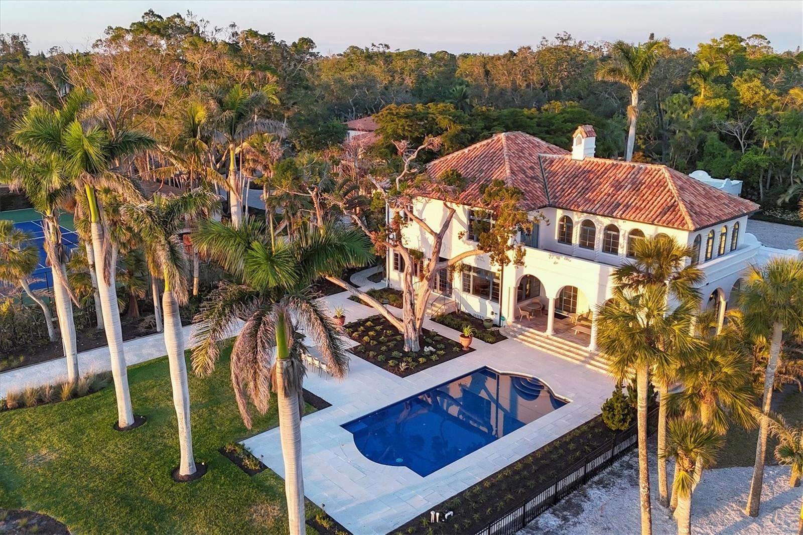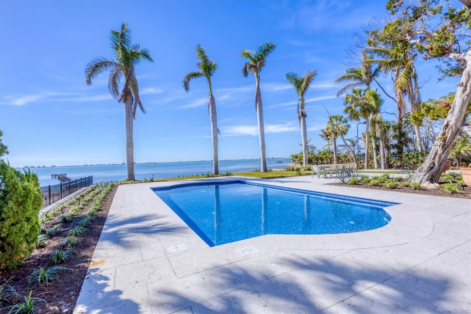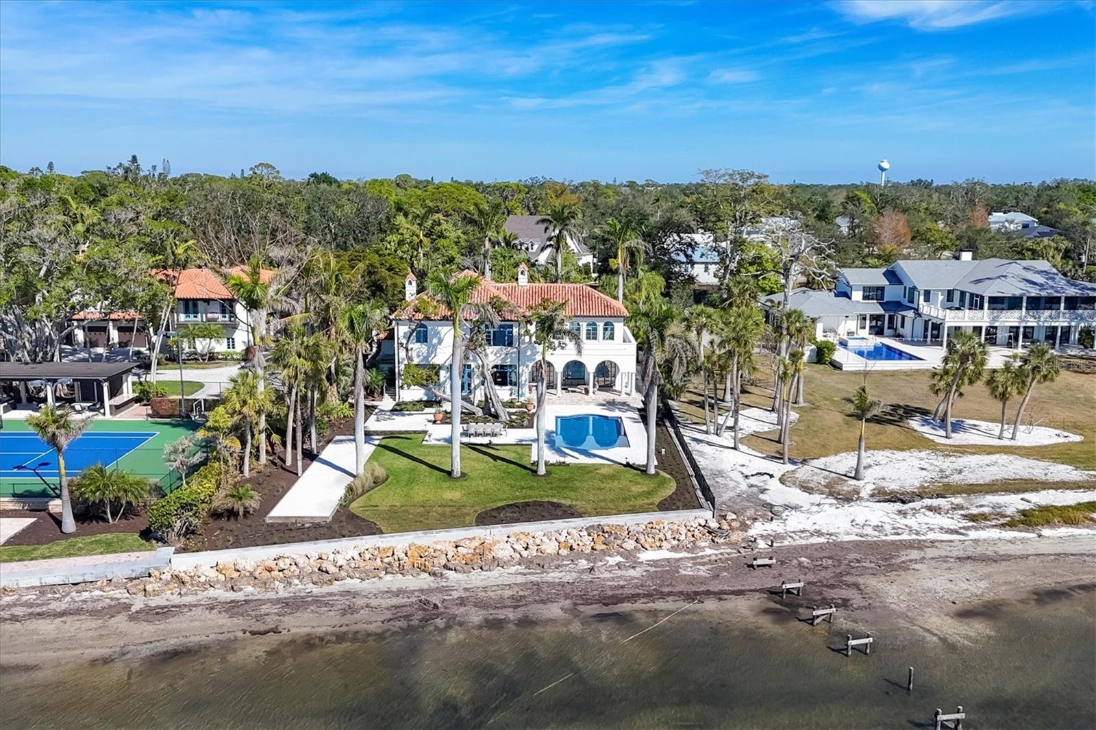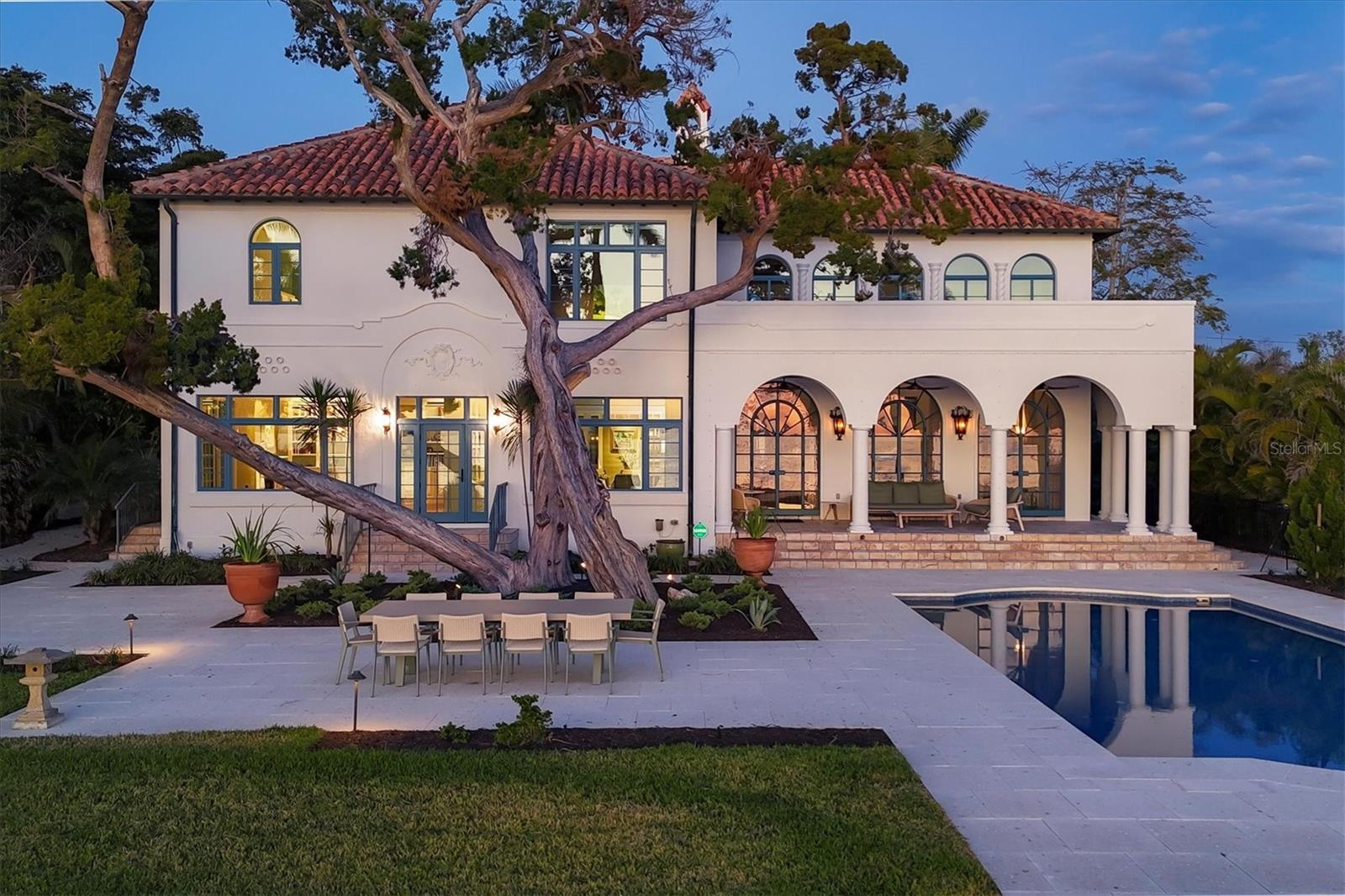 Nestled on nearly three-quarters of an acre, this meticulously updated 1925 Mediterranean Revival residence offers breathtaking, panoramic views of Sarasota Bay, encompassing the downtown skyline, Ringling Bridge and the northern tip of Longboat Key. While preserving its historic charm and original elegance, the home seamlessly integrates modern upgrades designed for both gracious living and entertaining. Upon entering through the gated entry, visitors are greeted by a serene garden with a koi pond and a spacious circular driveway featuring a central fountain, providing ample parking. The gated courtyard leads to a welcoming foyer, which serves as a gateway to the home’s expansive living spaces. To one side lies the formal living room, adorned with a coffered ceiling and an ornate fireplace, while the opposite side reveals a newly renovated kitchen, thoughtfully designed with a Sub-Zero refrigerator, AGA induction range, dolomite countertops, galley sinks and a cozy breakfast area. The formal dining room is perfect for hosting friends and family, offering bay views, a hand-painted recessed ceiling, a marble fireplace and custom built-ins for storage, display and serving. Adjacent to the dining room, the office/den provides tranquil spaces with views of the pool and bay. The great room, with its soaring ceilings, stately fireplace and 10-foot arched doors creates a stunning venue for entertaining, flowing effortlessly onto a spacious covered terrace perfect for sunset views. The second floor boasts three generously sized en-suite bedrooms, each with access to private terraces that showcase captivating vistas. The primary suite, completely reimagined in 2021, epitomizes luxury and relaxation with a custom-trimmed ceiling, a large window for endless Gulf of Mexico views, two French doors leading to an expansive terrace and a custom-organized walk-in closet. The primary bathroom is a retreat with an oversized walk-in shower, floating vanity, a free-standing soaking tub and stunning details and finishes throughout. Designed by renowned landscape architect Michael Gilkey, the grounds have been transformed into distinct outdoor "rooms," featuring a bocce court, expansive patios and a beautifully tiled, heated pool. A charming guesthouse, located adjacent to one of the two two-car garages, includes two rooms, two bathrooms and a kitchenette. With a pocket door, the space can be configured as two separate en-suite bedrooms for ultimate flexibility. Additional enhancements include updated HVAC systems, air conditioning for the garages, upgraded electrical systems, LED and Lutron lighting and hurricane-impact windows and doors. Conveniently located in Indian Beach and Sapphire Shores, this residence is close to downtown Sarasota, SRQ Airport and numerous dining and shopping options. Known as Casa Arula, this remarkable property harmoniously blends historical significance with modern sophistication, creating a truly exceptional place to call home.
