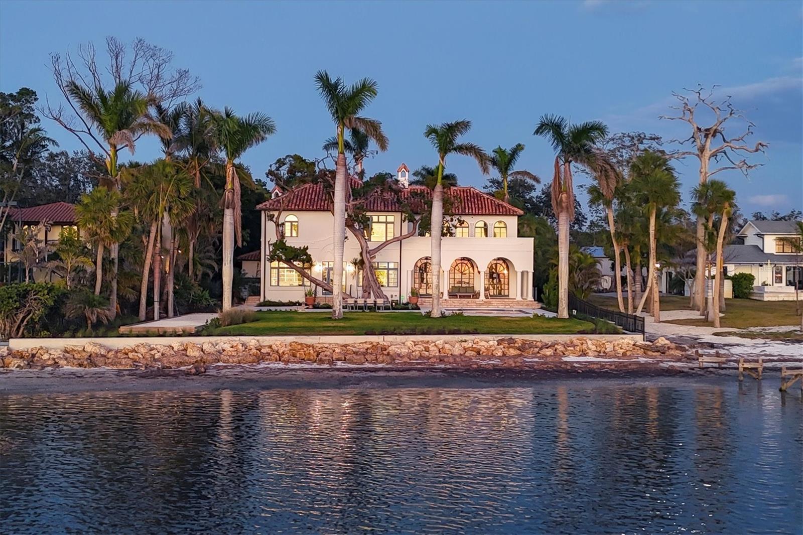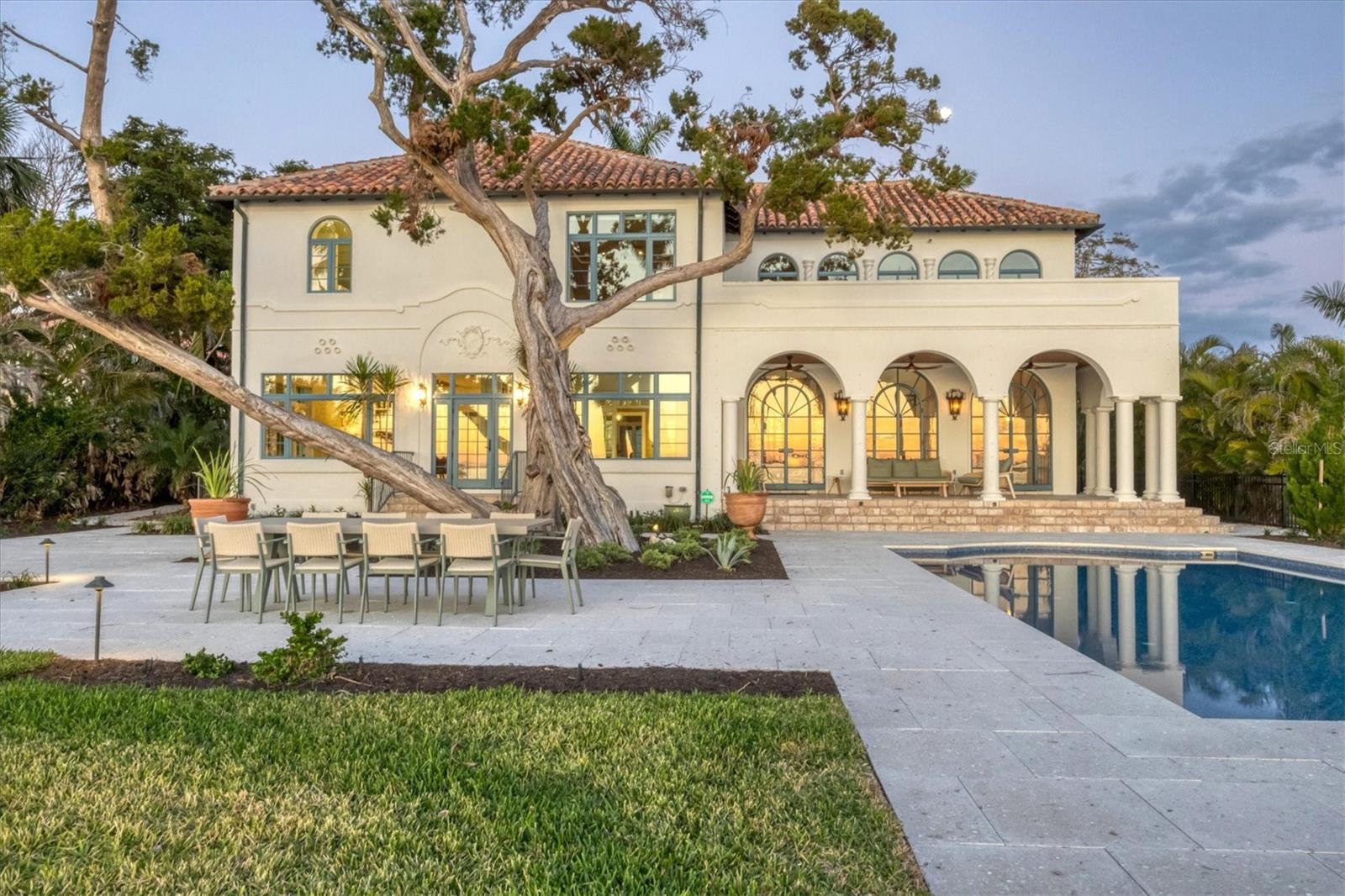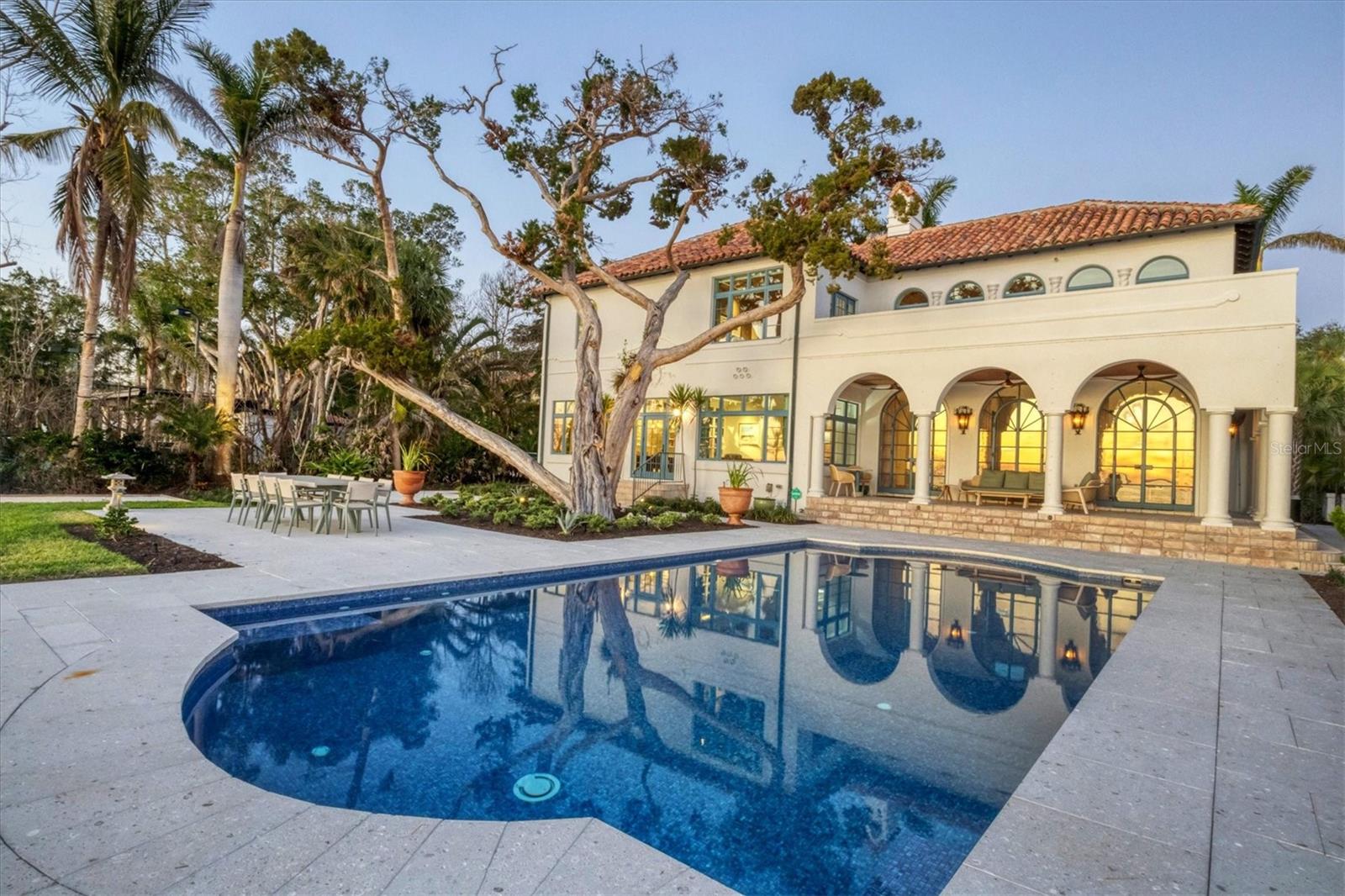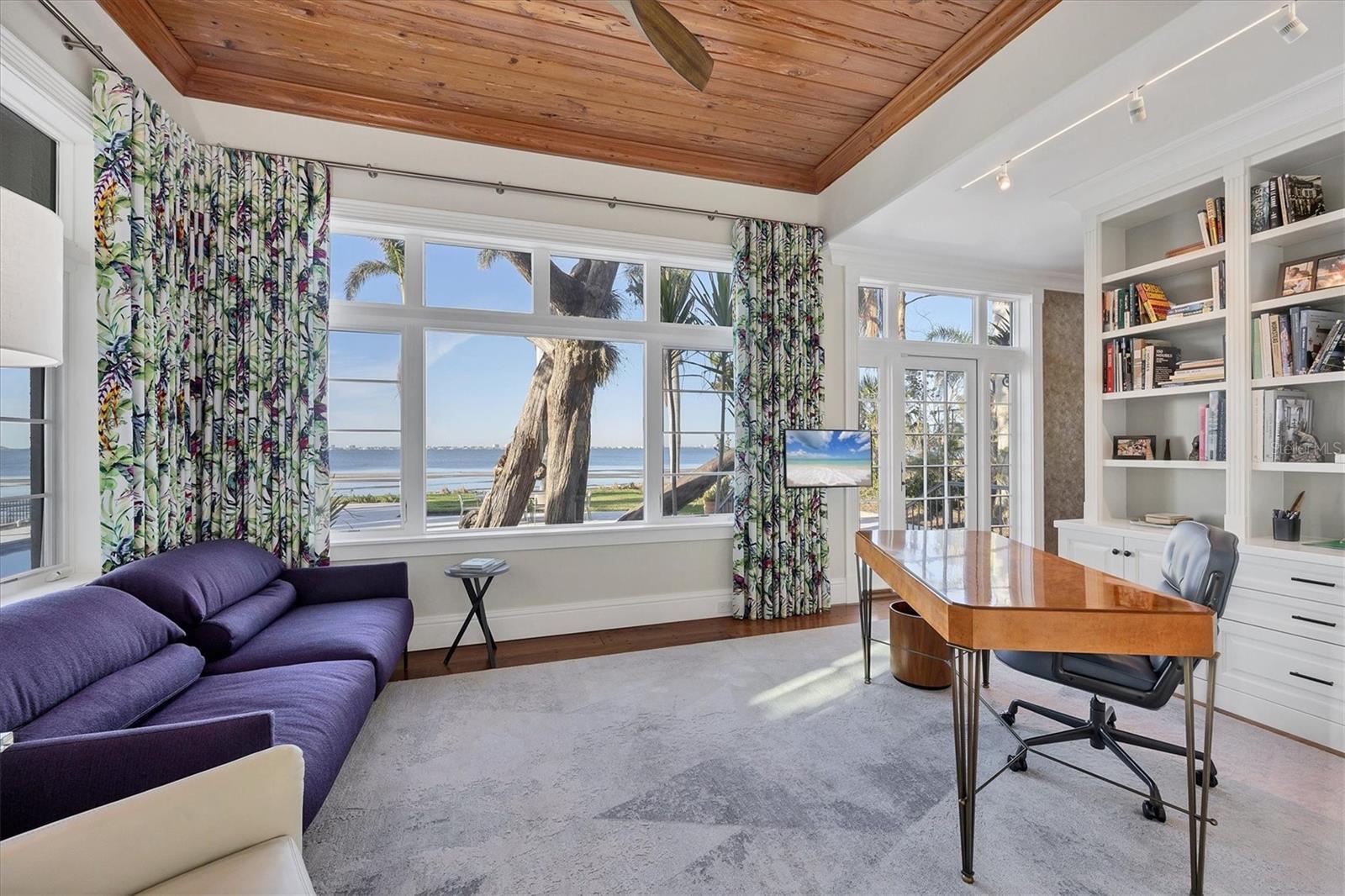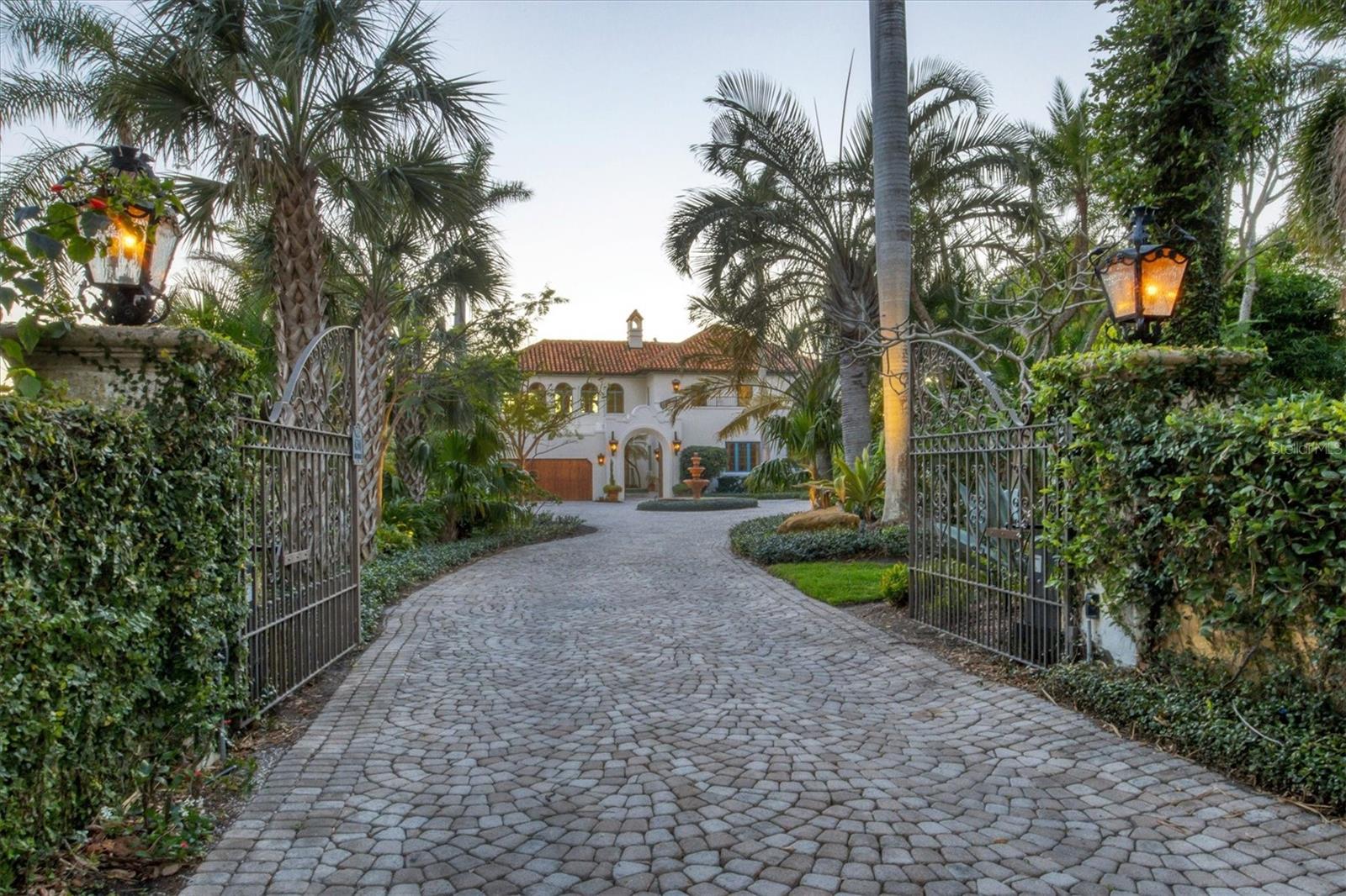 Nestled on nearly three-quarters of an acre, this meticulously updated 1925 Mediterranean Revival residence offers breathtaking, panoramic views of Sarasota Bay, encompassing the downtown skyline, Ringling Bridge and the northern tip of Longboat Key. While preserving its historic charm and original elegance, the home seamlessly integrates modern upgrades designed for both gracious living and entertaining. Upon entering through the gated entry, visitors are greeted by a serene garden with a koi pond and a spacious circular driveway featuring a central fountain, providing ample parking. The gated courtyard leads to a welcoming foyer, which serves as a gateway to the home’s expansive living spaces. To one side lies the formal living room, adorned with a coffered ceiling and an ornate fireplace, while the opposite side reveals a newly renovated kitchen, thoughtfully designed with a Sub-Zero refrigerator, AGA induction range, dolomite countertops, galley sinks and a cozy breakfast area. The formal dining room is perfect for hosting friends and family, offering bay views, a hand-painted recessed ceiling, a marble fireplace and custom built-ins for storage, display and serving. Adjacent to the dining room, the office/den provides tranquil spaces with views of the pool and bay. The great room, with its soaring ceilings, stately fireplace and 10-foot arched doors creates a stunning venue for entertaining, flowing effortlessly onto a spacious covered terrace perfect for sunset views. The second floor boasts three generously sized en-suite bedrooms, each with access to private terraces that showcase captivating vistas. The primary suite, completely reimagined in 2021, epitomizes luxury and relaxation with a custom-trimmed ceiling, a large window for endless Gulf of Mexico views, two French doors leading to an expansive terrace and a custom-organized walk-in closet. The primary bathroom is a retreat with an oversized walk-in shower, floating vanity, a free-standing soaking tub and stunning details and finishes throughout. Designed by renowned landscape architect Michael Gilkey, the grounds have been transformed into distinct outdoor "rooms," featuring a bocce court, expansive patios and a beautifully tiled, heated pool. A charming guesthouse, located adjacent to one of the two two-car garages, includes two rooms, two bathrooms and a kitchenette. With a pocket door, the space can be configured as two separate en-suite bedrooms for ultimate flexibility. Additional enhancements include updated HVAC systems, air conditioning for the garages, upgraded electrical systems, LED and Lutron lighting and hurricane-impact windows and doors. Conveniently located in Indian Beach and Sapphire Shores, this residence is close to downtown Sarasota, SRQ Airport and numerous dining and shopping options. Known as Casa Arula, this remarkable property harmoniously blends historical significance with modern sophistication, creating a truly exceptional place to call home.