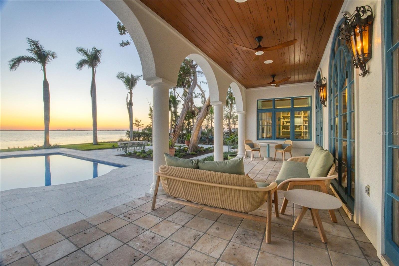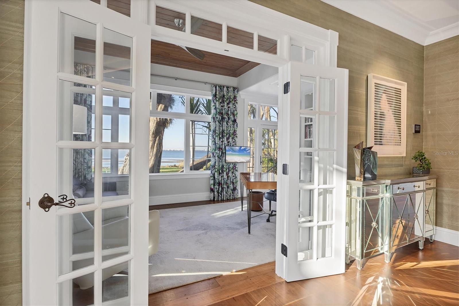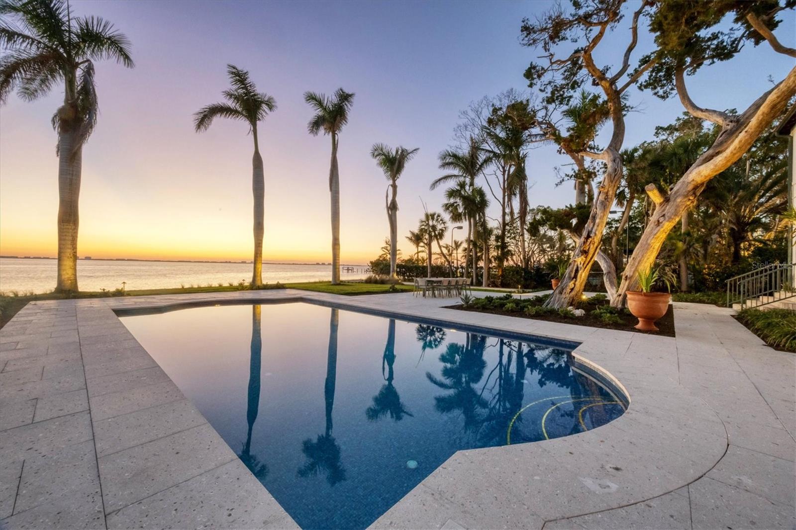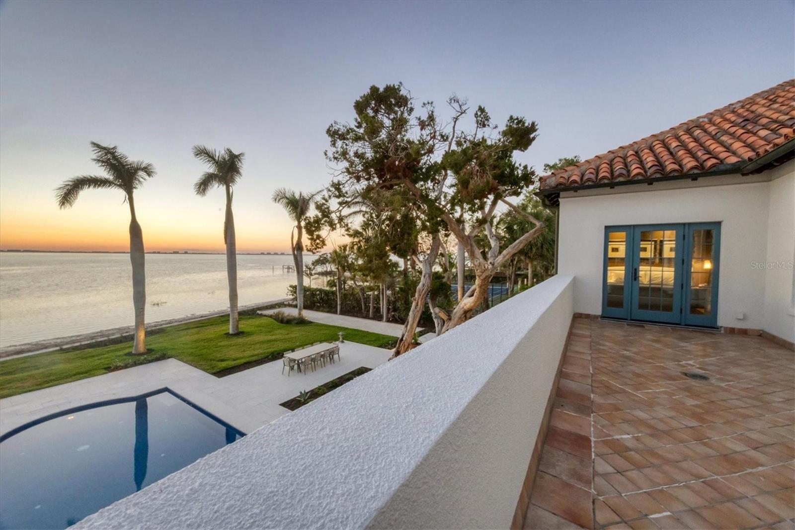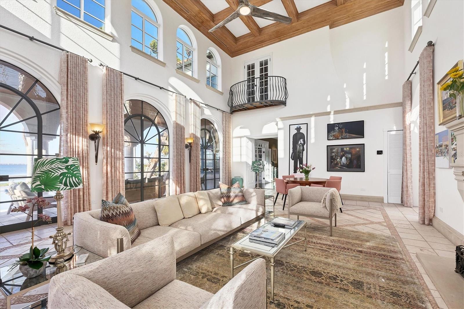 Nestled on nearly three-quarters of an acre, this meticulously updated 1925 Mediterranean Revival residence offers breathtaking, panoramic views of Sarasota Bay, encompassing the downtown skyline, Ringling Bridge and the northern tip of Longboat Key. While preserving its historic charm and original elegance, the home seamlessly integrates modern upgrades designed for both gracious living and entertaining. Upon entering through the gated entry, visitors are greeted by a serene garden with a koi pond and a spacious circular driveway featuring a central fountain, providing ample parking. The gated courtyard leads to a welcoming foyer, which serves as a gateway to the home’s expansive living spaces. To one side lies the formal living room, adorned with a coffered ceiling and an ornate fireplace, while the opposite side reveals a newly renovated kitchen, thoughtfully designed with a Sub-Zero refrigerator, AGA induction range, dolomite countertops, galley sinks and a cozy breakfast area. The formal dining room is perfect for hosting friends and family, offering bay views, a hand-painted recessed ceiling, a marble fireplace and custom built-ins for storage, display and serving. Adjacent to the dining room, the office/den provides tranquil spaces with views of the pool and bay. The great room, with its soaring ceilings, stately fireplace and 10-foot arched doors creates a stunning venue for entertaining, flowing effortlessly onto a spacious covered terrace perfect for sunset views. The second floor boasts three generously sized en-suite bedrooms, each with access to private terraces that showcase captivating vistas. The primary suite, completely reimagined in 2021, epitomizes luxury and relaxation with a custom-trimmed ceiling, a large window for endless Gulf of Mexico views, two French doors leading to an expansive terrace and a custom-organized walk-in closet. The primary bathroom is a retreat with an oversized walk-in shower, floating vanity, a free-standing soaking tub and stunning details and finishes throughout. Designed by renowned landscape architect Michael Gilkey, the grounds have been transformed into distinct outdoor "rooms," featuring a bocce court, expansive patios and a beautifully tiled, heated pool. A charming guesthouse, located adjacent to one of the two two-car garages, includes two rooms, two bathrooms and a kitchenette. With a pocket door, the space can be configured as two separate en-suite bedrooms for ultimate flexibility. Additional enhancements include updated HVAC systems, air conditioning for the garages, upgraded electrical systems, LED and Lutron lighting and hurricane-impact windows and doors. Conveniently located in Indian Beach and Sapphire Shores, this residence is close to downtown Sarasota, SRQ Airport and numerous dining and shopping options. Known as Casa Arula, this remarkable property harmoniously blends historical significance with modern sophistication, creating a truly exceptional place to call home.