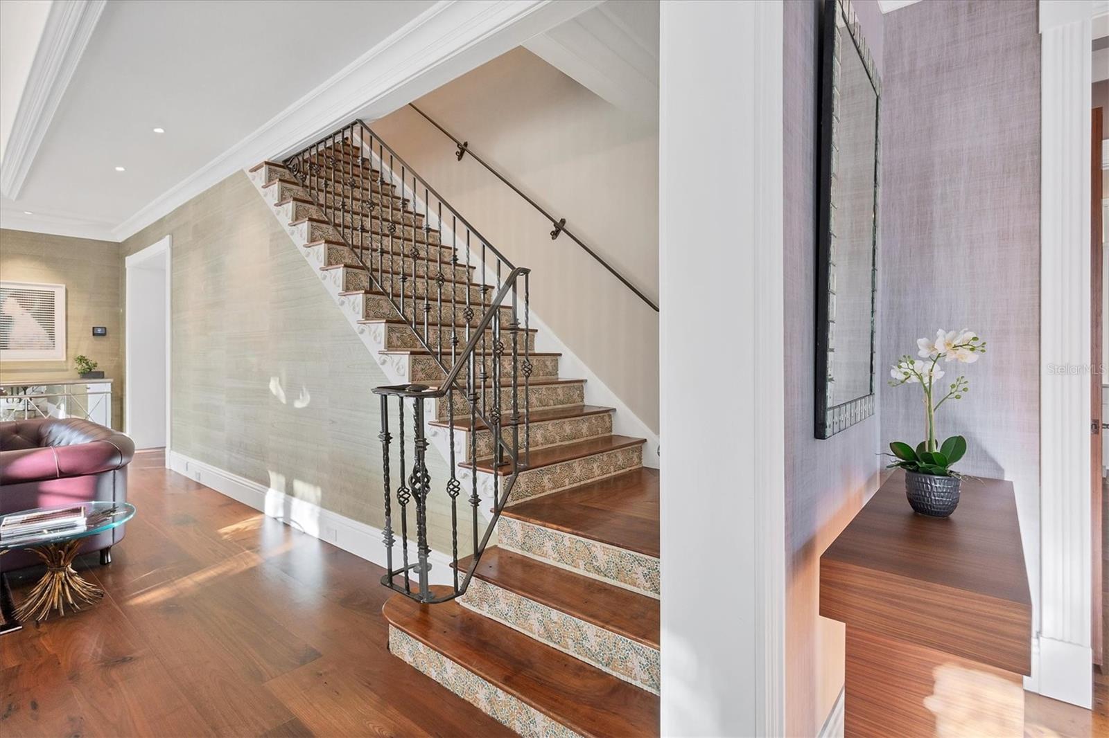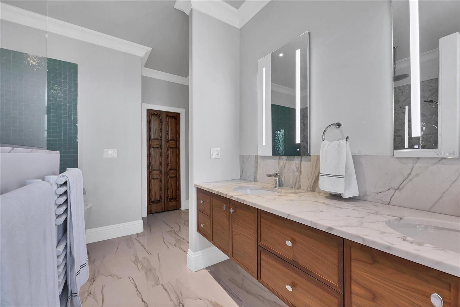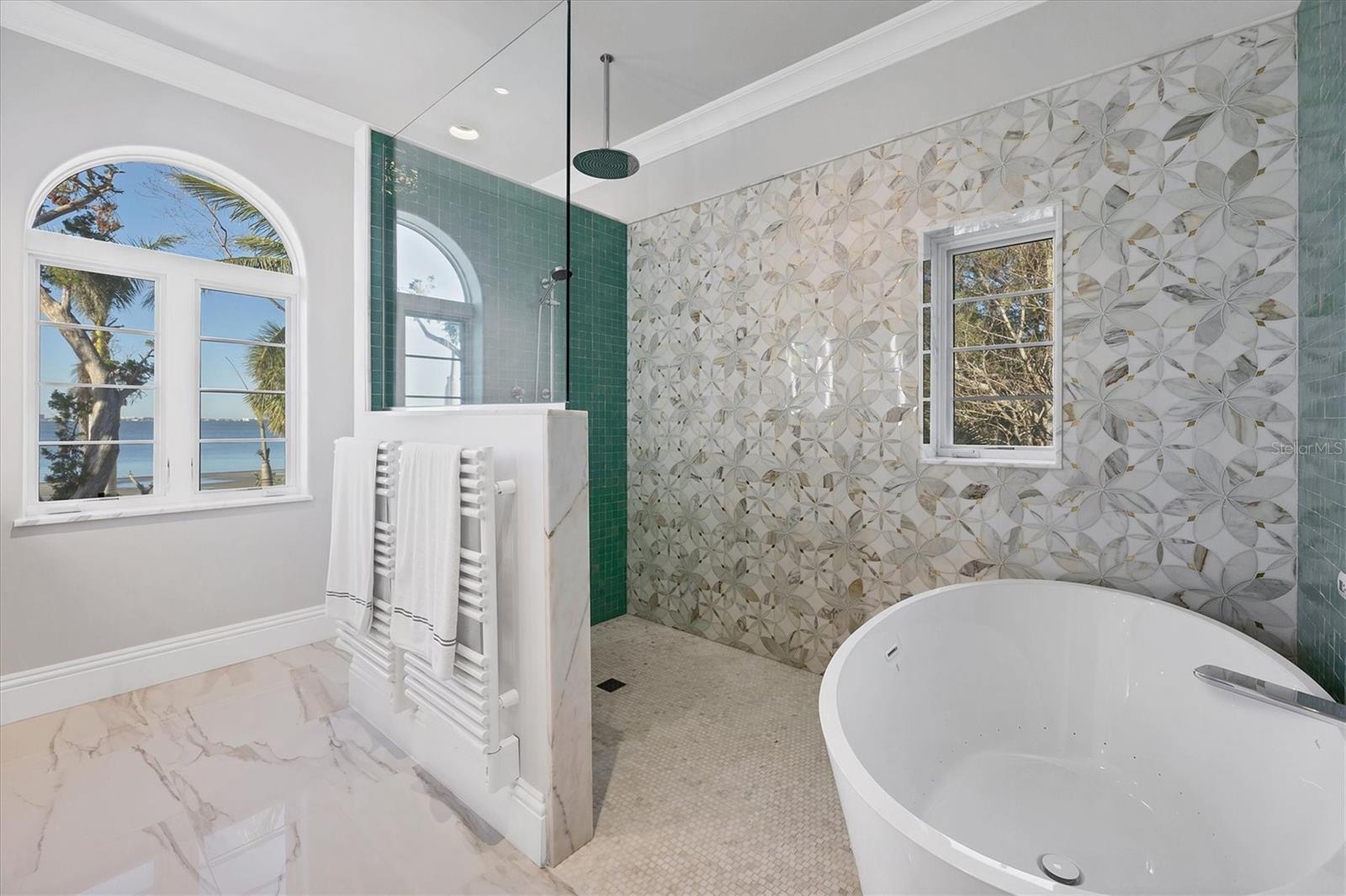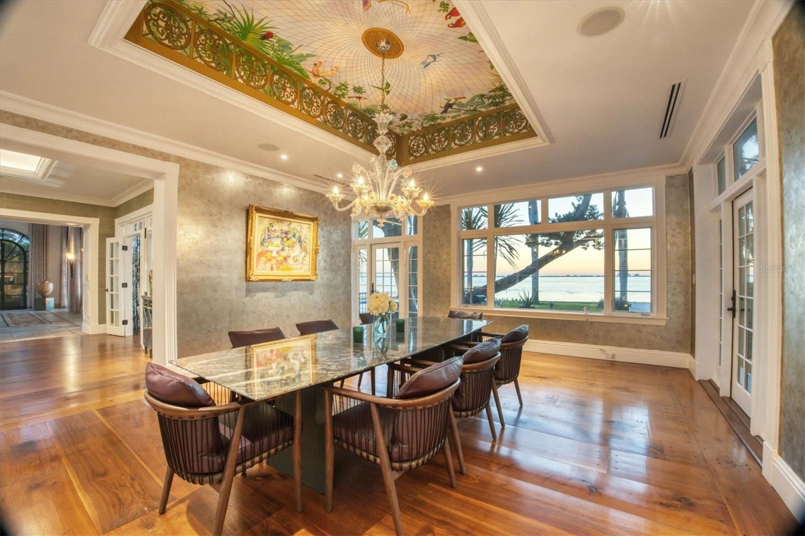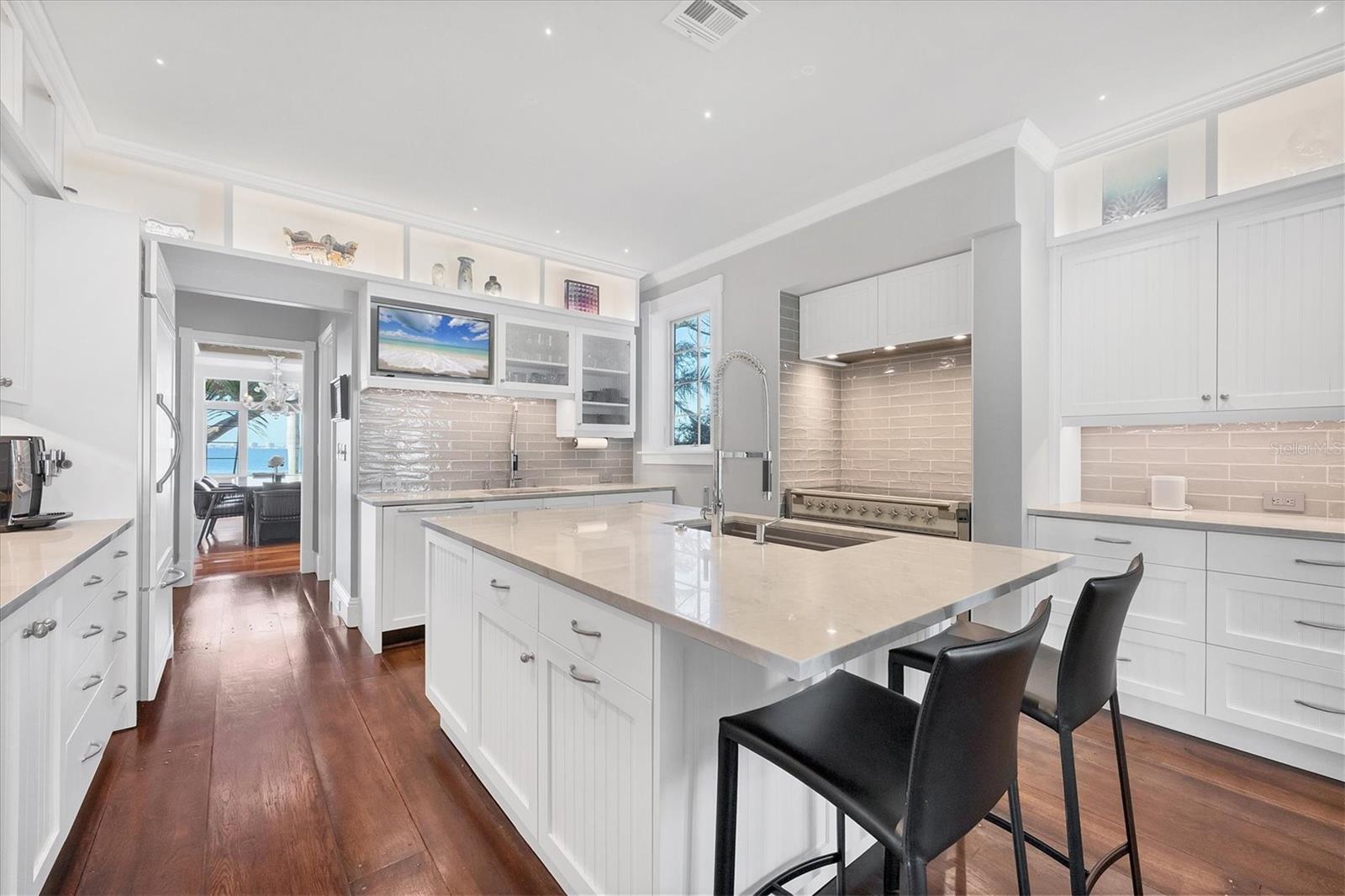 Nestled on nearly three-quarters of an acre, this meticulously updated 1925 Mediterranean Revival residence offers breathtaking, panoramic views of Sarasota Bay, encompassing the downtown skyline, Ringling Bridge and the northern tip of Longboat Key. While preserving its historic charm and original elegance, the home seamlessly integrates modern upgrades designed for both gracious living and entertaining. Upon entering through the gated entry, visitors are greeted by a serene garden with a koi pond and a spacious circular driveway featuring a central fountain, providing ample parking. The gated courtyard leads to a welcoming foyer, which serves as a gateway to the home’s expansive living spaces. To one side lies the formal living room, adorned with a coffered ceiling and an ornate fireplace, while the opposite side reveals a newly renovated kitchen, thoughtfully designed with a Sub-Zero refrigerator, AGA induction range, dolomite countertops, galley sinks and a cozy breakfast area. The formal dining room is perfect for hosting friends and family, offering bay views, a hand-painted recessed ceiling, a marble fireplace and custom built-ins for storage, display and serving. Adjacent to the dining room, the office/den provides tranquil spaces with views of the pool and bay. The great room, with its soaring ceilings, stately fireplace and 10-foot arched doors creates a stunning venue for entertaining, flowing effortlessly onto a spacious covered terrace perfect for sunset views. The second floor boasts three generously sized en-suite bedrooms, each with access to private terraces that showcase captivating vistas. The primary suite, completely reimagined in 2021, epitomizes luxury and relaxation with a custom-trimmed ceiling, a large window for endless Gulf of Mexico views, two French doors leading to an expansive terrace and a custom-organized walk-in closet. The primary bathroom is a retreat with an oversized walk-in shower, floating vanity, a free-standing soaking tub and stunning details and finishes throughout. Designed by renowned landscape architect Michael Gilkey, the grounds have been transformed into distinct outdoor "rooms," featuring a bocce court, expansive patios and a beautifully tiled, heated pool. A charming guesthouse, located adjacent to one of the two two-car garages, includes two rooms, two bathrooms and a kitchenette. With a pocket door, the space can be configured as two separate en-suite bedrooms for ultimate flexibility. Additional enhancements include updated HVAC systems, air conditioning for the garages, upgraded electrical systems, LED and Lutron lighting and hurricane-impact windows and doors. Conveniently located in Indian Beach and Sapphire Shores, this residence is close to downtown Sarasota, SRQ Airport and numerous dining and shopping options. Known as Casa Arula, this remarkable property harmoniously blends historical significance with modern sophistication, creating a truly exceptional place to call home.