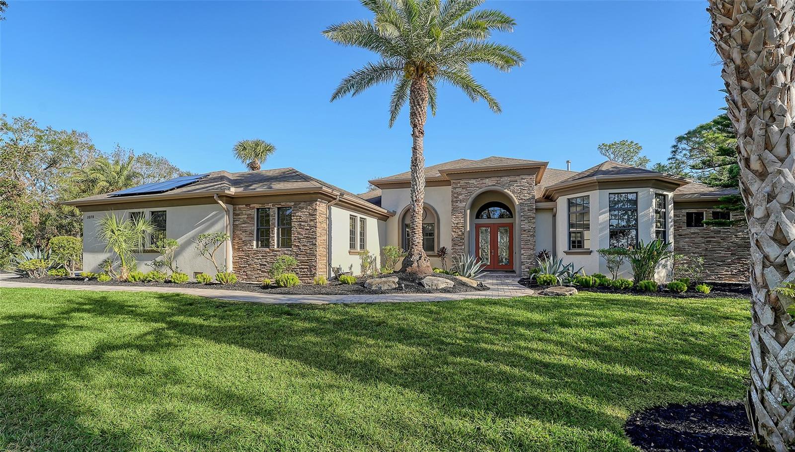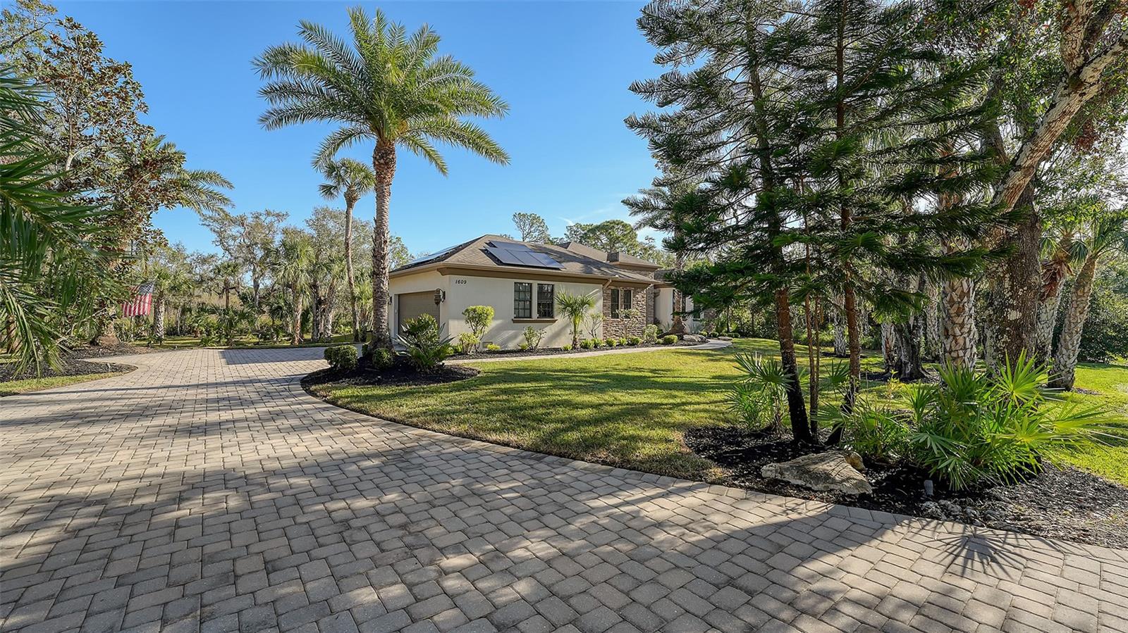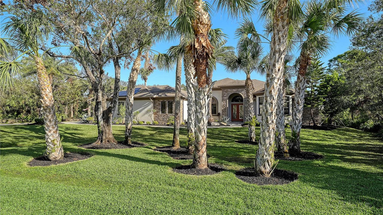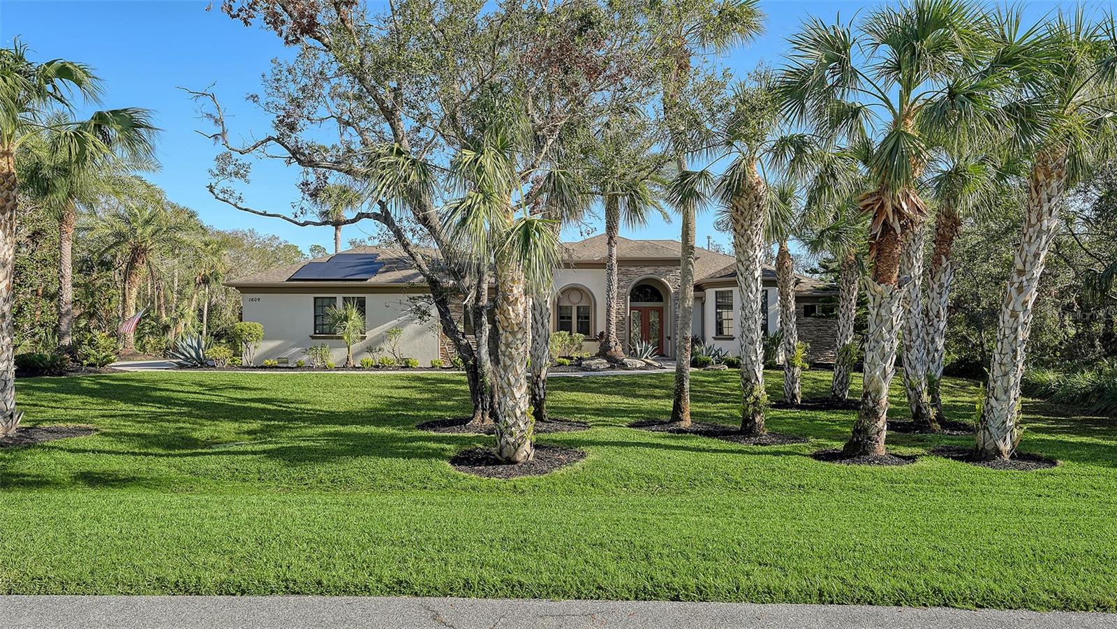Third Price Reduction!! SERENITY!!! This is what you will experience at this beautiful home on 1609 Palm View in Oak Ford. Just 15 minutes from Terra Nova Equestrian Center and 15 minutes East from the UTC Mall congestion and traffic surrounding that area. You will feel a world apart and experience the beauty, serenity, peace and natural beauty of this gorgeous area and exquisite turn-key furnished home. This Beautiful Arthur Rutenberg pool home is located in The Oak Ford community off Fruitville Rd east of I-75. Solar panels provide electricity for the entire home and heated pool which has an automatic self-cleaning system. This stunning all on one floor home has a very private large lot surrounded by lush natural beauty with expansive views. As you enter through the beautiful double beveled glass front doors into the tiled foyer you will be immersed into exquisite quality of design with high ceilings and crown molding throughout the entire home. Hurricane rated sliding glass doors and windows throughout. The Great Room features beautiful tiled floor and lovely furniture and a stacked stone gas fireplace with granite mantle, flat screen TV & sound bar. The Great room looks out to the screened lanai and heated pool with newer heat pump and tranquil water feature. The lanai also features a granite wet bar area, GE Monogram beverage refrigerator. The lanai features pavers which are also on the driveway and walkway leading up to the front door. Custom blinds throughout. Whole house saltwater system for all of the water in the house. And an Osmosis system in the kitchen for clean drinking water. The lanai has an automatic remote control awning for shade as you lounge on the couches and enjoy the serenity and tranquility of the backyard. The Den/Flex room in the house has hardwood floors and is off the Great room and features recessed lighting with furniture to relax on. The primary bedroom has its own entry way with privacy doors as well as a Trey Ceiling. Two large walk-in closet provide lots of room for clothes and accessories. Hunter Douglas remote controlled shades are on the windows and the primary bedroom is totally furnished along with having a separate HVAC. The primary bathroom features a large soaking tub and a walk-in shower with two shower heads and tiled surroundings. Separate granite double vanities offered in this spacious bathroom. Absolutely gorgeous kitchen has a large hidden walk-in pantry behind cabinet doors and additional pantry gives you plenty of storage. Mahogany cabinets throughout the kitchen with dark granite countertops. Stainless Steel new GE Monogram oven, microwave and dishwasher, Bosch SS Refrigerator and wine refrigerator in kitchen under the coffee/beverage bar. The laundry room features Maytag washer and dryer and cabinetry and counter space with a second refrigerator in this area. Extra storage closet just off the laundry room for cleaning supplies/storage. The home office has hardwood floors and the house features a whole house alarm system and lots of outdoor lighting. There is a pool bath on the lanai and a full bath between 3rd bedroom and the office. This house utilizes a well so there is no water bill and has an automatic water sprinkler system and outside lighting system. Sarasota county has A rated schools, world renowned beaches and lots of excellent restaurants. New Publix, Aldi, CVS and more only minutes away. Enjoy it all and beautiful country living that affords you peace and quiet.