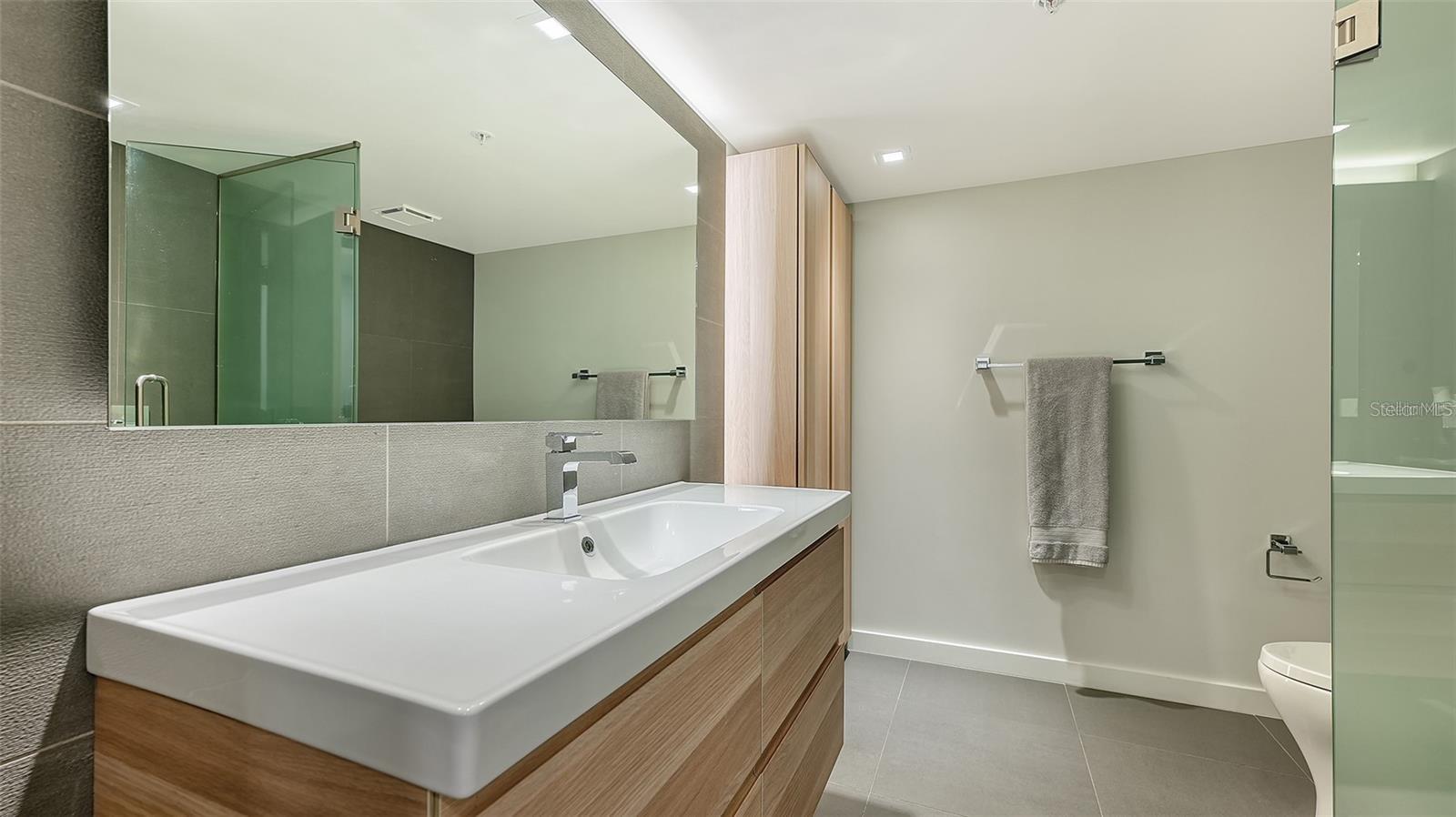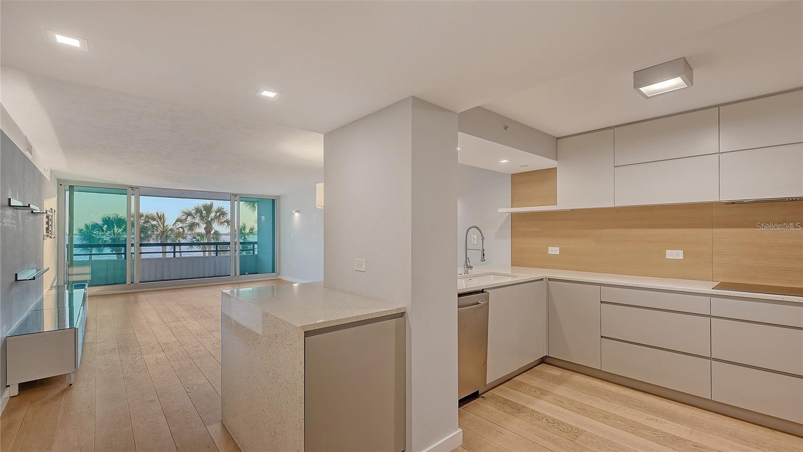 One or more photo(s) has been virtually staged. Direct Bayfront living in the heart of Sarasota at Condo on the Bay. This fully renovated 2 bed/2 bath residence features beautiful panoramic views of the Sarasota Bayfront with breathtaking sunsets over LBK and Ringling Bridge. Step into the inviting Great Room – greeted by a wall of impact glass floor-to-ceiling sliding doors that seamlessly blend the outdoors in, opening to a spacious balcony overlooking one of two residents pools, just steps from one of the long piers and boat slips. Interior features include White Oak engineered hardwood flooring flowing throughout the Main Living space, complemented by custom built-in cabinetry and a dry bar with a wine refrigerator for easy entertaining. A chef’s delight, the modern kitchen features Elite Woodwork of Sarasota Cabinetry, stainless steel appliances including an induction cooktop and built-in wall oven and microwave, quartz countertops, Walnut wood backsplash, built-in pantry, and breakfast bar for casual dining. A conveniently located laundry closet with full-size stackable front-loading washer and dryer completes the kitchen. A true oasis, the master suite has serene water views, remote controlled Hunter Douglas shades, and plenty of storage space with a large walk-in customized closet plus a full entry wall of built-in cabinetry. The updated en-suite bathroom features dual floating vanities, modern floor-to-ceiling tile, a walk-in shower with frameless glass enclosure and multiple shower heads. The generously sized secondary bedroom boasts double built-in closets and a secondary bathroom with a floating vanity, walk-in shower with a frameless glass enclosure, and a built-in linen closet. New Ruud A/C in March 2023. Set directly on Sarasota Bay, the highly sought after community offers a lifestyle of sophistication and serenity. A range of amenities include staffed 24-hour security gated guardhouse, “sky lobbies” located on a number of floors throughout, two resort-style pools overlooking the bay, two fitness centers, tennis courts, pickleball courts, concierge services and boat/kayak docks with a fishing pier. This pet-friendly Tower II residence includes one assigned under-building parking space with secure access and storage. Just steps away from Sarasota Bay Park and the vibrant culture and arts scene of Downtown Sarasota, world-class dining, shopping and entertainment. A short drive to St. Armand’s Circle and Lido Beach. Don’t wait – it is time to experience a luxurious urban life from the 3rd floor of Tower II, in the Bayfront heart of Downtown Sarasota!