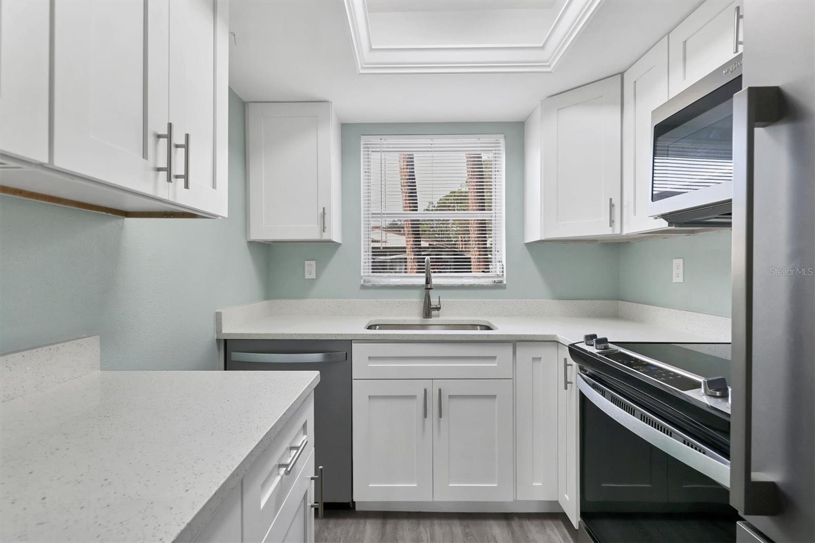 VERY AFFORDABLE, 2 bedroom/ 2 Bathroom, UPDATED GROUND-FLOOR CONDO in sunny Sarasota, less than 3 miles to Siesta Key bridge! You will love the efficient kitchen redone (2022) with beautiful quartz countertops, new cabinets (with soft-close drawers) and appliances. Luxury vinyl plank flooring throughout the condo (also 2022). This END UNIT allows for privacy and a peaceful retreat in your screened-in lanai. There's extra storage space in your exterior, private laundry room complete with full size stackable washer and dryer. Swifton Villas is an active 55+ community with a gorgeous pool, a welcoming clubhouse, and a LOW MONTHLY CONDO FEE ($395) that covers your basic cable, sewer, water and trash. As an owner, you will appreciate the 2 minute walk to the private access gate to Detweiler's Market and the adjoining plaza. Close proximity to the shops and restaurants of charming Gulf Gate. Downtown Sarasota is just a 15 minute drive. Imagine a maintenance-free lifestyle in your own sunny Sarasota condo! NOTE: Swifton Villas is PET-FRIENDLY!
