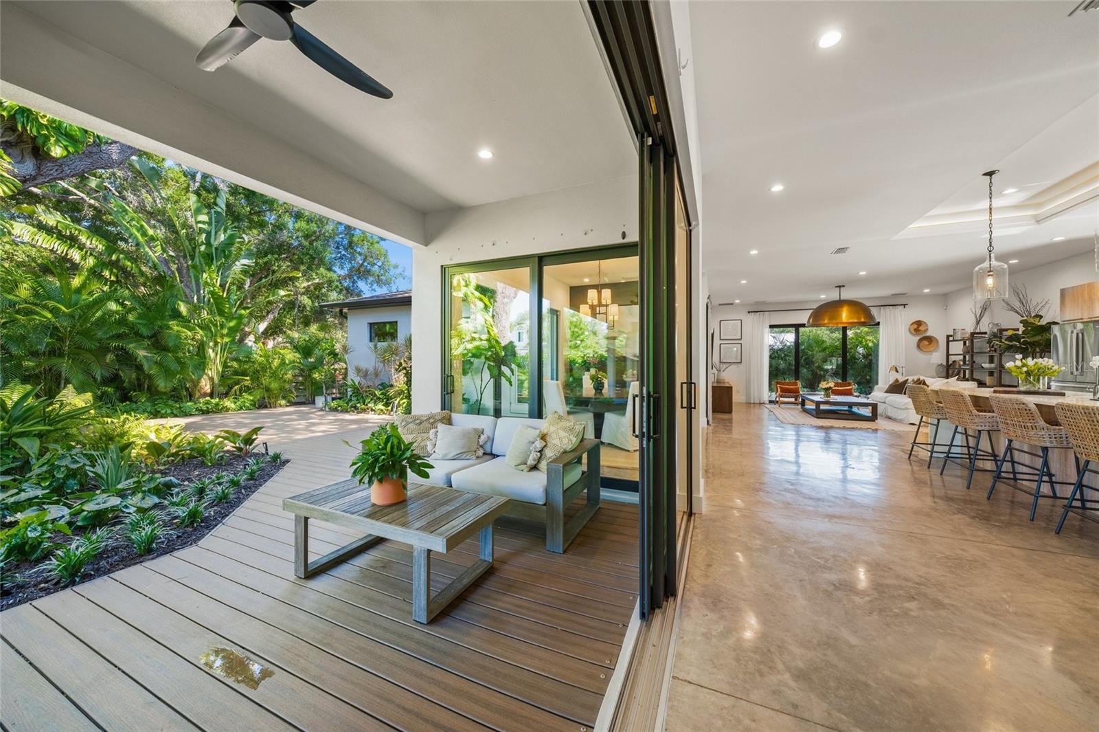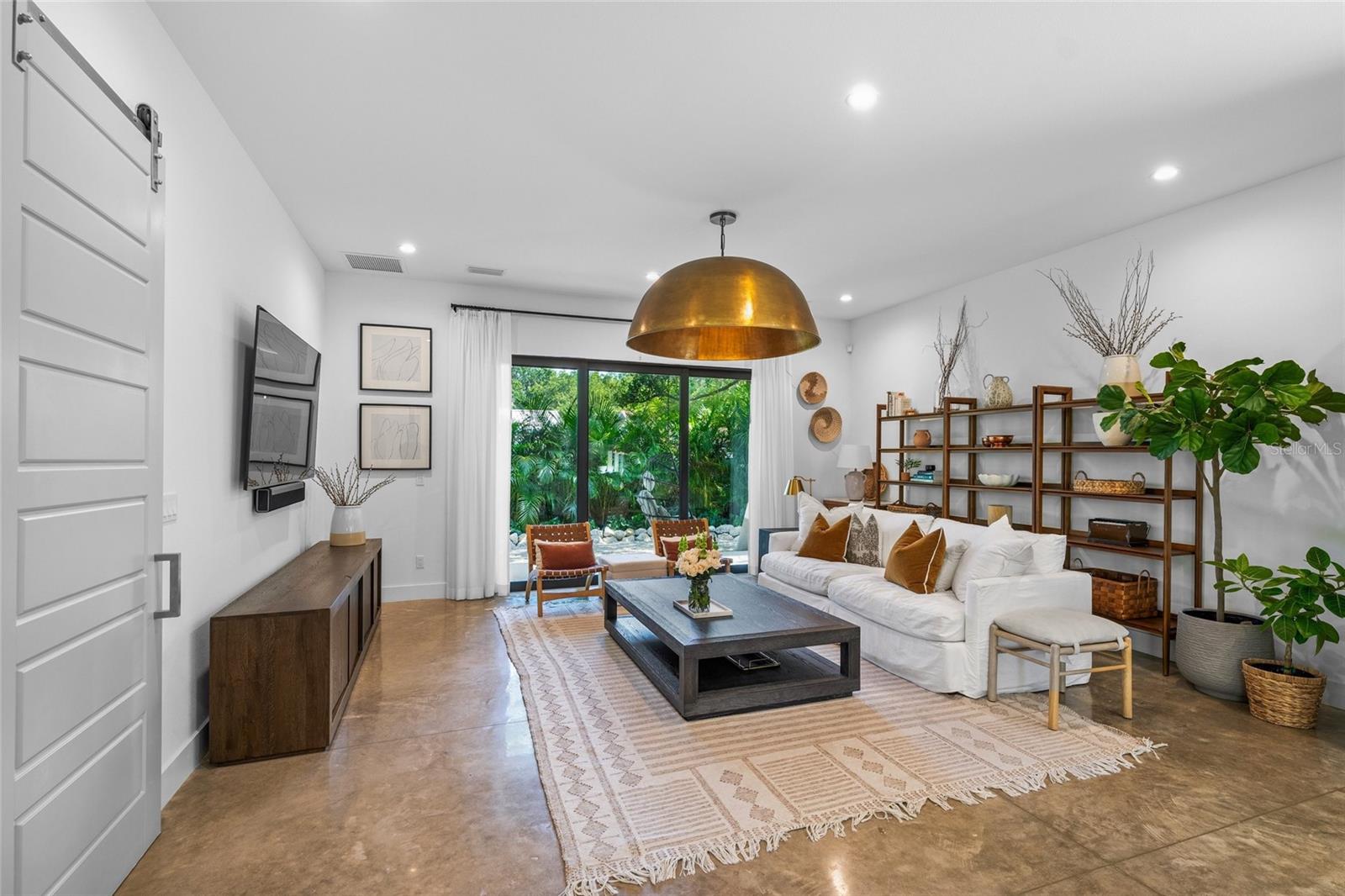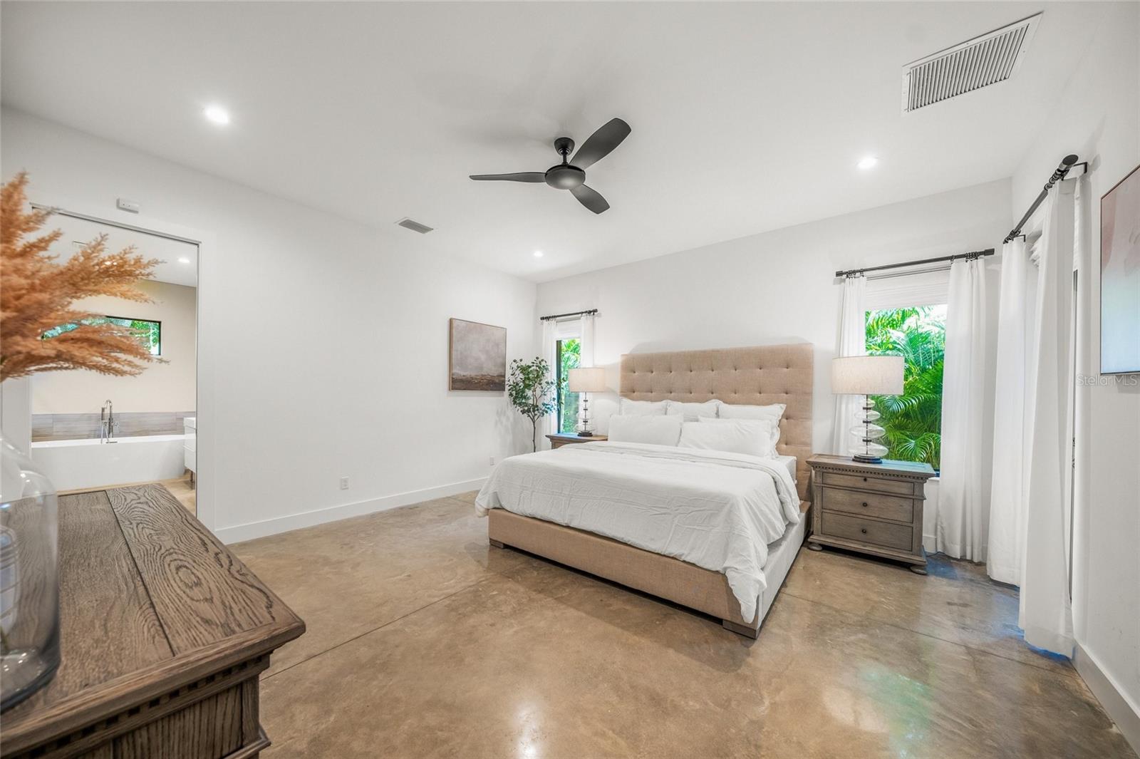 Experience the pinnacle of luxury living in this stunning new two-story masterpiece by Majestik Homes, located east of the trail. This residence combines striking natural beauty with impeccable design and construction, epitomizing peaceful contemporary living. No expense has been spared in creating a timeless blend of comfort and function, with a multitude of premium upgrades. Step into a grand open floor plan, where polished concrete floors reflect natural light, enhancing the modern elements such as modular kitchen cabinets, open shelving, and premium stainless steel appliances. The integration of natural textures seamlessly bridges the indoors with the breathtaking outdoors, featuring meticulously landscaped grounds, a synthetic wood deck with elegant landscape lighting, and magnificent preserved Oaks. Privacy is ensured with a fence and Ipe wood gate, while yearly tree maintenance keeps the surroundings pristine. The first-floor master retreat is a sanctuary of relaxation, boasting a spa-like bath and a private outdoor oasis, enhanced by designer lighting fixtures. The master closet is expertly built out to maximize storage and style. Upstairs, two additional bedrooms and a versatile loft provide the perfect environment for family and guests, offering both flexibility and privacy, with custom closet build outs in each room. Modern conveniences abound, including a Leaf whole home water softener, exterior light fixtures, curtains, WiFi-enabled lighting switches, and a new washer and dryer. Entertainment is effortless with wall mounted TVs and a Sonos system in the living room. A state-of-the-art security system with cameras and fully fenced in ensures peace of mind. Situated in a prime location east of the trail, this home is just moments away from premier cultural venues, upscale shopping, and fine dining. Enjoy the vibrant lifestyle of Southside Village, the pristine beaches of Siesta Key, Southside Elementary an A+ school, Arlington Park, Sarasota Memorial, and finally the dynamic energy of downtown Sarasota. This is more than a home; it's a luxurious retreat that accommodates everyone!