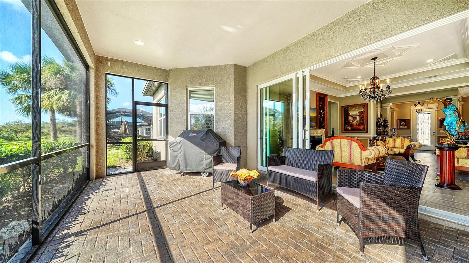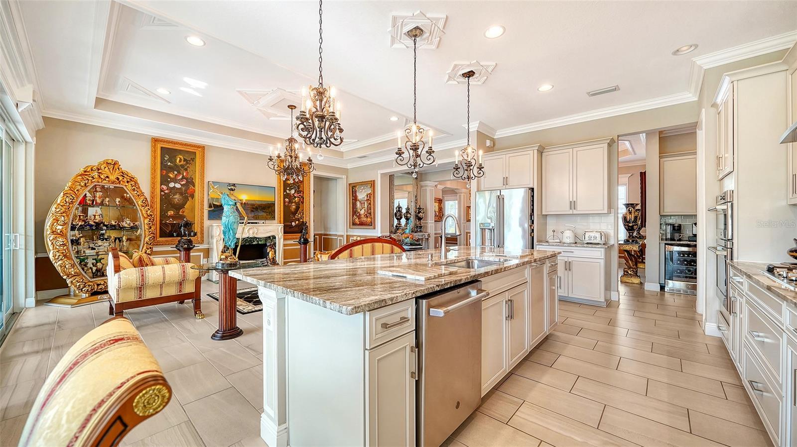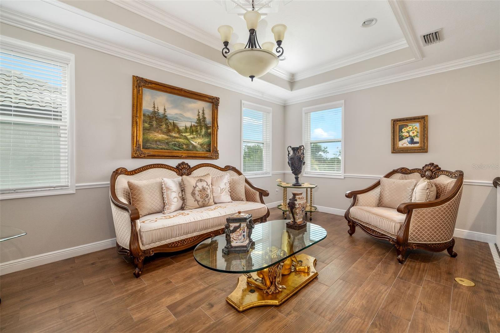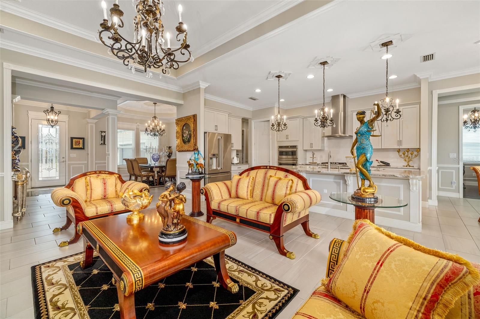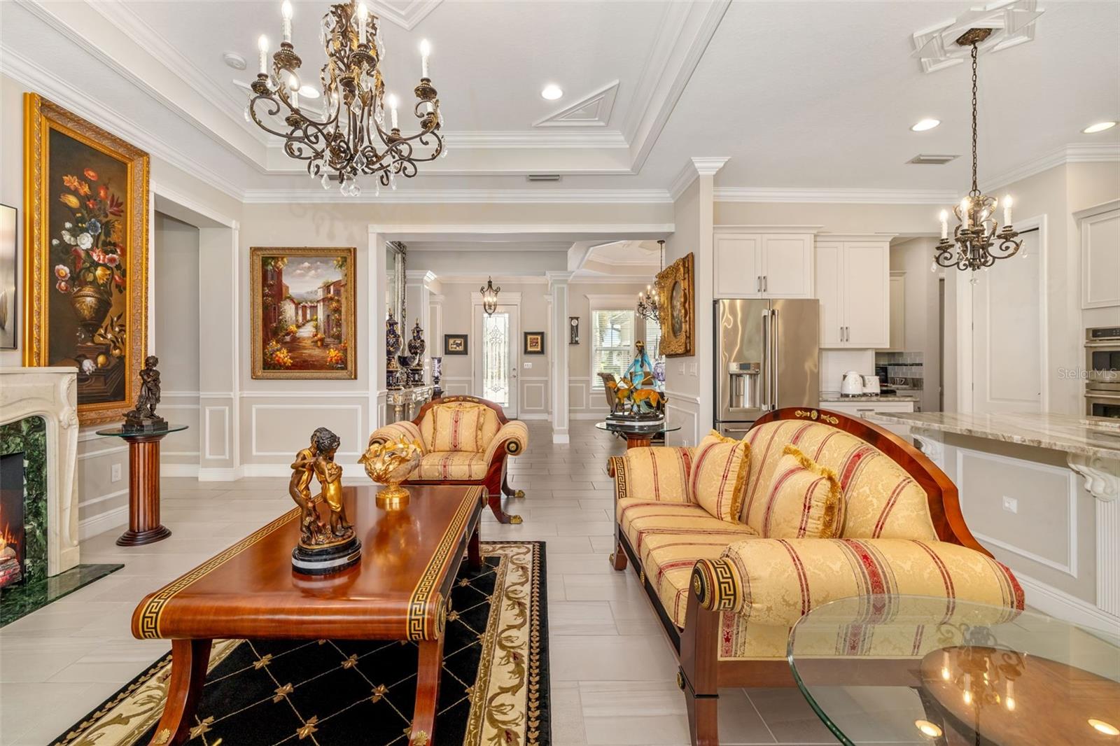Nestled behind the gates of Rivo Lakes, this stunning home exudes timeless elegance with its impressive Tuscan-inspired facade and exquisite stone accents. FRESHLY PAINTED LIVING AREA, BEAUTIFUL LIGHT NEUTRAL COLOR. The meticulously landscaped grounds are adorned with lush tropical foliage, setting the stage for a truly exceptional living experience. Step inside to find a spacious, open floor plan with soaring ceilings and custom millwork throughout. Gorgeous custom Italian inlays grace the floors, adding sophistication to the space. This home offers 4 spacious bedrooms, 4 luxurious bathrooms, a bonus room, den, formal dining room, and a game room—plenty of space for entertaining or family relaxation. The gourmet kitchen is a chef’s dream, featuring custom cabinetry, granite countertops, high-end stainless steel appliances, and a cozy café dining area. A massive granite center island with counter-height seating seamlessly connects to the expansive family room, creating an ideal flow for both casual and formal gatherings. Upstairs, you'll find a private retreat with a large bonus room, bedroom, and bathroom, offering both comfort and versatility. The master suite is a true sanctuary, located on its own wing of the home, complete with a spa-like 5-piece en-suite and a generously sized walk-in closet. Sliding doors lead to the lanai, where you can relax and enjoy tranquil views of the serene pond. Why wait for new construction when you can move right into this better-than-new, custom home today? Whether you're teeing off at a nearby golf course or enjoying cocktails with friends, this home is the perfect setting for every lifestyle. Priced to sell...welcome home!