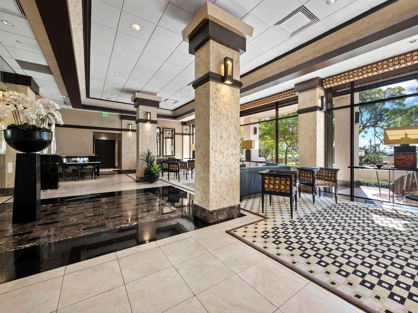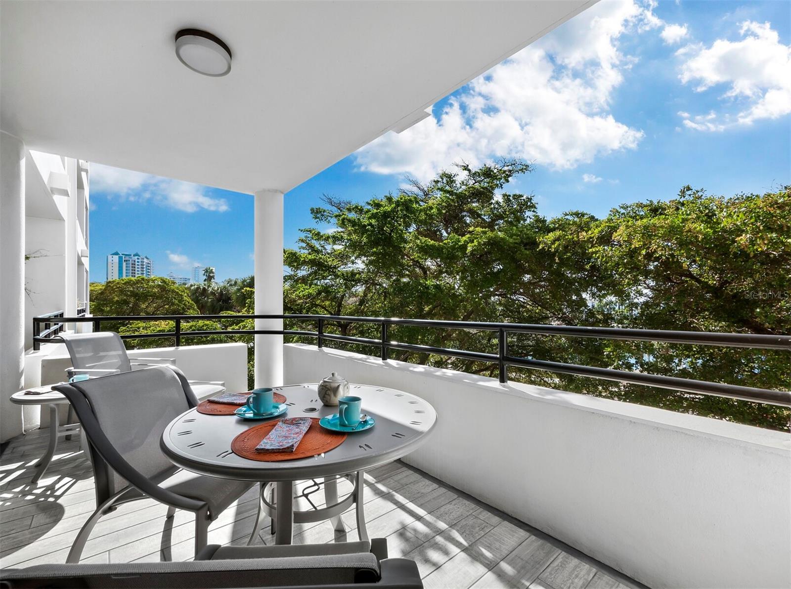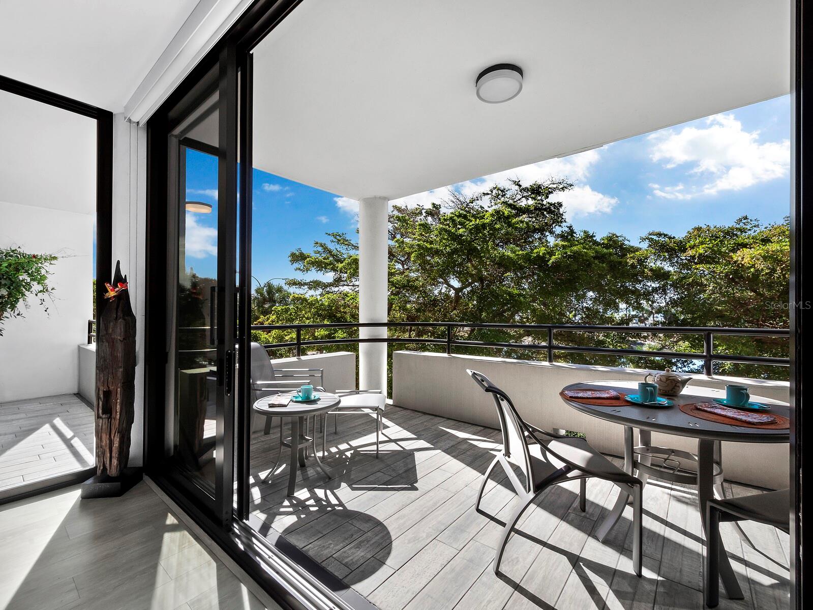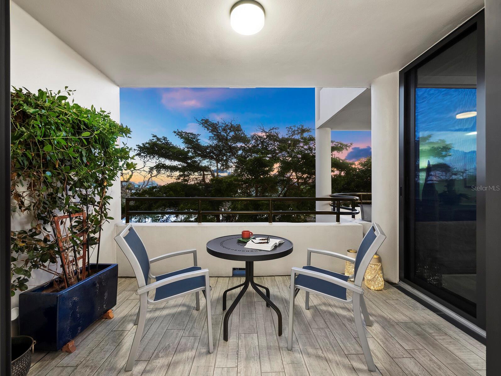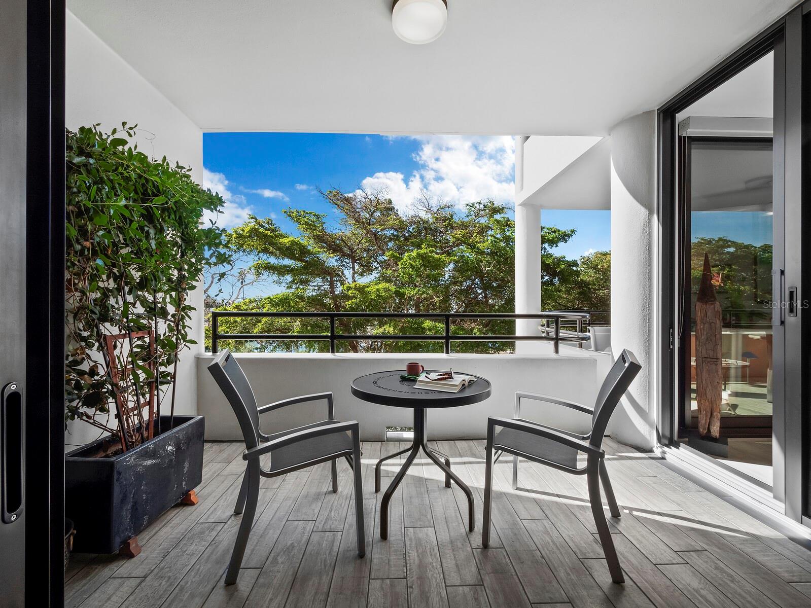 Experience a luxurious downtown Sarasota lifestyle in the highly coveted Bay Plaza condominium—with its timeless architectural appeal designed by renowned architect Tim Siebert. This location—this building—has everything one needs to immediately enjoy the convenience of downtown living. Sarasota is well-known as the cultural and creative coast of Florida. When you choose to live at Bay Plaza you are steps from enjoying performances by the Sarasota Opera or shows at one of Florida Studio Theater’s 5 stages, or for intellectual stimulation on global issues, there is SILL, Sarasota Institute for Lifetime Learning. Enjoy numerous restaurants and cafes with outdoor dining availability—all within steps of your front door. This handsomely renovated 2nd floor residence offers delicate views of Sarasota Bay through the airy structure of Shady Lady black olive trees lining the street below. The unit 204’s interior vibe is coastal contemporary, with shiplap walls and lighted insets, light wood-grained vinyl flooring throughout, LED lighting, ceiling fans and generous storage. The recent installation of new hurricane impact sliding doors, as well as windows, will provide peace of mind during inclement weather. You will appreciate the brightly updated kitchen with quartzite counters and designer backsplash, shaker cabinetry, and space to eat in casually, or possible other use as a den. The more formal dining area has a beautiful painted glass chandelier and easily accommodates up to 10 guests. The large living room has built in recessed cabinetry and gorgeous natural light from the two balconies. The owner's ensuite bath includes a large double floating vanity and backlit mirror, newly installed matching cabinetry across one wall for added storage, and separate shower/water closet with Toto toilet. In the suite, there are two walk in closets plus a linen closet. A private terrace is accessed from the primary suite, and new electronic roll-down shades provide complete privacy. The large guest suite on the opposite side of the apartment has access to the main terrace; there is a walk-in closet in the adjacent hallway, and a large guest bath with shower and laundry closet. Residents enjoy 5-star services, amenities, and security, including a full-service concierge, 24-hour valet parking, on-site management and maintenance, bike storage, large lobby with grand piano, well-equipped fitness center, locker rooms, each with sauna and steam, lap pool and hot tub, EV charging stations, media room, separate gathering room, catering kitchen, library. For the health enthusiasts, you are a short walk to the Ringling Bridge or enjoy Yoga at The Bay Park or nearby Marie Selby Botanical Garden. With a well-managed association and this impeccable building, you can immediately enjoy the lifestyle afforded by true downtown living at Sarasota’s Bay Plaza.