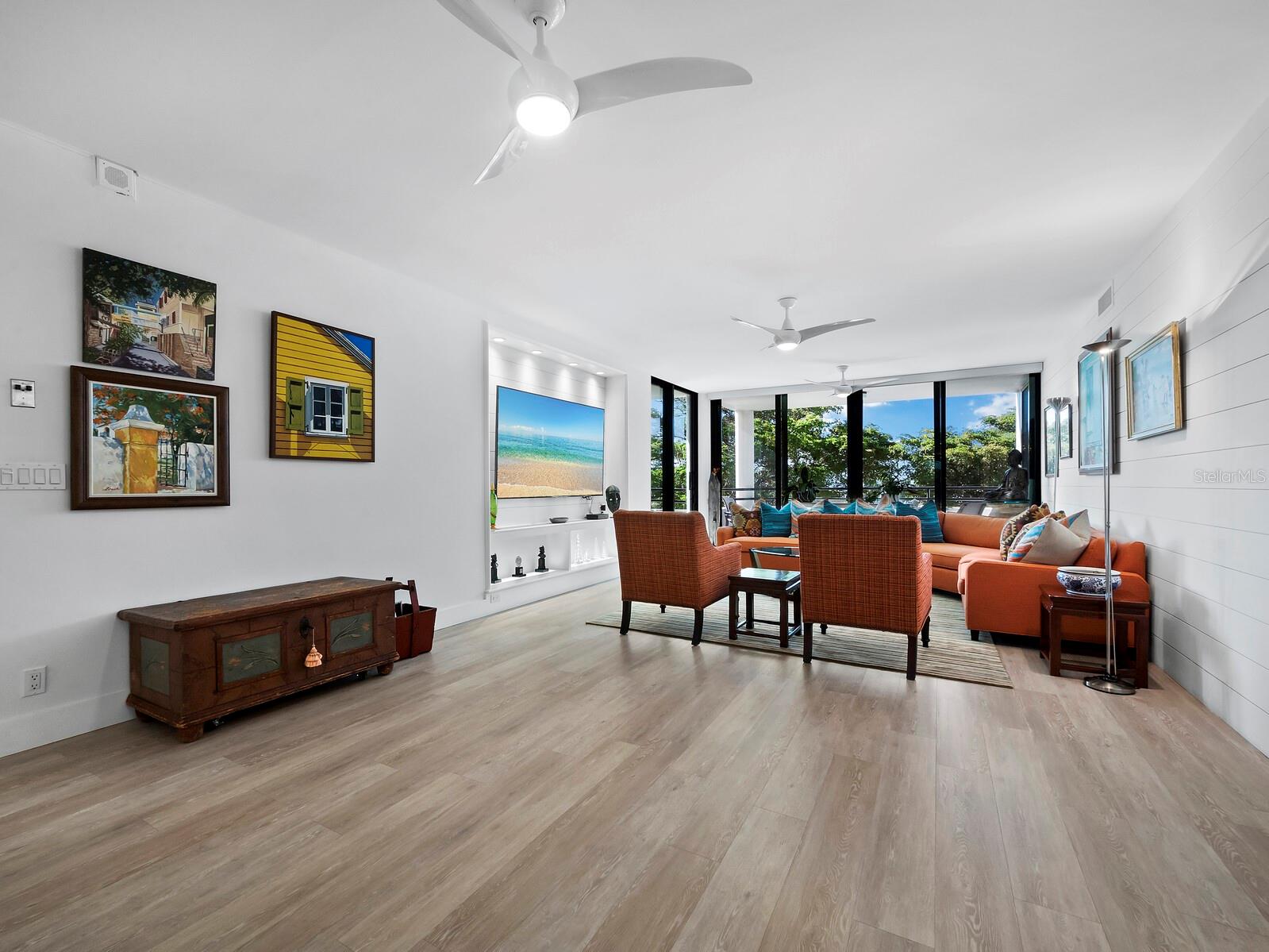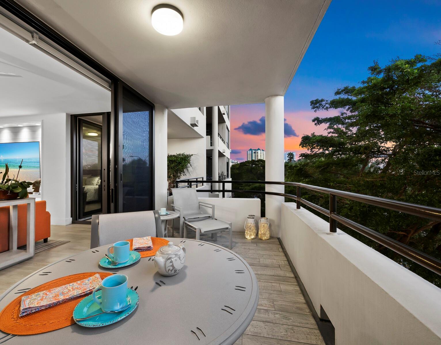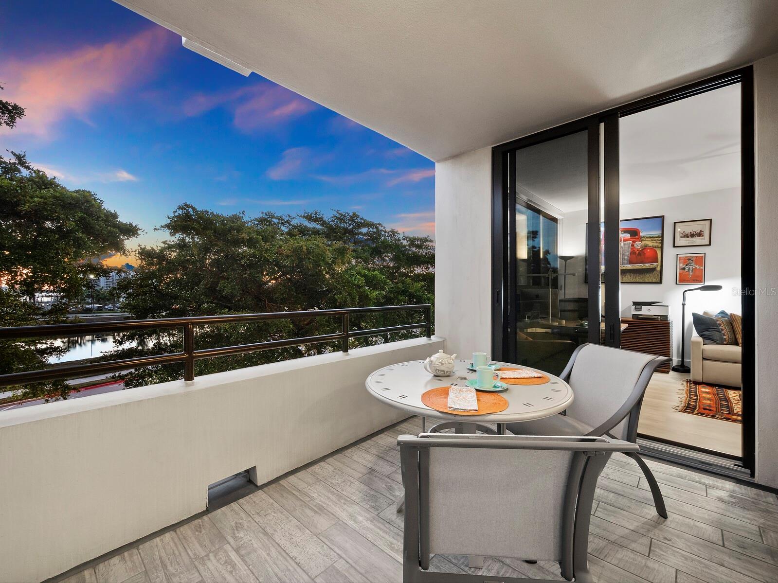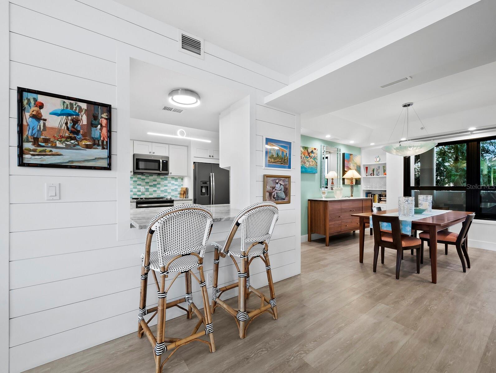 Experience a luxurious downtown Sarasota lifestyle in the highly coveted Bay Plaza condominium—with its timeless architectural appeal designed by renowned architect Tim Siebert. This location—this building—has everything one needs to immediately enjoy the convenience of downtown living. Sarasota is well-known as the cultural and creative coast of Florida. When you choose to live at Bay Plaza you are steps from enjoying performances by the Sarasota Opera or shows at one of Florida Studio Theater’s 5 stages, or for intellectual stimulation on global issues, there is SILL, Sarasota Institute for Lifetime Learning. Enjoy numerous restaurants and cafes with outdoor dining availability—all within steps of your front door. This handsomely renovated 2nd floor residence offers delicate views of Sarasota Bay through the airy structure of Shady Lady black olive trees lining the street below. The unit 204’s interior vibe is coastal contemporary, with shiplap walls and lighted insets, light wood-grained vinyl flooring throughout, LED lighting, ceiling fans and generous storage. The recent installation of new hurricane impact sliding doors, as well as windows, will provide peace of mind during inclement weather. You will appreciate the brightly updated kitchen with quartzite counters and designer backsplash, shaker cabinetry, and space to eat in casually, or possible other use as a den. The more formal dining area has a beautiful painted glass chandelier and easily accommodates up to 10 guests. The large living room has built in recessed cabinetry and gorgeous natural light from the two balconies. The owner's ensuite bath includes a large double floating vanity and backlit mirror, newly installed matching cabinetry across one wall for added storage, and separate shower/water closet with Toto toilet. In the suite, there are two walk in closets plus a linen closet. A private terrace is accessed from the primary suite, and new electronic roll-down shades provide complete privacy. The large guest suite on the opposite side of the apartment has access to the main terrace; there is a walk-in closet in the adjacent hallway, and a large guest bath with shower and laundry closet. Residents enjoy 5-star services, amenities, and security, including a full-service concierge, 24-hour valet parking, on-site management and maintenance, bike storage, large lobby with grand piano, well-equipped fitness center, locker rooms, each with sauna and steam, lap pool and hot tub, EV charging stations, media room, separate gathering room, catering kitchen, library. For the health enthusiasts, you are a short walk to the Ringling Bridge or enjoy Yoga at The Bay Park or nearby Marie Selby Botanical Garden. With a well-managed association and this impeccable building, you can immediately enjoy the lifestyle afforded by true downtown living at Sarasota’s Bay Plaza.