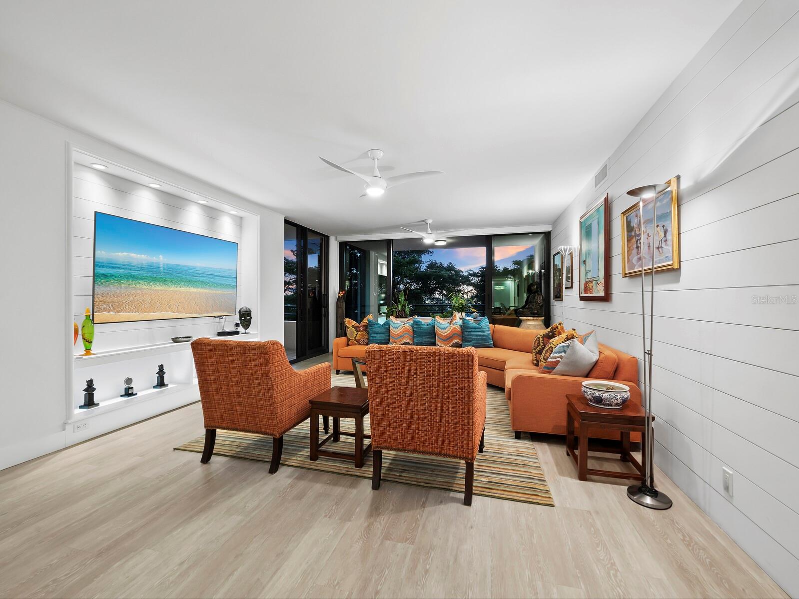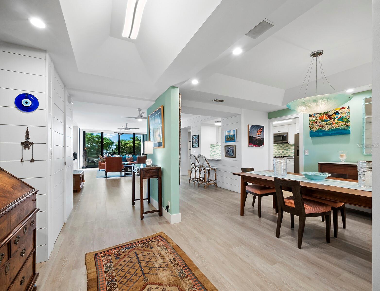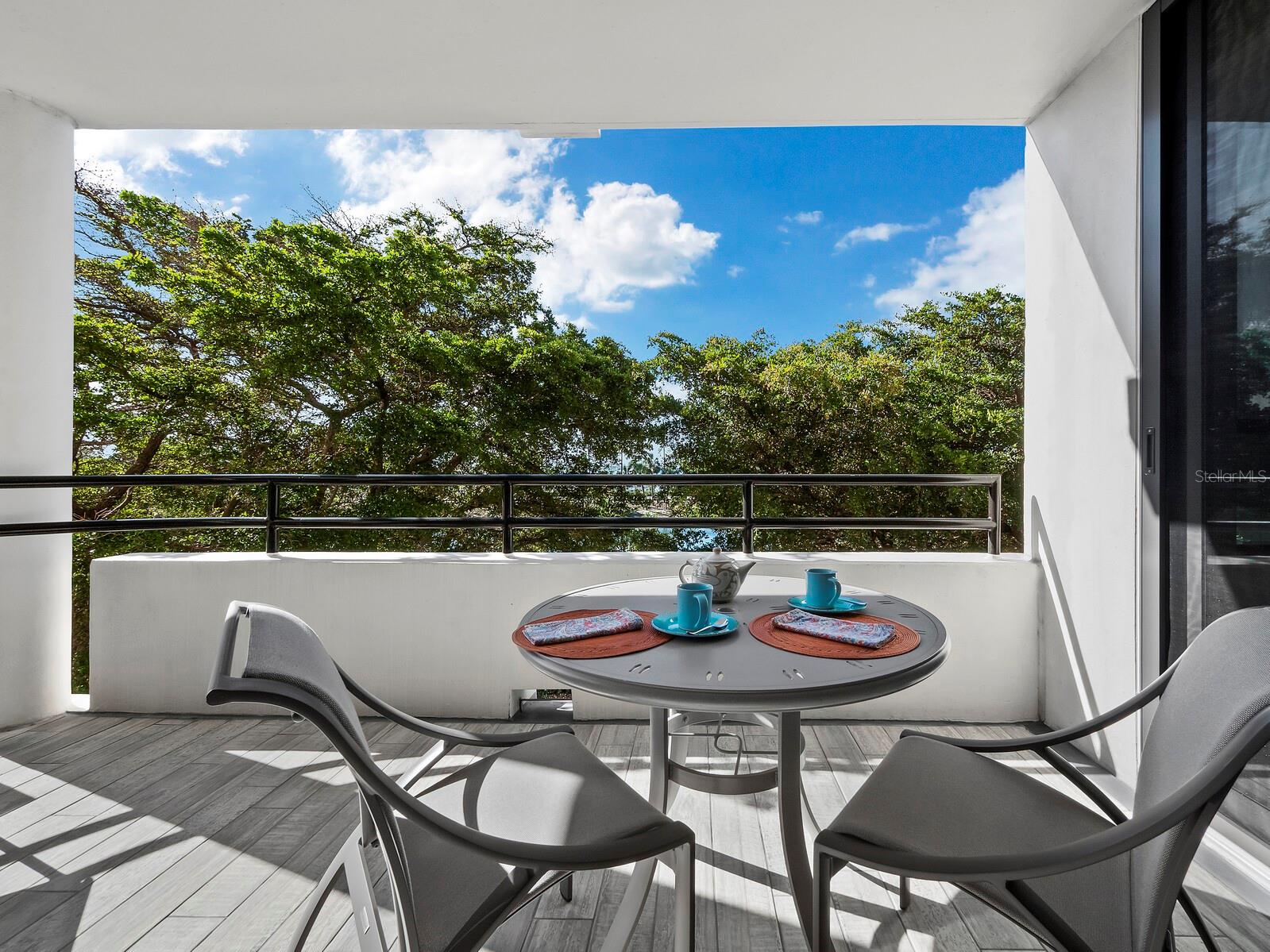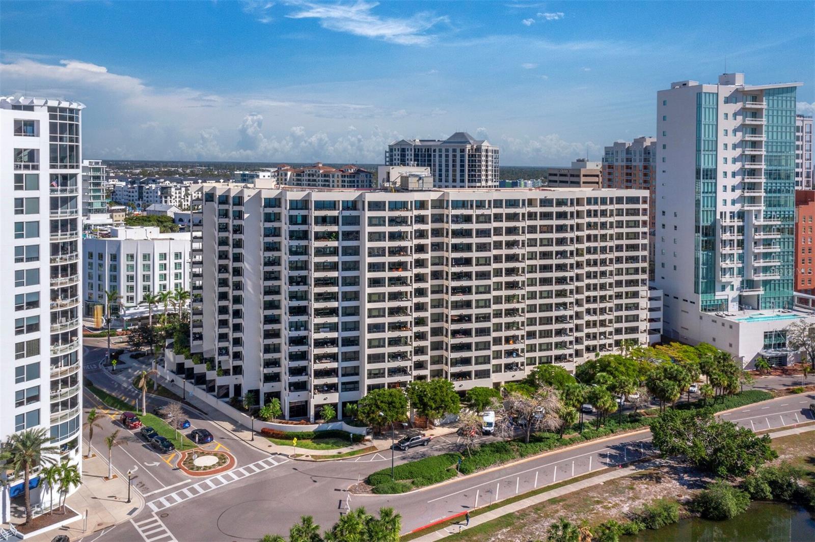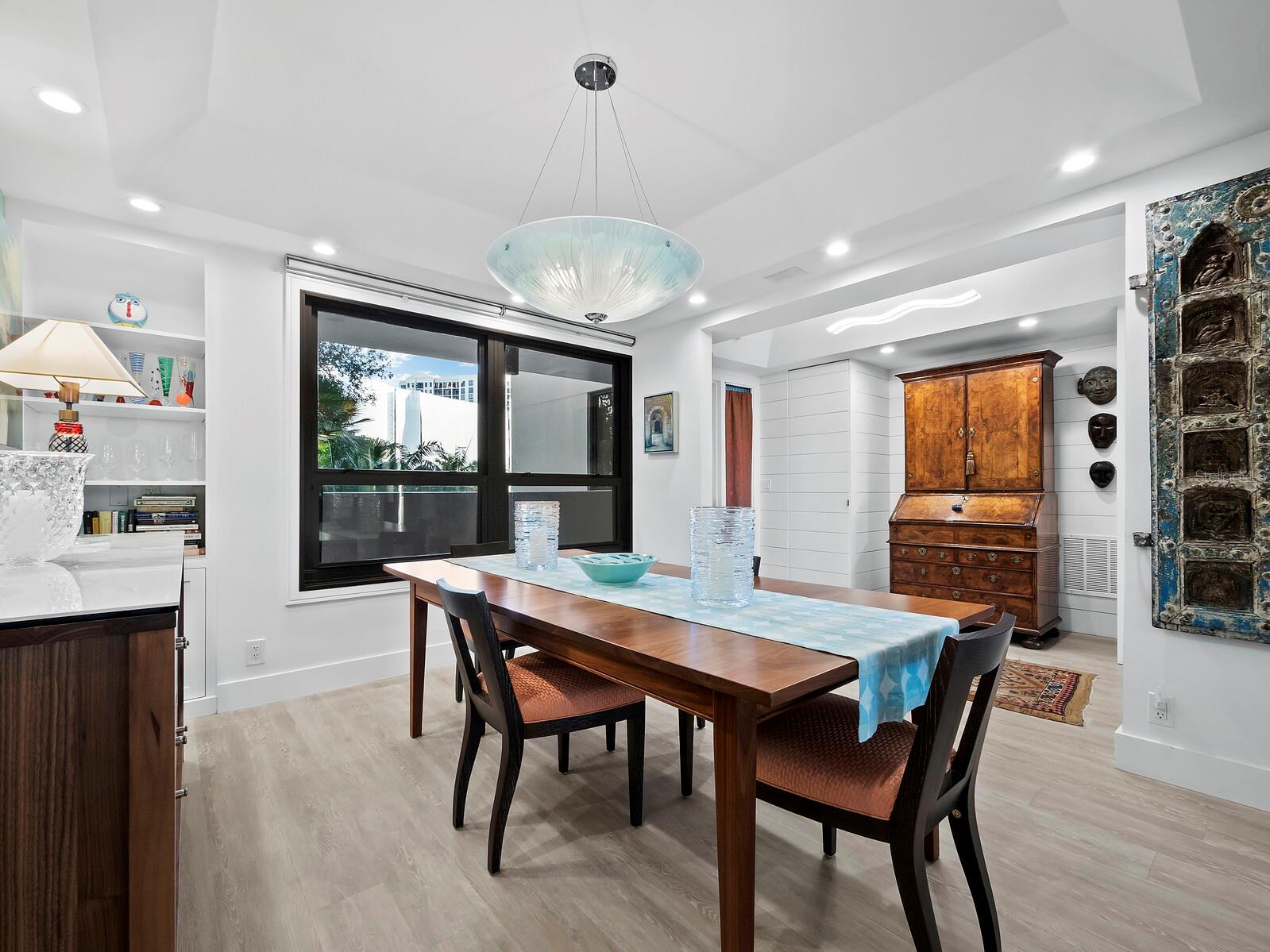 Experience a luxurious downtown Sarasota lifestyle in the highly coveted Bay Plaza condominium—with its timeless architectural appeal designed by renowned architect Tim Siebert. This location—this building—has everything one needs to immediately enjoy the convenience of downtown living. Sarasota is well-known as the cultural and creative coast of Florida. When you choose to live at Bay Plaza you are steps from enjoying performances by the Sarasota Opera or shows at one of Florida Studio Theater’s 5 stages, or for intellectual stimulation on global issues, there is SILL, Sarasota Institute for Lifetime Learning. Enjoy numerous restaurants and cafes with outdoor dining availability—all within steps of your front door. This handsomely renovated 2nd floor residence offers delicate views of Sarasota Bay through the airy structure of Shady Lady black olive trees lining the street below. The unit 204’s interior vibe is coastal contemporary, with shiplap walls and lighted insets, light wood-grained vinyl flooring throughout, LED lighting, ceiling fans and generous storage. The recent installation of new hurricane impact sliding doors, as well as windows, will provide peace of mind during inclement weather. You will appreciate the brightly updated kitchen with quartzite counters and designer backsplash, shaker cabinetry, and space to eat in casually, or possible other use as a den. The more formal dining area has a beautiful painted glass chandelier and easily accommodates up to 10 guests. The large living room has built in recessed cabinetry and gorgeous natural light from the two balconies. The owner's ensuite bath includes a large double floating vanity and backlit mirror, newly installed matching cabinetry across one wall for added storage, and separate shower/water closet with Toto toilet. In the suite, there are two walk in closets plus a linen closet. A private terrace is accessed from the primary suite, and new electronic roll-down shades provide complete privacy. The large guest suite on the opposite side of the apartment has access to the main terrace; there is a walk-in closet in the adjacent hallway, and a large guest bath with shower and laundry closet. Residents enjoy 5-star services, amenities, and security, including a full-service concierge, 24-hour valet parking, on-site management and maintenance, bike storage, large lobby with grand piano, well-equipped fitness center, locker rooms, each with sauna and steam, lap pool and hot tub, EV charging stations, media room, separate gathering room, catering kitchen, library. For the health enthusiasts, you are a short walk to the Ringling Bridge or enjoy Yoga at The Bay Park or nearby Marie Selby Botanical Garden. With a well-managed association and this impeccable building, you can immediately enjoy the lifestyle afforded by true downtown living at Sarasota’s Bay Plaza.