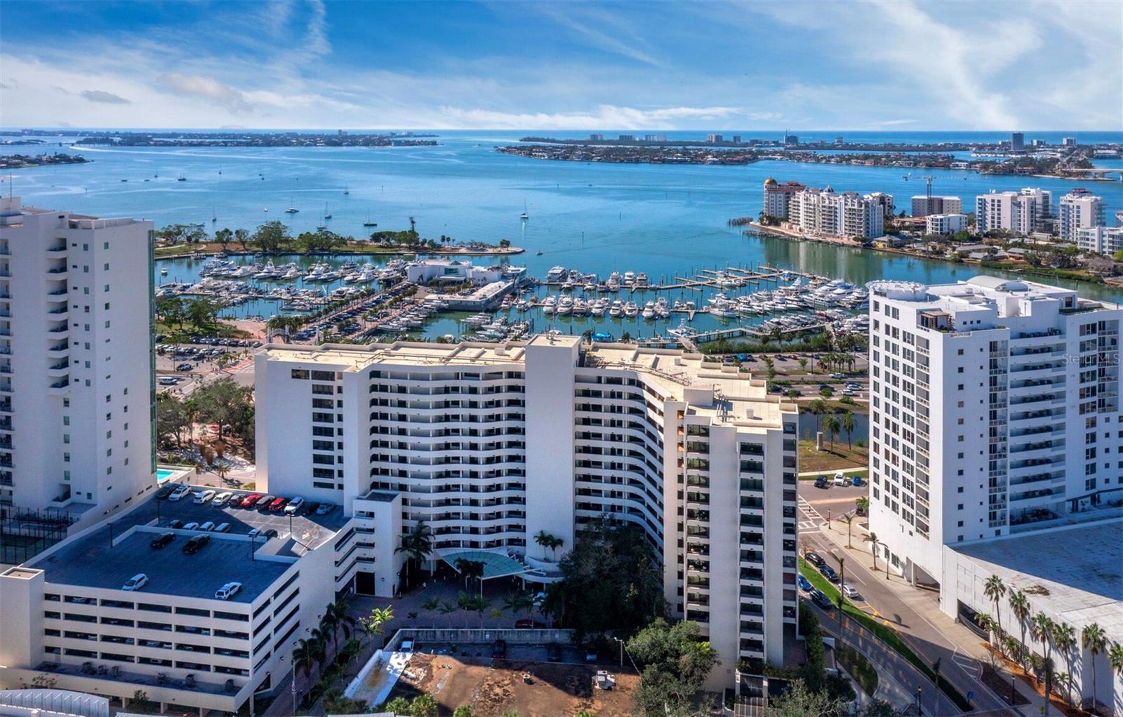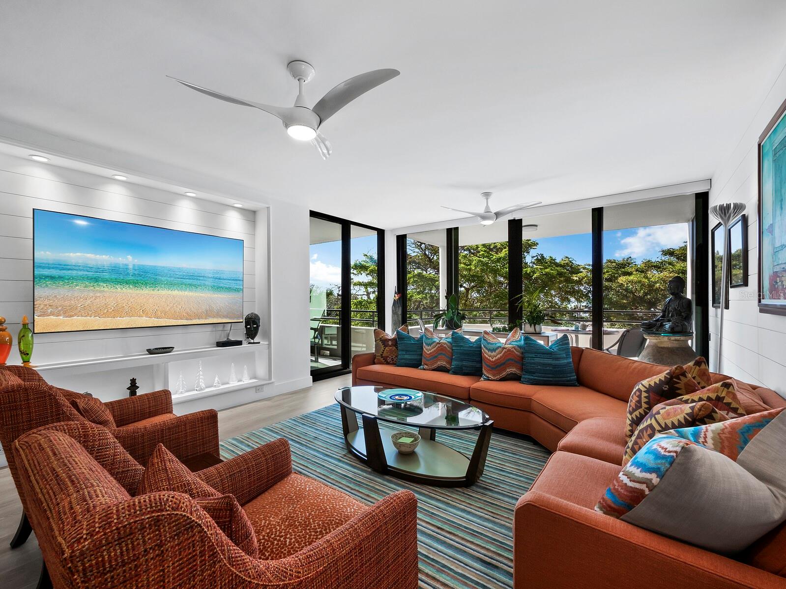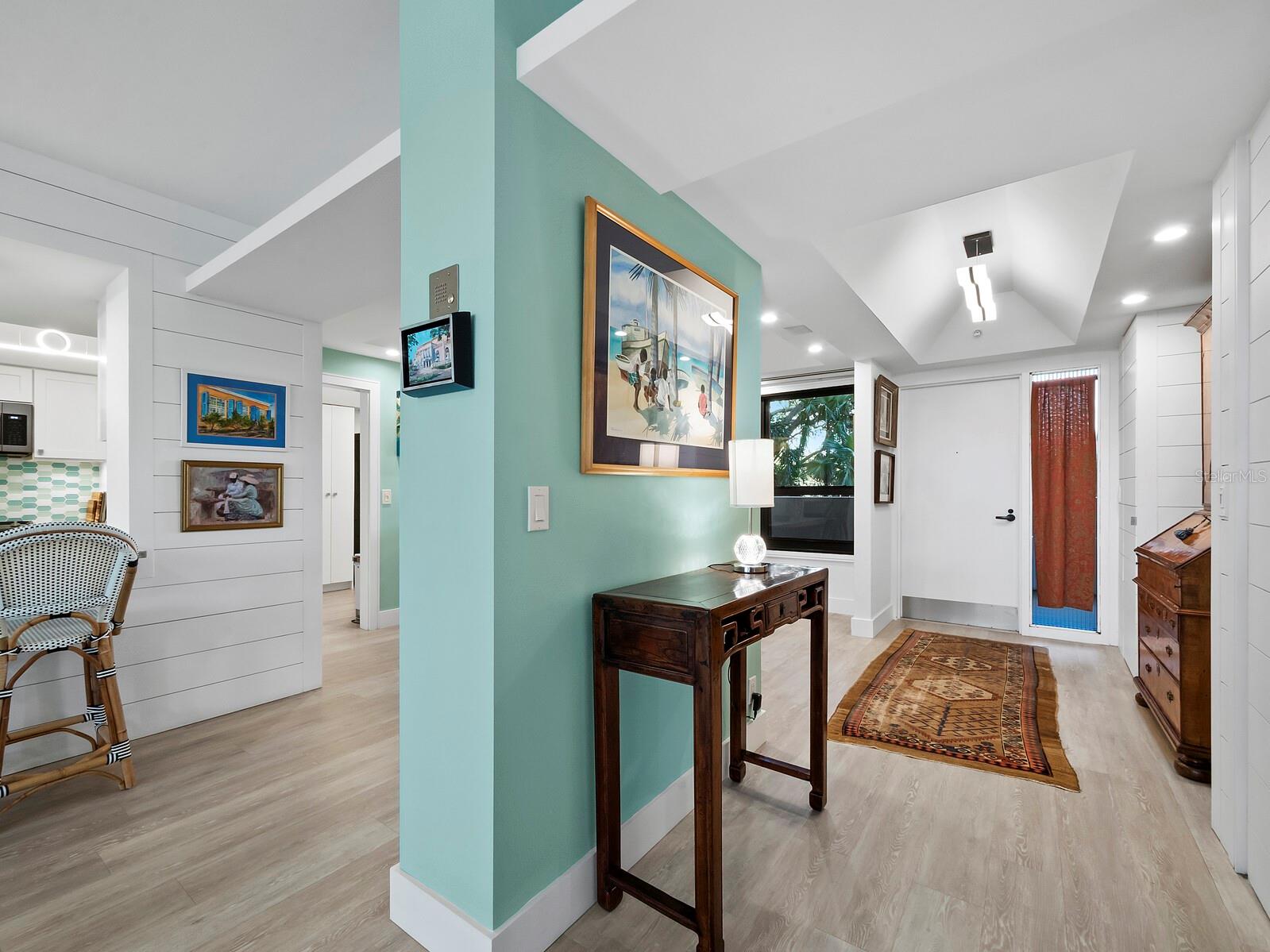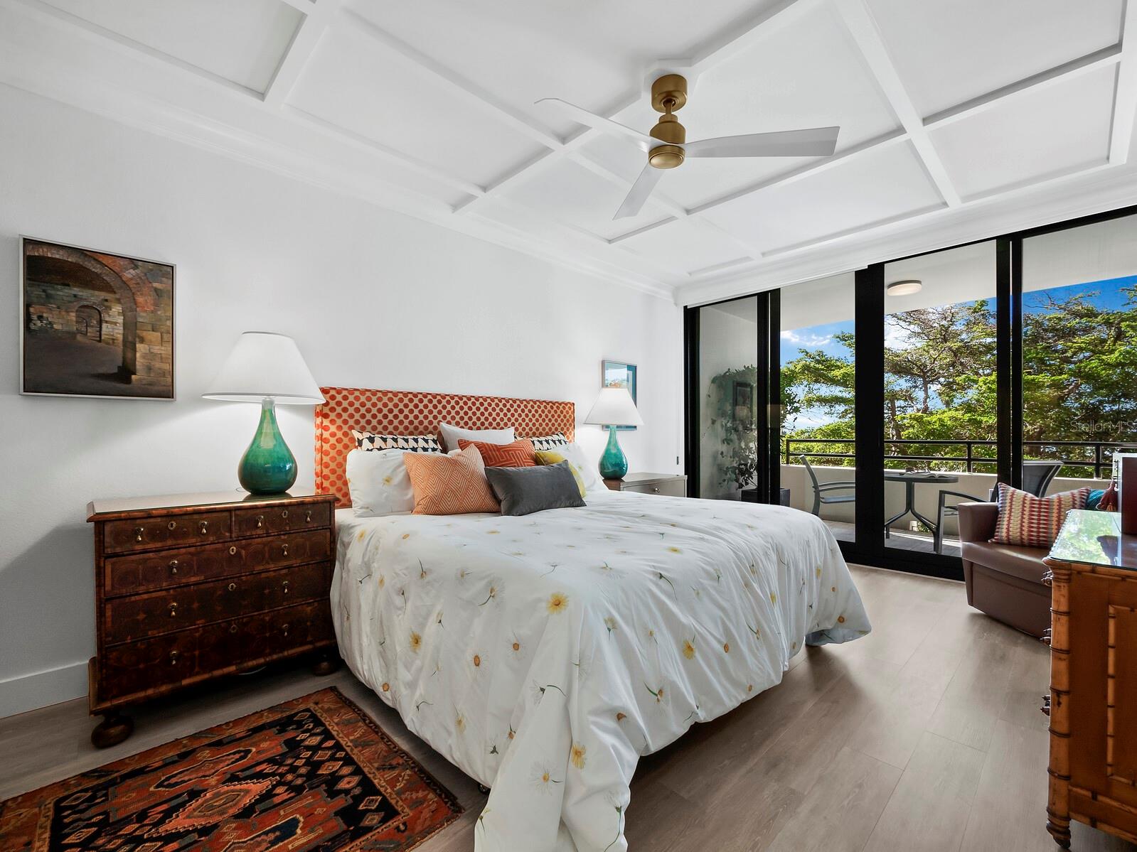 Experience a luxurious downtown Sarasota lifestyle in the highly coveted Bay Plaza condominium—with its timeless architectural appeal designed by renowned architect Tim Siebert. This location—this building—has everything one needs to immediately enjoy the convenience of downtown living. Sarasota is well-known as the cultural and creative coast of Florida. When you choose to live at Bay Plaza you are steps from enjoying performances by the Sarasota Opera or shows at one of Florida Studio Theater’s 5 stages, or for intellectual stimulation on global issues, there is SILL, Sarasota Institute for Lifetime Learning. Enjoy numerous restaurants and cafes with outdoor dining availability—all within steps of your front door. This handsomely renovated 2nd floor residence offers delicate views of Sarasota Bay through the airy structure of Shady Lady black olive trees lining the street below. The unit 204’s interior vibe is coastal contemporary, with shiplap walls and lighted insets, light wood-grained vinyl flooring throughout, LED lighting, ceiling fans and generous storage. The recent installation of new hurricane impact sliding doors, as well as windows, will provide peace of mind during inclement weather. You will appreciate the brightly updated kitchen with quartzite counters and designer backsplash, shaker cabinetry, and space to eat in casually, or possible other use as a den. The more formal dining area has a beautiful painted glass chandelier and easily accommodates up to 10 guests. The large living room has built in recessed cabinetry and gorgeous natural light from the two balconies. The owner's ensuite bath includes a large double floating vanity and backlit mirror, newly installed matching cabinetry across one wall for added storage, and separate shower/water closet with Toto toilet. In the suite, there are two walk in closets plus a linen closet. A private terrace is accessed from the primary suite, and new electronic roll-down shades provide complete privacy. The large guest suite on the opposite side of the apartment has access to the main terrace; there is a walk-in closet in the adjacent hallway, and a large guest bath with shower and laundry closet. Residents enjoy 5-star services, amenities, and security, including a full-service concierge, 24-hour valet parking, on-site management and maintenance, bike storage, large lobby with grand piano, well-equipped fitness center, locker rooms, each with sauna and steam, lap pool and hot tub, EV charging stations, media room, separate gathering room, catering kitchen, library. For the health enthusiasts, you are a short walk to the Ringling Bridge or enjoy Yoga at The Bay Park or nearby Marie Selby Botanical Garden. With a well-managed association and this impeccable building, you can immediately enjoy the lifestyle afforded by true downtown living at Sarasota’s Bay Plaza.
