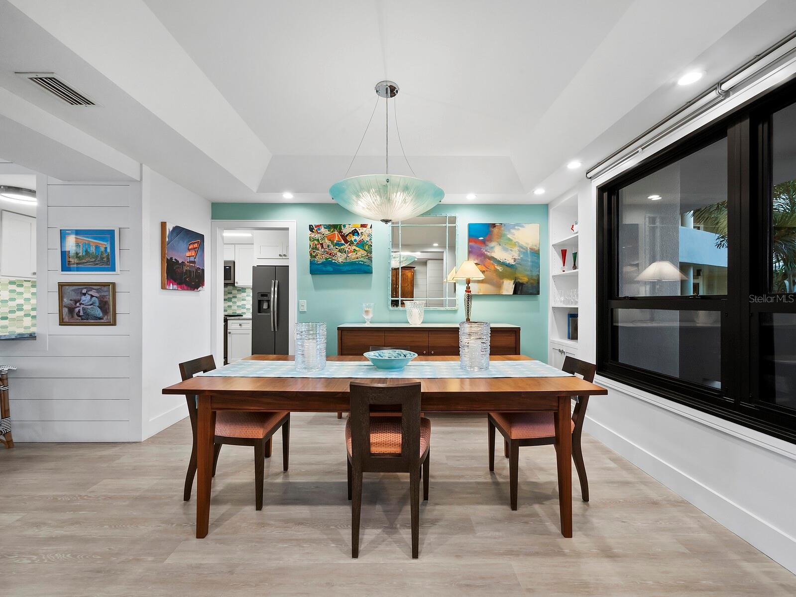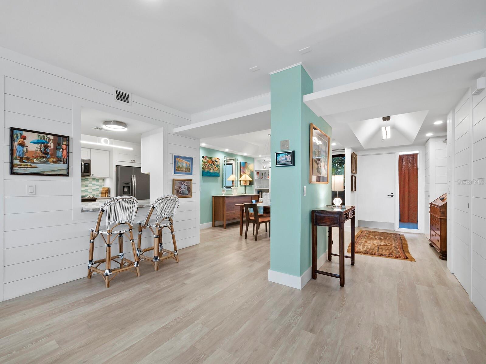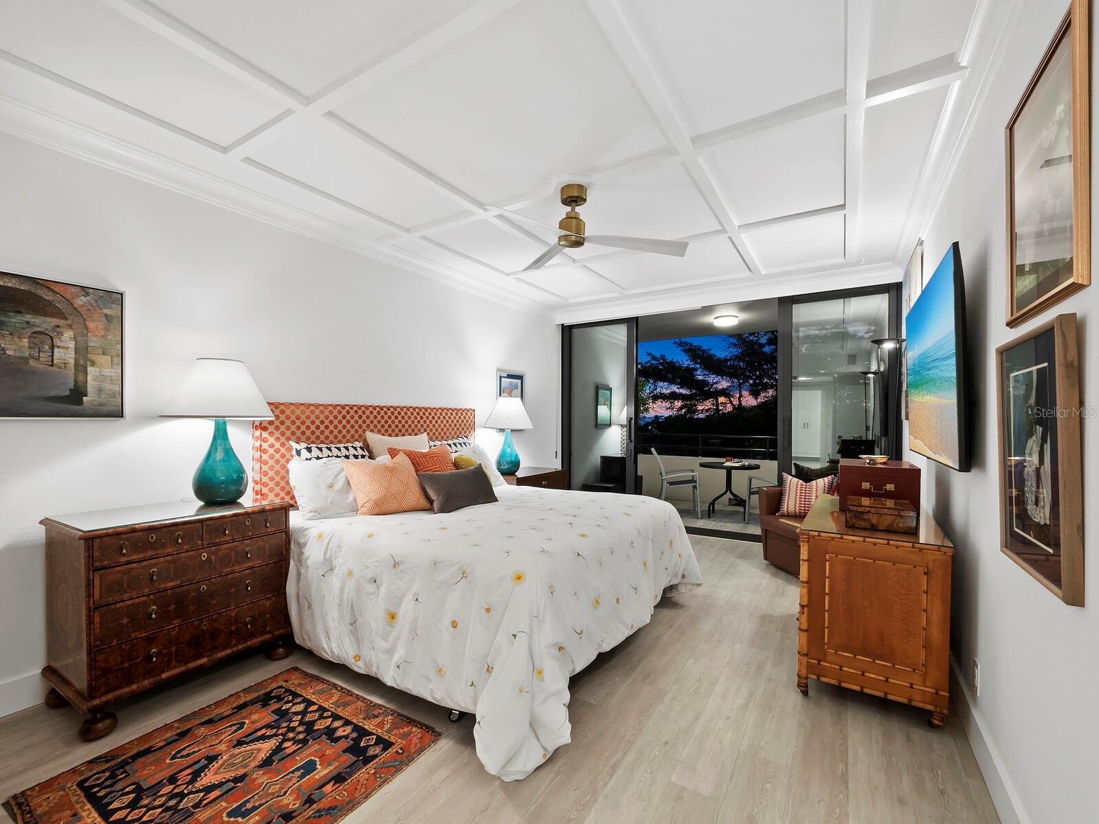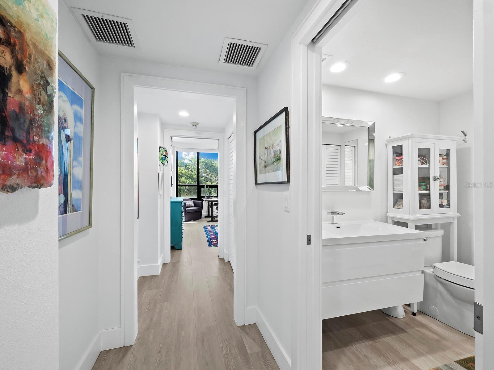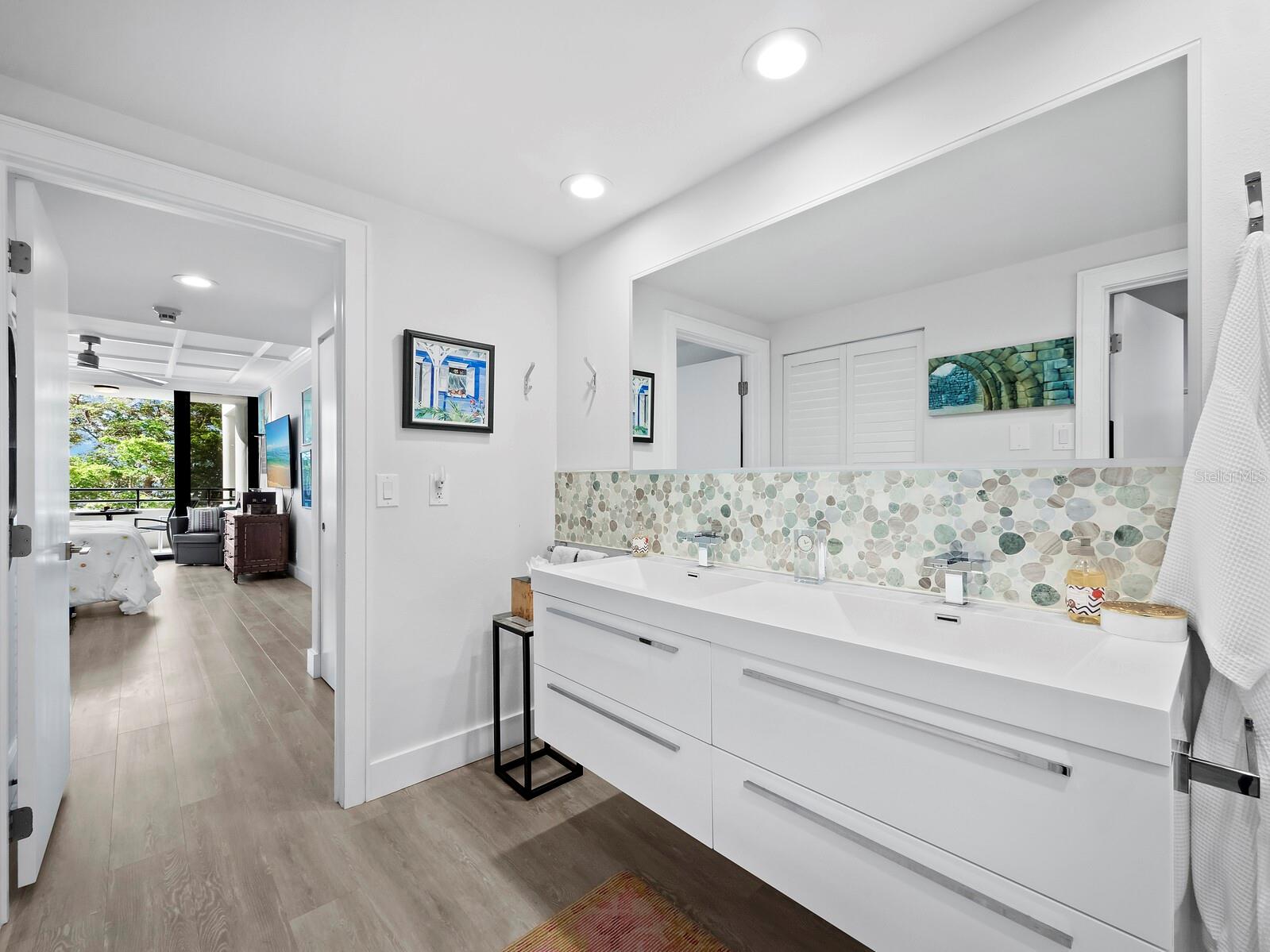 Experience a luxurious downtown Sarasota lifestyle in the highly coveted Bay Plaza condominium—with its timeless architectural appeal designed by renowned architect Tim Siebert. This location—this building—has everything one needs to immediately enjoy the convenience of downtown living. Sarasota is well-known as the cultural and creative coast of Florida. When you choose to live at Bay Plaza you are steps from enjoying performances by the Sarasota Opera or shows at one of Florida Studio Theater’s 5 stages, or for intellectual stimulation on global issues, there is SILL, Sarasota Institute for Lifetime Learning. Enjoy numerous restaurants and cafes with outdoor dining availability—all within steps of your front door. This handsomely renovated 2nd floor residence offers delicate views of Sarasota Bay through the airy structure of Shady Lady black olive trees lining the street below. The unit 204’s interior vibe is coastal contemporary, with shiplap walls and lighted insets, light wood-grained vinyl flooring throughout, LED lighting, ceiling fans and generous storage. The recent installation of new hurricane impact sliding doors, as well as windows, will provide peace of mind during inclement weather. You will appreciate the brightly updated kitchen with quartzite counters and designer backsplash, shaker cabinetry, and space to eat in casually, or possible other use as a den. The more formal dining area has a beautiful painted glass chandelier and easily accommodates up to 10 guests. The large living room has built in recessed cabinetry and gorgeous natural light from the two balconies. The owner's ensuite bath includes a large double floating vanity and backlit mirror, newly installed matching cabinetry across one wall for added storage, and separate shower/water closet with Toto toilet. In the suite, there are two walk in closets plus a linen closet. A private terrace is accessed from the primary suite, and new electronic roll-down shades provide complete privacy. The large guest suite on the opposite side of the apartment has access to the main terrace; there is a walk-in closet in the adjacent hallway, and a large guest bath with shower and laundry closet. Residents enjoy 5-star services, amenities, and security, including a full-service concierge, 24-hour valet parking, on-site management and maintenance, bike storage, large lobby with grand piano, well-equipped fitness center, locker rooms, each with sauna and steam, lap pool and hot tub, EV charging stations, media room, separate gathering room, catering kitchen, library. For the health enthusiasts, you are a short walk to the Ringling Bridge or enjoy Yoga at The Bay Park or nearby Marie Selby Botanical Garden. With a well-managed association and this impeccable building, you can immediately enjoy the lifestyle afforded by true downtown living at Sarasota’s Bay Plaza.