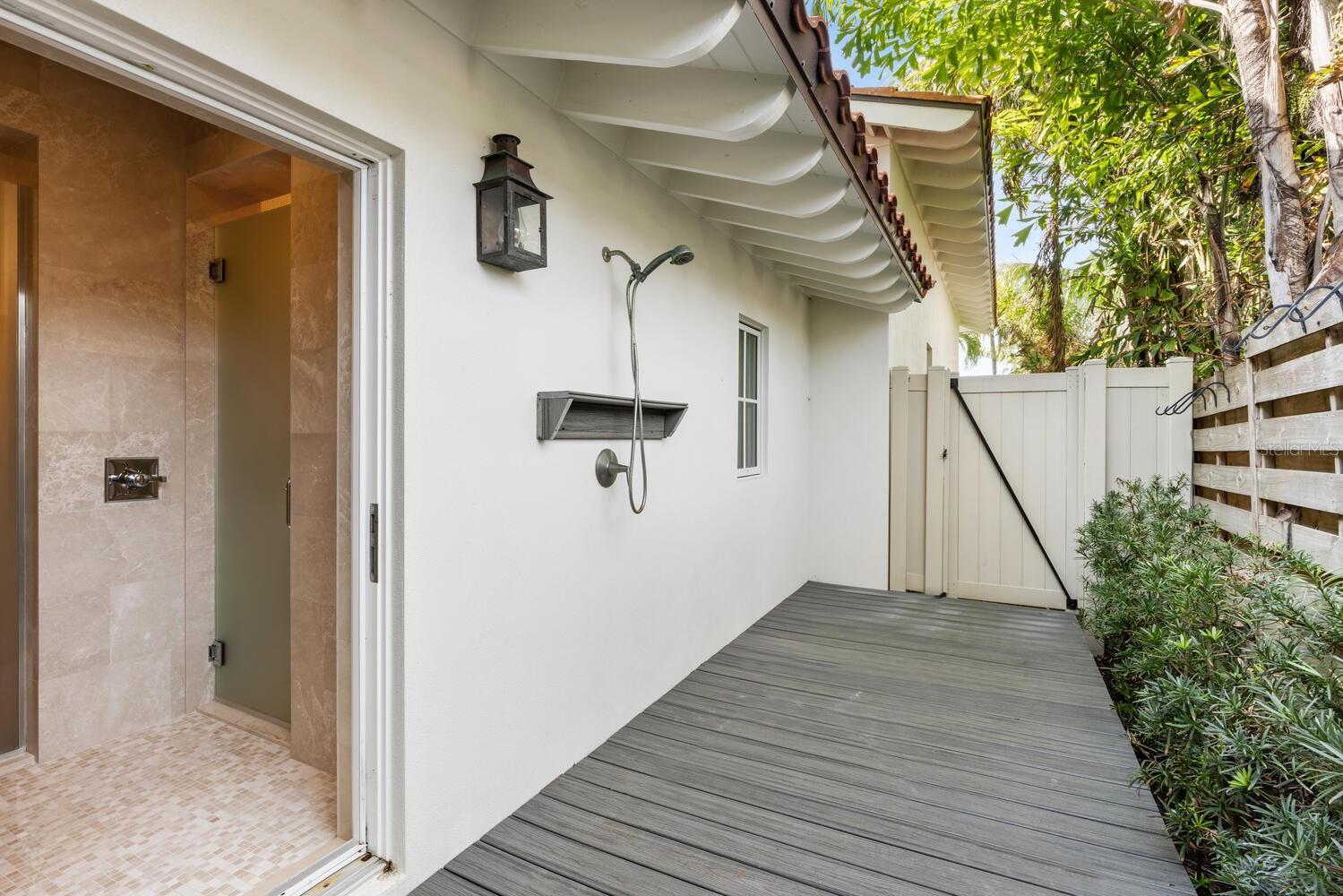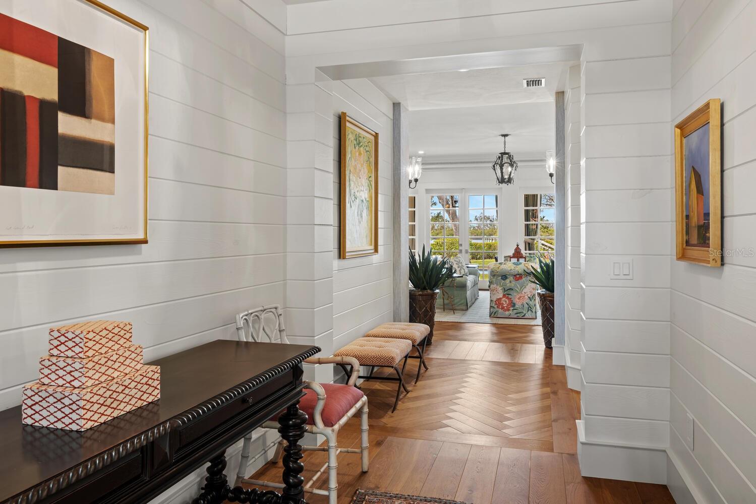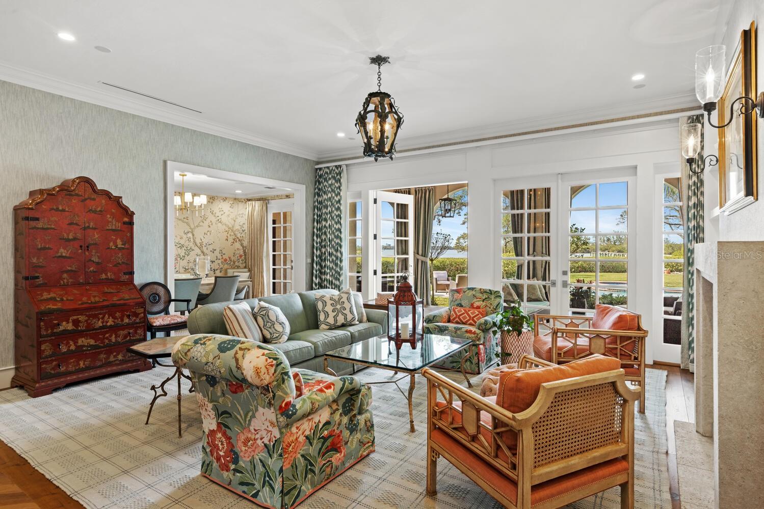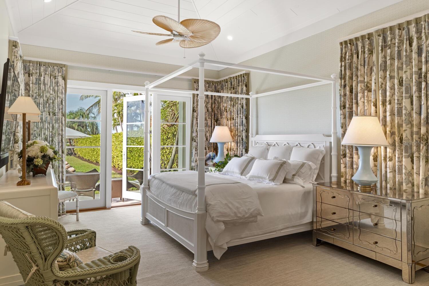 A testament to timeless elegance and the tropical charm of coastal living, securely situated at or above base flood elevation and not impacted by the recent storms, this exceptional Bayfront estate rests on nearly one acre, boasting 180 feet of water frontage and effective year built 2016. Fully renovated and expanded in 2017, it offers breathtaking, uninterrupted views of Roberts Bay and the intracoastal Waterway, where mesmerizing sunsets serve as a daily invitation to pause and savor the moment. Nestled privately off Red Rock Way, the property ensures tranquility and seclusion. A grand entrance leads you past the library into the casually sophisticated living room, featuring French doors, a custom coral gas fireplace, and French oak flooring. Adjacent to the living spaces, the dining room and expansive covered terrace create the perfect ambiance for entertaining, with coral flooring and a pecky cypress ceiling adding character and charm. The gourmet kitchen is a chef’s dream, showcasing custom cabinetry in painted wood and natural walnut, luxurious Calacatta gold marble and quartz countertops, Thermador appliances, a spacious island, and a convenient wet bar. The inviting family room, complete with a wood-burning fireplace and French doors, opens to yet another terrace, seamlessly blending indoor and outdoor living. The master suite is a serene retreat, featuring a vaulted paneled ceiling, a large private terrace, his-and-her bathrooms, an outdoor shower, and oversized walk-in closets. The second floor hosts three en-suite bedrooms, while a fifth guest suite offers complete privacy, making it ideal for visitors. The backyard is a true oasis, highlighted by a heated pool with a spa, surrounded by fresh landscaping, mature palms, and century-old oak trees. The waterfront dock caters to boating enthusiasts, water sports lovers, anglers, and those who enjoy soaking in the sunset views. Located west of the Trail, this remarkable estate is just minutes from world-class beaches, vibrant cultural venues, exquisite dining, and an array of recreational activities.