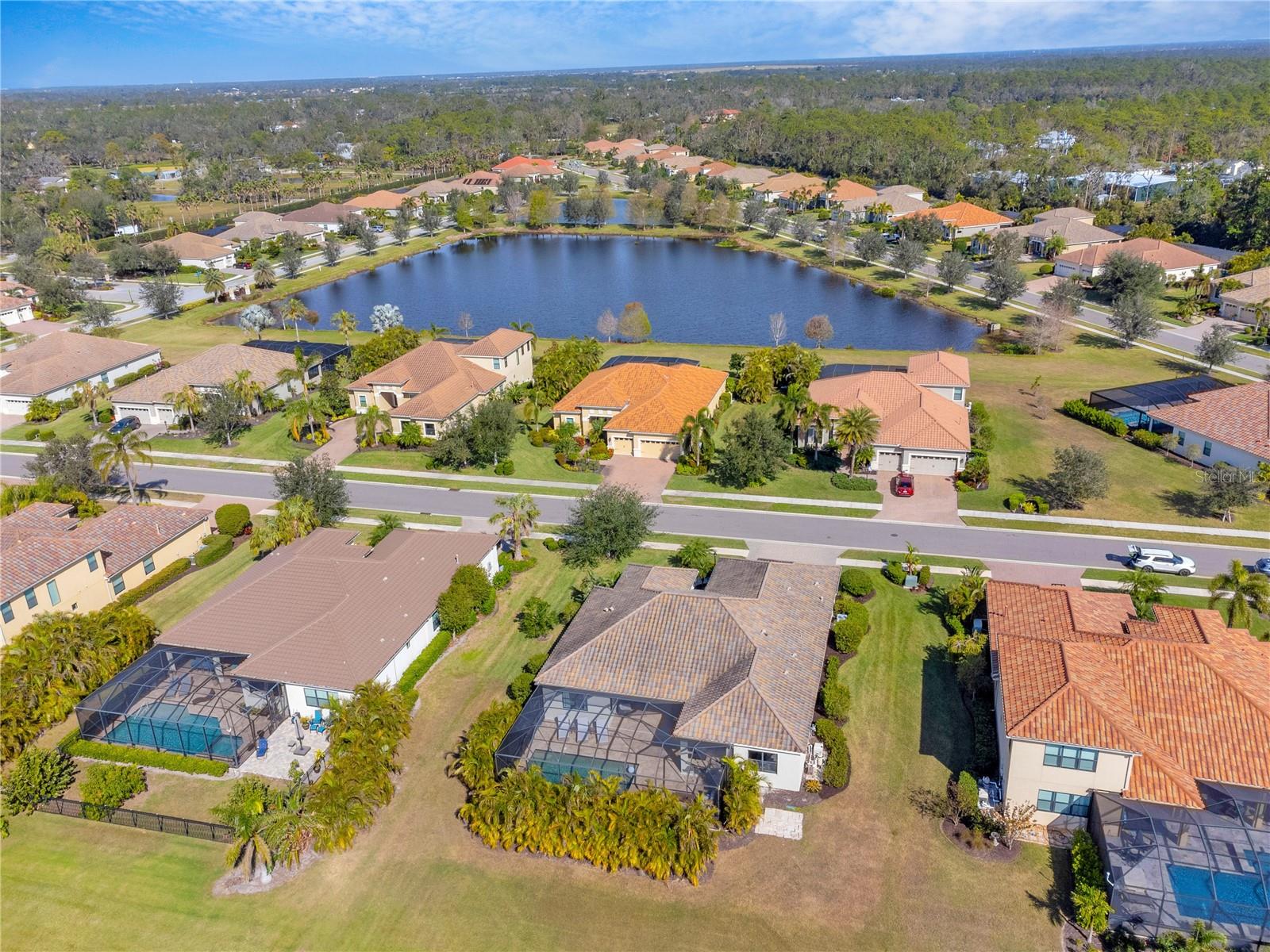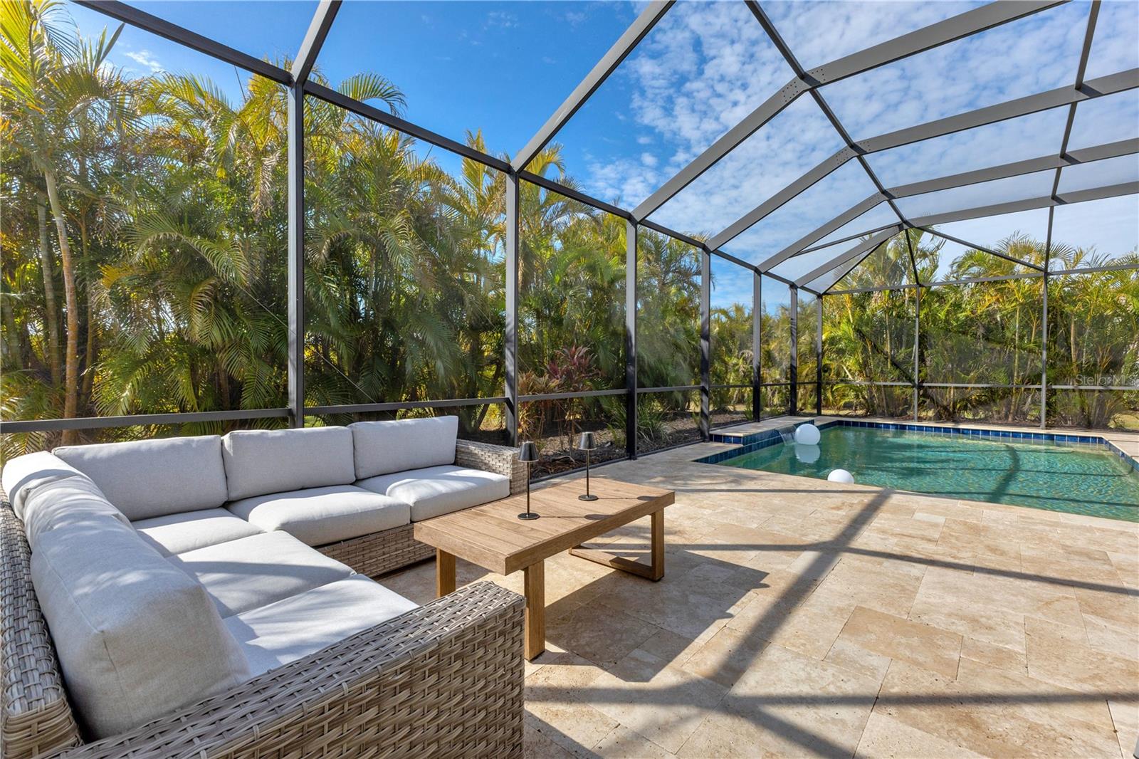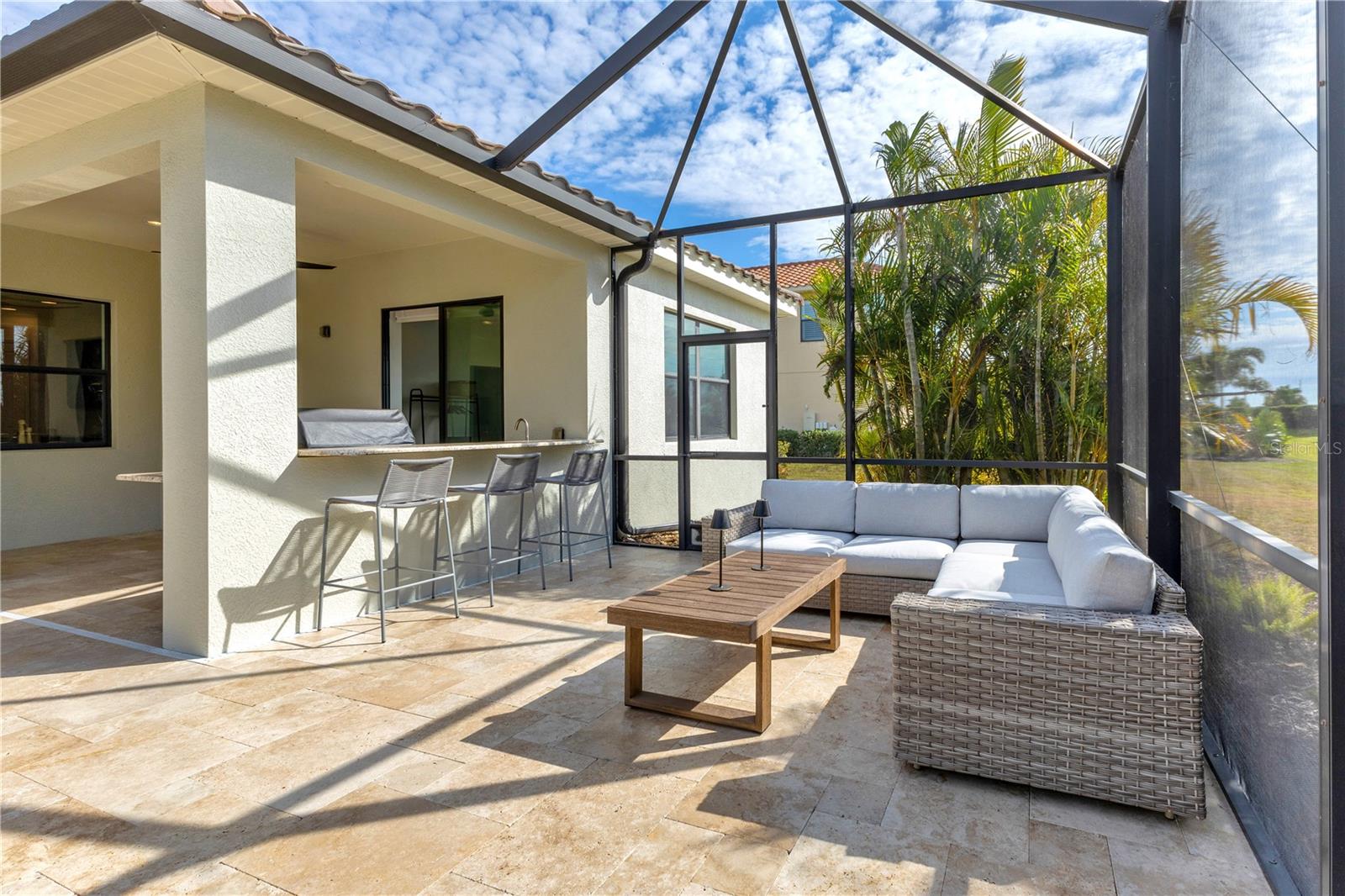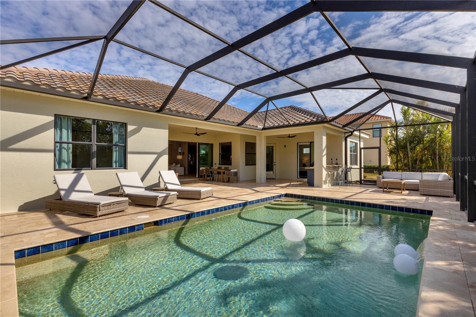 Welcome to Wildgrass, an exclusive gated community offering estate-size almost 1/2 acre lots, just minutes away from shopping, dining, and entertainment, and a short drive to the stunning Siesta Key Beach. This exquisite 4-bedroom, 3-bath pool home embodies the luxury and craftsmanship of a Neal Signature Homes. From the moment you drive up, you will be captivated by the beautifully manicured lawns and lush landscaping, with a stunning elevation, paver walkway and driveway that set the tone for the elegance within. Inside, architectural details abound, including arches, step ceilings, columns, crown molding, and more, providing an ambiance of sophistication throughout. The gourmet kitchen is a true masterpiece, featuring custom wood cabinets, granite countertops, decorative tile backsplash, stainless steel appliances with a gas cooktop, built-in convection oven and microwave oven, and a stainless steel cooktop hood. A large breakfast bar with pendant lighting offers ample seating, making it perfect for family gatherings or casual meals. The open and airy floor plan continues to impress with interior and exterior gathering spaces, and a spacious primary suite that offers direct access to the pool area, two large walk-in closets, and an elegant bath with dual sinks, granite countertops, custom cabinetry, a soaking tub, and a large walk-in shower with a frameless glass door. The additional bedrooms provide plenty of space for guests, while the versatile 4th bedroom, with engineered wood flooring and direct access to the outdoor living area, can serve as a home office. The 4th bedroom also has an adjacent bath, which functions as both a pool bath and a convenient guest bath. Step outside to the expansive outdoor living area, featuring a large pool with a PebbleTec finish, a soothing waterfall water feature, and a newer outdoor kitchen with a built-in grill, sink, refrigerator, and granite countertops. The travertine flooring, recently sealed, adds a touch of luxury, and lush landscaping ensures privacy for your enjoyment. The 3-car garage is impeccably designed with newly epoxied floors and offers plenty of space for both vehicles and storage. Notable upgrades include a dishwasher, outdoor kitchen, gutters and downspouts, garbage disposal, fresh interior and exterior paint, epoxied garage floors, sealed travertine, indoor and outdoor fans, pool heater control pad, a Wi-Fi-enabled Rainbird irrigation control panel, and a Lorex outdoor security camera system. This home truly offers the best of indoor and outdoor living in one of the most sought-after communities. Don’t miss the opportunity to make this stunning property your own!