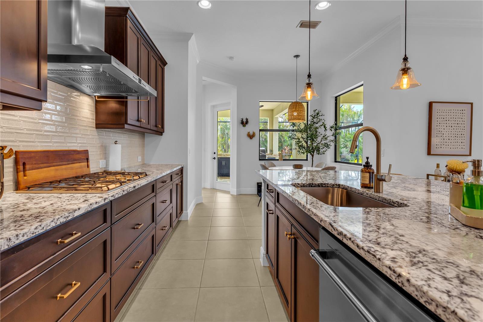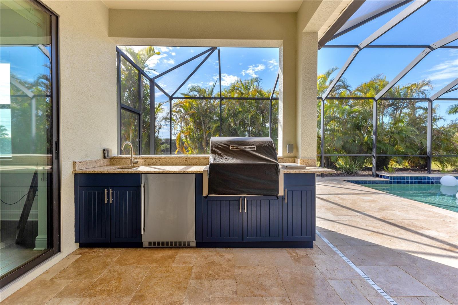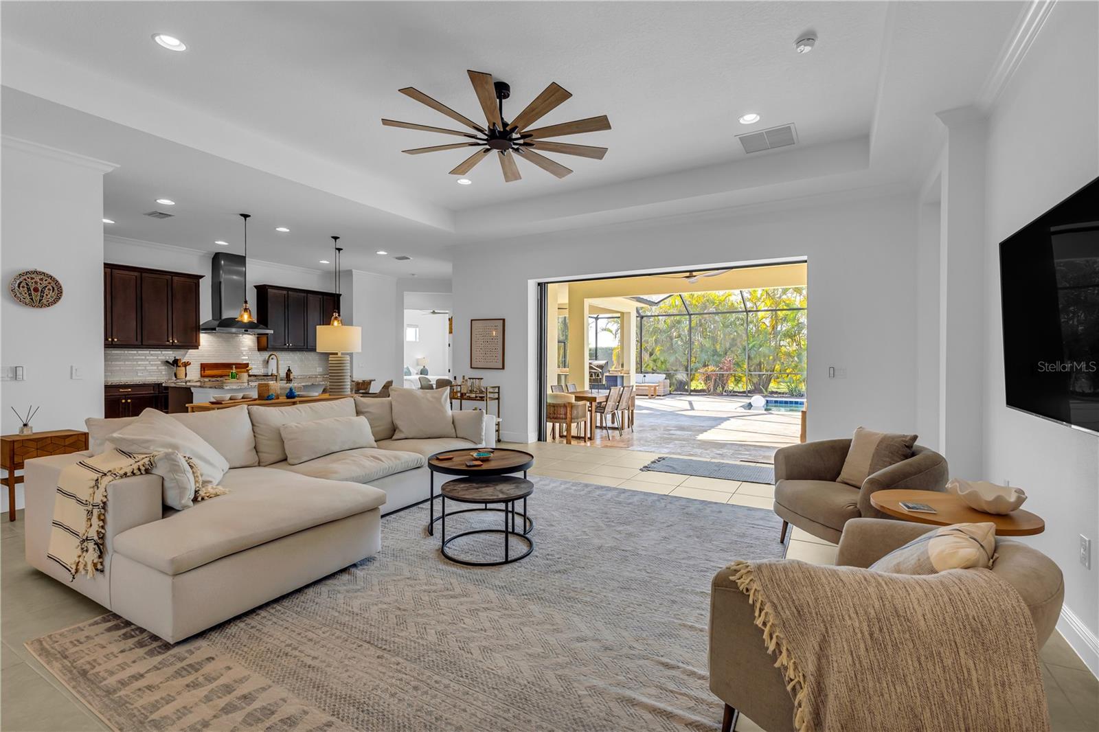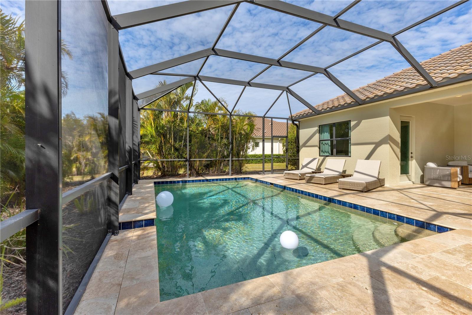 Welcome to Wildgrass, an exclusive gated community offering estate-size almost 1/2 acre lots, just minutes away from shopping, dining, and entertainment, and a short drive to the stunning Siesta Key Beach. This exquisite 4-bedroom, 3-bath pool home embodies the luxury and craftsmanship of a Neal Signature Homes. From the moment you drive up, you will be captivated by the beautifully manicured lawns and lush landscaping, with a stunning elevation, paver walkway and driveway that set the tone for the elegance within. Inside, architectural details abound, including arches, step ceilings, columns, crown molding, and more, providing an ambiance of sophistication throughout. The gourmet kitchen is a true masterpiece, featuring custom wood cabinets, granite countertops, decorative tile backsplash, stainless steel appliances with a gas cooktop, built-in convection oven and microwave oven, and a stainless steel cooktop hood. A large breakfast bar with pendant lighting offers ample seating, making it perfect for family gatherings or casual meals. The open and airy floor plan continues to impress with interior and exterior gathering spaces, and a spacious primary suite that offers direct access to the pool area, two large walk-in closets, and an elegant bath with dual sinks, granite countertops, custom cabinetry, a soaking tub, and a large walk-in shower with a frameless glass door. The additional bedrooms provide plenty of space for guests, while the versatile 4th bedroom, with engineered wood flooring and direct access to the outdoor living area, can serve as a home office. The 4th bedroom also has an adjacent bath, which functions as both a pool bath and a convenient guest bath. Step outside to the expansive outdoor living area, featuring a large pool with a PebbleTec finish, a soothing waterfall water feature, and a newer outdoor kitchen with a built-in grill, sink, refrigerator, and granite countertops. The travertine flooring, recently sealed, adds a touch of luxury, and lush landscaping ensures privacy for your enjoyment. The 3-car garage is impeccably designed with newly epoxied floors and offers plenty of space for both vehicles and storage. Notable upgrades include a dishwasher, outdoor kitchen, gutters and downspouts, garbage disposal, fresh interior and exterior paint, epoxied garage floors, sealed travertine, indoor and outdoor fans, pool heater control pad, a Wi-Fi-enabled Rainbird irrigation control panel, and a Lorex outdoor security camera system. This home truly offers the best of indoor and outdoor living in one of the most sought-after communities. Don’t miss the opportunity to make this stunning property your own!