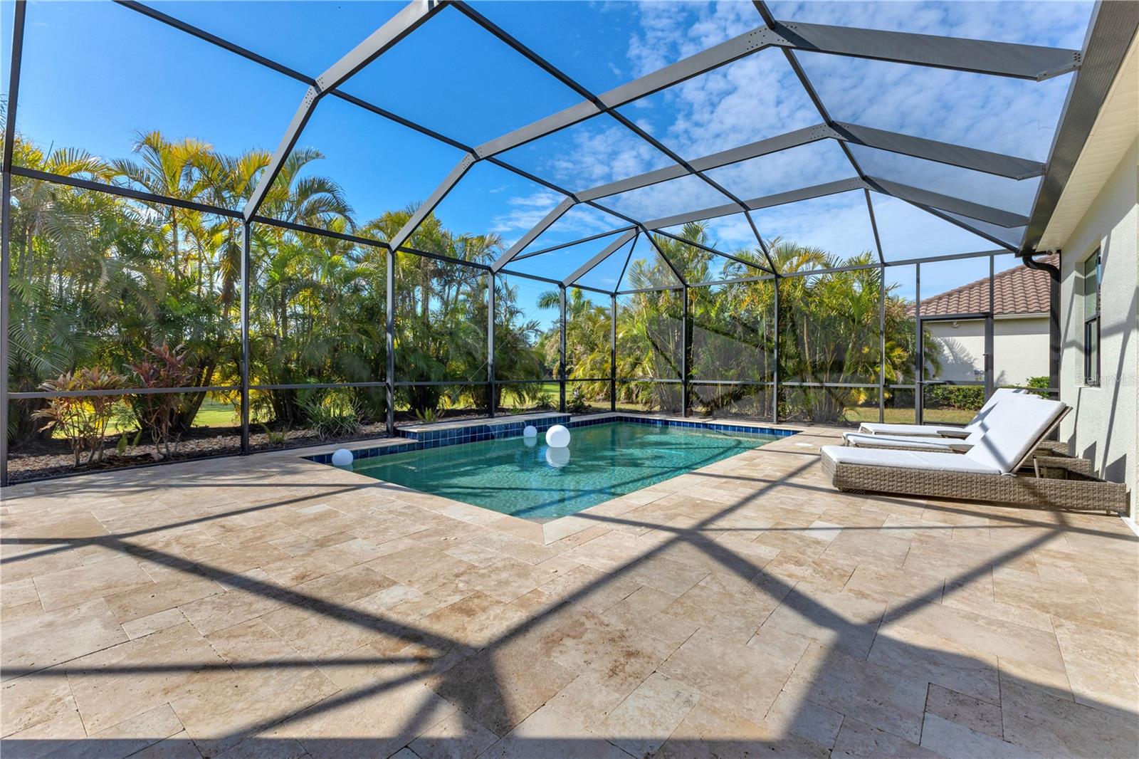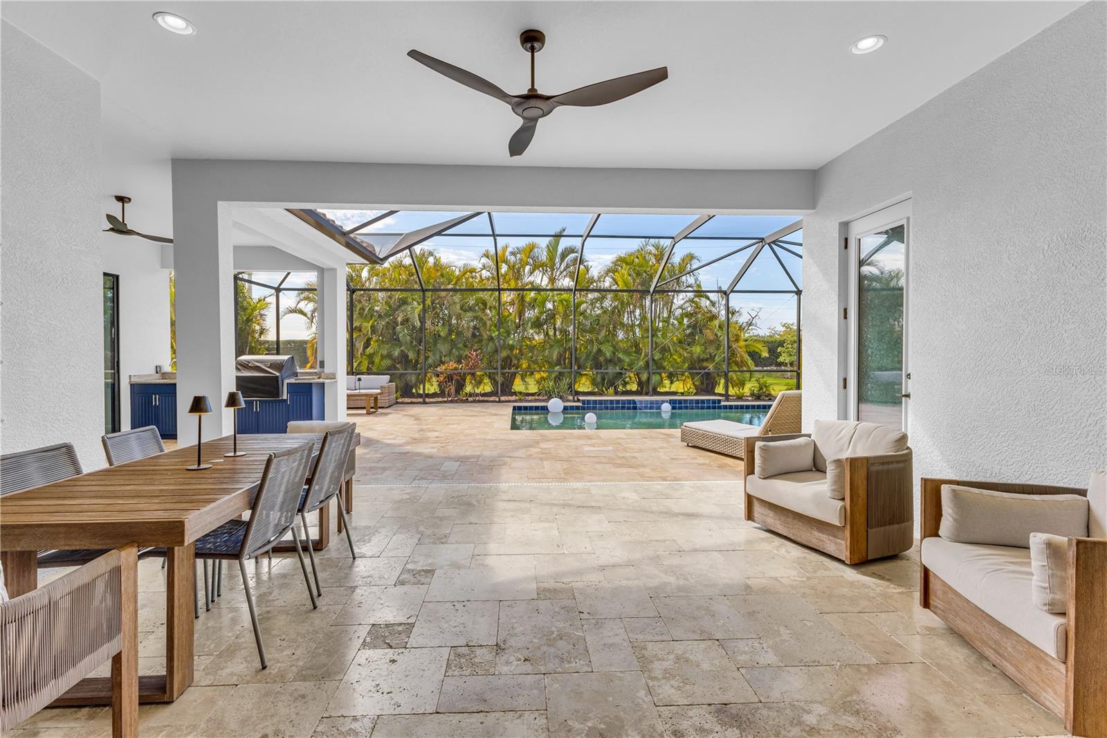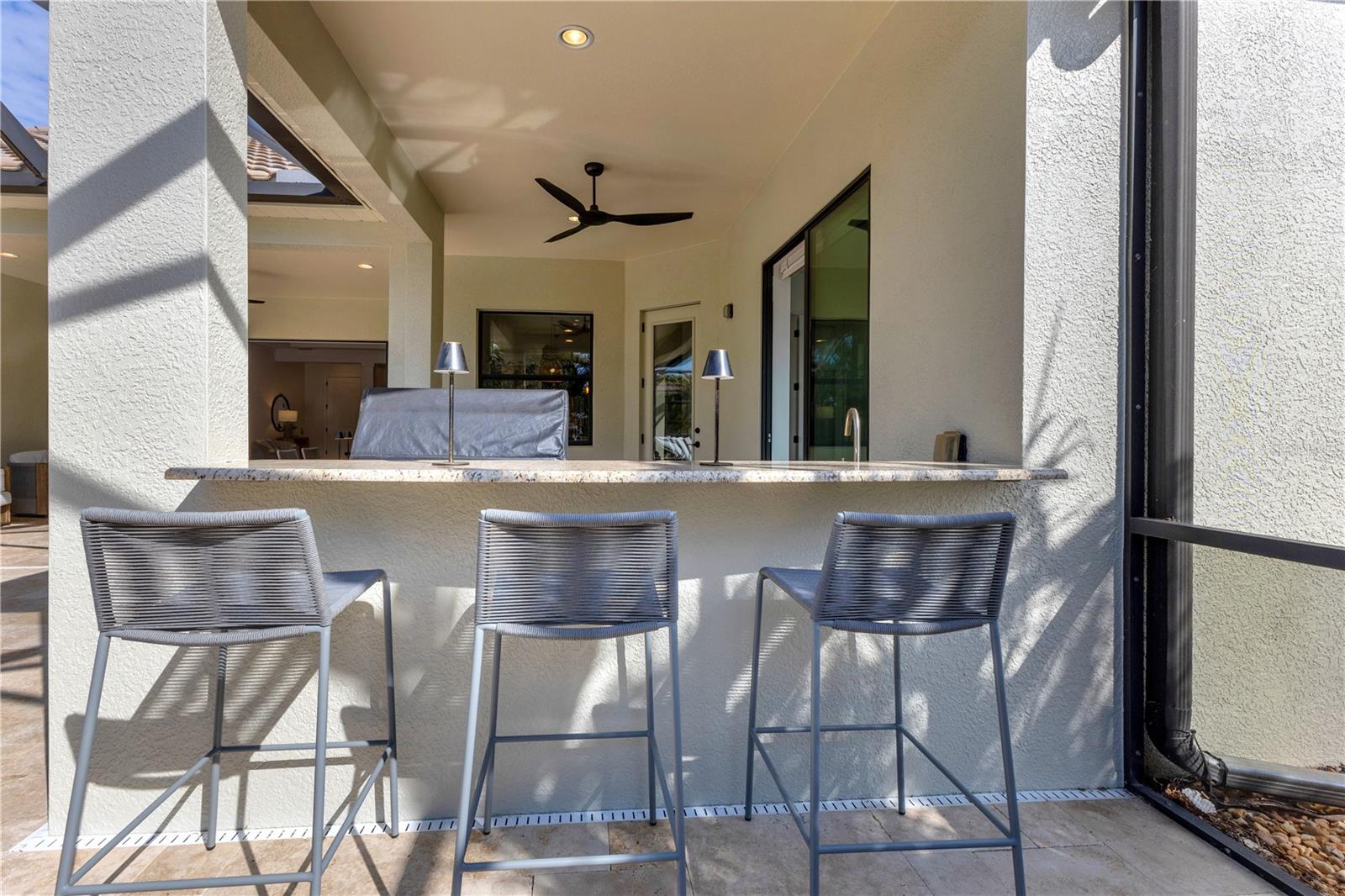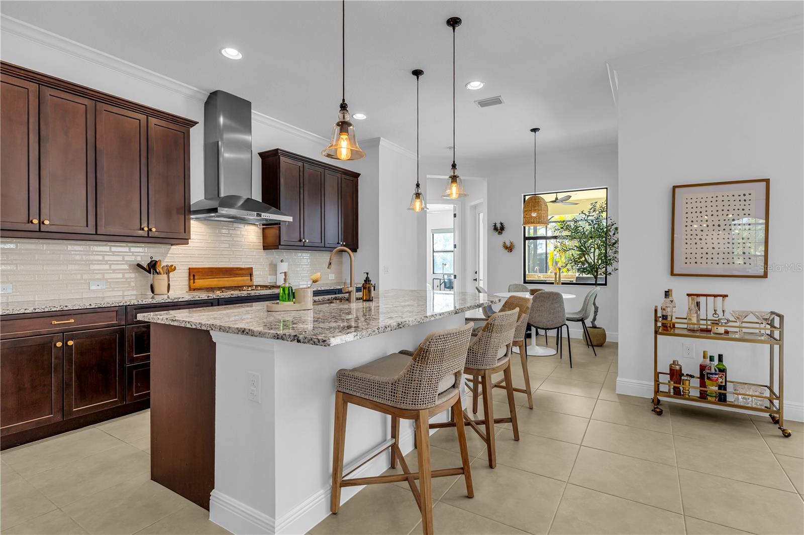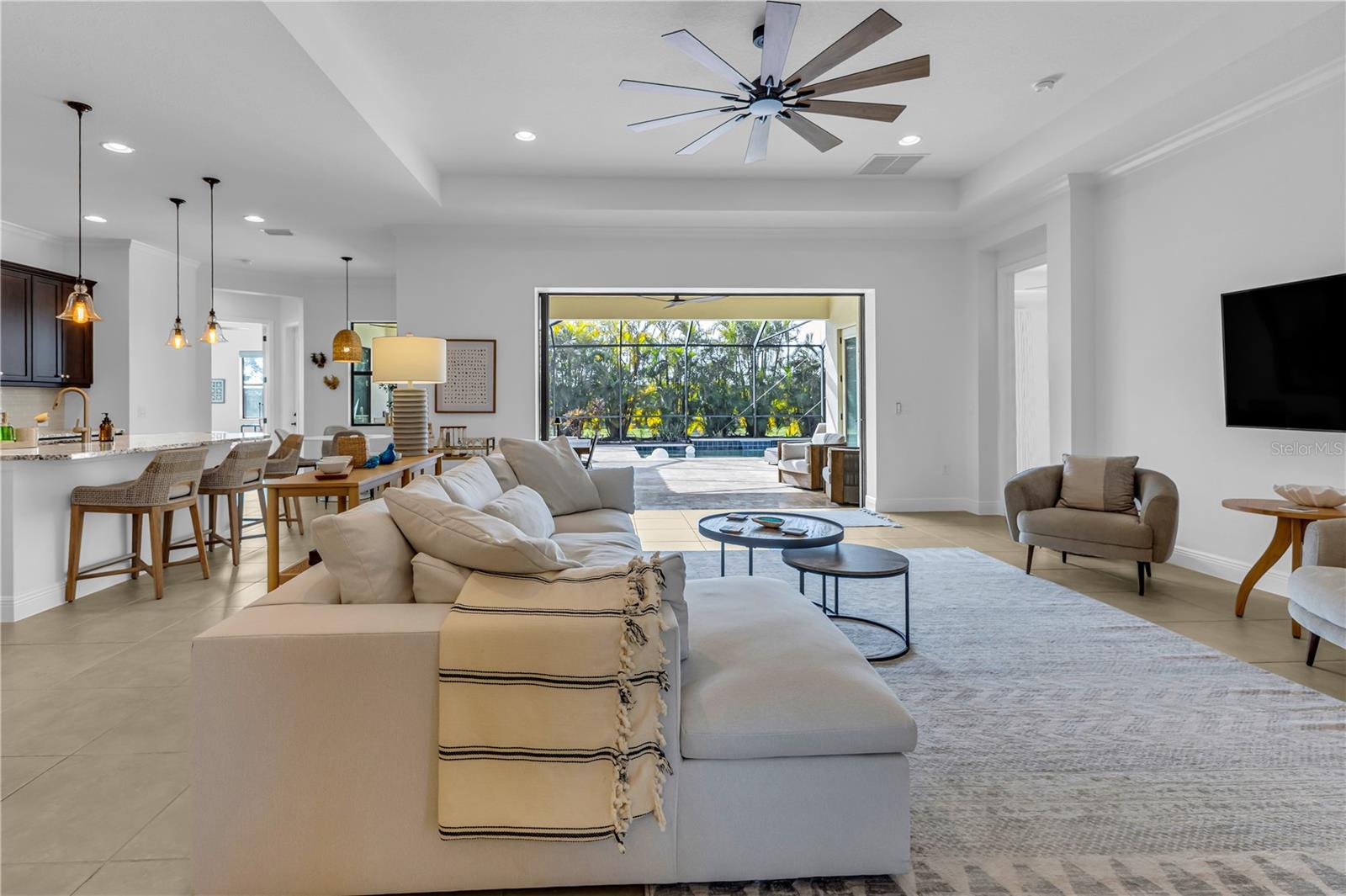 Welcome to Wildgrass, an exclusive gated community offering estate-size almost 1/2 acre lots, just minutes away from shopping, dining, and entertainment, and a short drive to the stunning Siesta Key Beach. This exquisite 4-bedroom, 3-bath pool home embodies the luxury and craftsmanship of a Neal Signature Homes. From the moment you drive up, you will be captivated by the beautifully manicured lawns and lush landscaping, with a stunning elevation, paver walkway and driveway that set the tone for the elegance within. Inside, architectural details abound, including arches, step ceilings, columns, crown molding, and more, providing an ambiance of sophistication throughout. The gourmet kitchen is a true masterpiece, featuring custom wood cabinets, granite countertops, decorative tile backsplash, stainless steel appliances with a gas cooktop, built-in convection oven and microwave oven, and a stainless steel cooktop hood. A large breakfast bar with pendant lighting offers ample seating, making it perfect for family gatherings or casual meals. The open and airy floor plan continues to impress with interior and exterior gathering spaces, and a spacious primary suite that offers direct access to the pool area, two large walk-in closets, and an elegant bath with dual sinks, granite countertops, custom cabinetry, a soaking tub, and a large walk-in shower with a frameless glass door. The additional bedrooms provide plenty of space for guests, while the versatile 4th bedroom, with engineered wood flooring and direct access to the outdoor living area, can serve as a home office. The 4th bedroom also has an adjacent bath, which functions as both a pool bath and a convenient guest bath. Step outside to the expansive outdoor living area, featuring a large pool with a PebbleTec finish, a soothing waterfall water feature, and a newer outdoor kitchen with a built-in grill, sink, refrigerator, and granite countertops. The travertine flooring, recently sealed, adds a touch of luxury, and lush landscaping ensures privacy for your enjoyment. The 3-car garage is impeccably designed with newly epoxied floors and offers plenty of space for both vehicles and storage. Notable upgrades include a dishwasher, outdoor kitchen, gutters and downspouts, garbage disposal, fresh interior and exterior paint, epoxied garage floors, sealed travertine, indoor and outdoor fans, pool heater control pad, a Wi-Fi-enabled Rainbird irrigation control panel, and a Lorex outdoor security camera system. This home truly offers the best of indoor and outdoor living in one of the most sought-after communities. Don’t miss the opportunity to make this stunning property your own!
