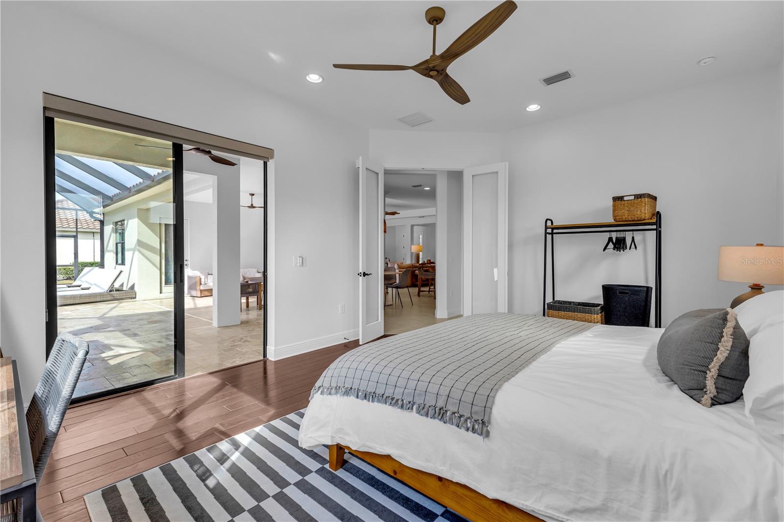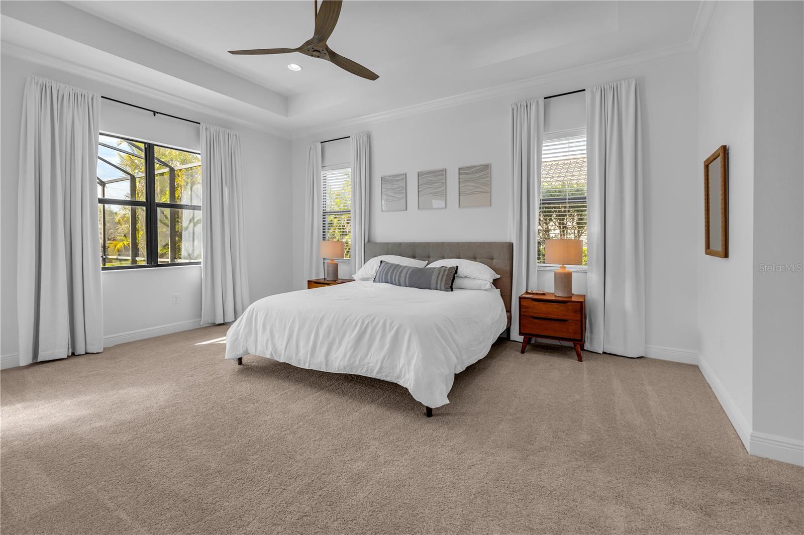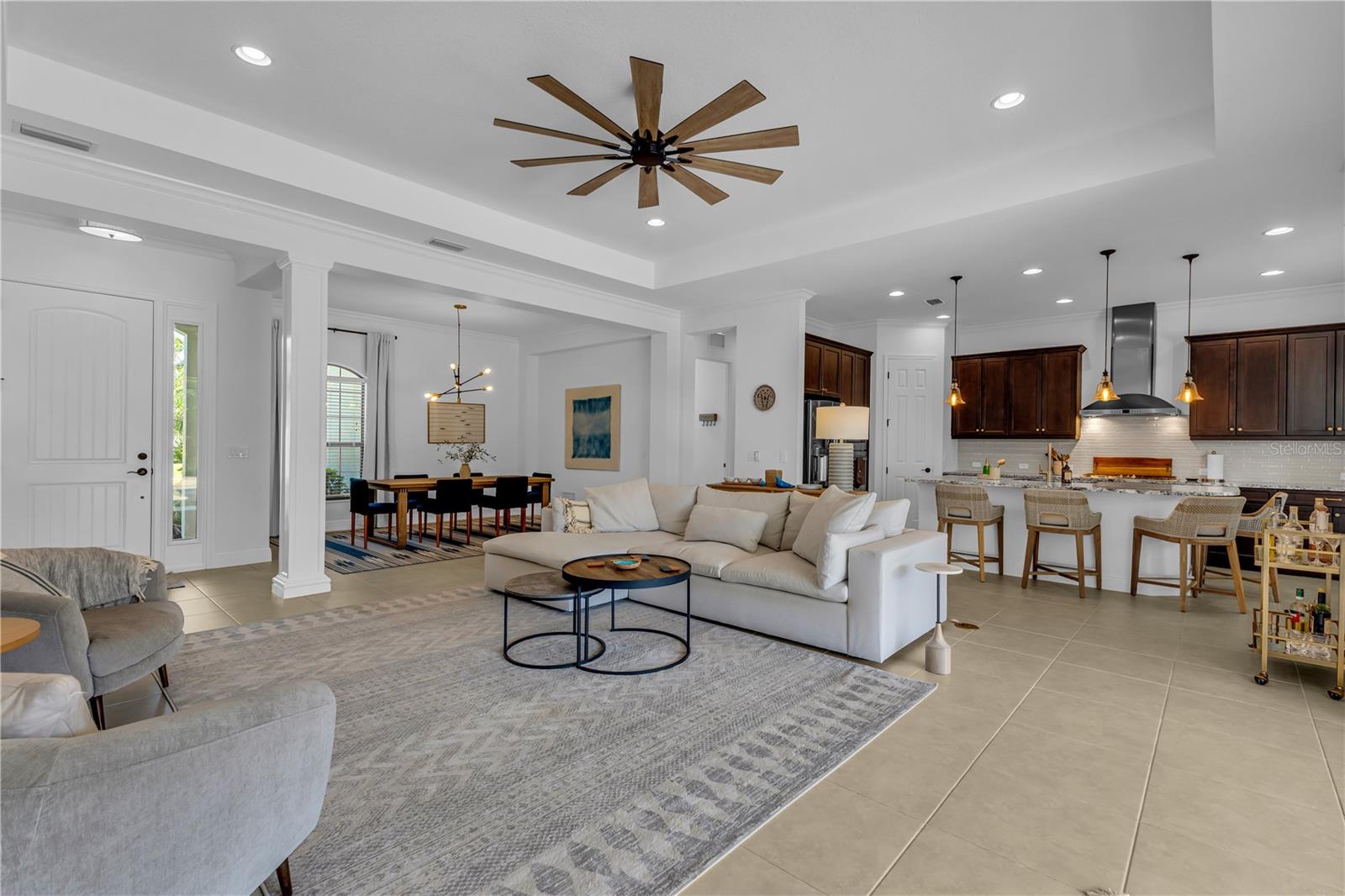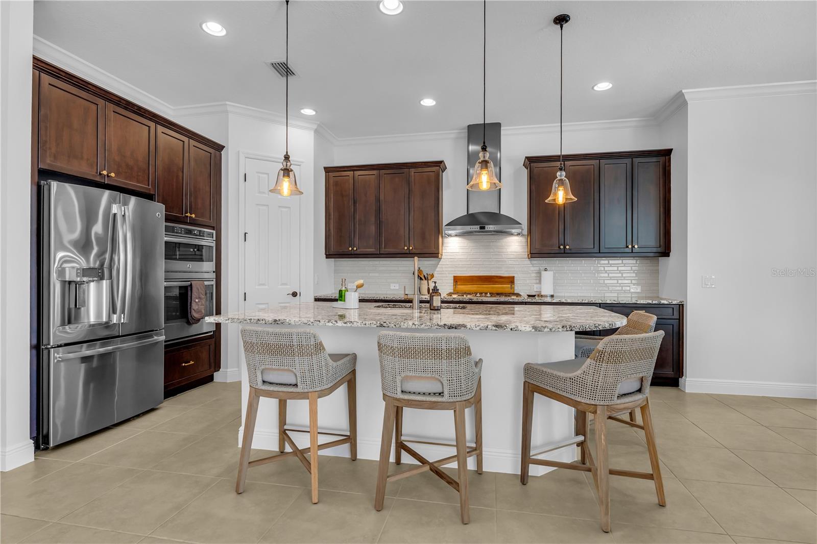 Welcome to Wildgrass, an exclusive gated community offering estate-size almost 1/2 acre lots, just minutes away from shopping, dining, and entertainment, and a short drive to the stunning Siesta Key Beach. This exquisite 4-bedroom, 3-bath pool home embodies the luxury and craftsmanship of a Neal Signature Homes. From the moment you drive up, you will be captivated by the beautifully manicured lawns and lush landscaping, with a stunning elevation, paver walkway and driveway that set the tone for the elegance within. Inside, architectural details abound, including arches, step ceilings, columns, crown molding, and more, providing an ambiance of sophistication throughout. The gourmet kitchen is a true masterpiece, featuring custom wood cabinets, granite countertops, decorative tile backsplash, stainless steel appliances with a gas cooktop, built-in convection oven and microwave oven, and a stainless steel cooktop hood. A large breakfast bar with pendant lighting offers ample seating, making it perfect for family gatherings or casual meals. The open and airy floor plan continues to impress with interior and exterior gathering spaces, and a spacious primary suite that offers direct access to the pool area, two large walk-in closets, and an elegant bath with dual sinks, granite countertops, custom cabinetry, a soaking tub, and a large walk-in shower with a frameless glass door. The additional bedrooms provide plenty of space for guests, while the versatile 4th bedroom, with engineered wood flooring and direct access to the outdoor living area, can serve as a home office. The 4th bedroom also has an adjacent bath, which functions as both a pool bath and a convenient guest bath. Step outside to the expansive outdoor living area, featuring a large pool with a PebbleTec finish, a soothing waterfall water feature, and a newer outdoor kitchen with a built-in grill, sink, refrigerator, and granite countertops. The travertine flooring, recently sealed, adds a touch of luxury, and lush landscaping ensures privacy for your enjoyment. The 3-car garage is impeccably designed with newly epoxied floors and offers plenty of space for both vehicles and storage. Notable upgrades include a dishwasher, outdoor kitchen, gutters and downspouts, garbage disposal, fresh interior and exterior paint, epoxied garage floors, sealed travertine, indoor and outdoor fans, pool heater control pad, a Wi-Fi-enabled Rainbird irrigation control panel, and a Lorex outdoor security camera system. This home truly offers the best of indoor and outdoor living in one of the most sought-after communities. Don’t miss the opportunity to make this stunning property your own!