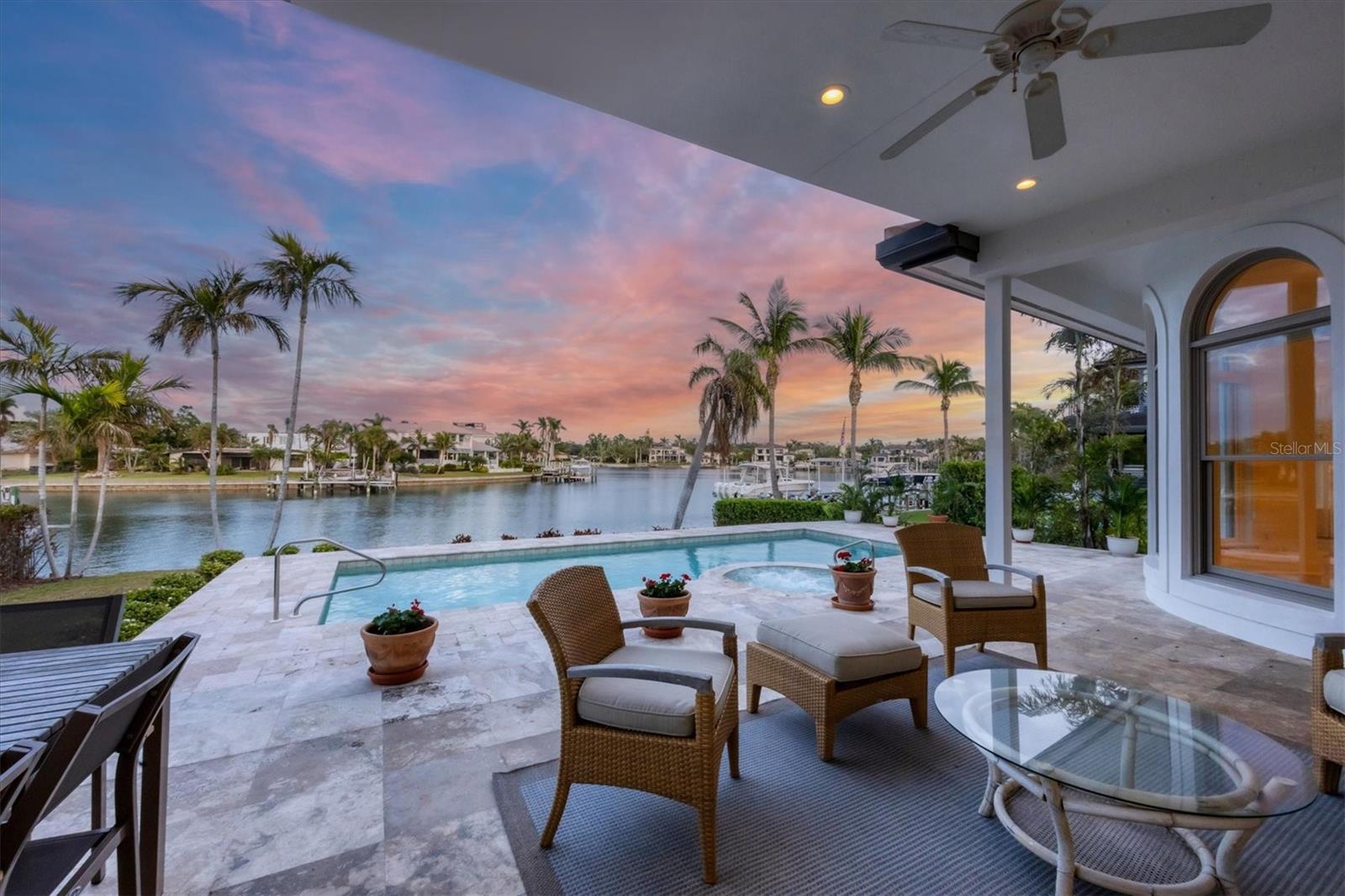 One or more photo(s) has been virtually staged. Step into a secluded, gated waterfront estate that epitomizes timeless elegance and offers unparalleled boating access, seamlessly blending sophistication with functionality. In exceptional San Remo Estates, this home boasts a prime location just moments from downtown Sarasota, Siesta Key and Southside Village. Designed by the esteemed Walter Hamm and built by Bill McGinness, the residence is engineered for longevity and stability, with construction resting on 54 concrete pilings. Positioned on a sprawling, private lot, the property offers breathtaking water views from every angle and features a deepwater harbor ideal for boating enthusiasts. The interior seamlessly flows with a bright, airy open floor plan that unites the living spaces and abundant natural light. Refined millwork, coffered ceilings, and a sophisticated blend of rich wood flooring and polished travertine set the tone for timeless luxury. The gourmet kitchen shines with an oversized island with quartz countertops, premium wood cabinetry, granite perimeter countertops and a subway tile backsplash. Top-tier stainless steel appliances and a cozy breakfast nook further enhance the space, while the adjoining family room creates an inviting atmosphere for everyday living. The formal dining room offers the ideal setting for hosting gatherings, while a private office provides an impressive workspace. The owner’s suite on the main level is a sanctuary, featuring oversized windows with serene water views, two custom walk-in closets and a spa-like bath. Luxurious finishes include a floating vanity with illuminated mirrors, a freestanding soaking tub and an oversized walk-in shower. The second level is thoughtfully designed for comfort and entertainment, offering three generously sized bedroom suites, a TV/game room with a convenient kitchenette, and a balcony overlooking the pool and tranquil waterscape. Outdoor living is equally captivating, with an expansive travertine pool deck, a heated pool and spa installed in 2017, and lush, mature landscaping within a fenced and spacious yard, ensuring privacy and serenity. Anderson sliding doors and windows further amplify the home’s upgrades and ambiance. A comprehensive renovation in 2015 elevated the home’s sophistication, while modern updates, including a new roof in 2020, two updated air conditioning systems in 2023 and 202), and an ADT security system, provide peace of mind. Practical amenities such as abundant closet space, generous laundry facilities and provisions for an elevator further enhance the home’s functionality. An oversized three-car garage ensures ample storage. Sought-after San Remo Estates is at the core of Sarasota, just before the north bridge to Siesta Key, and minutes to downtown Sarasota and Southside Village. This exceptional estate invites you to experience the pinnacle of coastal luxury living, where timeless elegance, modern convenience and breathtaking natural beauty converge in harmony.