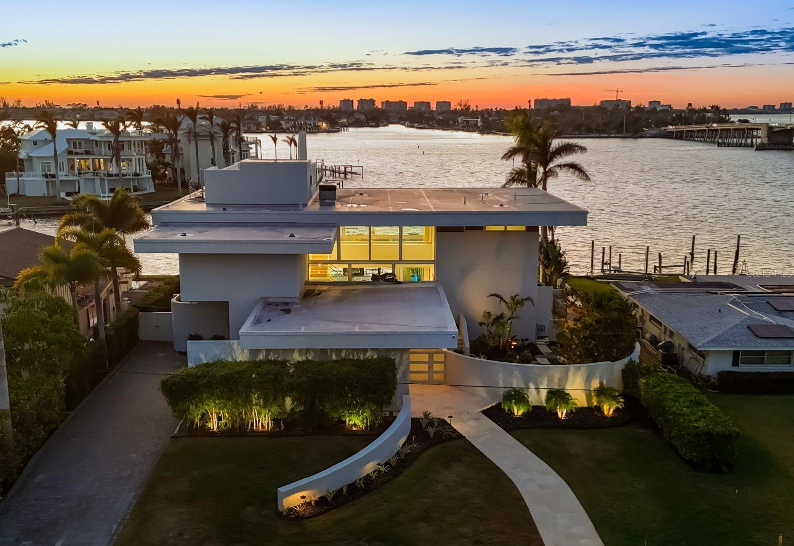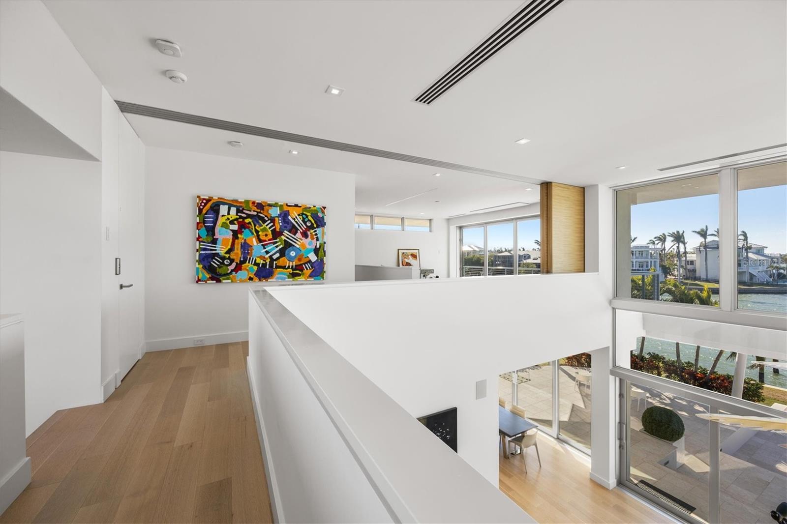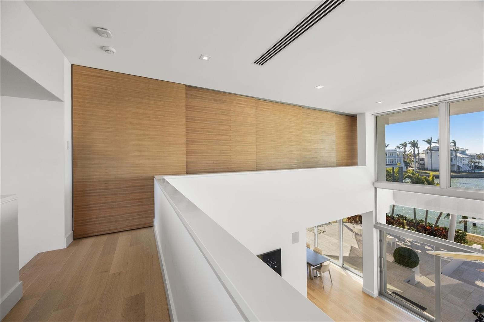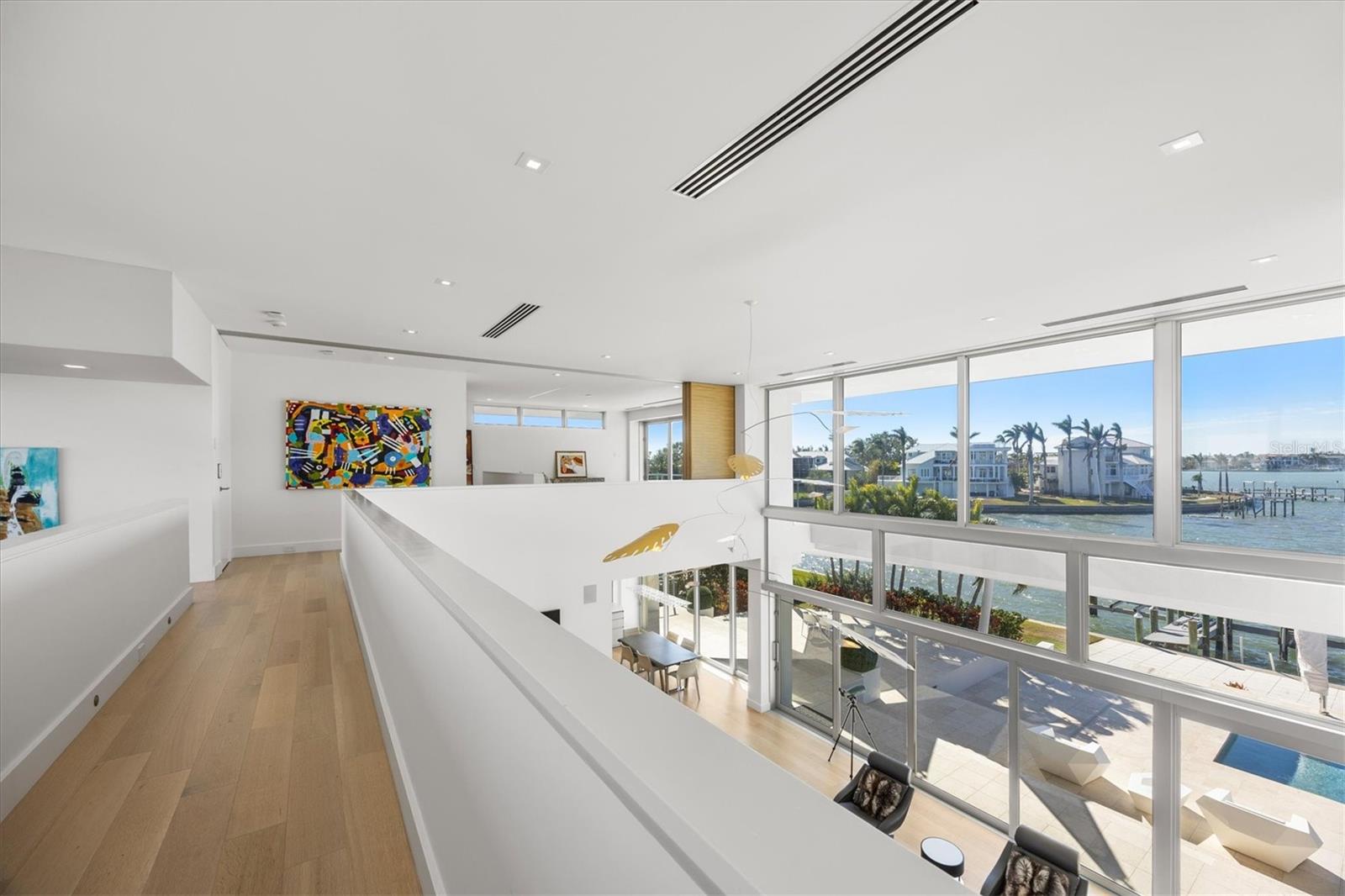Step into an architectural masterpiece that redefines modern luxury and exudes sophistication. This iconic residence, designed by renowned architect Carl Abbott, begins with undeniable curb appeal with an expansive travertine walkway and a serene Zen garden. The glass double doors open to the great room, a vision of light and space framed by a wall of windows and pocketing sliders that reveal unobstructed water views. The engineered white oak floors and marble fireplace create a seamless blend of warmth and style, while a custom designer chandelier, crafted by a renowned German artist using paper mâché, adds a touch of artistry. The extraordinary Valcucine® kitchen redefines the culinary experience with its sleek innovation and attention to detail. Custom glass front cabinetry features folding walls that seamlessly transform the workspace into a clean, modern masterpiece. Granite countertops frame the perimeter, while a sliding countertop section discreetly conceals the Miele® induction cooktop or sink, adding style and functionality. The oversized island boasts a granite countertop with a wood edge for dining. The top-tier appliance package includes a Sub-Zero refrigerator, wine cooler and beverage cooling drawers, as well as a Miele® dishwasher, convection microwave, dual wall ovens and an espresso machine. Every element has been meticulously designed, such as hidden outlets, custom spice racks and a walk-in pantry with expert organization, making this kitchen as stunning as it is practical. The primary suite is on the second level, accessed by a modern staircase with glass rails or the elevator. This loft-style retreat features engineered white oak floors, a spacious seating area, and sliders that open to a private upper terrace. A sliding wood wall provides privacy yet preserves natural light. The en-suite bath offers tile from floor to ceiling, a freestanding soaking tub, an oversized Roman shower, and a lighted, floating vanity with quartz countertops. Two expansive, custom-organized walk-in closets offer unparalleled wardrobe storage. Additional accommodations include three beautifully appointed guest rooms, each with its unique design. One is used as a media room and provides access to a private terrace. The guest baths feature walk-in showers and custom vanities. A dedicated fitness studio provides a space for wellness. Outdoor living is equally impressive, with a travertine pool deck, covered and uncovered seating areas, a boat dock with a lift, and a heated pool and spa. Sunshades, an outdoor shower and a spacious yard enhance the outdoor experience. The rooftop deck, accessible by elevator, offers the ultimate entertaining space with panoramic views, complete with a wet bar. This home is equipped with a three-stop hydraulic elevator, smart-home integration, triple-pane hurricane-rated windows and doors, a whole-house generator and water filtration system, central vacuum, architectural linear HVAC air grilles and outlets integrated into the flooring. The home was originally completed in 2002 but completely rebuilt from the bearing walls and concrete pad in 2016 including all electrical, plumbing, HVAC, roof, rooftop deck, triple-pane hurricane glass, appliances and fixtures, smart-house, flooring, pool and spa equipment and finishes. Every element is designed to offer the pinnacle of modern living, an iconic statement of luxury, innovation and timeless design.