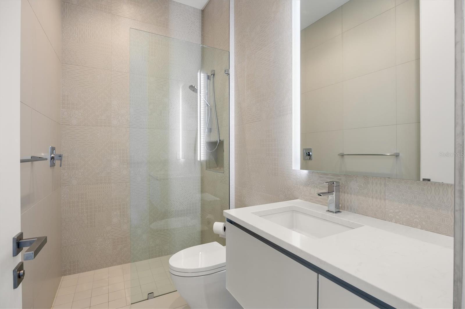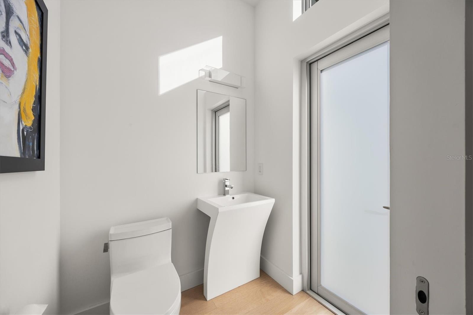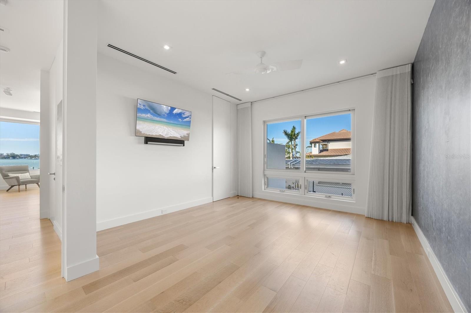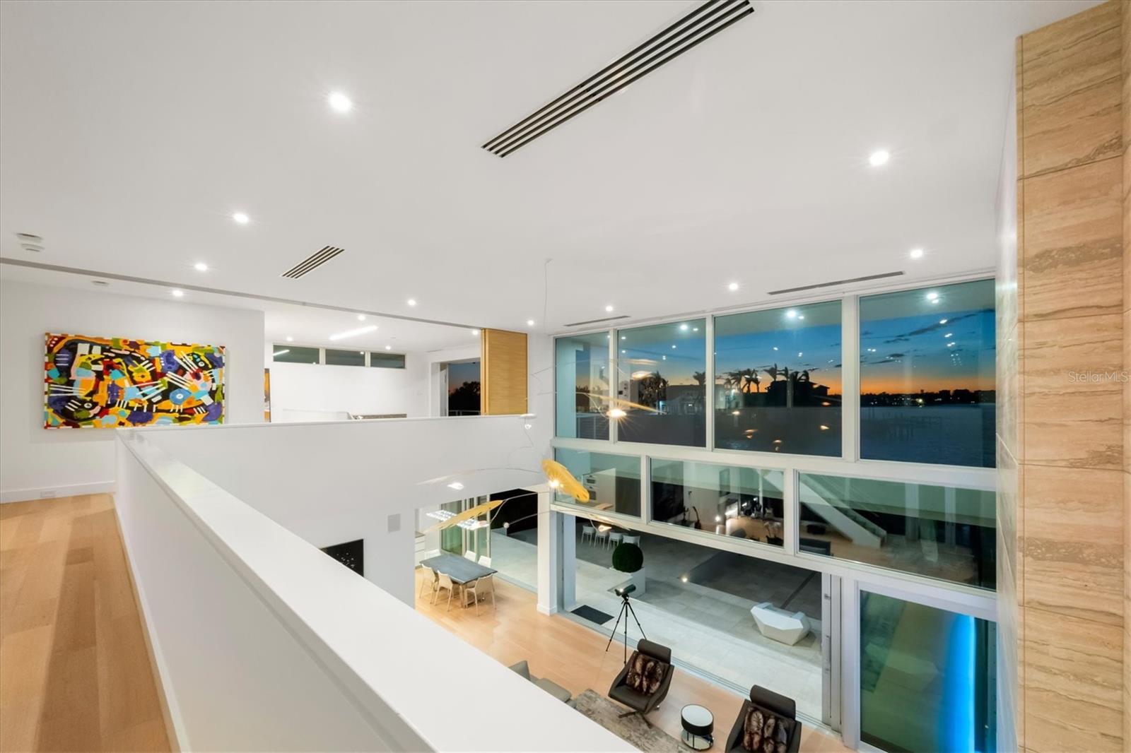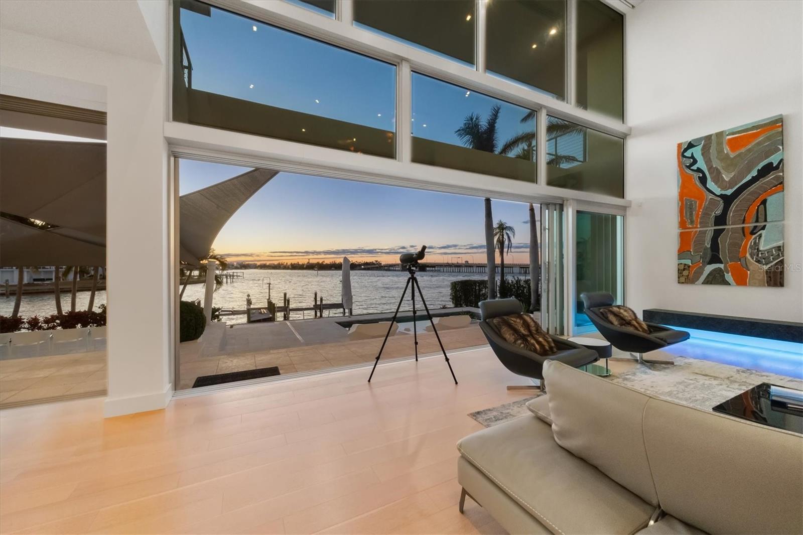 Step into an architectural masterpiece that redefines modern luxury and exudes sophistication. This iconic residence, designed by renowned architect Carl Abbott, begins with undeniable curb appeal with an expansive travertine walkway and a serene Zen garden. The glass double doors open to the great room, a vision of light and space framed by a wall of windows and pocketing sliders that reveal unobstructed water views. The engineered white oak floors and marble fireplace create a seamless blend of warmth and style, while a custom designer chandelier, crafted by a renowned German artist using paper mâché, adds a touch of artistry. The extraordinary Valcucine® kitchen redefines the culinary experience with its sleek innovation and attention to detail. Custom glass front cabinetry features folding walls that seamlessly transform the workspace into a clean, modern masterpiece. Granite countertops frame the perimeter, while a sliding countertop section discreetly conceals the Miele® induction cooktop or sink, adding style and functionality. The oversized island boasts a granite countertop with a wood edge for dining. The top-tier appliance package includes a Sub-Zero refrigerator, wine cooler and beverage cooling drawers, as well as a Miele® dishwasher, convection microwave, dual wall ovens and an espresso machine. Every element has been meticulously designed, such as hidden outlets, custom spice racks and a walk-in pantry with expert organization, making this kitchen as stunning as it is practical. The primary suite is on the second level, accessed by a modern staircase with glass rails or the elevator. This loft-style retreat features engineered white oak floors, a spacious seating area, and sliders that open to a private upper terrace. A sliding wood wall provides privacy yet preserves natural light. The en-suite bath offers tile from floor to ceiling, a freestanding soaking tub, an oversized Roman shower, and a lighted, floating vanity with quartz countertops. Two expansive, custom-organized walk-in closets offer unparalleled wardrobe storage. Additional accommodations include three beautifully appointed guest rooms, each with its unique design. One is used as a media room and provides access to a private terrace. The guest baths feature walk-in showers and custom vanities. A dedicated fitness studio provides a space for wellness. Outdoor living is equally impressive, with a travertine pool deck, covered and uncovered seating areas, a boat dock with a lift, and a heated pool and spa. Sunshades, an outdoor shower and a spacious yard enhance the outdoor experience. The rooftop deck, accessible by elevator, offers the ultimate entertaining space with panoramic views, complete with a wet bar. This home is equipped with a three-stop hydraulic elevator, smart-home integration, triple-pane hurricane-rated windows and doors, a whole-house generator and water filtration system, central vacuum, architectural linear HVAC air grilles and outlets integrated into the flooring. The home was originally completed in 2002 but completely rebuilt from the bearing walls and concrete pad in 2016 including all electrical, plumbing, HVAC, roof, rooftop deck, triple-pane hurricane glass, appliances and fixtures, smart-house, flooring, pool and spa equipment and finishes. Every element is designed to offer the pinnacle of modern living, an iconic statement of luxury, innovation and timeless design.