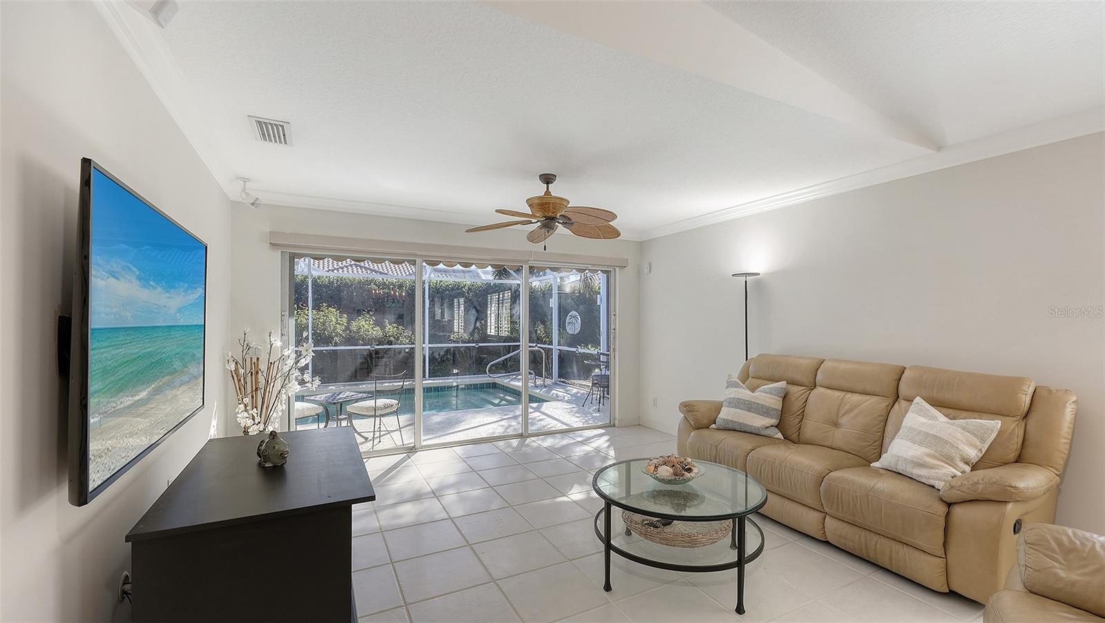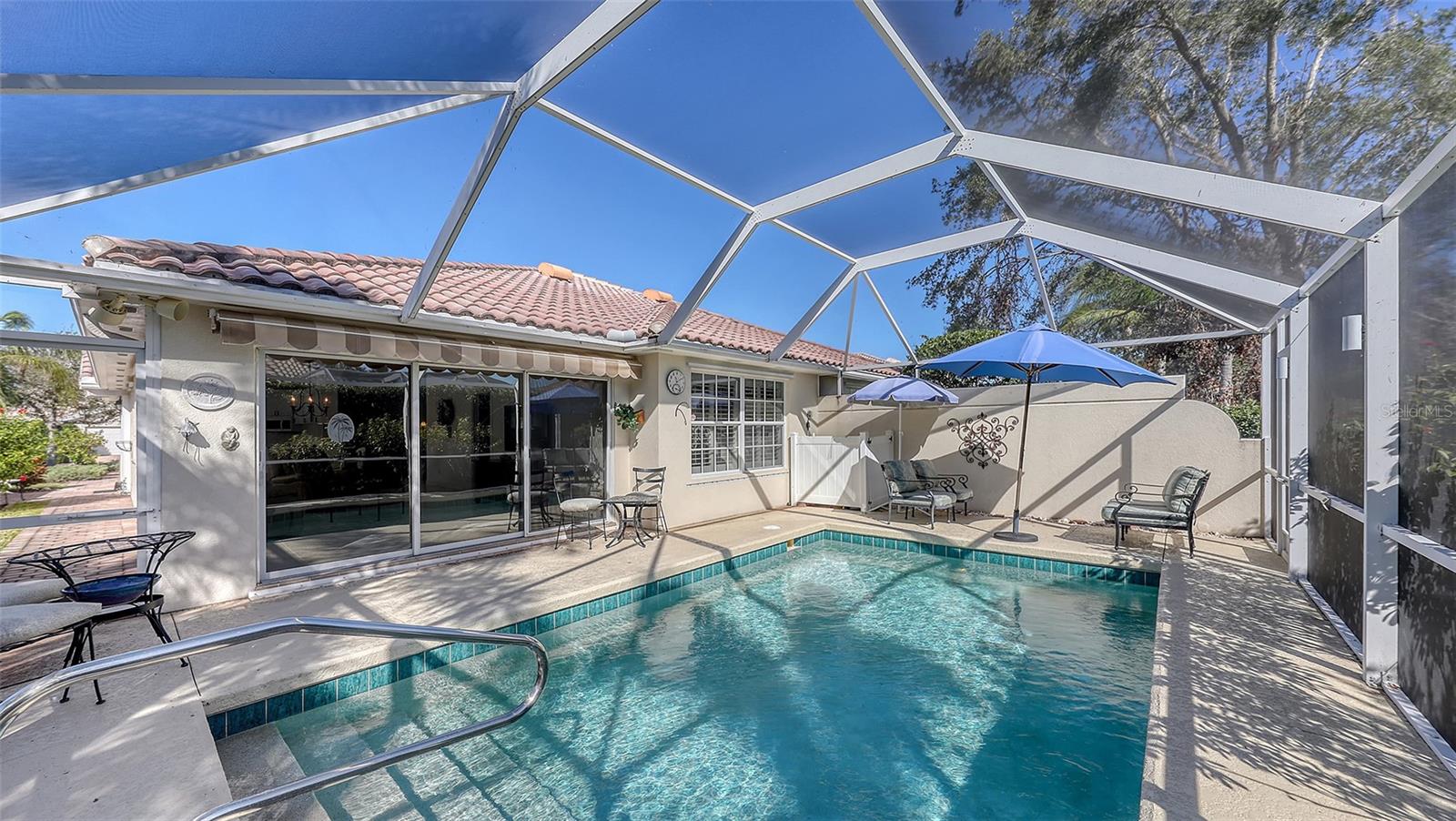 HUGE PRICE REDUCTION- BEAUTIFULLY UPDATED WITH A PRIVATE POOL, AND FULLY FURNISHED!!! Envision your life in a paradise where your own private pool awaits you every day. This Capri III villa in Villagewalk is fully furnished, including brand new primary bedroom furniture, all set for you to start your Florida adventure. Right from the entrance, the great room stands out with its crown molding and a unique hardwood floor, while the rest of the home offers the practicality and cleanliness of tile throughout—no carpet to worry about. But, it's the allure of your private pool that truly defines this villa, complete with a rescreened lanai, retractable awning, and custom lighting for those perfect evenings. The kitchen is where you'll refine your culinary skills, featuring Corian countertops, a subway tile backsplash, and modern touches like pull-out drawers, glass-front cabinets, and a wine fridge. Your primary suite is a haven of tranquility with crown molding, plantation shutters, and a spacious custom walk-in closet. The perfectly updated bathroom features granite counters and updated shower doors to elevate your daily routine. Your guests will enjoy their own updated and well-appointed bedroom with their very own custom walk-in-closet, as well as their own tastefully updated bathroom. For storm protection, the home includes clear hurricane shutters for the main living area as well as the glass front door. Villagewalk isn't just about your home; it's about embracing a lifestyle where every amenity is at your fingertips. Dive into the community with • A large clubhouse, complete with a fitness center, meeting rooms, and event space for social gatherings. • Two geothermal-heated pools - one for laps and a resort-style lagoon for relaxation. • Six Har-Tru tennis courts, pickleball, and bocce ball courts for the sports enthusiasts. • An on-site restaurant and bar for convenient dining. • A vibrant Town Center that includes a hair salon, boutique shopping, and even a gas station for everyday needs. • A brand-new Tiki Bar for poolside enjoyment. • Miles of walking and biking trails to explore the natural beauty of the area. • A staffed gate, providing 24-hour security for peace of mind. • An HOA management office on-site to handle community affairs effortlessly. • The community benefits from underground power lines, significantly reducing power outage risks, with the Sarasota Fire Department nearby for swift emergency response. Villagewalk is minutes from Publix, Costco, the Legacy Bike Trail, and the world-famous white sands of Siesta Key Beach, with downtown Sarasota's cultural attractions just 20 minutes away. Despite its coastal allure, this villa provides a sanctuary of safety and resilience, making it an ideal retreat for those seeking both peace of mind and the joys of Florida living. This villa offers you not just a home but a gateway to a life filled with convenience, activity, and relaxation. Contact us to see how this can be your new beginning in Sarasota, where every day feels like a vacation.