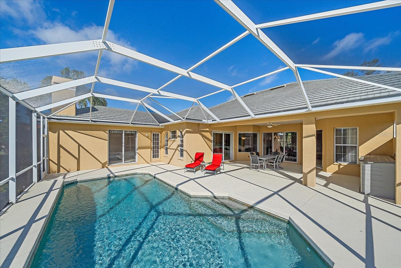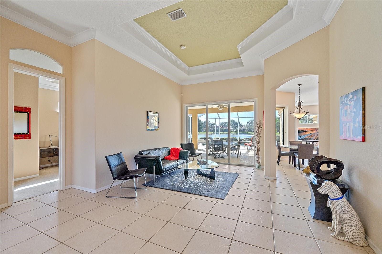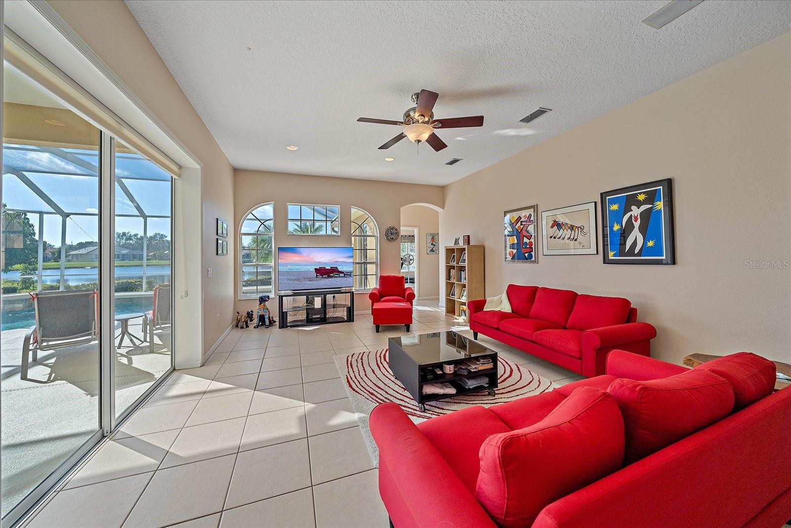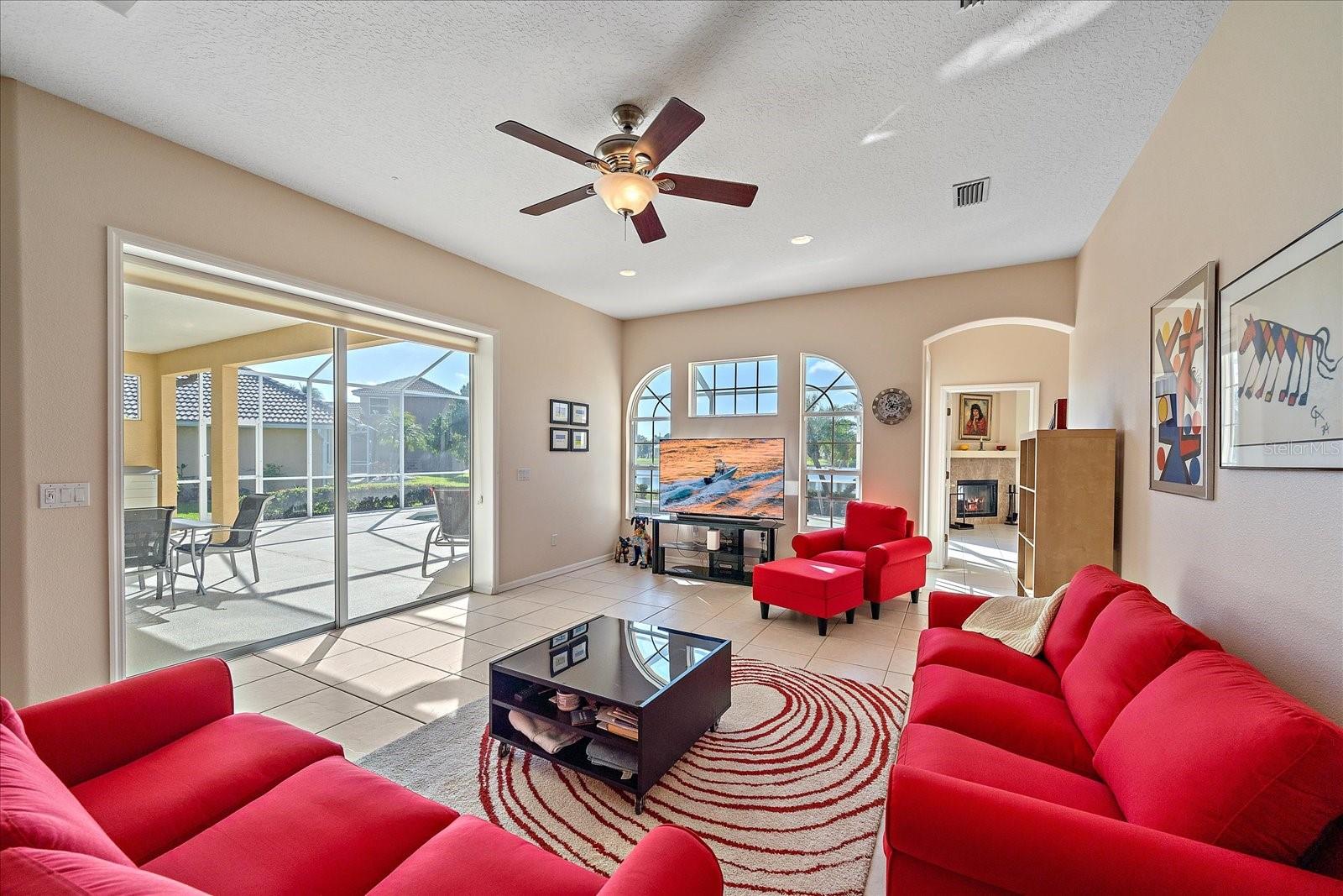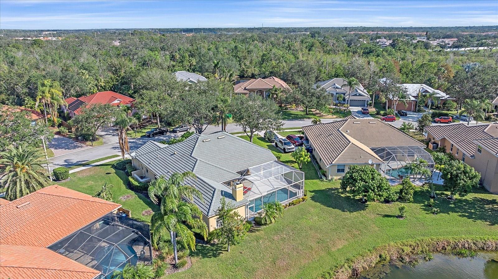 SPECTACULAR pool home with BREATHTAKING large lake view! Three bedrooms with a den and a large bonus room with fireplace! Tastefully decorated and impeccably maintained with pride of ownership. As you enter this well-loved home through the double etched glass doors, you will be welcomed by architectural details such as single and double tray ceilings to 13 feet, wall niches, 8’ doors, built-ins, arches, plant shelves and crown molding. Over-sized windows and transom windows allow an abundance of natural light into the home. The kitchen boasts 42" wood cabinets, granite countertops and stainless steel appliances. The rooms throughout the home are spacious. The den, located in the front of the home, makes a great office. The large bonus room, located in the back of the home, has a fireplace and a great view of the lake. The master en-suite features crown molding, tray ceiling and a Closet Tec closet. The Southern exposure, outdoor living is "Florida living at its best" with a large lake view, over-sized lanai and swimming pool. Built on one of the most desirable lots in Three Oaks, it's a must see home in a popular neighborhood. Centrally located in a most desirable A+ school district. Short distance to beaches, malls, everything! You will love this home.