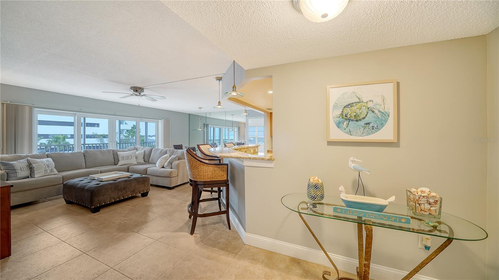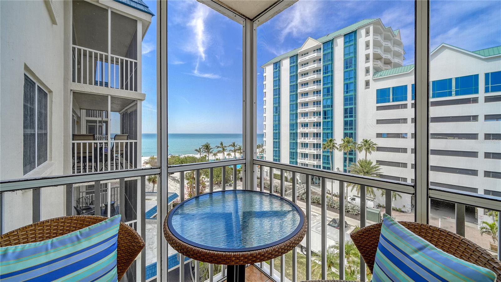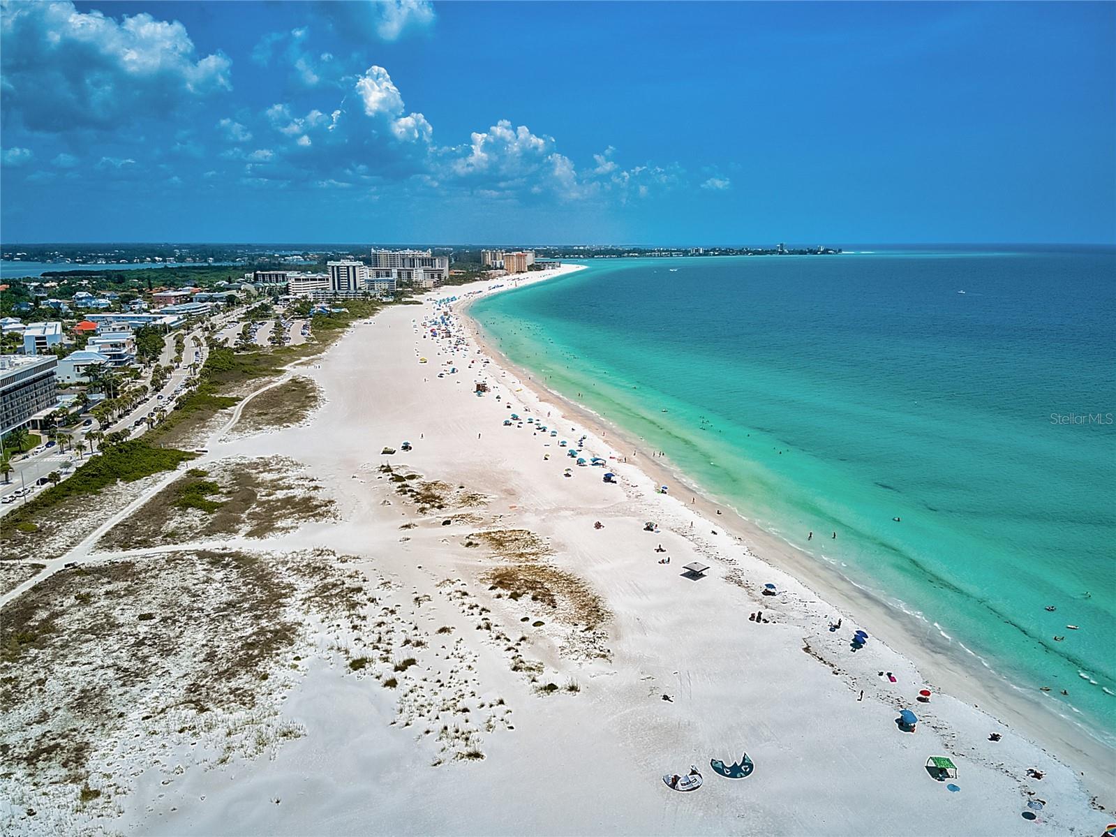 Move-in ready and furnished, this beachfront corner residence on Lido Key is a coastal treat offering an unparalleled location (one of the closest beachfront condos to the world-renowned St. Armands Circle!) and inviting charm. Perfectly situated within walking or biking distance to Sarasota’s vibrant attractions, you’ll enjoy proximity to Lido Beach Resort, the upscale shops and dining at St. Armands Circle, and the scenic beauty of Longboat Key to the north. Travel south to experience the cultural vibrancy of downtown Sarasota, the Bayfront, and wonderful arts and entertainment venues. Thoughtful updates enhance the two-bedroom, open-concept layout, creating a bright and inviting atmosphere. Oversized tile flooring and newer impact windows and sliders ensure durability while complementing the sunny ambiance. The granite kitchen seamlessly connects to the living and dining areas, making it perfect for entertaining. Just off the great room, a screened balcony offers beautiful sunny views of Lido Beach, breathtaking Gulf sunsets, and downtown vistas, providing a tranquil outdoor retreat. The split-bedroom plan maximizes privacy, with two spacious bedroom suites featuring wood flooring. The primary suite includes a walk-in closet with custom built-ins, adding convenience to the retreat-like atmosphere. Additional features include a private storage unit, covered parking, and space to add a washer and dryer for added functionality. This charming community, comprising just 75 residences, is a well-maintained haven located directly on the pristine shores of Lido Beach. Residents enjoy an array of amenities, including a game room, catering kitchen, fitness center, shuffleboard, and a Gulf-front deck with a heated swimming pool. With its prime location, lovely updates, and access to both recreational and cultural activities, this beachfront gem is the ideal setting for enjoying the best of Lido Key living.
