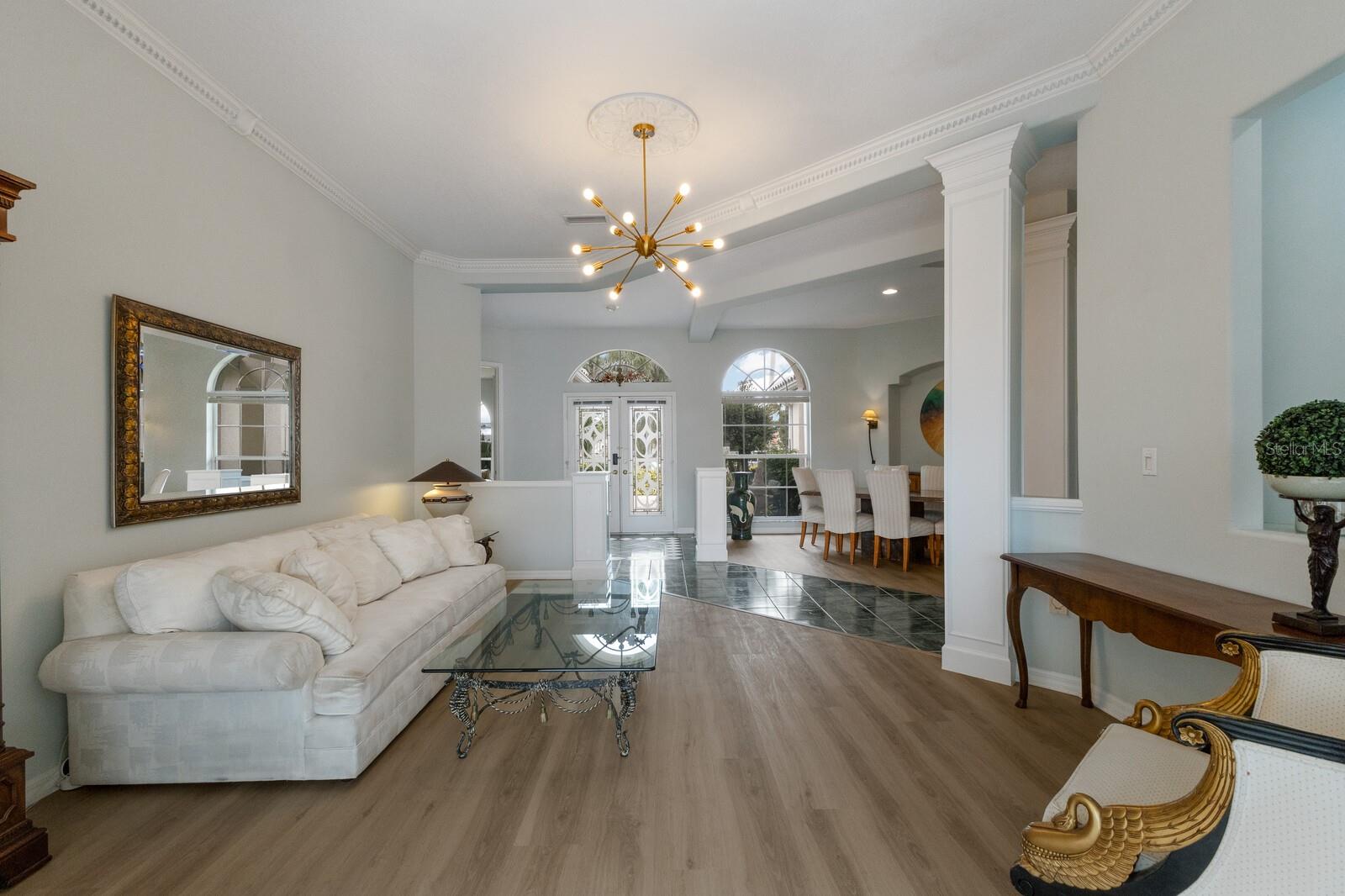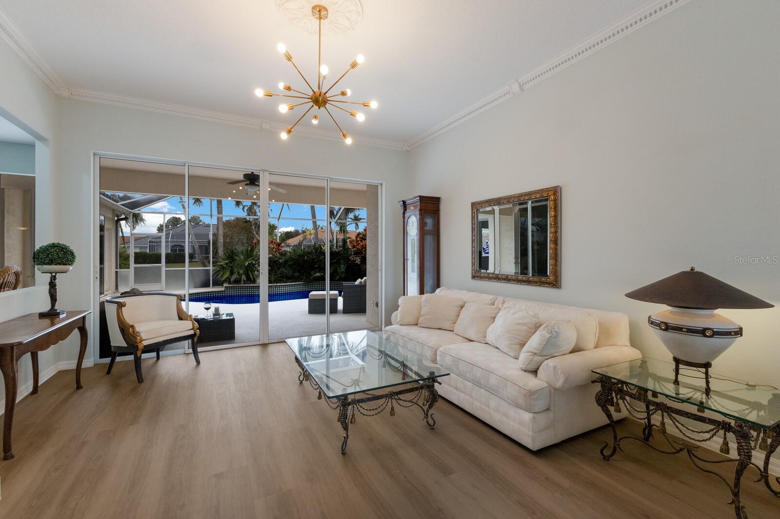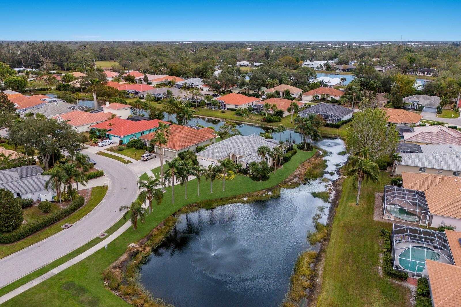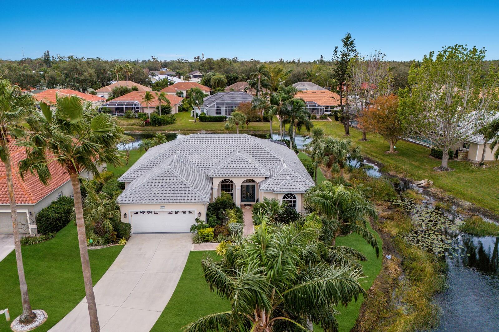 Welcome to your dream home in the sought-after McIntosh Lake community! This beautifully crafted Lee Wetherington-built pool home offers 3 bedrooms, a den, 2.5 bathrooms, and a spacious 2-car garage, all spread across 2,678 sq. ft. of luxurious living space. Situated on a serene lakefront lot with water views on two sides, this property combines elegance, functionality, and an unbeatable location. Step inside and be greeted by soaring ceilings, crown molding, and custom architectural details that exude timeless charm. The thoughtfully designed split-bedroom floor plan ensures privacy while providing ample space to entertain. The heart of the home, the chef's kitchen, boasts a center island, breakfast bar, and a cozy breakfast nook with breathtaking views of the pool and lake. Adjacent, the inviting family room features vaulted ceilings and pocket sliders that seamlessly connect indoor and outdoor living spaces. The primary suite is a true retreat, complete with a tray ceiling, large windows, and private access to the lanai. The en-suite bathroom offers dual sinks, a soaking tub, and a walk-in shower. Two additional bedrooms share a well-appointed bathroom, while the half bath conveniently doubles as a pool bath. Outside, the oversized screened lanai and lagoon-style pool create a private oasis, surrounded by lush tropical landscaping. The expansive lot features a long driveway for extra parking and plenty of space for outdoor gatherings. Located in an A-rated school district and close to the Legacy Trail, Siesta Key Beach, downtown Sarasota, and premier shopping and dining, this home offers the perfect balance of luxury and convenience. With low HOA fees and no CDD fees, you’ll enjoy significant savings compared to neighboring communities. Don’t miss the opportunity to own this exceptional property in McIntosh Lake. Schedule your private showing today!