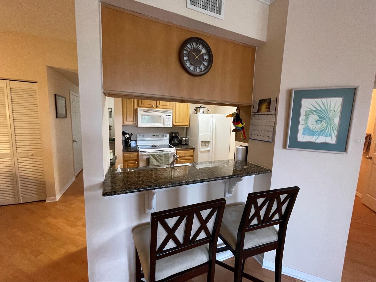 This is the one. Conveniently located two bedroom two bath unit in desirable Las Palmas community with private preserve views. Nice open kitchen with wood cabinets and granite countertops with a breakfast bar and a closet pantry. This second floor unit has laminated flooring in the living area and carpet in the bedrooms. Open plan with sliding glass doors to the screened lanai. Split bedroom floor plan gives extra privacy. Primary bedroom has ensuite bathroom with a linen closet and a large walk in closet. Inside utility room with washer and dryer. This building has a new barrel tile roof. This unit is located directly across from the clubhouse and one of the swimming pools. Las Palmas is a pet friendly community that has a variety of amenities for all lifestyles, including two swimming pools, 2 fitness centers, 2 outdoor kitchens/barbeque areas, a tennis court, pickle ball, playground, dog park and more. Boat/RV storage is also available on the property. Perfectly located just minutes from University Town Center with world class shopping and dining options, Nathan Benderson Park, and the new Mote Marine Aquarium that will be opening later this year. Unit can be sold furnished if the buyer so desires.