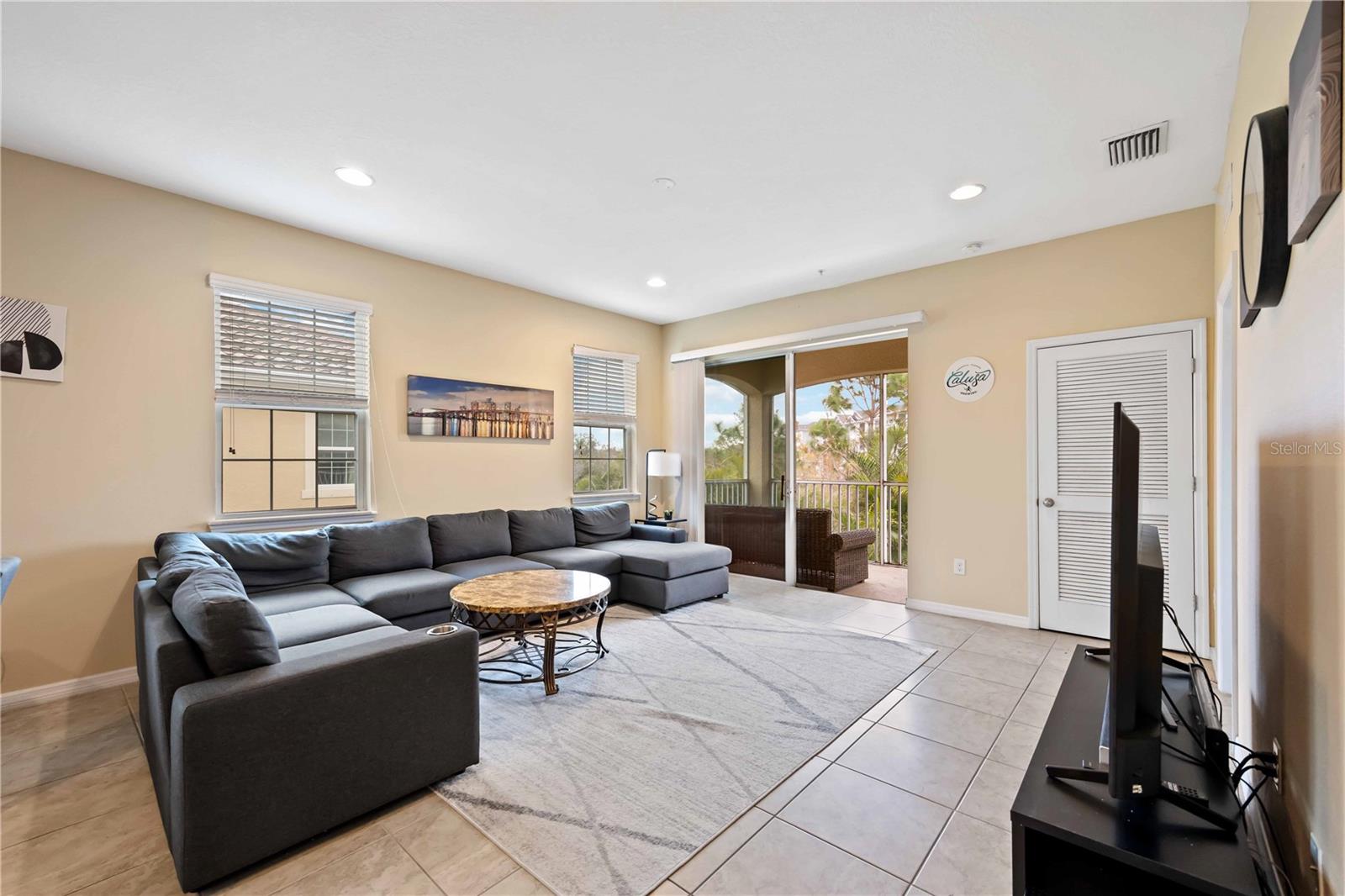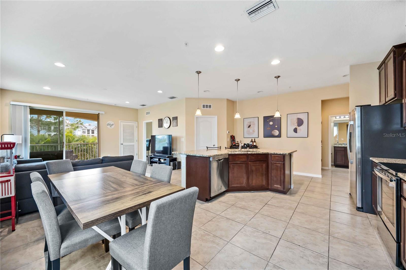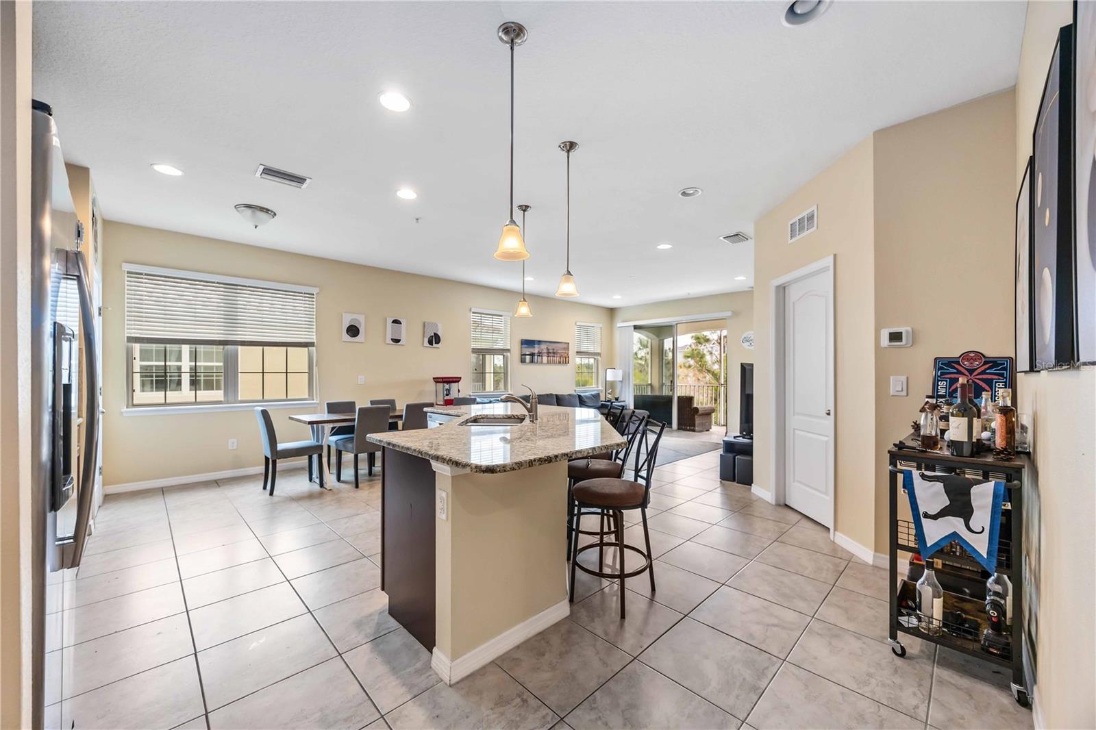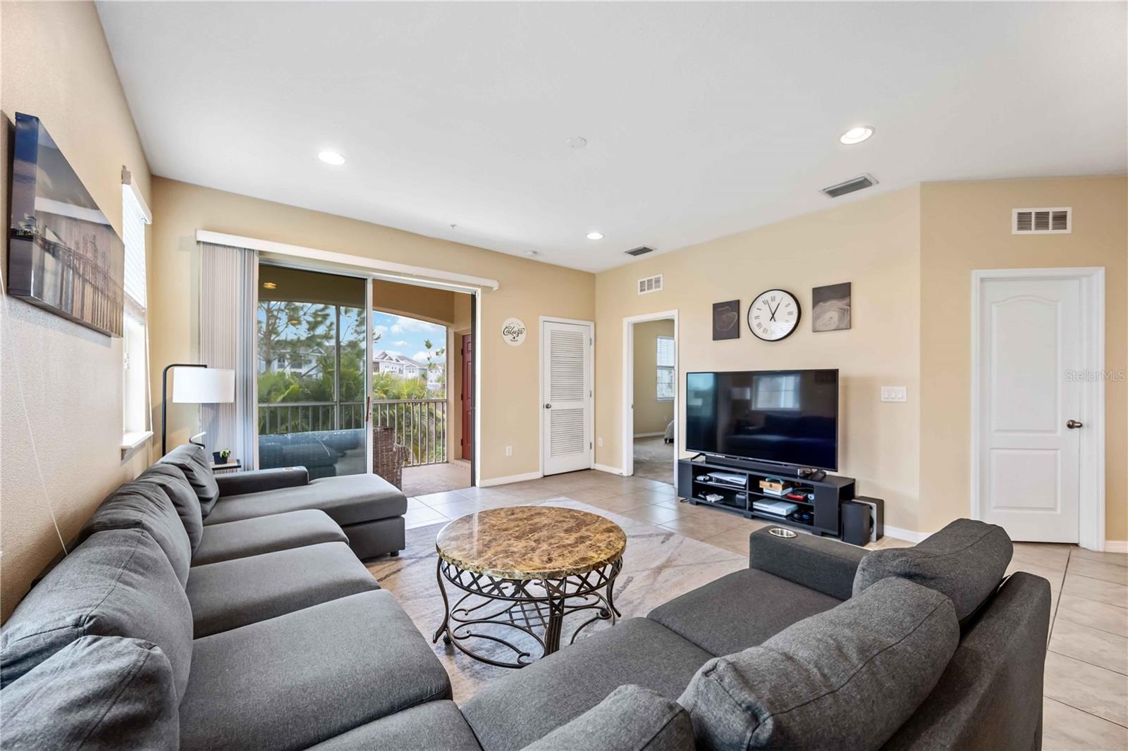 Nestled in the highly sought-after Soleil community, this beautifully designed 3 bedroom, 2 bathroom condo offers a perfect blend of style, comfort, and convenience. Upon entering, you are welcomed by a spacious chef’s kitchen featuring elegant wooden cabinetry, sleek stainless steel appliances, and a generous island that flows effortlessly into the open-concept living and dining areas—perfect for hosting guests or enjoying relaxed everyday living. Tile flooring stretches throughout the home, enhancing its modern aesthetic while providing easy maintenance. The primary suite is thoughtfully positioned for privacy, complete with a luxurious en-suite bathroom where you can unwind in the walk-in shower. A grand walk-in closet offers ample storage, making organization a breeze. Two additional bedrooms and a shared bathroom provide plenty of space for guests, a cozy retreat for visitors, or a peaceful setting for a home office or creative studio. In the center, you will find a bonus den for extended living space and room for guests. At the back of the home, a beautiful screened-in balcony offers the ideal spot to unwind with a glass of wine, where you can relax and take in the serene views of lush greenery and swaying palm trees that enhance the tranquility of the community. An attached one-car garage adds convenience with easy access and extra storage space. Centrally located, close to top-rated schools, popular shopping destinations, and a variety of dining options, this home offers the perfect balance of comfort and accessibility. Located in the vibrant, gated Soleil community, residents enjoy resort-style amenities, including a clubhouse, sparkling pool, state-of-the-art fitness center, dog park, grilling stations, bocce ball courts, and more—all with the advantage of NO CDD fees. Currently rented until April 2025, this property presents an outstanding investment opportunity or the ideal forever home! Don’t miss your chance to experience this exceptional lifestyle, call today to learn more before it’s gone!