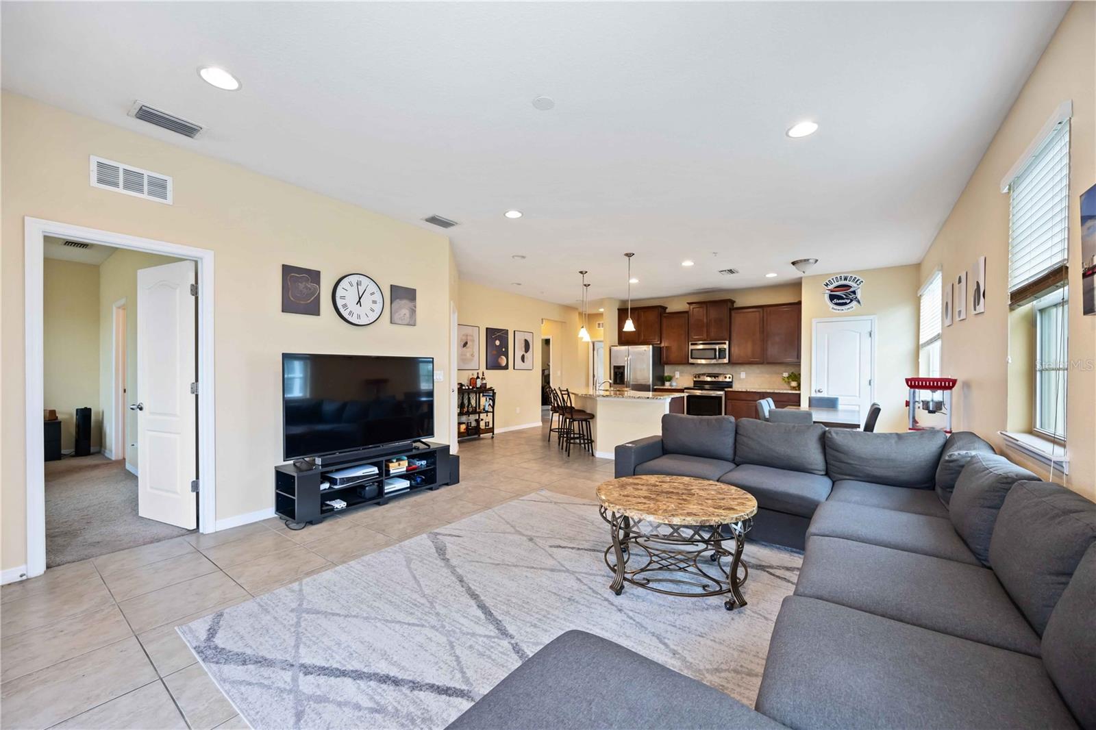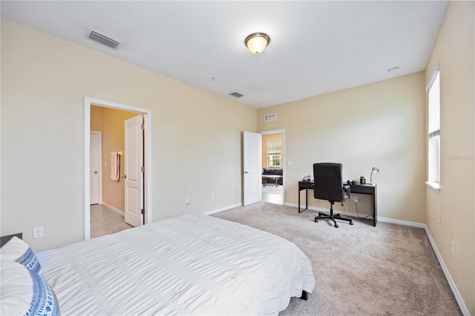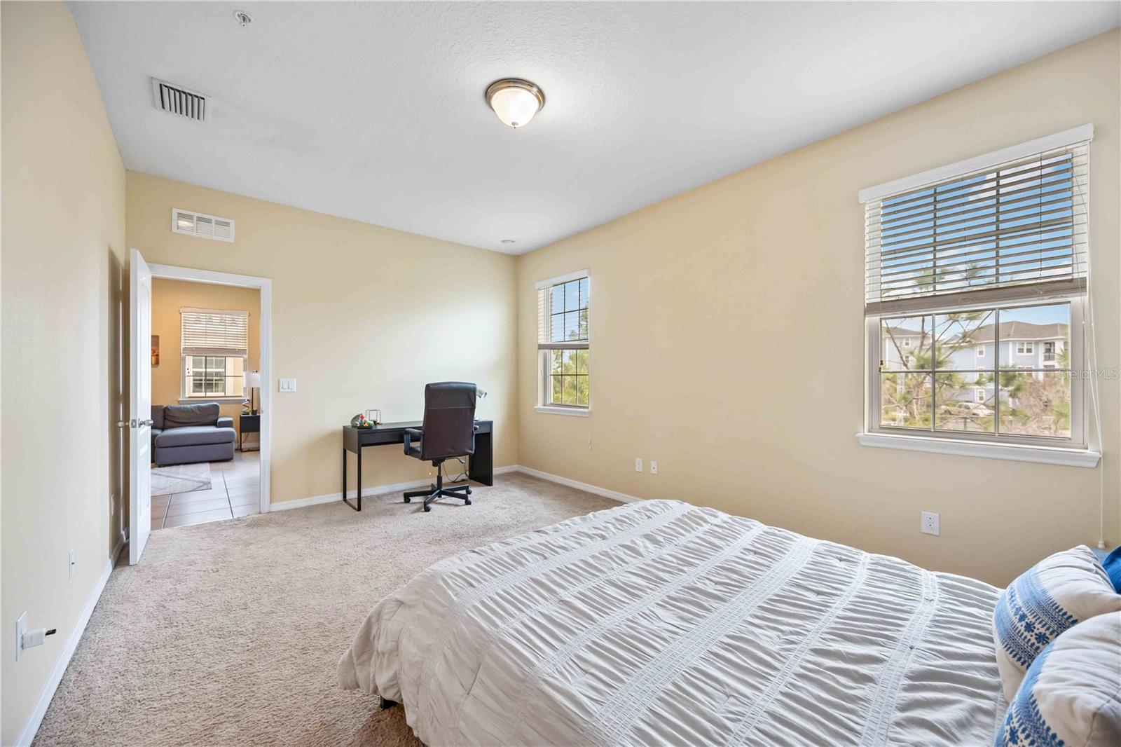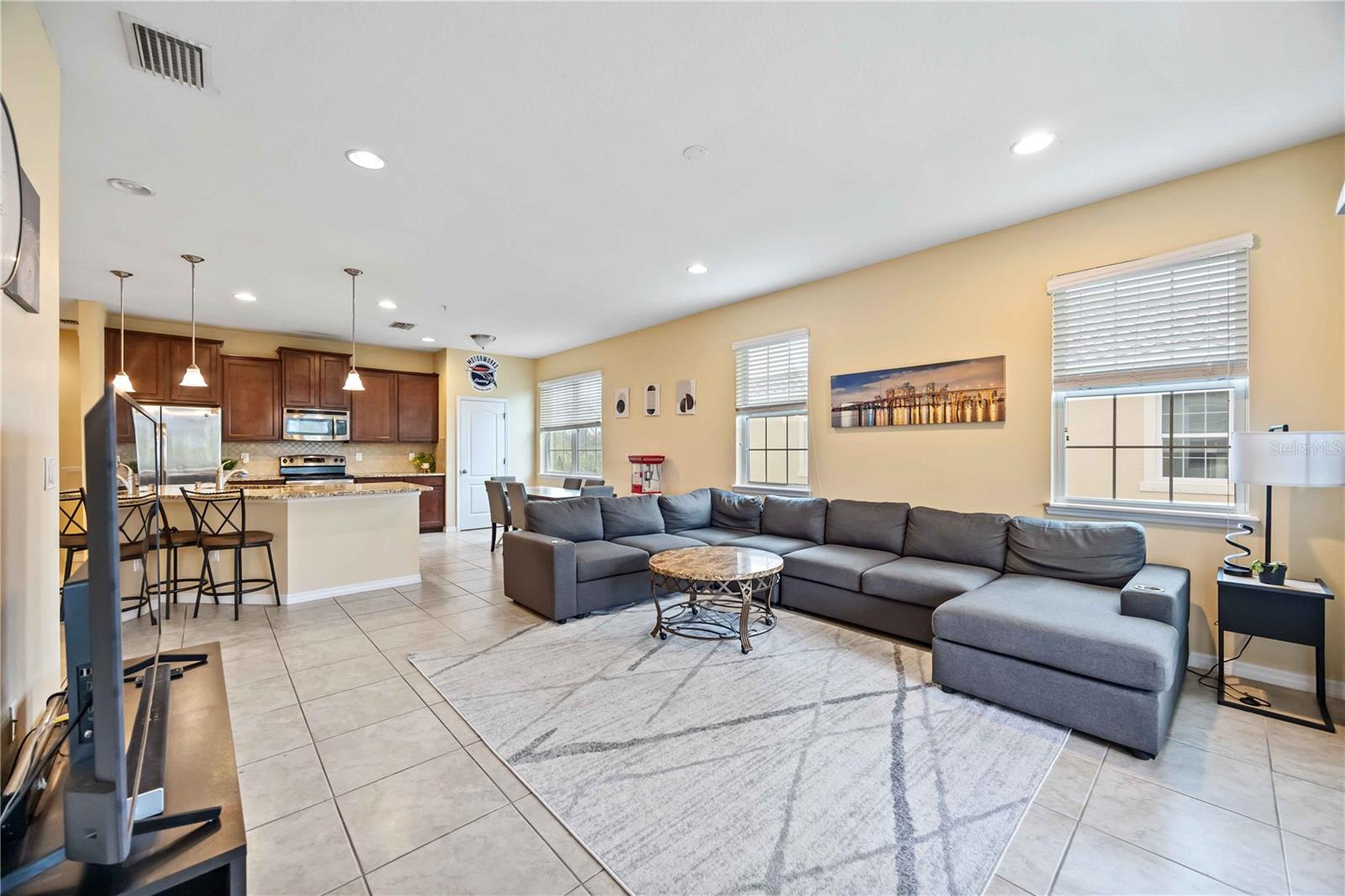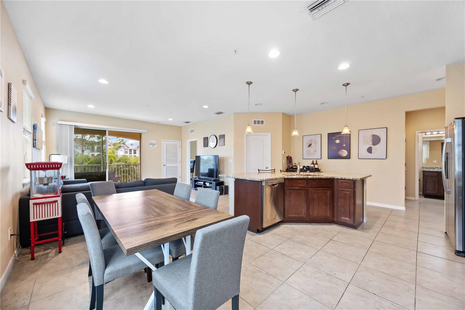 Nestled in the highly sought-after Soleil community, this beautifully designed 3 bedroom, 2 bathroom condo offers a perfect blend of style, comfort, and convenience. Upon entering, you are welcomed by a spacious chef’s kitchen featuring elegant wooden cabinetry, sleek stainless steel appliances, and a generous island that flows effortlessly into the open-concept living and dining areas—perfect for hosting guests or enjoying relaxed everyday living. Tile flooring stretches throughout the home, enhancing its modern aesthetic while providing easy maintenance. The primary suite is thoughtfully positioned for privacy, complete with a luxurious en-suite bathroom where you can unwind in the walk-in shower. A grand walk-in closet offers ample storage, making organization a breeze. Two additional bedrooms and a shared bathroom provide plenty of space for guests, a cozy retreat for visitors, or a peaceful setting for a home office or creative studio. In the center, you will find a bonus den for extended living space and room for guests. At the back of the home, a beautiful screened-in balcony offers the ideal spot to unwind with a glass of wine, where you can relax and take in the serene views of lush greenery and swaying palm trees that enhance the tranquility of the community. An attached one-car garage adds convenience with easy access and extra storage space. Centrally located, close to top-rated schools, popular shopping destinations, and a variety of dining options, this home offers the perfect balance of comfort and accessibility. Located in the vibrant, gated Soleil community, residents enjoy resort-style amenities, including a clubhouse, sparkling pool, state-of-the-art fitness center, dog park, grilling stations, bocce ball courts, and more—all with the advantage of NO CDD fees. Currently rented until April 2025, this property presents an outstanding investment opportunity or the ideal forever home! Don’t miss your chance to experience this exceptional lifestyle, call today to learn more before it’s gone!