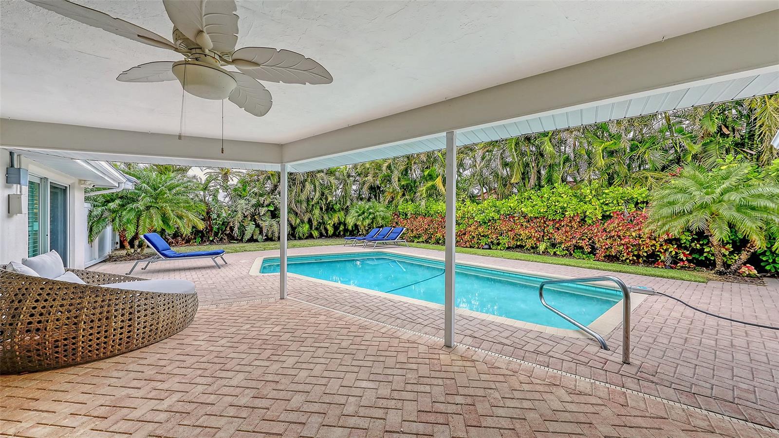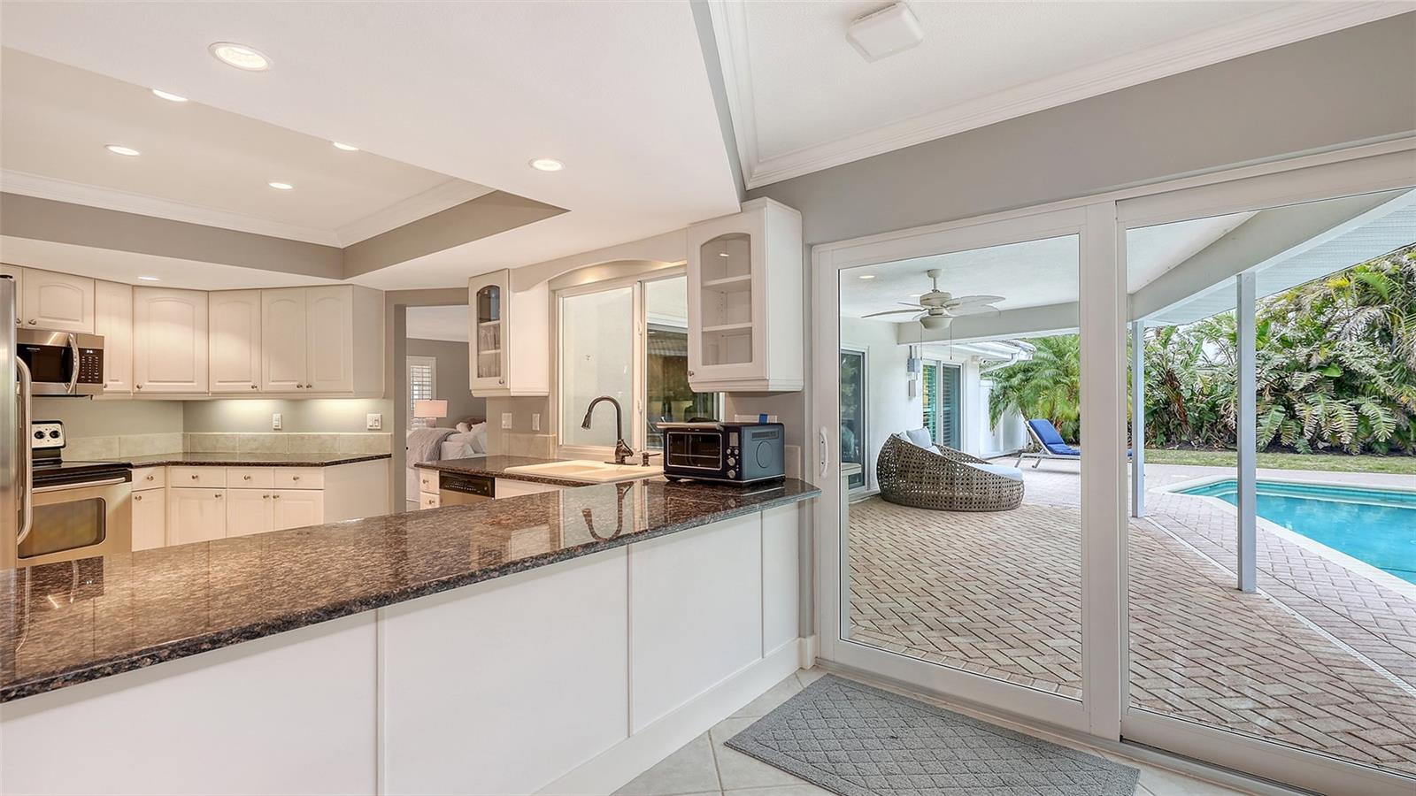 This lovely Bird Key garden home resides on a corner lot with a large circular paver driveway and beautiful landscaping that leads to the front door with the 2 car garage located on the side of the house. Inside, you will find abundant natural light with many windows and glass sliders that afford a splendid view of the large yard and pool area with a private garden wall. This three-bedroom residence has a split floor plan offering a private master suite, complete with 2 walk-in closets, an en-suite bathroom, and sliding doors to the pool deck. The two guest bedrooms and a second bathroom complete the other end of the house. A powder room and an oversized laundry room with a sink and loads of storage are a bonus not found in many garden homes. The kitchen overlooks the large backyard and pool area, with granite countertops, stainless steel appliances, and a breakfast bar overlooking the family/dining room. The house has high-impact windows & sliding doors, a heated pool, a well for irrigation, and mature lush landscaping that provide privacy and a large fenced back yard. The most recent upgrades and improvements from the interior to the exterior include re-ling the plumbing under the slab. The garage was gutted, painted and the floor epoxied. Updated interior baseboards and stunning interior lighting were installed throughout the home, giving it an updated, sleek look. This home is move-in ready. Live the comfortable Florida dream by opening large sliders to the pool area, with neutral tile throughout and a spacious flowing floorplan that makes the indoor-outdoor lifestyle easy. This residential island has its own optional Bird Key Yacht Club, tennis courts, swimming pool, fitness room, social scene, boat slips, marina, indoor and outdoor dining. These are the perfect ingredients for making this your private island retreat, complete with nearby beaches, dining, shopping, excellent schools, and the beautiful downtown area.