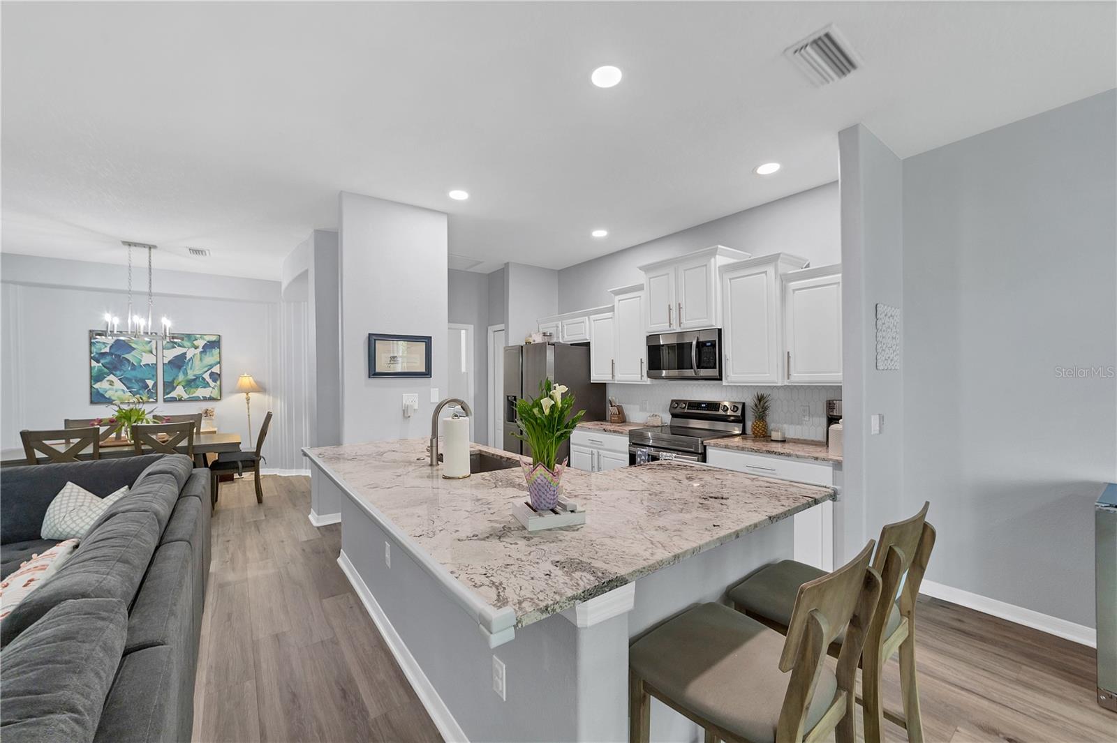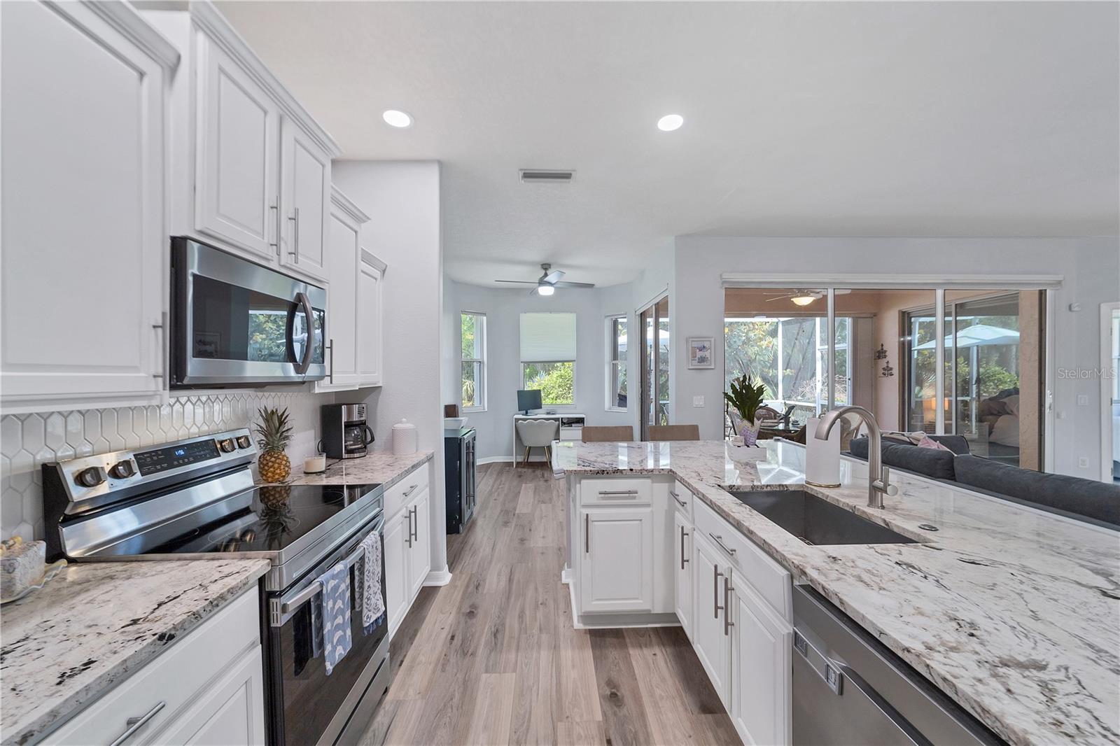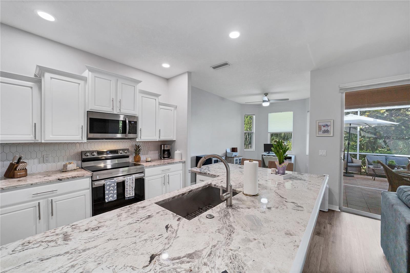 This beautifully appointed 3/2 in one of Sarasota’s most sought-after neighborhoods is a rare find: a completely updated residence that also has all of the critical items covered. 6650 Cheswick very much fulfills the promise of move-in ready. A BRAND-NEW ROOF was just installed 7/24. A top to bottom interior REMODEL, completed in 2021, encompassed so much of what the modern buyer seeks: an open concept kitchen outfitted with gorgeous stone countertops and stainless-steel appliances (all 2021 or newer-a new dishwasher was just recently installed); lovely luxury vinyl plank flooring throughout the main living areas that makes for a larger feel to the space; updated lighting fixtures and fans, including a dramatic entry chandelier, and a tasteful, neutral color palette. Tucked away off of the main living area is a spacious primary bedroom with a luxurious en-suite bathroom that features a beautifully tiled step-in shower, freestanding relaxing soaking tub, and dual vanities. The two additional bedrooms share an updated hall bath. We’ve mentioned the new roof, but what about everything else? The hot water heater was installed in 2019 and the HVAC system was replaced in 2020, and comes complete with air filtration and sanitizing UV light for added cleanliness. An interior laundry room comes with additional storage and a utility sink, an underrated feature of any household. This home comes equipped with a complete set of ACCORDION HURRICANE SHUTTERS for protection and peace of mind during stormy weather. The windows and sliders have also had 3M film added to reduce heat in-take and make the home all the more energy efficient. Enjoy the privacy and tranquility of the preserve and pond out back from an extended screened lanai, part of which is covered by a roof extension, allowing one to sit outside but remain out of the sun should they so choose. There are hard-wired security cameras that CONVEY with sale. Carlyle Village is a delightful, desirable, quiet neighborhood within touching distance of Sarasota’s ever popular UTC area, as well as the dining/shopping options of Lakewood Ranch and Downtown Sarasota, and provides easy access to I-75 and SRQ Airport. Carlyle has NO CDD and a minimal HOA fee. The community pool, playground, and multisport court are just a short walk from the home. The nearby Palm Aire Country Club is available to join, with optional membership with four different equity options available, including golf and social. Between the fantastic interior, attention to all the “bones” items, and its perfect central location convenient to so much of what Sarasota has to offer, this is a fitting home for any buyer, whether it be a set of snowbirds, a young family, or anyone who is seeking to enjoy the good Florida-life.