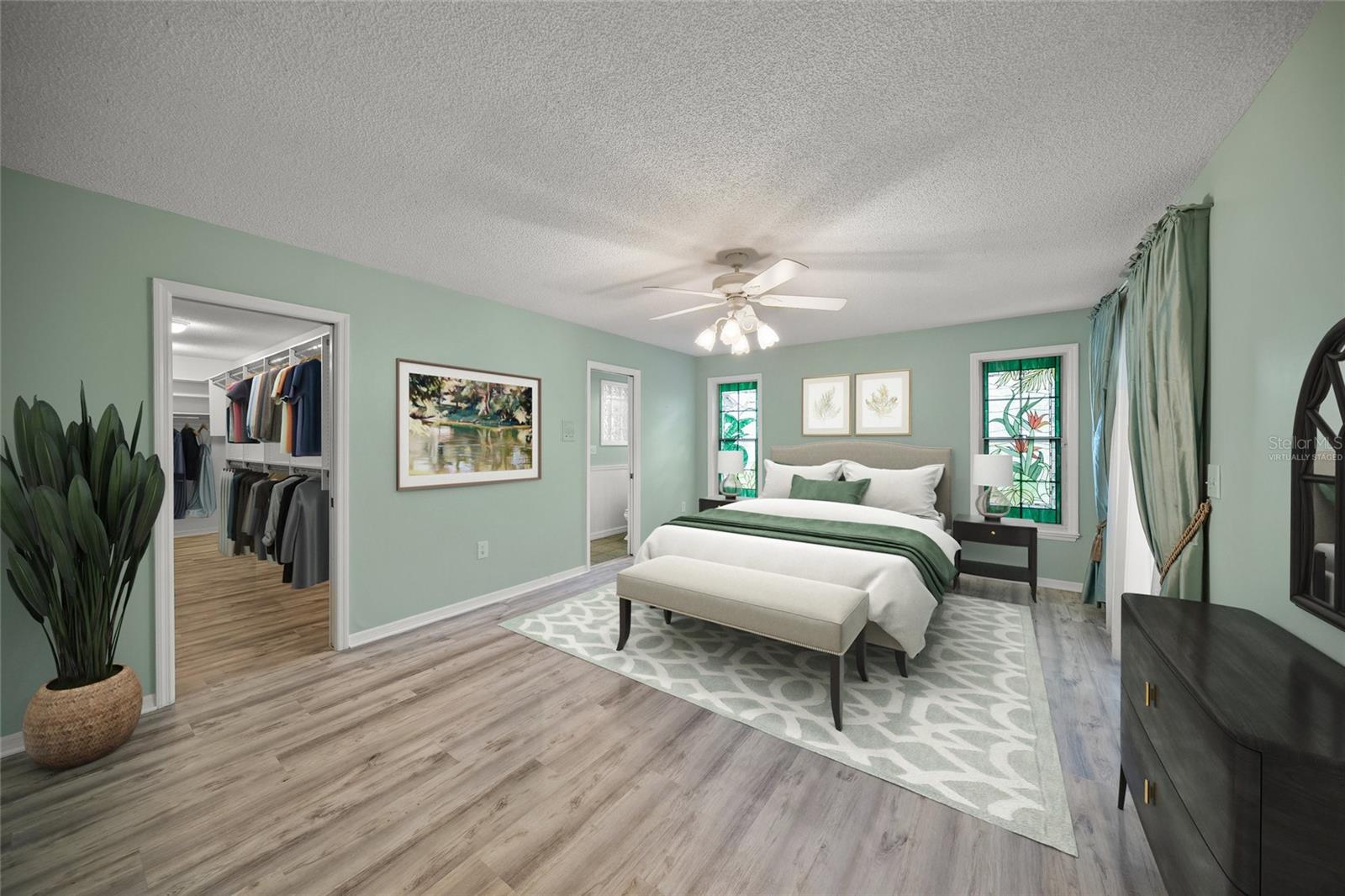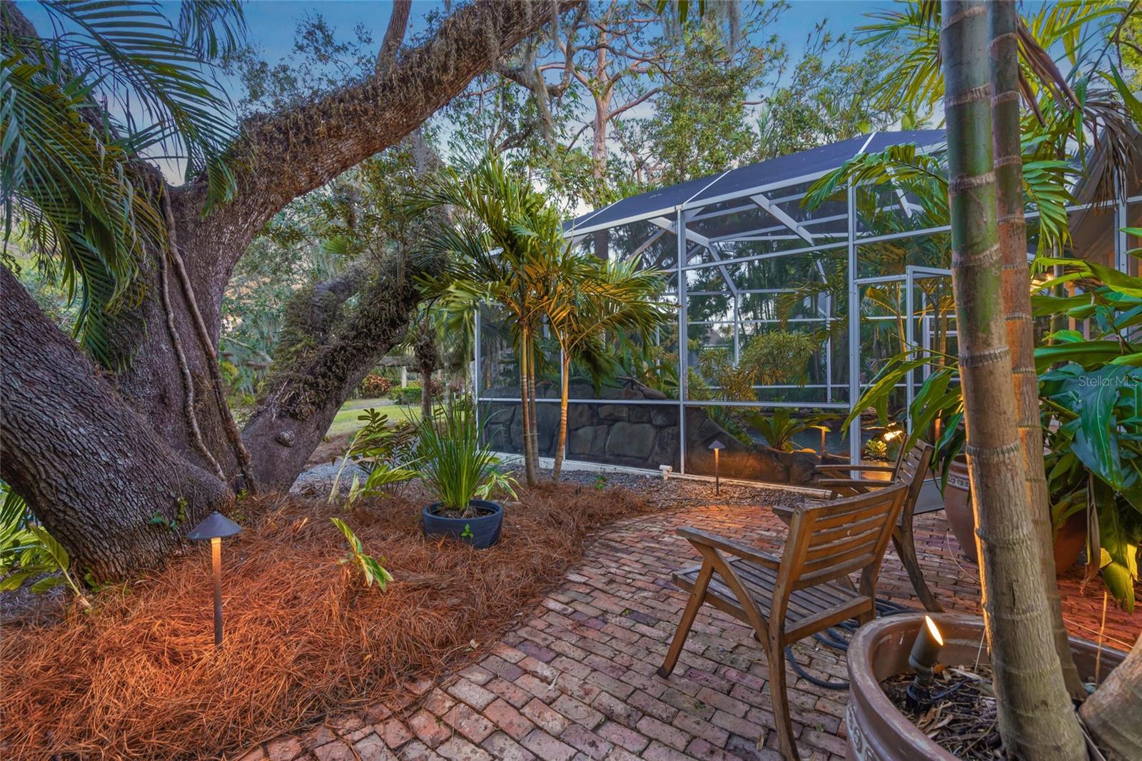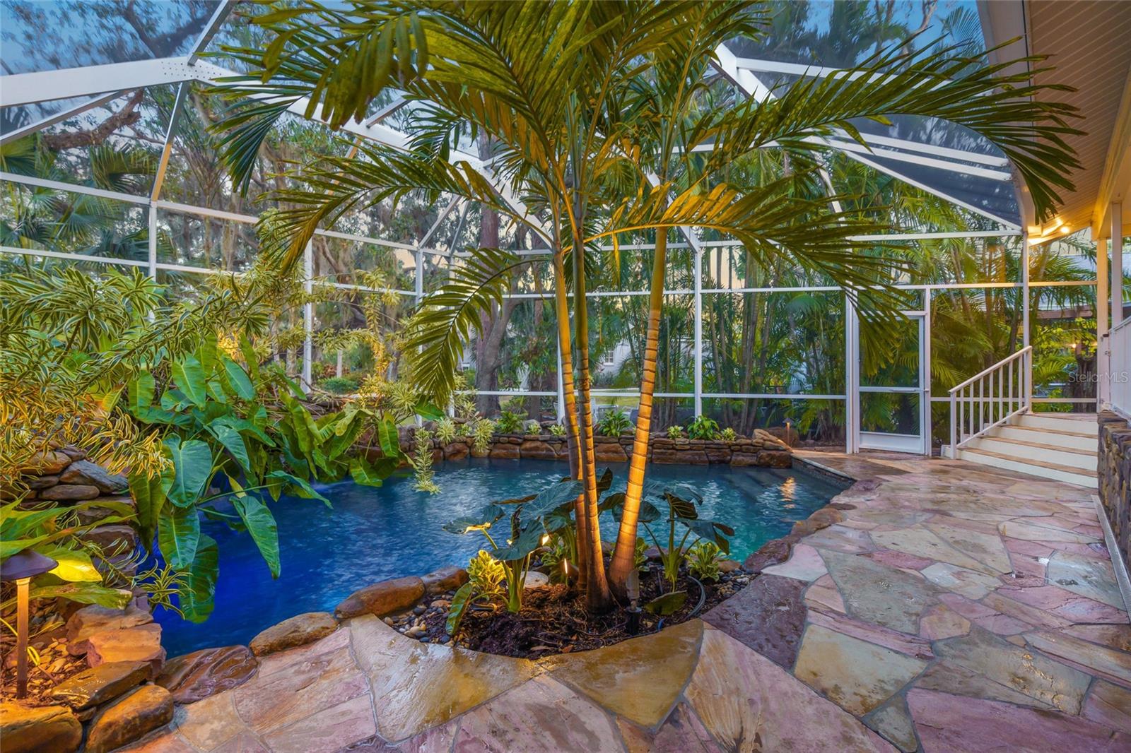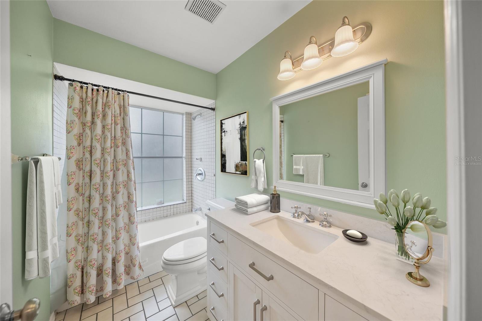 One or more photo(s) has been virtually staged. Nestled in the serene Lakes of Sarasota, this charming home welcomes you with a gently elevated Chicago Brick paver driveway and the shade of a majestic live oak tree. A curving brick paver path leads you through lush, tropical landscaping to a covered front porch—ideal for sipping morning coffee, catching vibrant Sarasota sunsets, or enjoying a peaceful moment with friends. Step inside through double French doors into a spacious, tiled foyer that flows into the generous living room. Soaring cathedral ceilings and abundant natural light—streaming through three sets of French doors and a skylight—make this the heart of the home. With access to both the front porch and rear patio, you’ll always be just moments from the outdoors. The kitchen is a chef’s dream, featuring solid wood cabinetry, thick, flecked granite countertops, and a breakfast bar for casual dining. Upgraded appliances include a Frigidaire cooktop, convection microwave, built-in oven, Whirlpool refrigerator, and a Bosch dishwasher—making meal prep both easy and enjoyable. The home’s split bedroom layout offers privacy and tranquility. Two spacious hall bedrooms share a full bath with a new vanity and a combined shower/tub. The owner’s suite offers direct access to the rear elevated patio, along with a large walk-in closet and two stunning stained glass windows. The en-suite bath features a spa soaking tub, separate shower, and twin pedestal sinks—your own private retreat. Upstairs, a massive fourth bedroom—perfect as a flex room, office, or game room—offers three walls of windows and plenty of space, creating a peaceful sanctuary away from the rest of the home. The outdoor living space is nothing short of magical. A Lucas Lagoon pool with waterfalls, natural stone accents, and an indigo blue gunite surface offers a resort-style experience right in your own backyard. With a heated spa feature and ambient lighting, this is your own unique, year-round pool paradise. The Lakes HOA offers plenty of recreation - gazebo, basketball court, playground, 2 tennis courts, fitness center, clubhouse and 2 community pools. Centrally located in Sarasota and under 15 minutes to I-75, UTC, Celery Fields, Legacy Trailhead, Donald Ross redesigned Bobby Jones Public Golf Course, Downtown Sarasota with its Farmers Market, shopping, and fine dining restaurants. Easy access to Lido and Siesta Key Beaches. Home was built elevated and had no water intrusion through 2024.