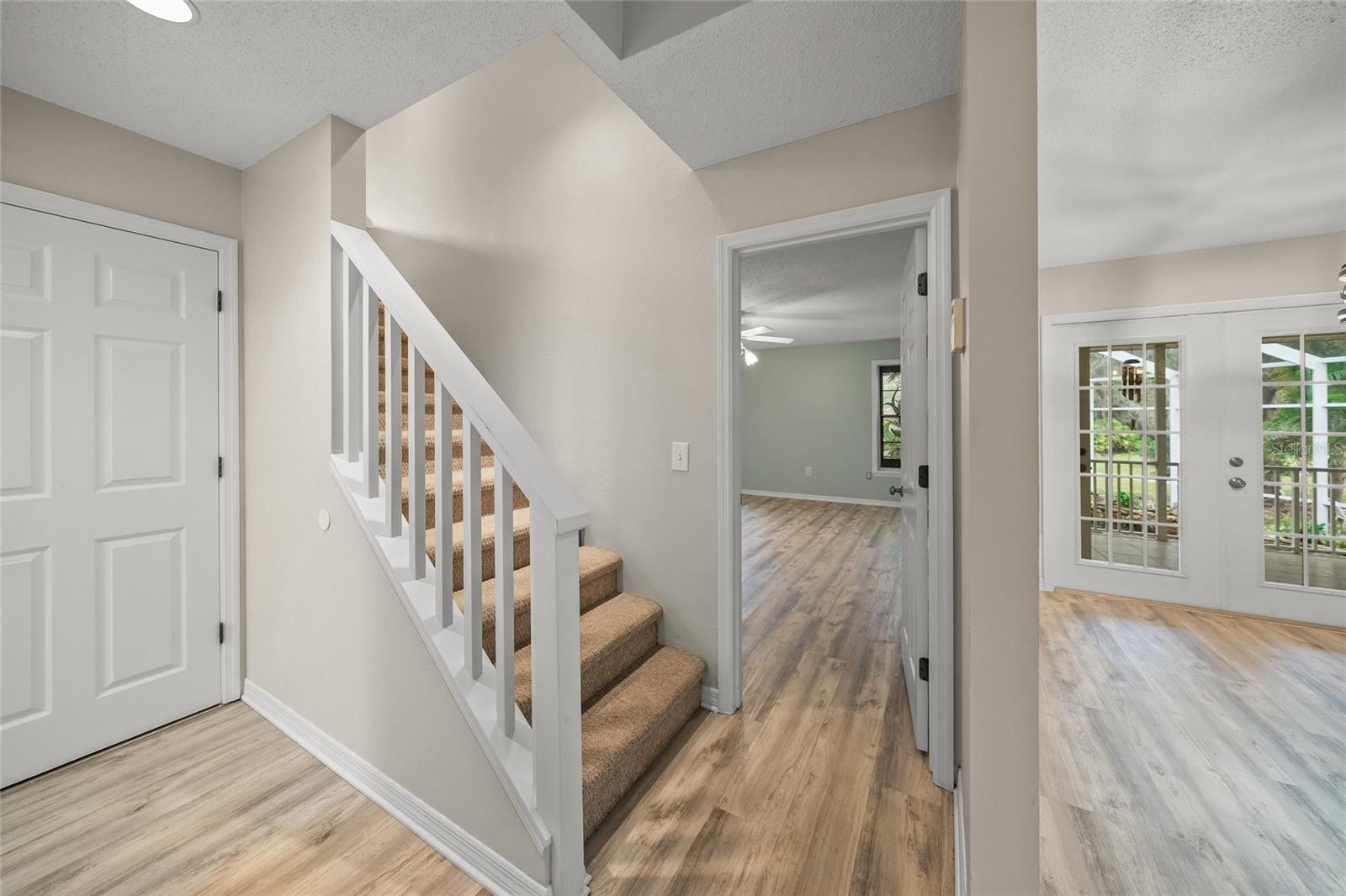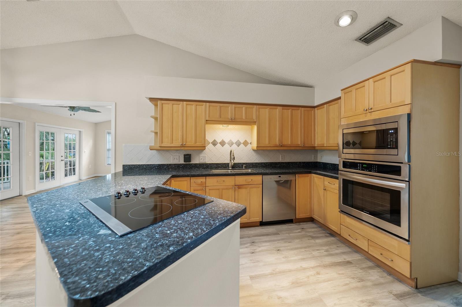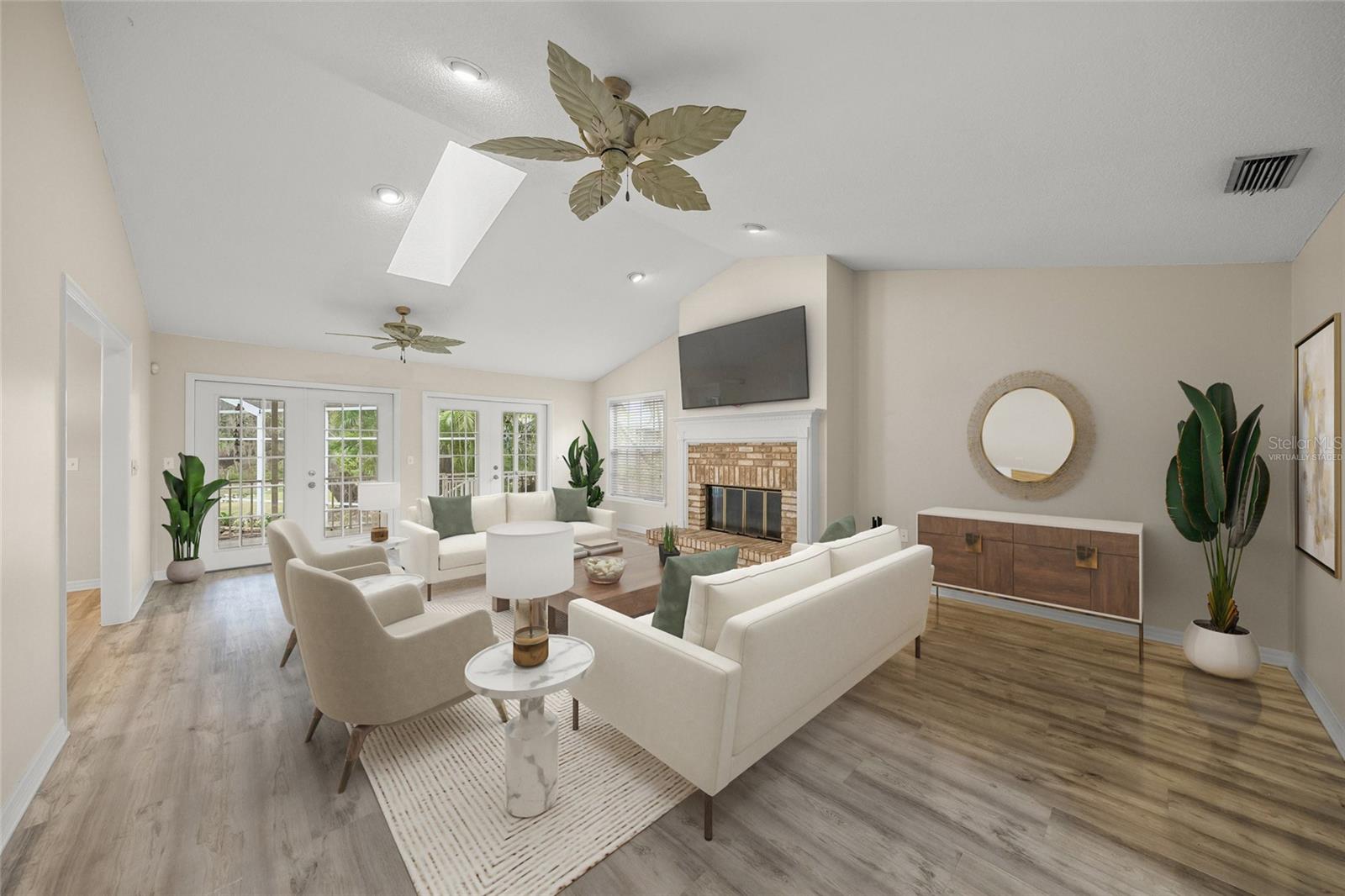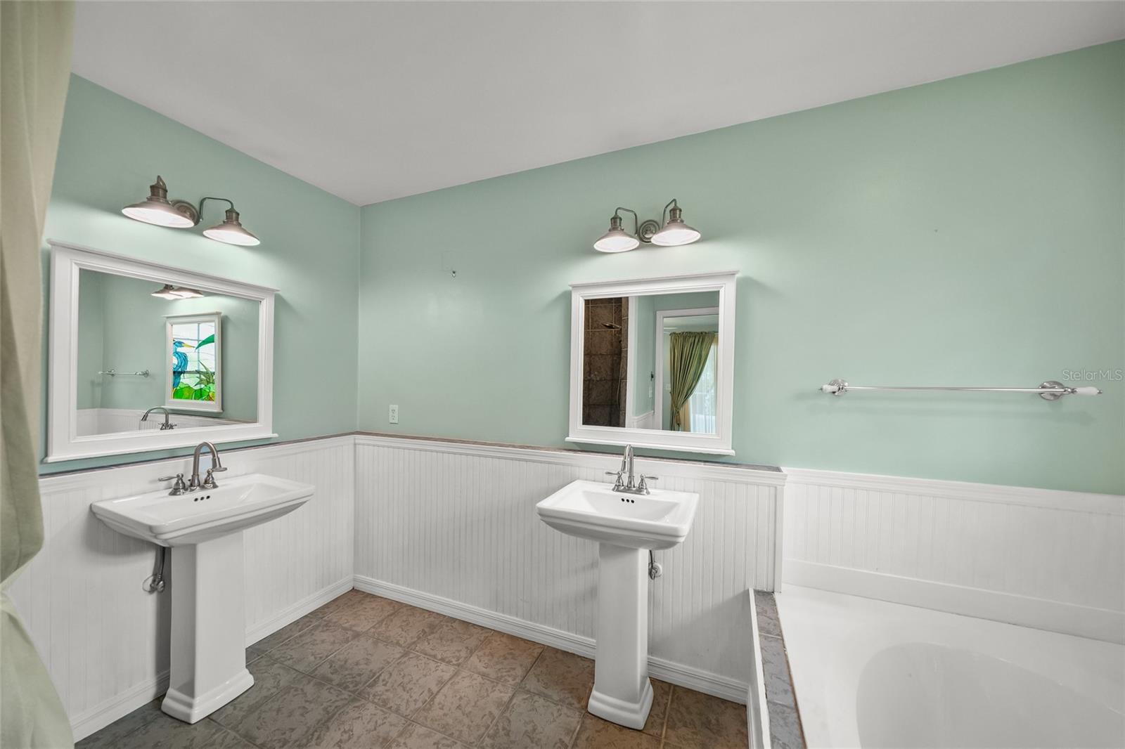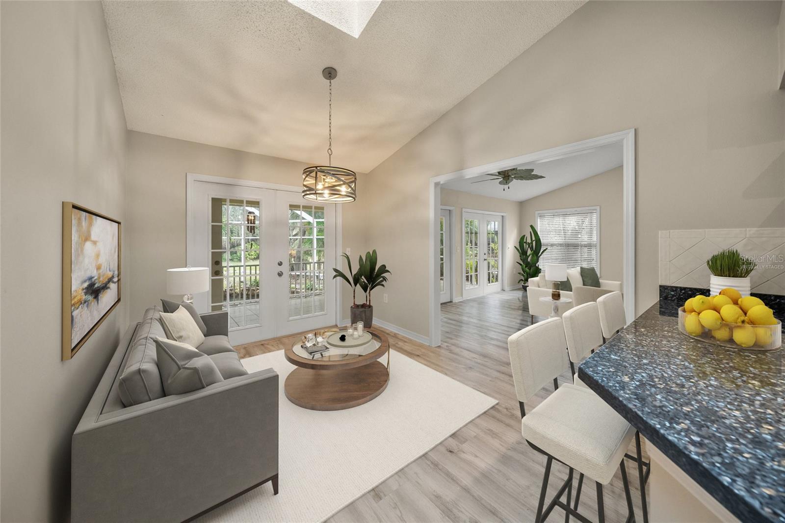 One or more photo(s) has been virtually staged. Nestled in the serene Lakes of Sarasota, this charming home welcomes you with a gently elevated Chicago Brick paver driveway and the shade of a majestic live oak tree. A curving brick paver path leads you through lush, tropical landscaping to a covered front porch—ideal for sipping morning coffee, catching vibrant Sarasota sunsets, or enjoying a peaceful moment with friends. Step inside through double French doors into a spacious, tiled foyer that flows into the generous living room. Soaring cathedral ceilings and abundant natural light—streaming through three sets of French doors and a skylight—make this the heart of the home. With access to both the front porch and rear patio, you’ll always be just moments from the outdoors. The kitchen is a chef’s dream, featuring solid wood cabinetry, thick, flecked granite countertops, and a breakfast bar for casual dining. Upgraded appliances include a Frigidaire cooktop, convection microwave, built-in oven, Whirlpool refrigerator, and a Bosch dishwasher—making meal prep both easy and enjoyable. The home’s split bedroom layout offers privacy and tranquility. Two spacious hall bedrooms share a full bath with a new vanity and a combined shower/tub. The owner’s suite offers direct access to the rear elevated patio, along with a large walk-in closet and two stunning stained glass windows. The en-suite bath features a spa soaking tub, separate shower, and twin pedestal sinks—your own private retreat. Upstairs, a massive fourth bedroom—perfect as a flex room, office, or game room—offers three walls of windows and plenty of space, creating a peaceful sanctuary away from the rest of the home. The outdoor living space is nothing short of magical. A Lucas Lagoon pool with waterfalls, natural stone accents, and an indigo blue gunite surface offers a resort-style experience right in your own backyard. With a heated spa feature and ambient lighting, this is your own unique, year-round pool paradise. The Lakes HOA offers plenty of recreation - gazebo, basketball court, playground, 2 tennis courts, fitness center, clubhouse and 2 community pools. Centrally located in Sarasota and under 15 minutes to I-75, UTC, Celery Fields, Legacy Trailhead, Donald Ross redesigned Bobby Jones Public Golf Course, Downtown Sarasota with its Farmers Market, shopping, and fine dining restaurants. Easy access to Lido and Siesta Key Beaches. Home was built elevated and had no water intrusion through 2024.