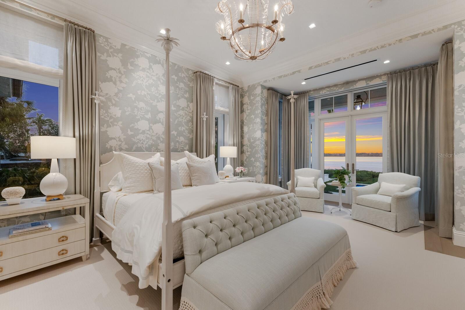This extraordinary waterfront estate, set on nearly three acres of pristine Siesta Key bayfront, is a masterclass in architectural elegance and modern coastal living. Designed by Stofft Cooney Architects and brought to life by Florida West Builders, this 2024 custom-built West Indies-style residence showcases impeccable craftsmanship, curated interiors, and a seamless connection to breathtaking surroundings. With 217’ of direct bay frontage and an elevated position for optimal water views, this estate embodies the pinnacle of luxury living. A private, gated entry leads to winding Tabby seashell driveways that guide you to the grand entrance. Flanked by two breezeways, the porte-cochere sets the tone for the estate’s sophisticated charm. Thoughtfully designed with meticulous attention to detail, the property includes an oversized three-car garage for the main house and a separate four-car garage under the guest house. Inside, walls of oversized, floor-to-ceiling impact glass frame uninterrupted bay views, bathing the interiors in natural light. Every element, from the European oak hardwood floors in a warm Milano finish to the bespoke cabinetry by Campbell Cabinetry Designs, has been carefully selected for both beauty and functionality. The home’s intelligent Control4 lighting and sound system, along with a whole-house water filtration system, enhances everyday comfort. The grand foyer makes a lasting impression with a solid mahogany double-door entry, inlaid cabochon stone squares, and extra-wide solid wood staircase with a stunning Chippendale railing. Designed for effortless entertaining, the great room, with its soaring ceilings and floor-to-ceiling windows, flows seamlessly into the elegant dining space and showstopping kitchen. This gourmet haven features two expansive islands, custom cabinetry and 3cm Crystallo quartzite countertops. High-end appliances, including La Cornue range and Francois hood, elevate the culinary experience. A butler’s pantry and additional walk-in pantry provide ample storage and convenience. The first-floor primary wing is a private sanctuary, accessed through double hideaway jamb doors. It boasts oversized custom walk-in closets and French door access to outdoor entertaining. The spa-inspired en-suite his/her bath, designed around an octagonal vestibule with a barrel-vault ceiling is set against tesserae mosaic flooring by New Ravenna. Upstairs, an open promenade overlooks the main living areas, leading to two en-suite bedrooms, each with custom-built closets and private terraces offering sweeping water views. A lounge with built-in wet bar and exercise suite complete the upper level. A separate guest house offers an intimate retreat with a full kitchen, pecky cypress-paneled living room, and bedroom suite with its own en-suite bath and balcony access. The estate’s outdoor spaces create an unparalleled setting for relaxation and entertainment. The summer kitchen, complete with an island, wraparound bar, and fireplace, is enclosed by motorized Jansen storm shutters and roll-down screens. A vanishing-edge heated pool features steppingstones and a separate spa, the perfect ambiance for sunset gatherings. The east side of the property hosts a tennis court surrounded by custom Walpole fence, complete with a pavilion equipped with hurricane shutters and cozy fireplace. For boating enthusiasts, the private dock extends 90’ with a floating kayak launch and 20,000 lb. lift capable of accommodating a 34’ vessel.