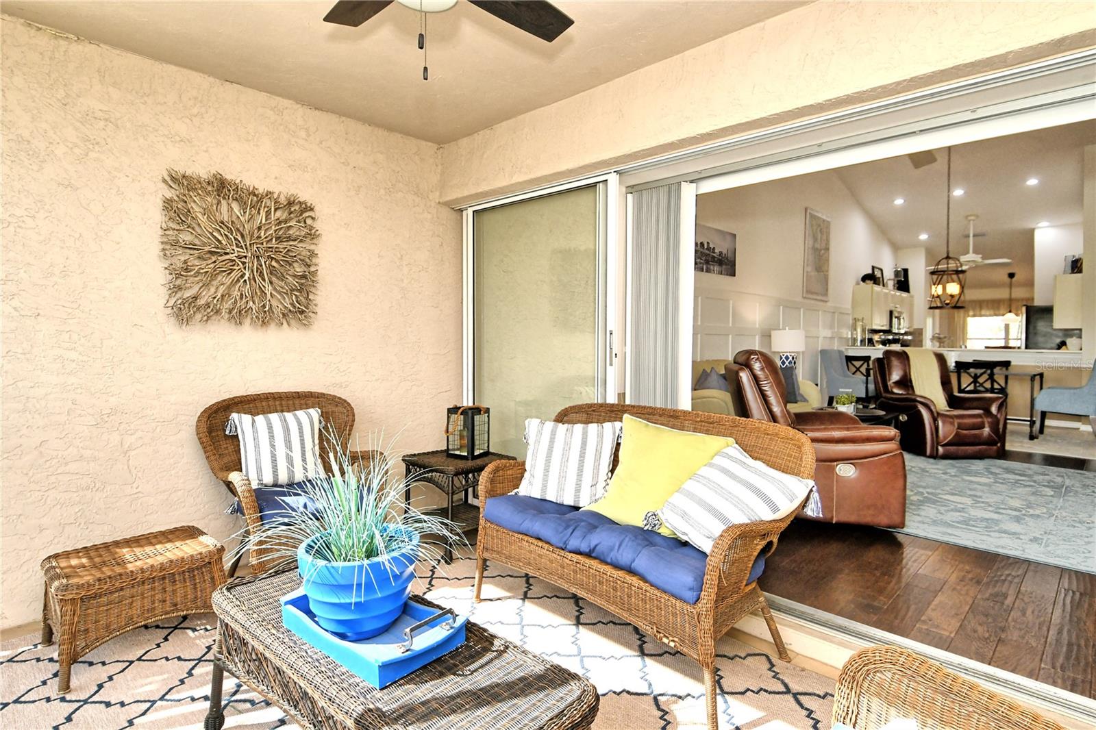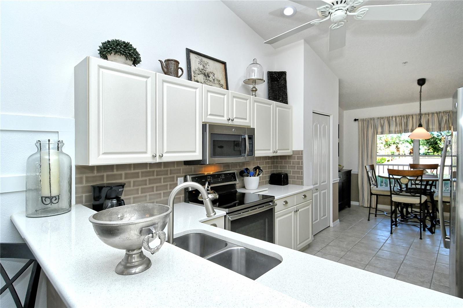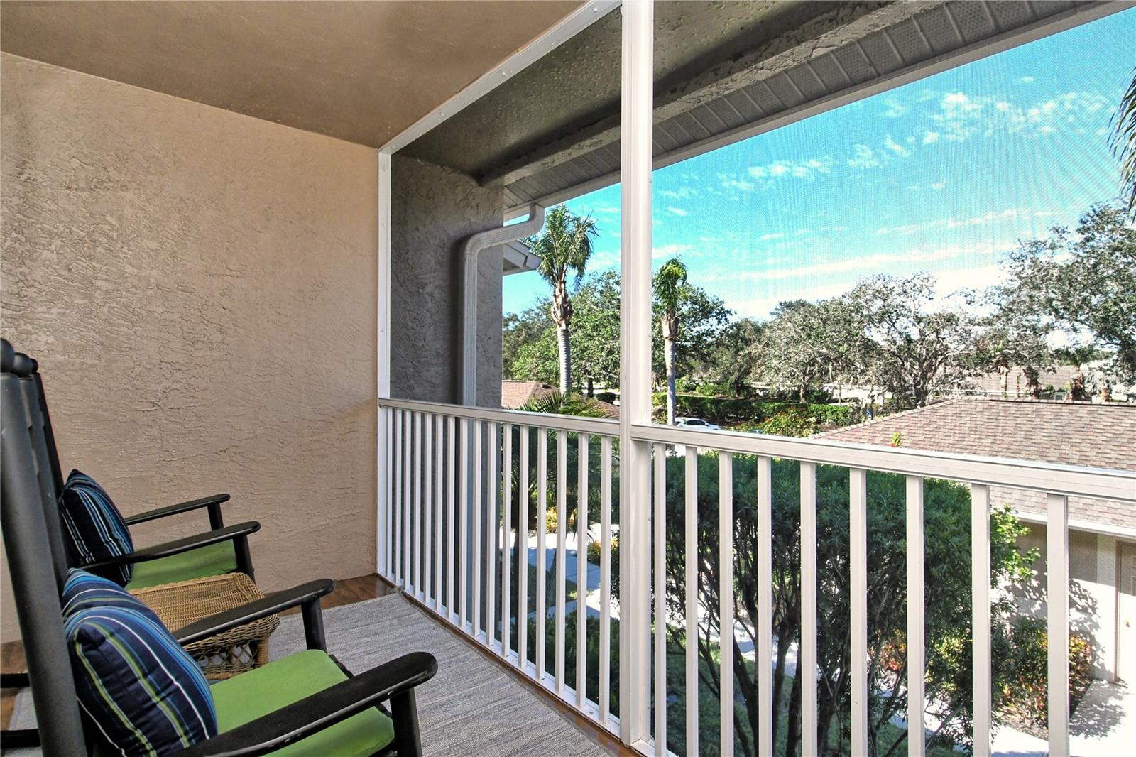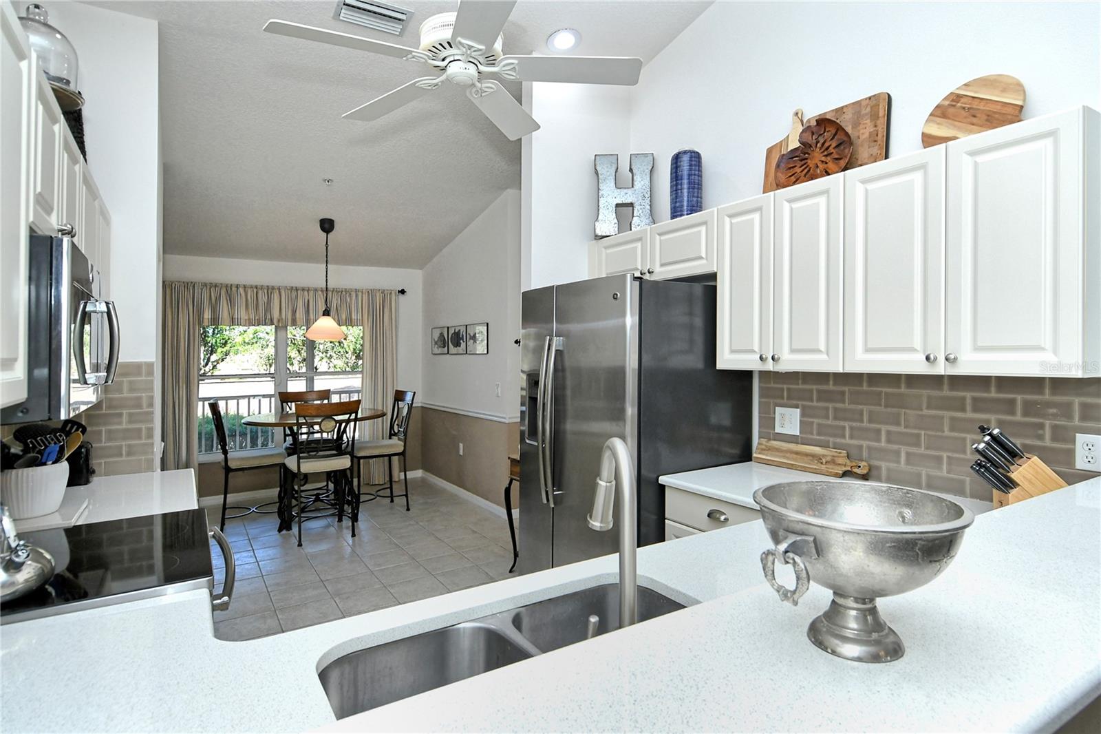 Take a look at this gorgeous, completely updated "Barrington" model veranda in Heritage Oaks Golf & Country Club that is being sold Turn-Key Furnished. As soon as you step through the front door you're greeted with an abundance of natural light, large vaulted ceilings, and a wonderfully appointed and updated space. The views from this unit are absolutely spectacular. Enjoy evenings on your two private screened lanais and take in the panoramic and sweeping views of water and the 14th Signature Hole of the golf course - this is truly a premium view! The kitchen has been thoughtfully updated with quartz countertops, stainless steel appliances, and a lovely subway tile backsplash making this the perfect space for an evening in or for entertaining friends and family. This property also features some amazing wood work details such as chair rail throughout, a lovely dry bar with custom wood shelving, and a gorgeous wood panel molding detail on the back wall in the living room - this detail really adds some character and charm to this outstanding property. In addition, beautiful hand-scraped laminate flooring has been installed in the living, dining, and den spaces giving a perfect amount of warmth to the space. Both bathrooms have been updated with new counter tops and light fixtures as well as a completely renovated shower with spectacular tile in the primary bath complete with a frameless shower door. The den/study is a perfect flex space and can be used as an office, den, or even a third bedroom as a custom frosted window has been installed for enhanced privacy. This property is perfect for a seasonal owner or even as a primary residence. Watch the abundance of wildlife in Heritage Oaks as the community is a Certified Audubon Neighborhood. Heritage Oaks is known for its pristine 18-hole golf course, har-tru tennis courts, fitness center, 24-hour security, an impressive clubhouse with a lovely restaurant and the sensational 19th Hole Lounge, 5 swimming pools, and a calendar of events packed with activities. You will not want to miss out on this spectacular home, it won't last long!