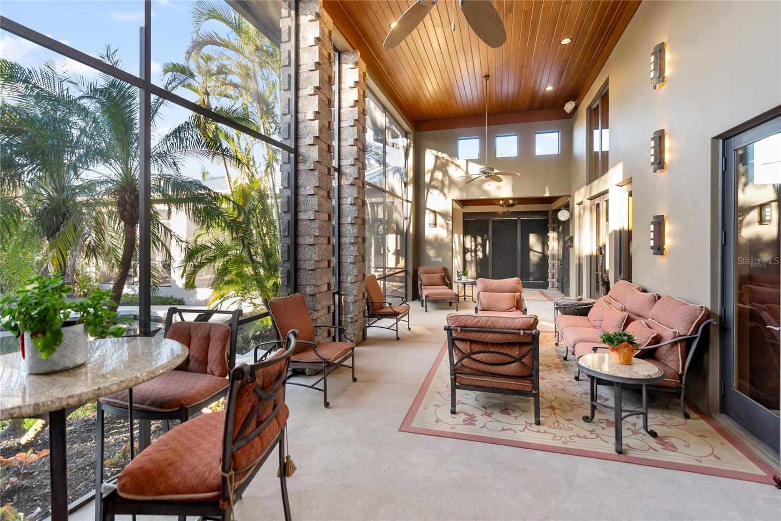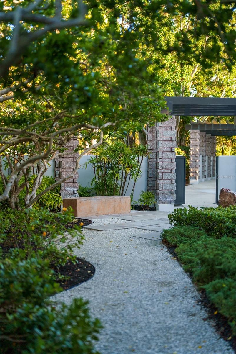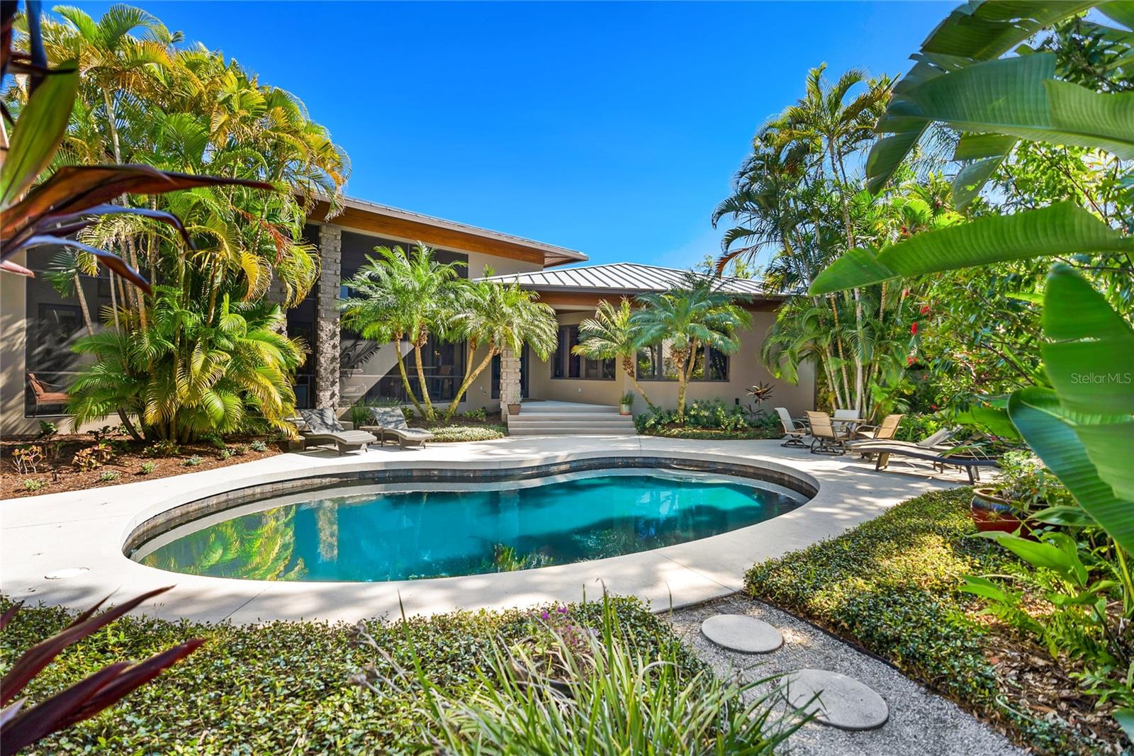 Designed by esteemed architect John Potvin, this exceptional home combines elegance with casual tropical charm. Created with flexibility in mind, its three distinct structures—connected by covered lanais—provide privacy and grand spaces for socializing. Stone columns, metal pergolas, and lush foliage enhance the serene atmosphere, while a stucco perimeter wall ensures ultimate privacy, complemented by the soothing sounds of a tranquil fountain.