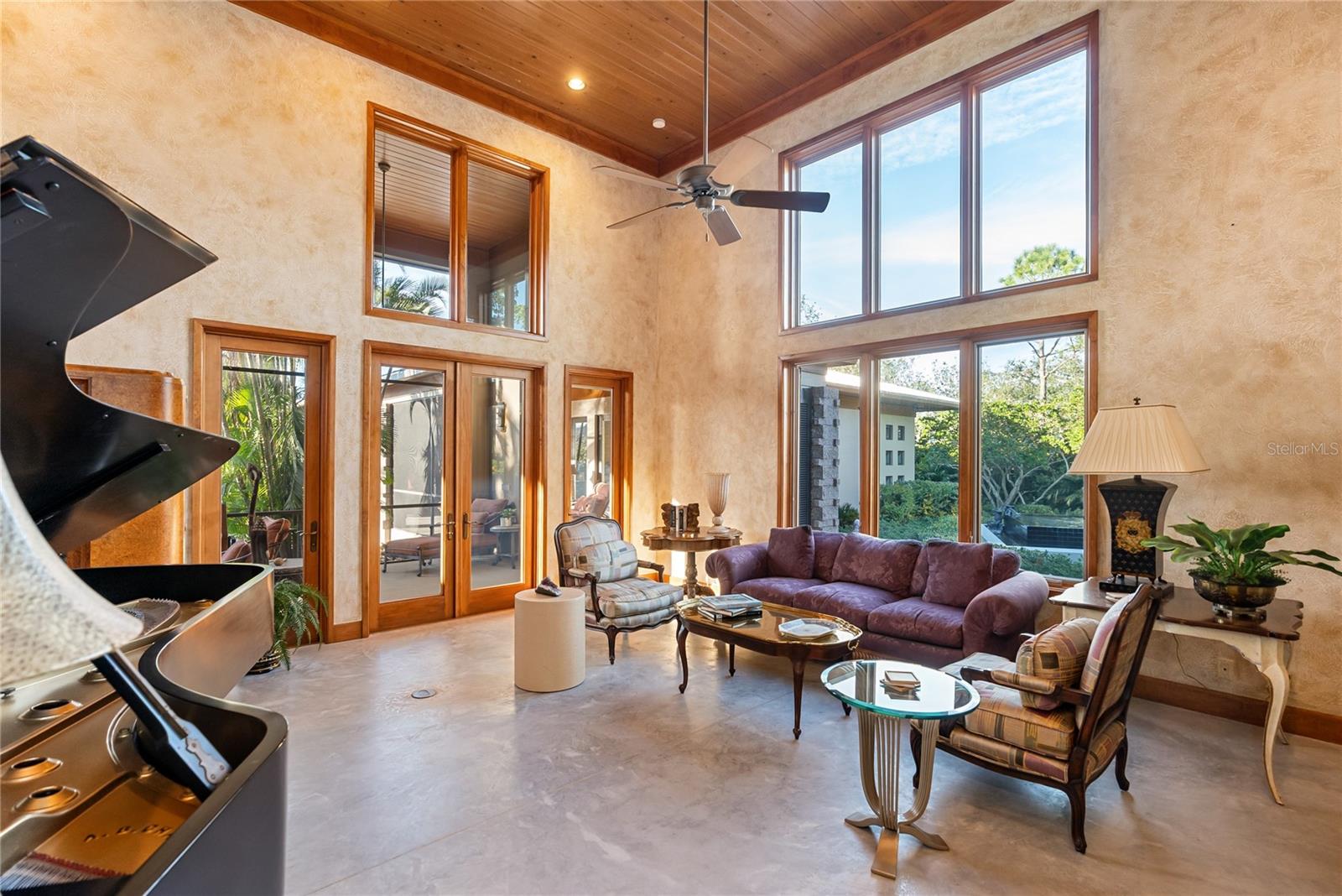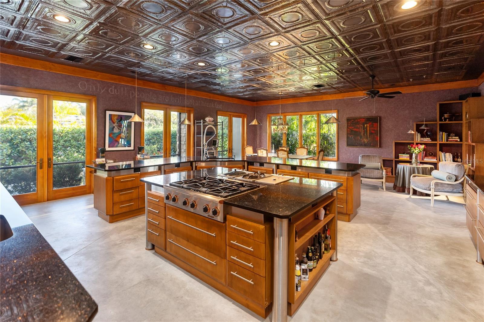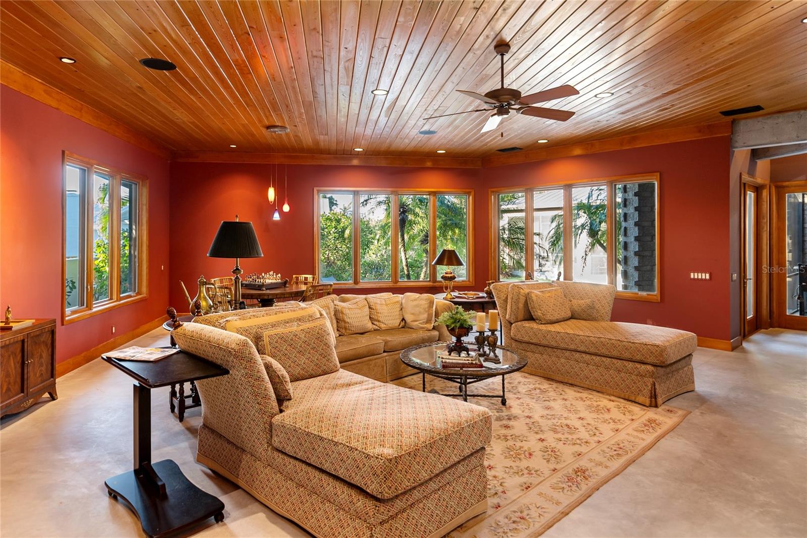 Designed by esteemed architect John Potvin, this exceptional home combines elegance with casual tropical charm. Created with flexibility in mind, its three distinct structures—connected by covered lanais—provide privacy and grand spaces for socializing. Stone columns, metal pergolas, and lush foliage enhance the serene atmosphere, while a stucco perimeter wall ensures ultimate privacy, complemented by the soothing sounds of a tranquil fountain.