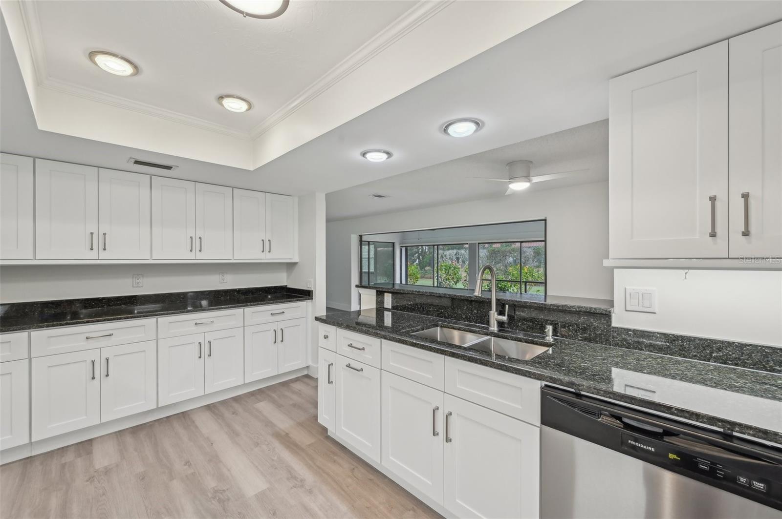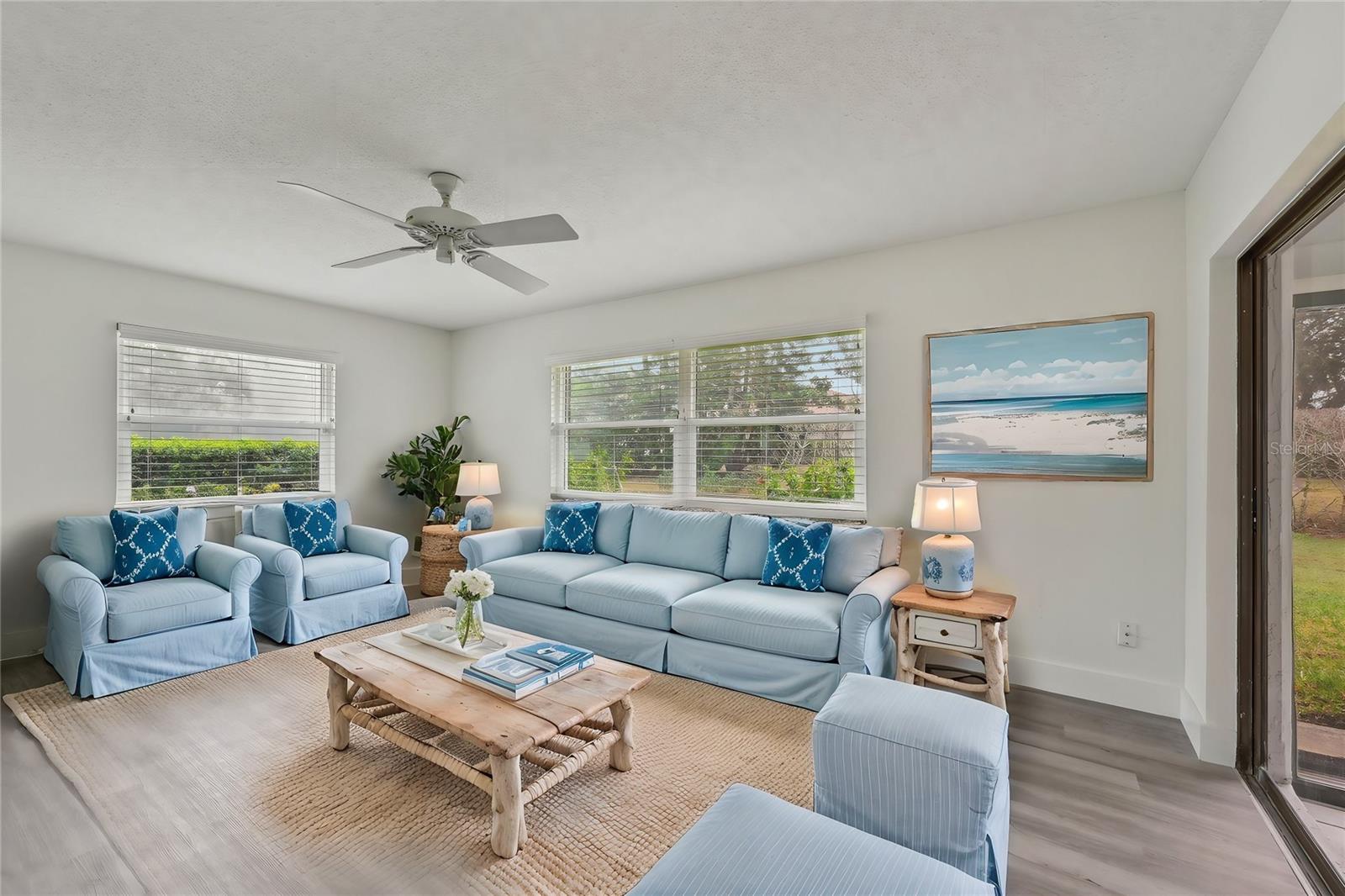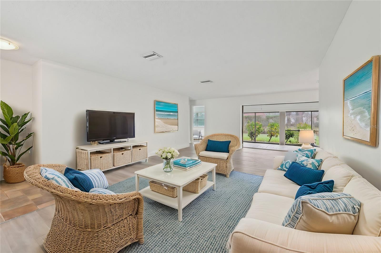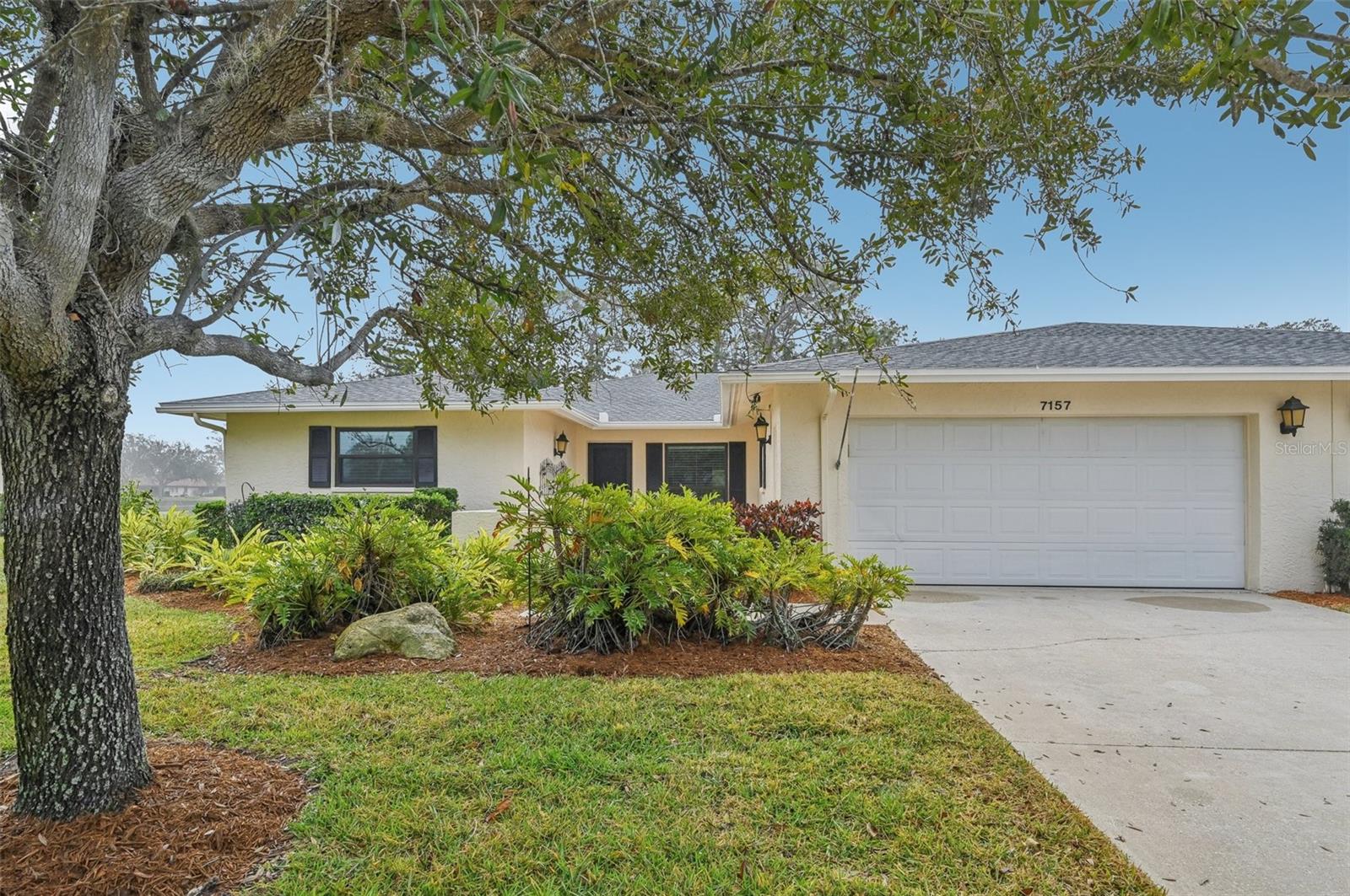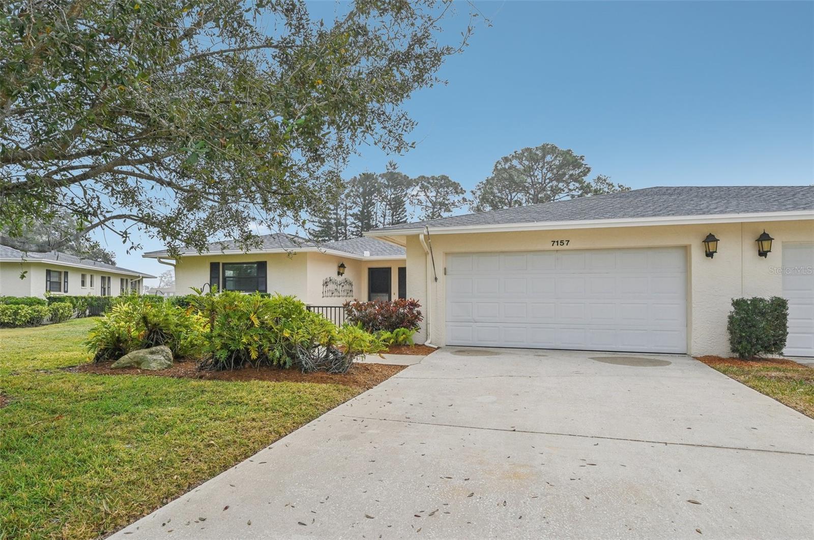 Welcome to 7157 Fairway Bend Circle, a beautifully renovated 2-bedroom, 2-bath villa with a versatile den, situated on a peaceful cul-de-sac in the highly desirable Palm Aire community. This stunning 2,056-square-foot home was thoughtfully updated in 2024 with fresh interior and exterior paint, new lighting, and luxury vinyl plank flooring throughout. The living room is impressively large, offering ample space for both relaxation and entertaining. The completely remodeled kitchen features Frigidaire appliances, soft-close cabinetry, granite countertops, and stylish lighting, making it both functional and elegant. The thoughtfully designed layout provides privacy and comfort, with the guest bedroom and bath located at the front of the home, while the primary suite is tucked away in the back. The primary suite boasts a walk-in closet, two additional closets, a walk-in shower, and a single-sink vanity, complemented by functional pocket doors. Sliding doors from the primary bedroom lead to a cozy den, which connects to the enclosed, air-conditioned lanai with elegant porcelain tile flooring—perfect for year-round relaxation or entertaining. Practical upgrades include a 2022 roof, a 2025 HVAC system, an epoxy-coated garage floor (2025), and a 2016 water heater. Palm Aire offers residents access to a heated community pool, clubhouse, and shuffleboard courts, with optional golf memberships available. Conveniently located near Sarasota’s top attractions, including the airport, University Town Center, downtown, and the beautiful Gulf beaches, this villa combines modern living with an unbeatable location. Don’t miss the chance to make this beautiful property your new home. One or more photos have been virtually staged.