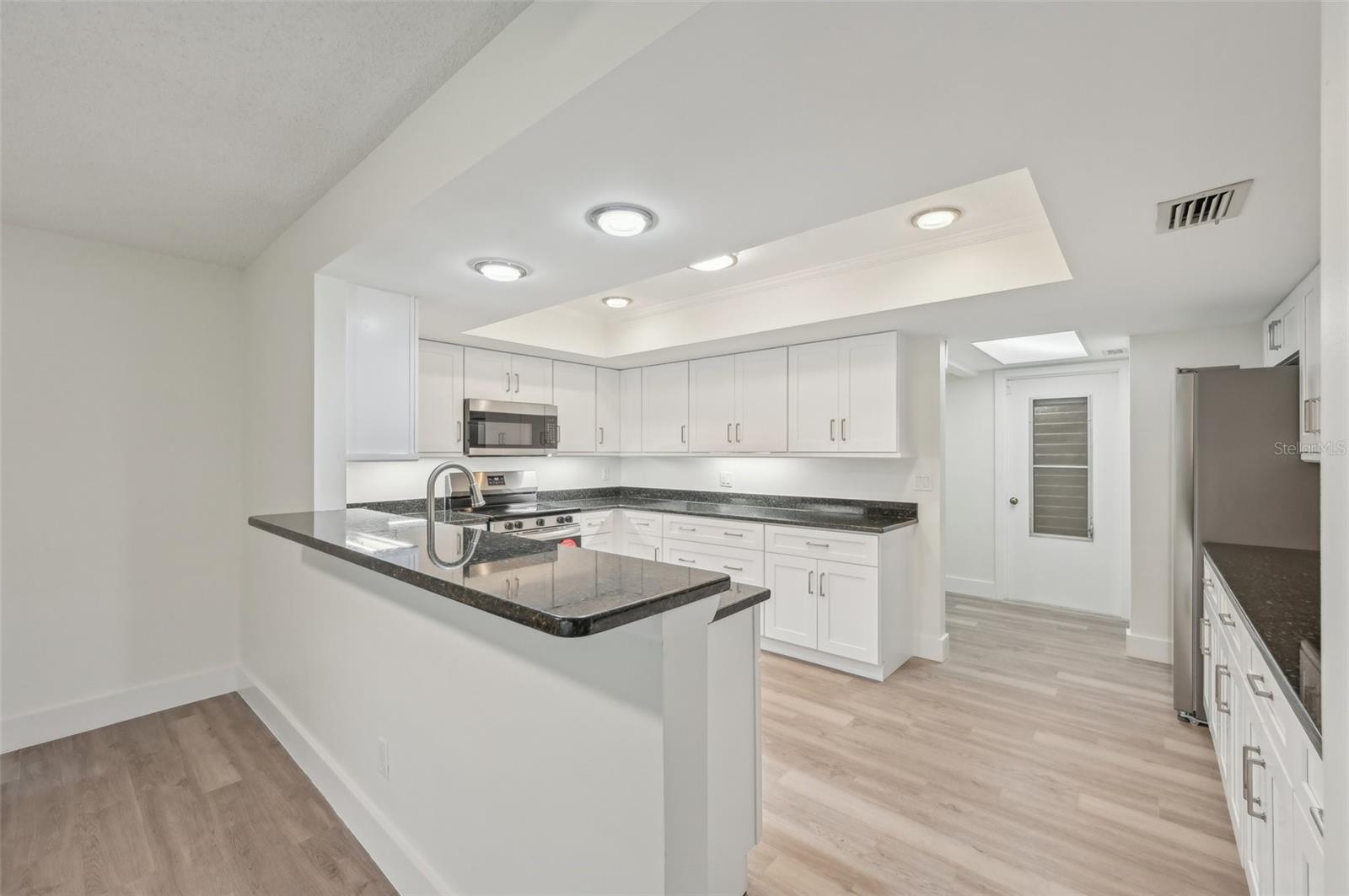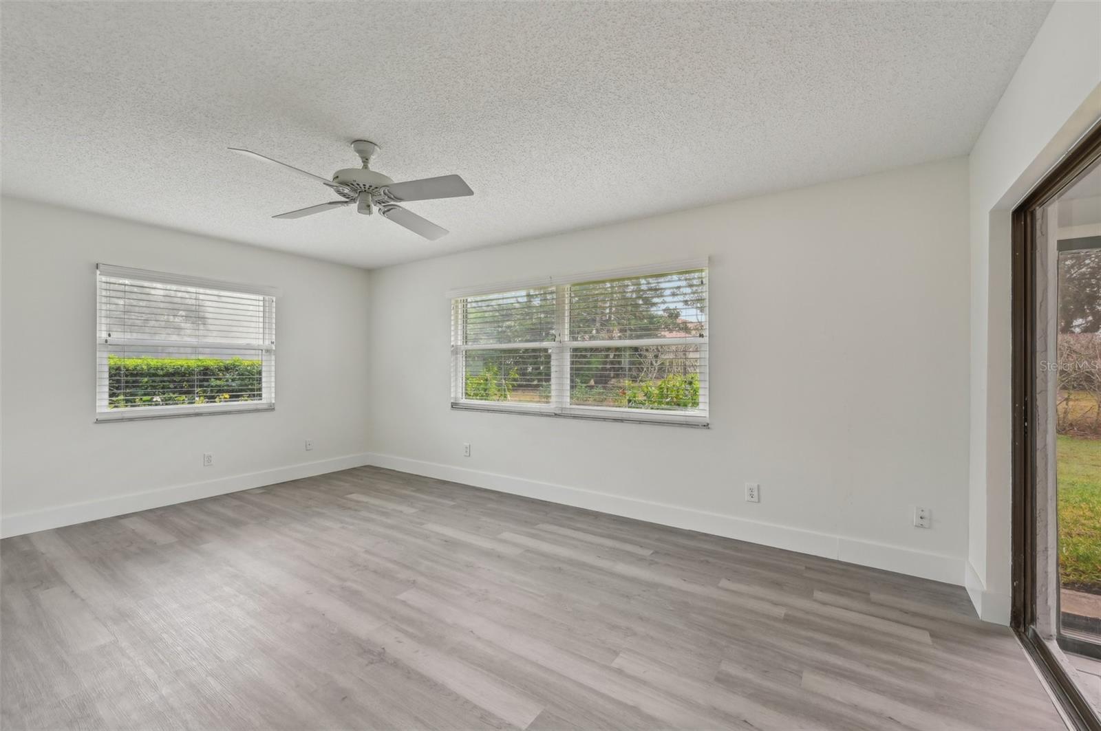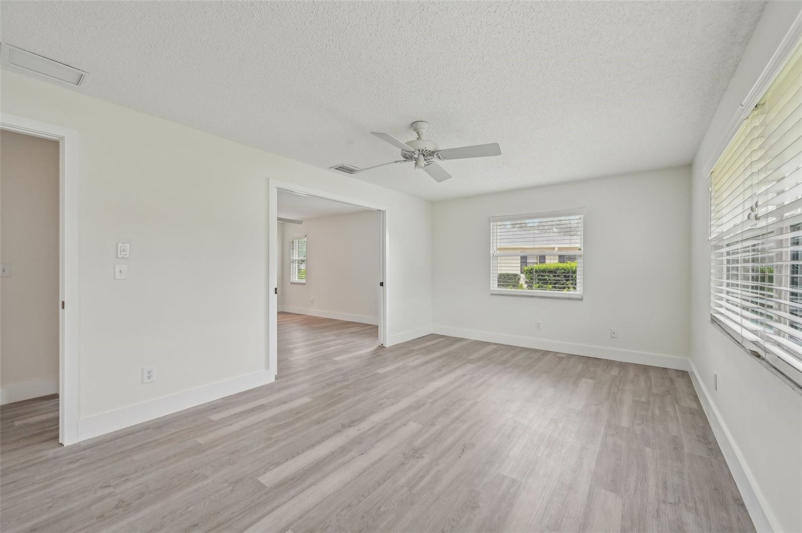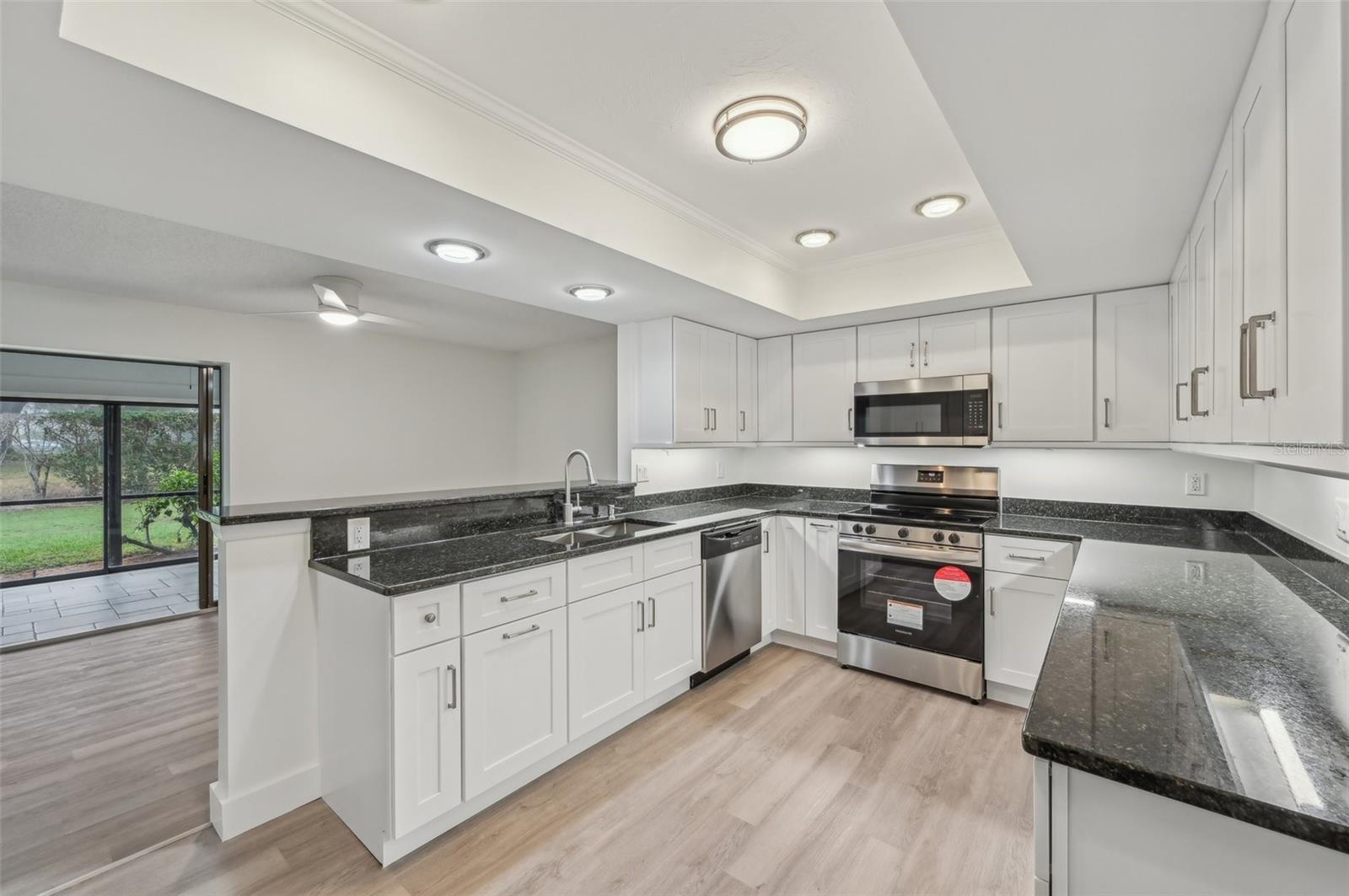 Welcome to 7157 Fairway Bend Circle, a beautifully renovated 2-bedroom, 2-bath villa with a versatile den, situated on a peaceful cul-de-sac in the highly desirable Palm Aire community. This stunning 2,056-square-foot home was thoughtfully updated in 2024 with fresh interior and exterior paint, new lighting, and luxury vinyl plank flooring throughout. The living room is impressively large, offering ample space for both relaxation and entertaining. The completely remodeled kitchen features Frigidaire appliances, soft-close cabinetry, granite countertops, and stylish lighting, making it both functional and elegant. The thoughtfully designed layout provides privacy and comfort, with the guest bedroom and bath located at the front of the home, while the primary suite is tucked away in the back. The primary suite boasts a walk-in closet, two additional closets, a walk-in shower, and a single-sink vanity, complemented by functional pocket doors. Sliding doors from the primary bedroom lead to a cozy den, which connects to the enclosed, air-conditioned lanai with elegant porcelain tile flooring—perfect for year-round relaxation or entertaining. Practical upgrades include a 2022 roof, a 2025 HVAC system, an epoxy-coated garage floor (2025), and a 2016 water heater. Palm Aire offers residents access to a heated community pool, clubhouse, and shuffleboard courts, with optional golf memberships available. Conveniently located near Sarasota’s top attractions, including the airport, University Town Center, downtown, and the beautiful Gulf beaches, this villa combines modern living with an unbeatable location. Don’t miss the chance to make this beautiful property your new home. One or more photos have been virtually staged.