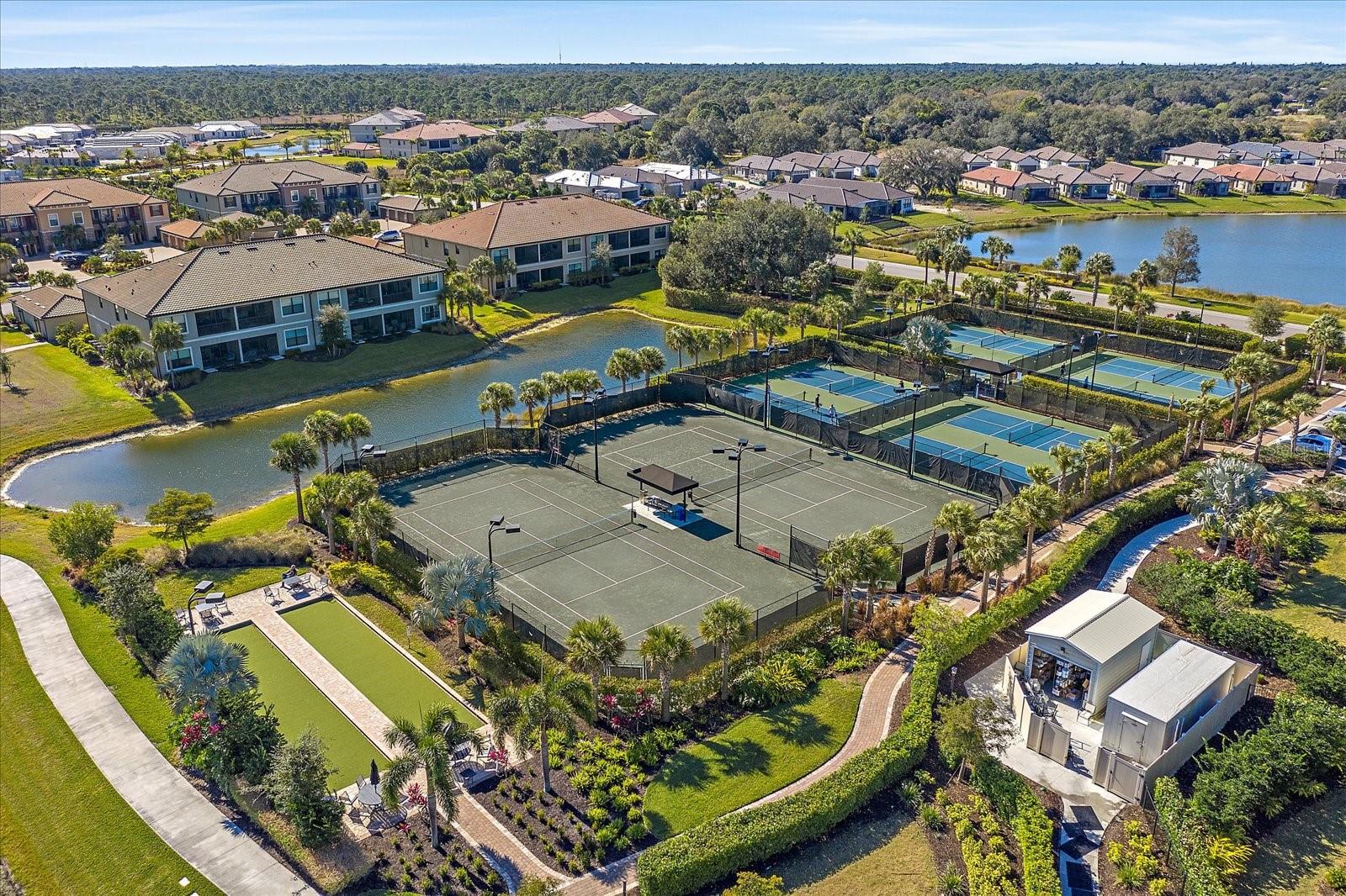 Welcome home to The Esplanade on Palmer Ranch! Resort Style living in one of Sarasota's award winning luxury communities. The best location in Palmer Ranch, with stunning lake views from all the extra side wall windows as well as from the balcony. This is the corner unit on a cul-de-sac custom designed by Taylor Morrison and offers an exceptional floor plan for living and entertaining. The kitchen is a chef's dream with top of the line appliances, Granite countertops and a generous island with seating that opens to the living room. This 2nd floor unit with vaulted ceiling creates an open inviting atmosphere. The spacious floor plan flows easily through the living room to access your private enclosed balcony, where you can capture picturesque lake views. The primary bedroom is a true retreat with large windows, designer walk in closet space, and plenty of natural light. The Ensuite features a large walk-in shower with a glass door and granite countertops adorning the custom double vanity. The second bedroom has ample closet space and large windows. The split bedroom floor plan provides plenty of privacy for daily life. This unit has a large laundry room with cabinets for storage and includes a washer and dryer. This is one of the most desirable corner units in the entire community with extra windows to an un-obstructed lake/nature view to the side of the unit also enhancing and adding natural light inside. This unit comes with 1 assigned garage parking space and surface parking spaces. The Esplanade on Palmer Ranch is like a private resort in your own backyard. It is a gated community with an elegant amenity center has lounge areas, a catering kitchen, wellness services, and a fabulous fitness center that are all included. Outdoor recreational facilities feature an incredible resort-style pool and spa, also with a wade resistance exercise pool. There's even an enclosed area with a splash pad and playground! The Bahama Bar is our very own pool side restaurant with an ever updating food menu and a full bar. Miles of breathtakingly beautiful nature trails connect to The Legacy Trail via private gate. The community features pickleball, tennis courts, bocce ball and hosts tournaments, clubs, dinners, holiday concerts and events and activities year round! This is one of the most sought out units in the neighborhood! A rare opportunity to enjoy resort style living with amazing luxury amenities in a gated community just minutes to some of the best beaches in the World including Siesta Key!