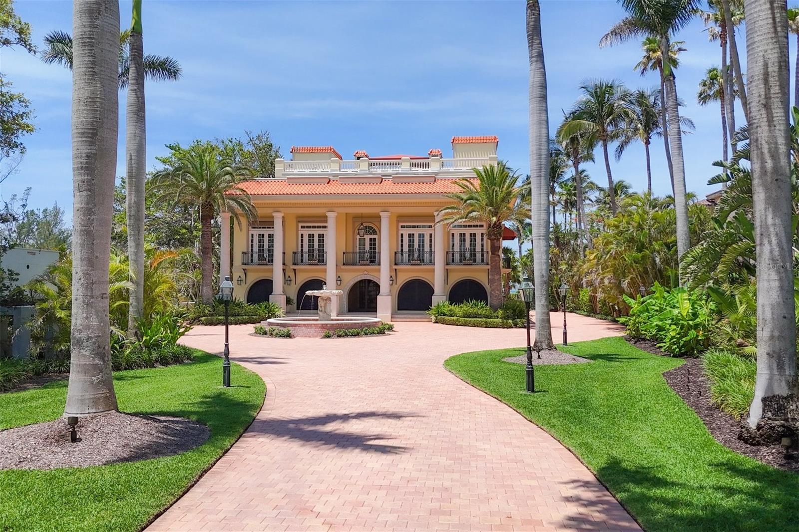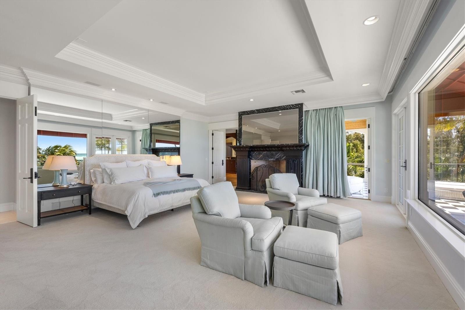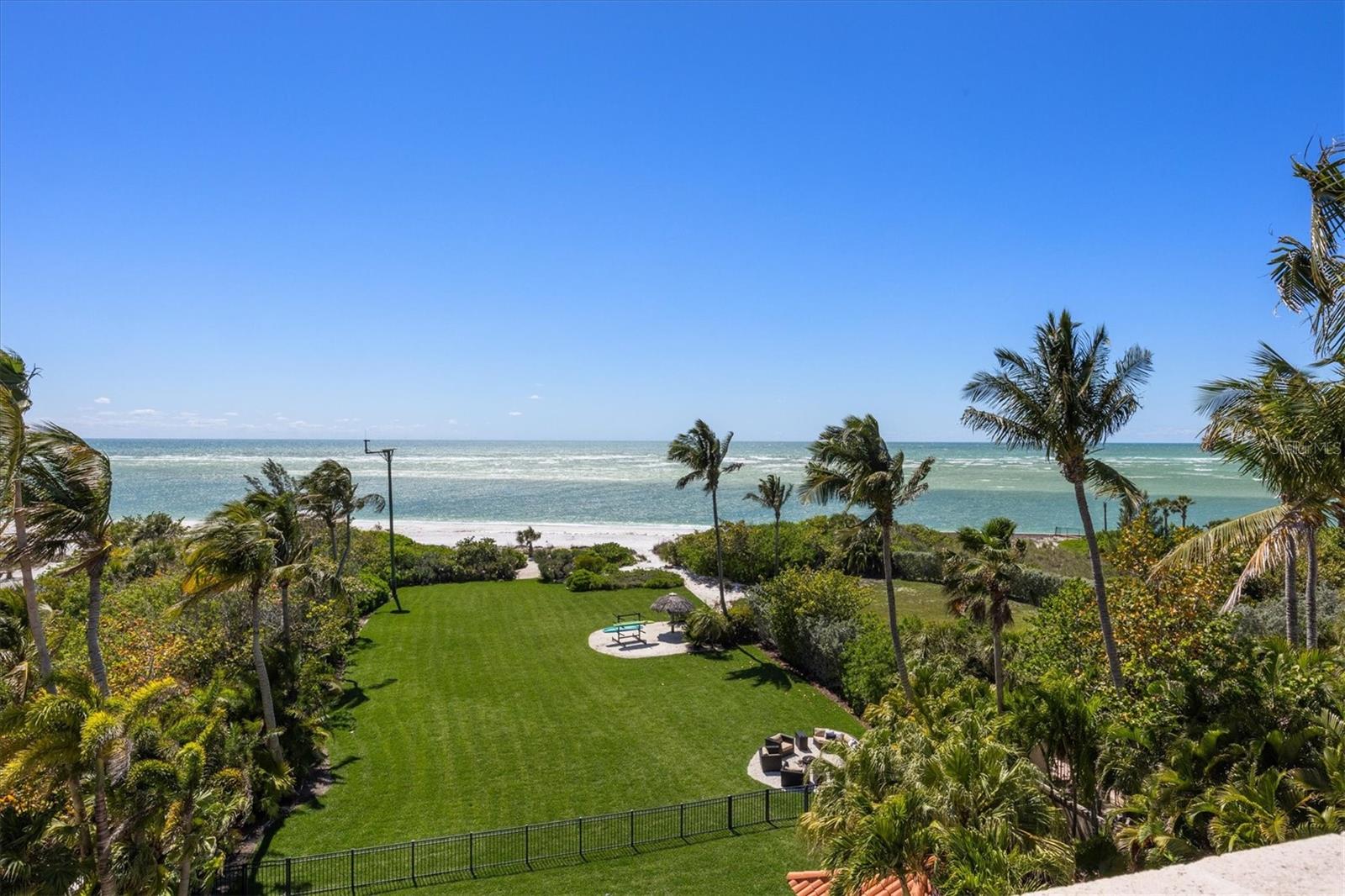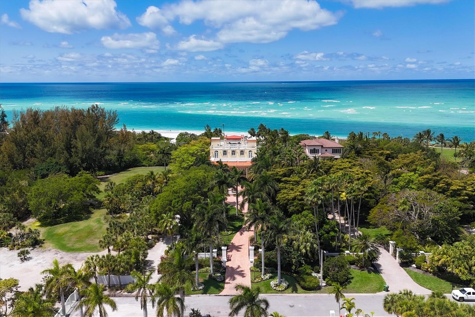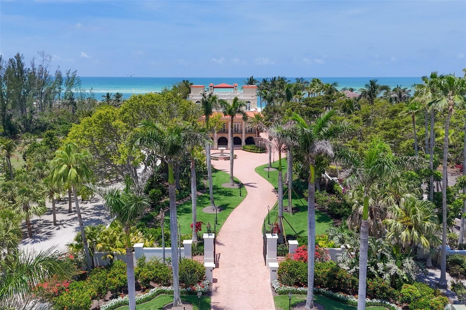 Along the iconic shores of Lido Key Beach, 1067 Westway Drive stands as a beacon of comfortable and sophisticated coastal living. Every detail has been meticulously curated to create an exceptional lifestyle situated on an extraordinary property in an extraordinary home. As you step into the sun-soaked atrium foyer, you are immediately greeted by the grand staircase made of travertine and adorned with custom railings. This entrance sets the casual tone for the rest of the home, where every room is a masterpiece of design and craftsmanship. The great room is a wonderful space, with its soaring ceilings, intricate moldings and stone fireplace. Floor-to-ceiling windows and doors offer panoramic views of the Gulf of Mexico, access to an enormous terrace and endless sunsets. This space is seamlessly connected to the bar and lounge, equipped with a glass-enclosed wine room with space for 500-plus bottles, creating a space that is ready to host friends and family. Adjacent to the lounge is a sunroom with glass walls that fill the room with natural light, creating a serene space to relax and unwind. The gourmet kitchen is a dream, boasting an enormous center island with seating and storage, granite counters, two sinks, two dishwashers, a Wolf® induction cooktop and a Dacor® range with six burners. Customized pullouts in the cabinetry and custom designed pantries ensure everything is organized. There is also an informal dining area enveloped in large banks of windows and doors providing access to the terrace and framing the best views. The adjacent dining room is the perfect setting for intimate dinners or lavish gatherings, with plenty of seating and a custom tray ceiling. Outside, the grounds are an oasis, with lush Florida landscaping, multiple covered and uncovered seating areas, a custom infinity-edge pool with intricate tile design, and multiple roof decks. One of the highlights of this home’s outdoor entertaining spaces is the rooftop deck, ready for hosting events with the well-equipped kitchenette and bath, and plenty of space for dining, dancing and enjoying the sunset over the Gulf of Mexico or the sunrise over Sarasota Bay and downtown Sarasota. The primary bedroom suite is a sanctuary of luxury and comfort, with its own private terrace overlooking the sparkling waters of the Gulf of Mexico, an adjacent exercise room and access to a front terrace. The resort-like en-suite bath is a work of art, with its dual vanities, oversized soaking tub with marble surround and enormous windows, and an indoor-outdoor marble walk-in shower. The custom organized closet offers a central storage island, abundant space for clothing, shoes and accessories, and its own private laundry room. The guest suites are retreats, each with their own en-suite bath, custom-organized spacious closet, plantation shutters, and high ceilings with crown molding. Some offer terraces with lush views of the property and beyond. Additional features include a movie theatre, a fitness room, access to the second rooftop deck, a stunning office with custom built-in storage and an additional family room, game room and bunk room. With its unrivaled location, exquisite design and unparalleled amenities, 1067 Westway Drive is more than just a home, it is the ultimate in beachfront living.