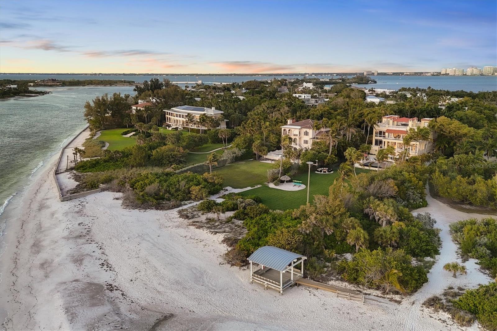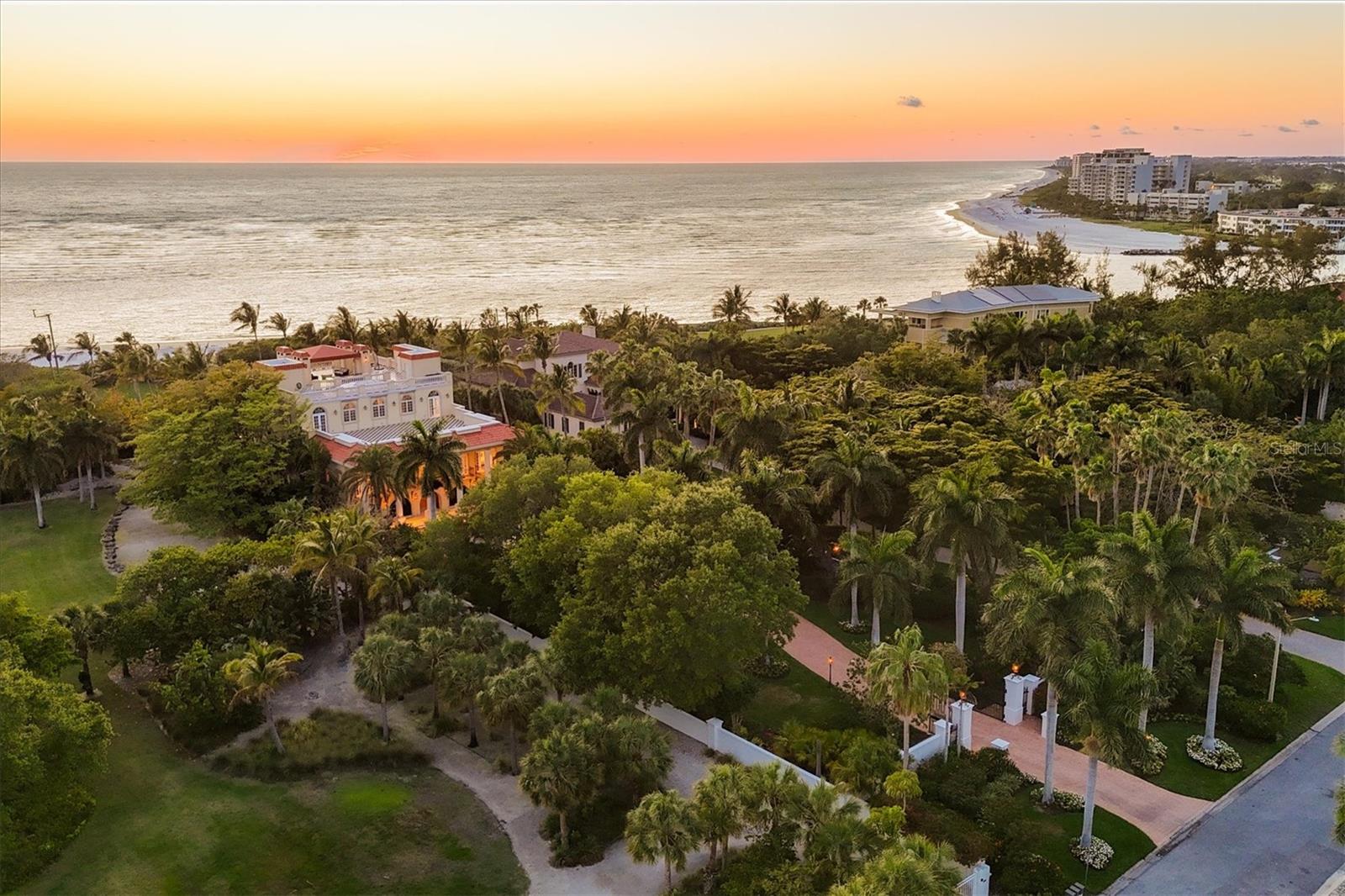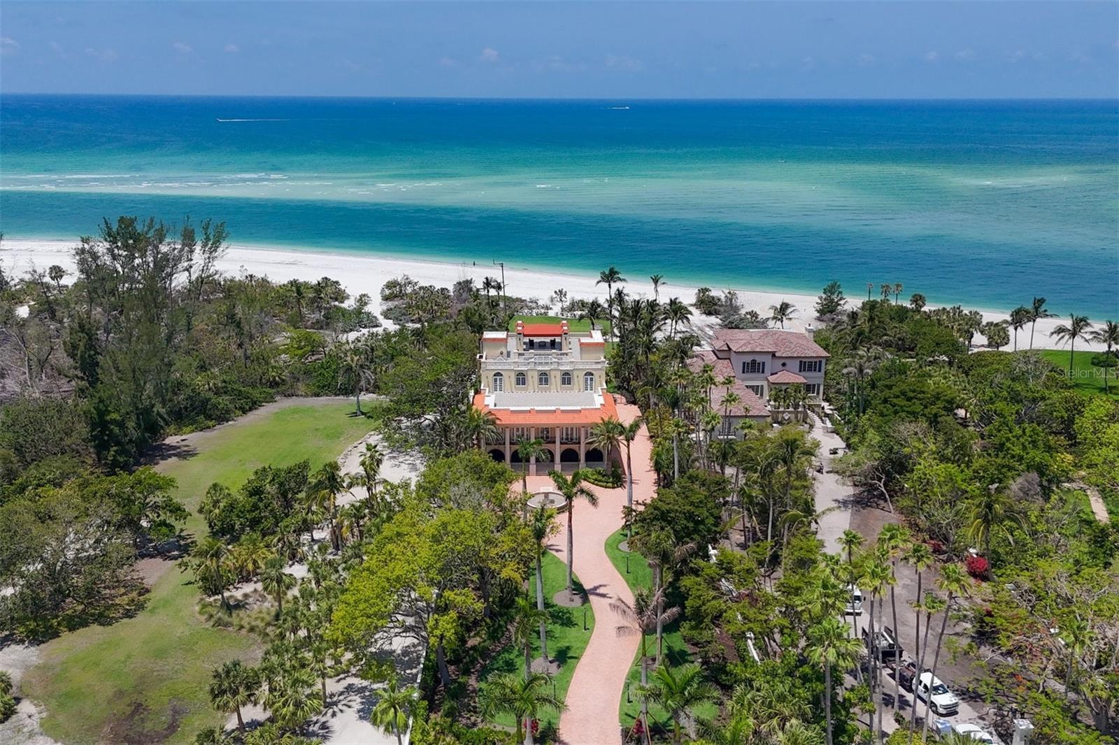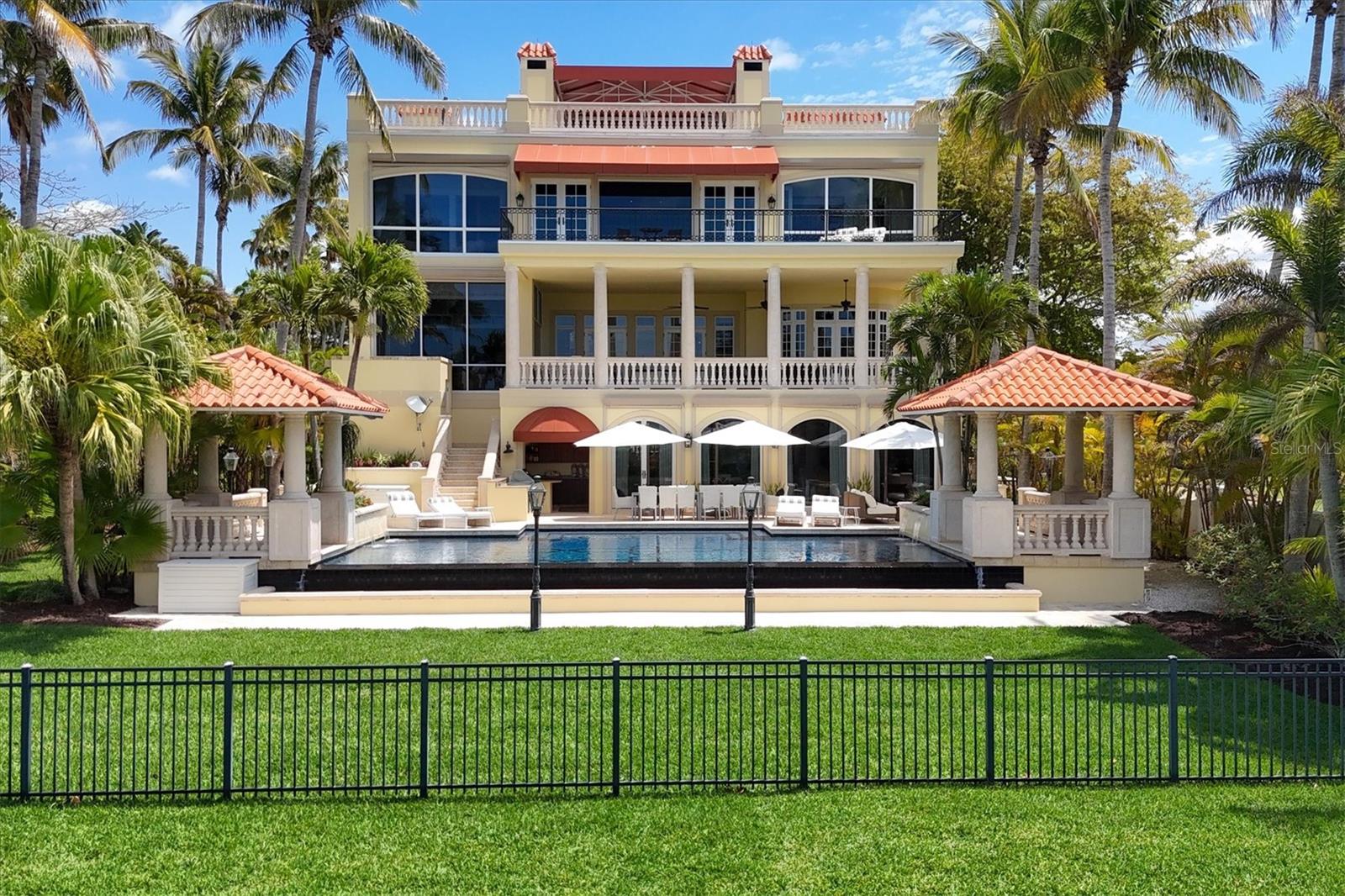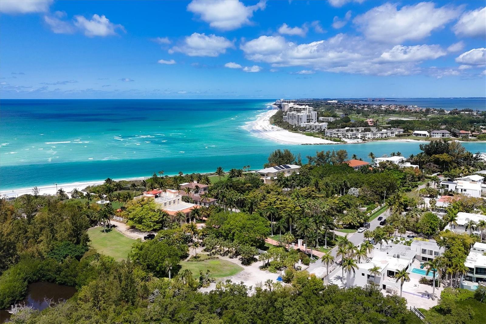 Along the iconic shores of Lido Key Beach, 1067 Westway Drive stands as a beacon of comfortable and sophisticated coastal living. Every detail has been meticulously curated to create an exceptional lifestyle situated on an extraordinary property in an extraordinary home. As you step into the sun-soaked atrium foyer, you are immediately greeted by the grand staircase made of travertine and adorned with custom railings. This entrance sets the casual tone for the rest of the home, where every room is a masterpiece of design and craftsmanship. The great room is a wonderful space, with its soaring ceilings, intricate moldings and stone fireplace. Floor-to-ceiling windows and doors offer panoramic views of the Gulf of Mexico, access to an enormous terrace and endless sunsets. This space is seamlessly connected to the bar and lounge, equipped with a glass-enclosed wine room with space for 500-plus bottles, creating a space that is ready to host friends and family. Adjacent to the lounge is a sunroom with glass walls that fill the room with natural light, creating a serene space to relax and unwind. The gourmet kitchen is a dream, boasting an enormous center island with seating and storage, granite counters, two sinks, two dishwashers, a Wolf® induction cooktop and a Dacor® range with six burners. Customized pullouts in the cabinetry and custom designed pantries ensure everything is organized. There is also an informal dining area enveloped in large banks of windows and doors providing access to the terrace and framing the best views. The adjacent dining room is the perfect setting for intimate dinners or lavish gatherings, with plenty of seating and a custom tray ceiling. Outside, the grounds are an oasis, with lush Florida landscaping, multiple covered and uncovered seating areas, a custom infinity-edge pool with intricate tile design, and multiple roof decks. One of the highlights of this home’s outdoor entertaining spaces is the rooftop deck, ready for hosting events with the well-equipped kitchenette and bath, and plenty of space for dining, dancing and enjoying the sunset over the Gulf of Mexico or the sunrise over Sarasota Bay and downtown Sarasota. The primary bedroom suite is a sanctuary of luxury and comfort, with its own private terrace overlooking the sparkling waters of the Gulf of Mexico, an adjacent exercise room and access to a front terrace. The resort-like en-suite bath is a work of art, with its dual vanities, oversized soaking tub with marble surround and enormous windows, and an indoor-outdoor marble walk-in shower. The custom organized closet offers a central storage island, abundant space for clothing, shoes and accessories, and its own private laundry room. The guest suites are retreats, each with their own en-suite bath, custom-organized spacious closet, plantation shutters, and high ceilings with crown molding. Some offer terraces with lush views of the property and beyond. Additional features include a movie theatre, a fitness room, access to the second rooftop deck, a stunning office with custom built-in storage and an additional family room, game room and bunk room. With its unrivaled location, exquisite design and unparalleled amenities, 1067 Westway Drive is more than just a home, it is the ultimate in beachfront living.