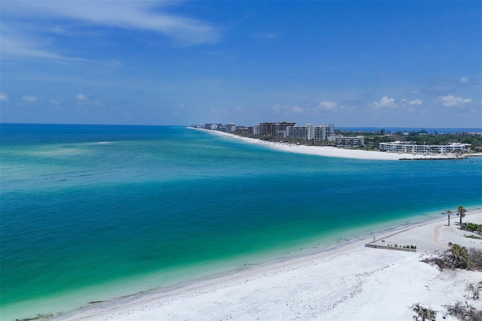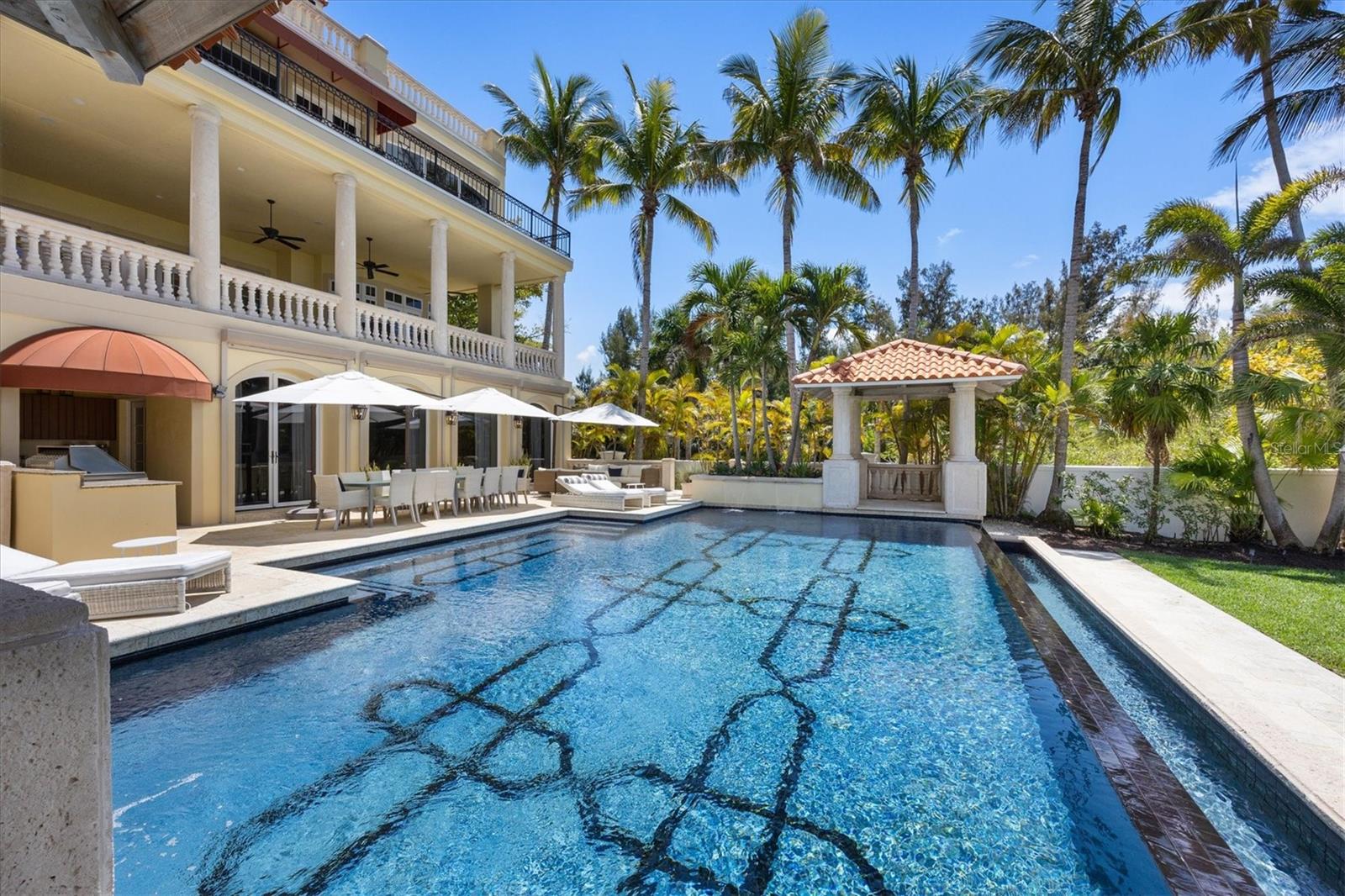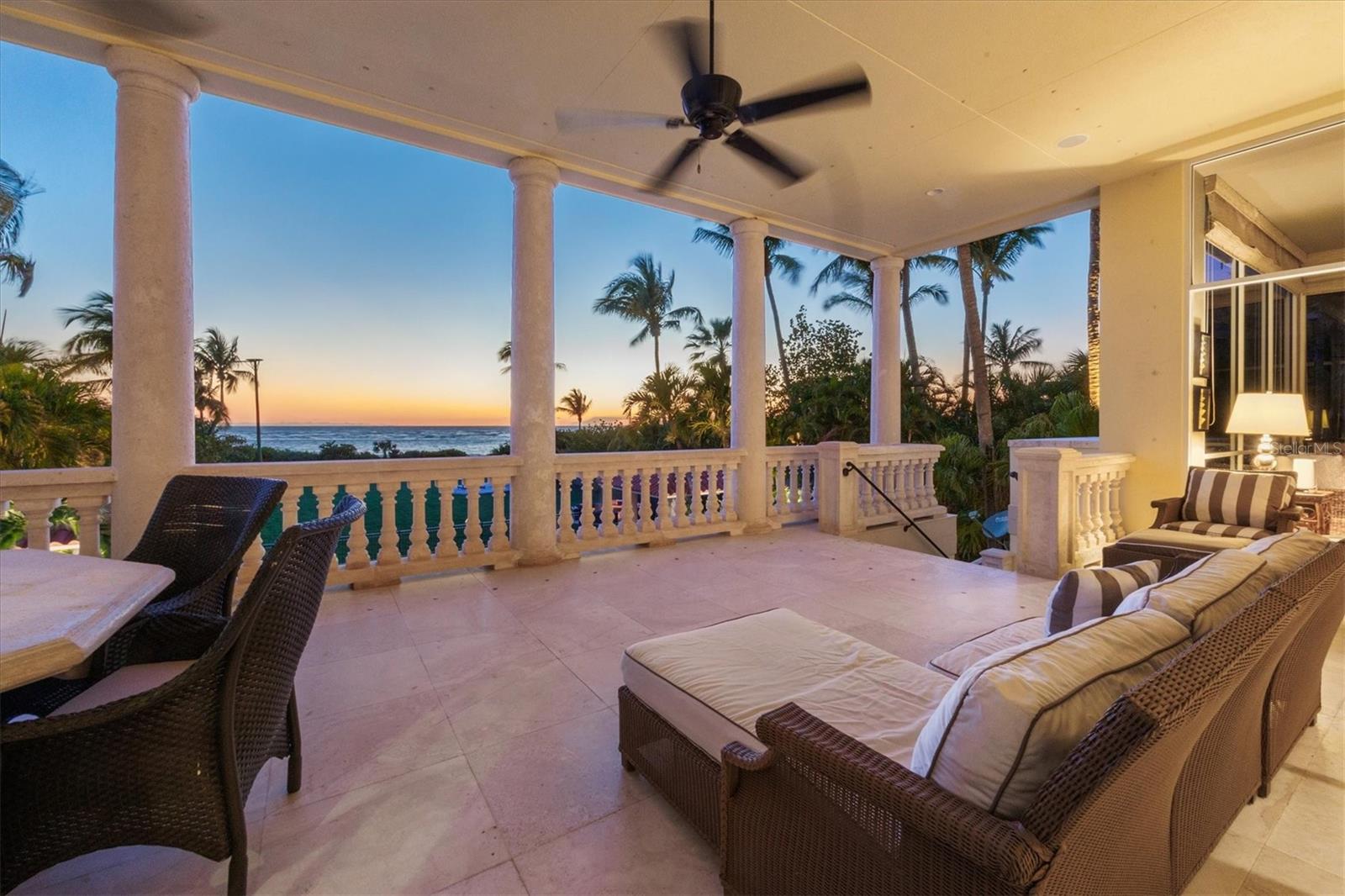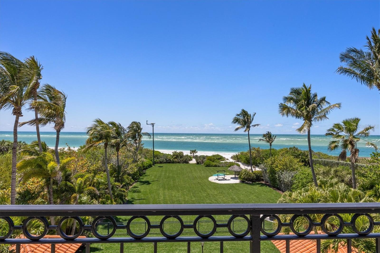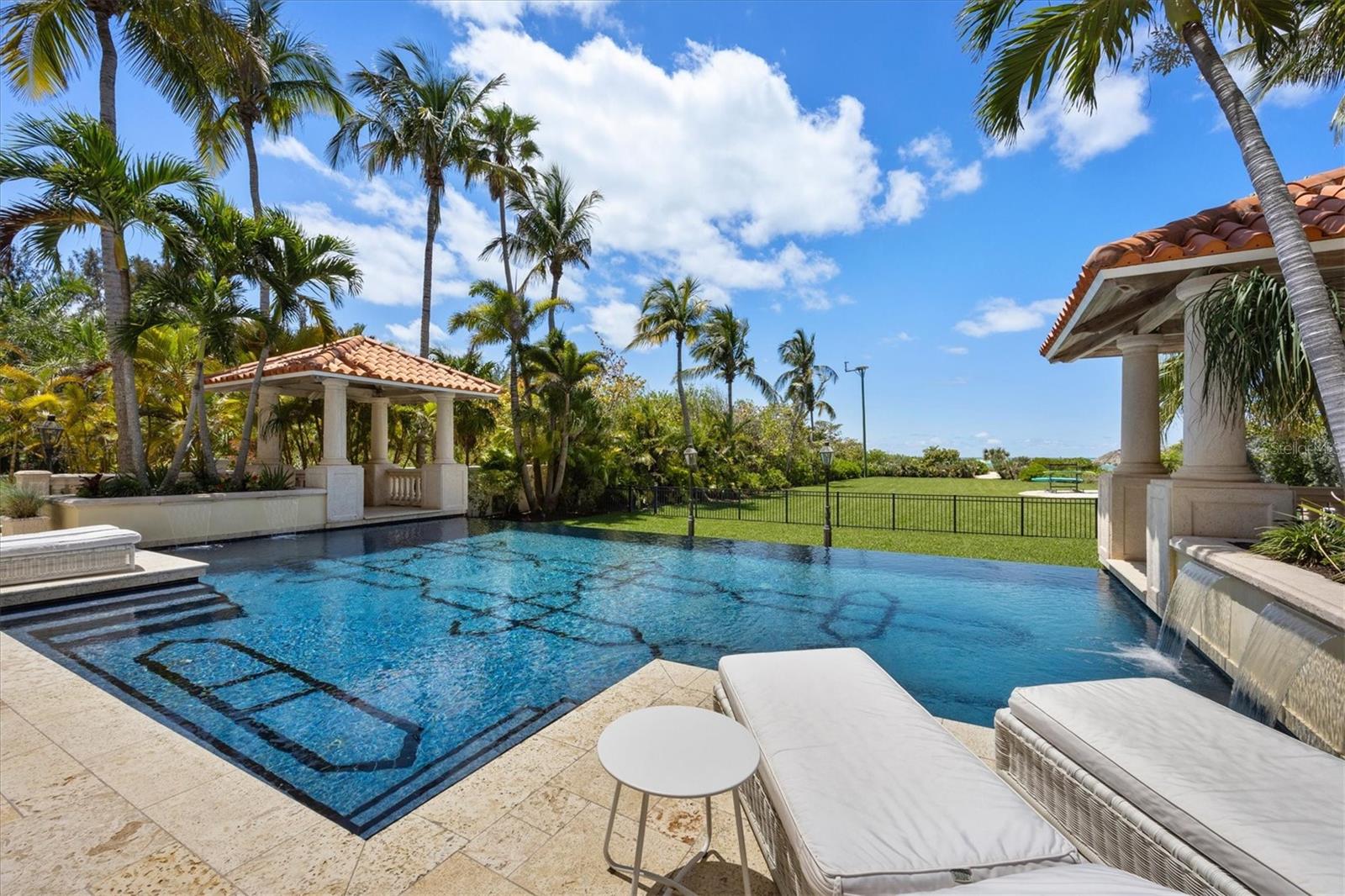 Along the iconic shores of Lido Key Beach, 1067 Westway Drive stands as a beacon of comfortable and sophisticated coastal living. Every detail has been meticulously curated to create an exceptional lifestyle situated on an extraordinary property in an extraordinary home. As you step into the sun-soaked atrium foyer, you are immediately greeted by the grand staircase made of travertine and adorned with custom railings. This entrance sets the casual tone for the rest of the home, where every room is a masterpiece of design and craftsmanship. The great room is a wonderful space, with its soaring ceilings, intricate moldings and stone fireplace. Floor-to-ceiling windows and doors offer panoramic views of the Gulf of Mexico, access to an enormous terrace and endless sunsets. This space is seamlessly connected to the bar and lounge, equipped with a glass-enclosed wine room with space for 500-plus bottles, creating a space that is ready to host friends and family. Adjacent to the lounge is a sunroom with glass walls that fill the room with natural light, creating a serene space to relax and unwind. The gourmet kitchen is a dream, boasting an enormous center island with seating and storage, granite counters, two sinks, two dishwashers, a Wolf® induction cooktop and a Dacor® range with six burners. Customized pullouts in the cabinetry and custom designed pantries ensure everything is organized. There is also an informal dining area enveloped in large banks of windows and doors providing access to the terrace and framing the best views. The adjacent dining room is the perfect setting for intimate dinners or lavish gatherings, with plenty of seating and a custom tray ceiling. Outside, the grounds are an oasis, with lush Florida landscaping, multiple covered and uncovered seating areas, a custom infinity-edge pool with intricate tile design, and multiple roof decks. One of the highlights of this home’s outdoor entertaining spaces is the rooftop deck, ready for hosting events with the well-equipped kitchenette and bath, and plenty of space for dining, dancing and enjoying the sunset over the Gulf of Mexico or the sunrise over Sarasota Bay and downtown Sarasota. The primary bedroom suite is a sanctuary of luxury and comfort, with its own private terrace overlooking the sparkling waters of the Gulf of Mexico, an adjacent exercise room and access to a front terrace. The resort-like en-suite bath is a work of art, with its dual vanities, oversized soaking tub with marble surround and enormous windows, and an indoor-outdoor marble walk-in shower. The custom organized closet offers a central storage island, abundant space for clothing, shoes and accessories, and its own private laundry room. The guest suites are retreats, each with their own en-suite bath, custom-organized spacious closet, plantation shutters, and high ceilings with crown molding. Some offer terraces with lush views of the property and beyond. Additional features include a movie theatre, a fitness room, access to the second rooftop deck, a stunning office with custom built-in storage and an additional family room, game room and bunk room. With its unrivaled location, exquisite design and unparalleled amenities, 1067 Westway Drive is more than just a home, it is the ultimate in beachfront living.