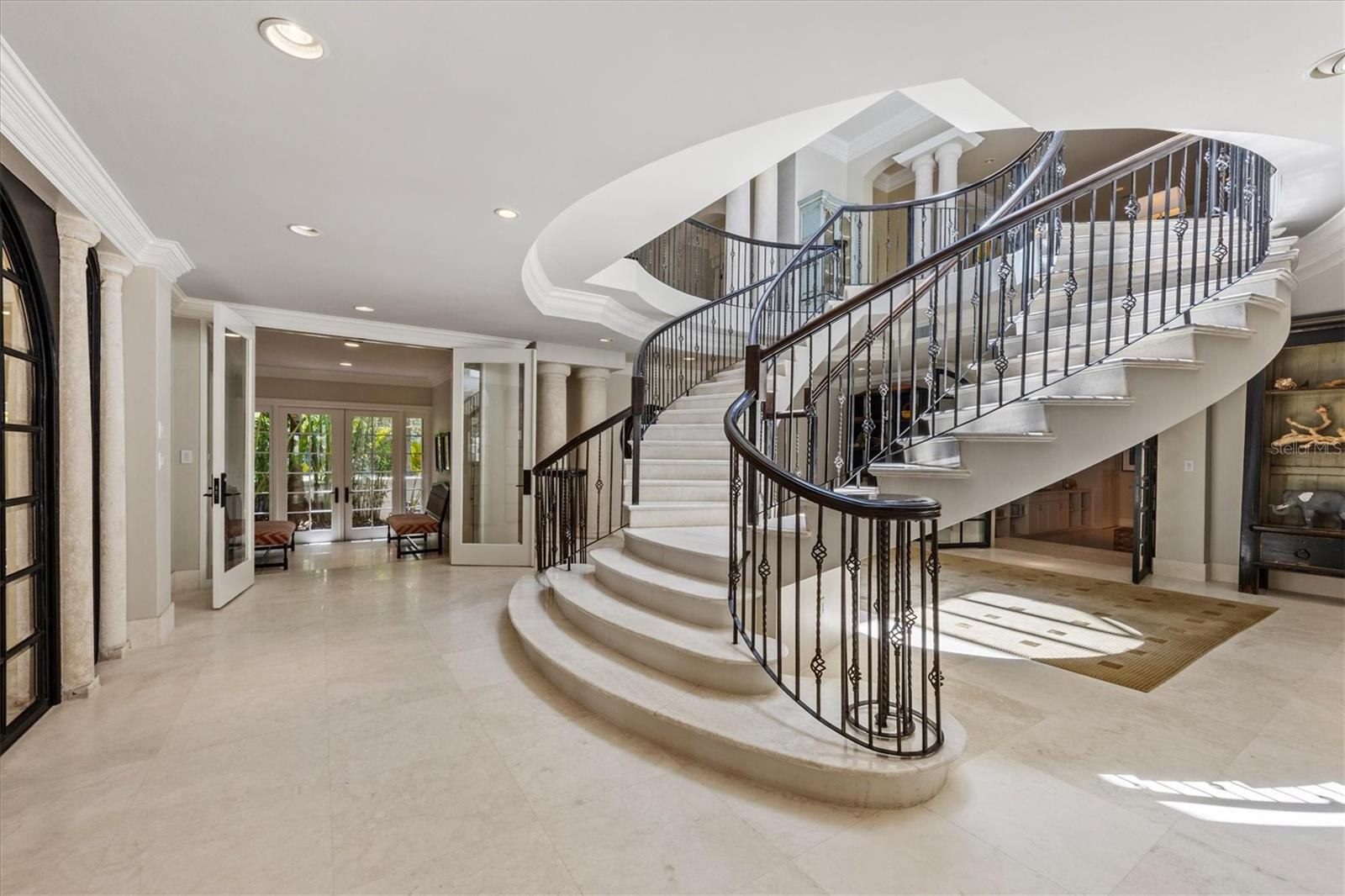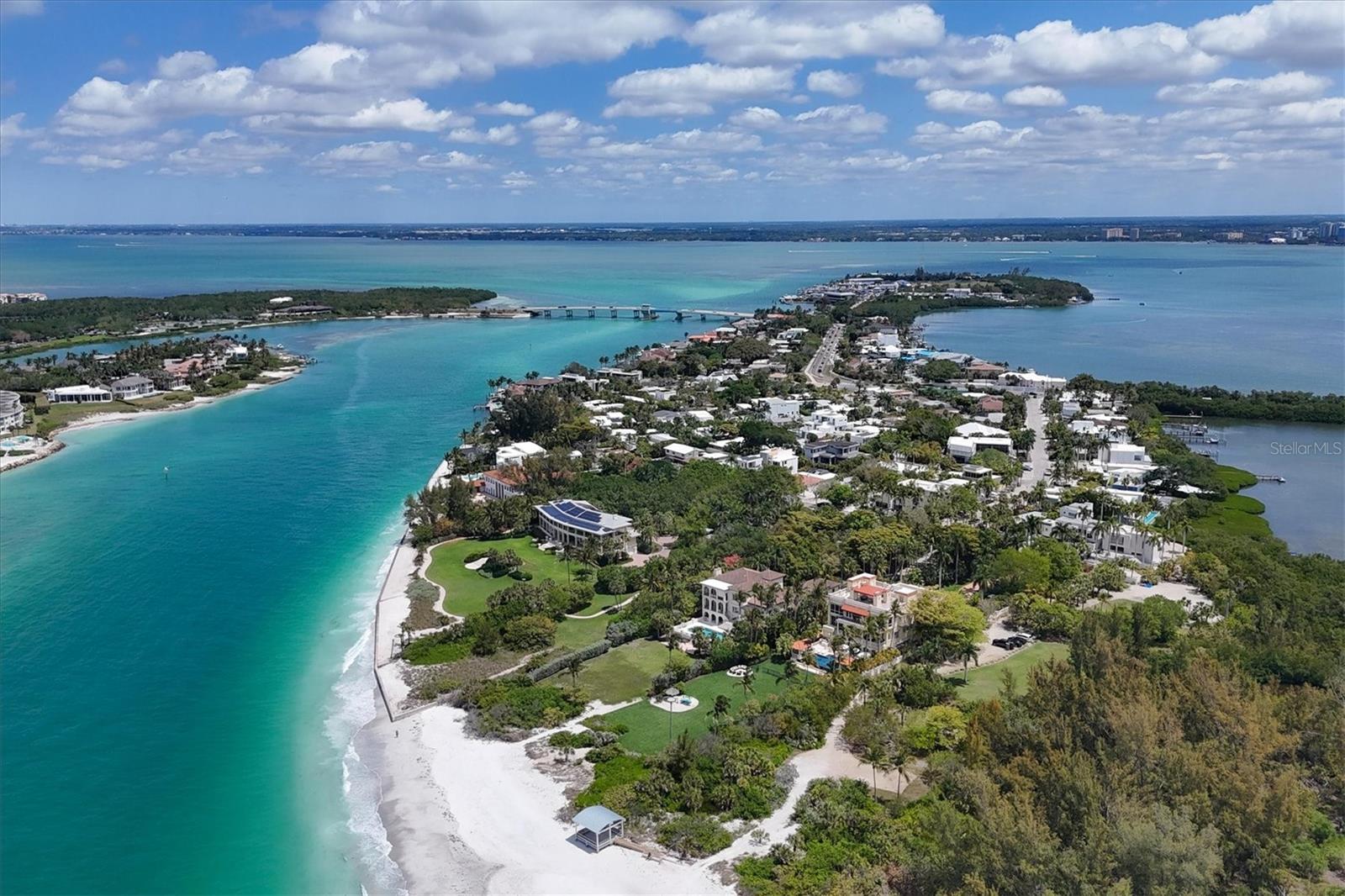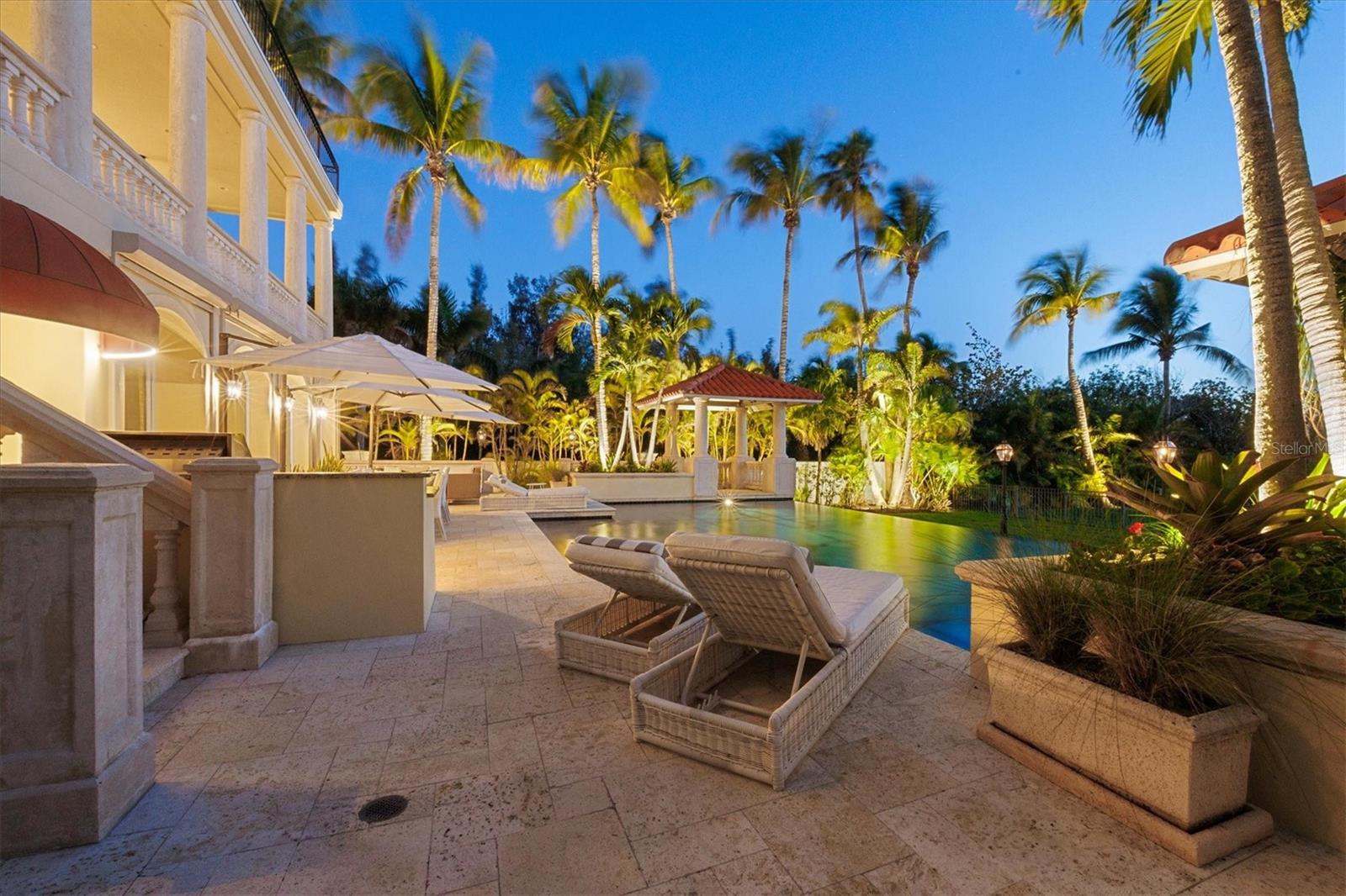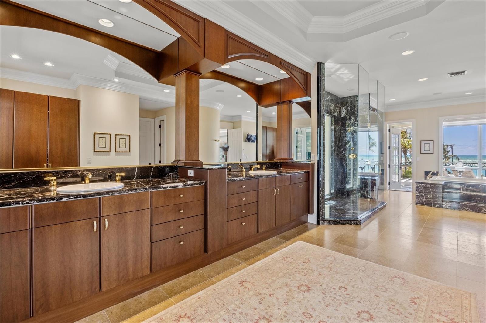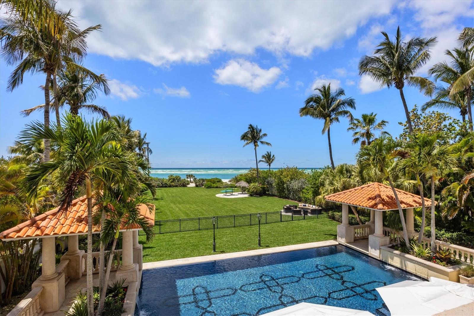 Along the iconic shores of Lido Key Beach, 1067 Westway Drive stands as a beacon of comfortable and sophisticated coastal living. Every detail has been meticulously curated to create an exceptional lifestyle situated on an extraordinary property in an extraordinary home. As you step into the sun-soaked atrium foyer, you are immediately greeted by the grand staircase made of travertine and adorned with custom railings. This entrance sets the casual tone for the rest of the home, where every room is a masterpiece of design and craftsmanship. The great room is a wonderful space, with its soaring ceilings, intricate moldings and stone fireplace. Floor-to-ceiling windows and doors offer panoramic views of the Gulf of Mexico, access to an enormous terrace and endless sunsets. This space is seamlessly connected to the bar and lounge, equipped with a glass-enclosed wine room with space for 500-plus bottles, creating a space that is ready to host friends and family. Adjacent to the lounge is a sunroom with glass walls that fill the room with natural light, creating a serene space to relax and unwind. The gourmet kitchen is a dream, boasting an enormous center island with seating and storage, granite counters, two sinks, two dishwashers, a Wolf® induction cooktop and a Dacor® range with six burners. Customized pullouts in the cabinetry and custom designed pantries ensure everything is organized. There is also an informal dining area enveloped in large banks of windows and doors providing access to the terrace and framing the best views. The adjacent dining room is the perfect setting for intimate dinners or lavish gatherings, with plenty of seating and a custom tray ceiling. Outside, the grounds are an oasis, with lush Florida landscaping, multiple covered and uncovered seating areas, a custom infinity-edge pool with intricate tile design, and multiple roof decks. One of the highlights of this home’s outdoor entertaining spaces is the rooftop deck, ready for hosting events with the well-equipped kitchenette and bath, and plenty of space for dining, dancing and enjoying the sunset over the Gulf of Mexico or the sunrise over Sarasota Bay and downtown Sarasota. The primary bedroom suite is a sanctuary of luxury and comfort, with its own private terrace overlooking the sparkling waters of the Gulf of Mexico, an adjacent exercise room and access to a front terrace. The resort-like en-suite bath is a work of art, with its dual vanities, oversized soaking tub with marble surround and enormous windows, and an indoor-outdoor marble walk-in shower. The custom organized closet offers a central storage island, abundant space for clothing, shoes and accessories, and its own private laundry room. The guest suites are retreats, each with their own en-suite bath, custom-organized spacious closet, plantation shutters, and high ceilings with crown molding. Some offer terraces with lush views of the property and beyond. Additional features include a movie theatre, a fitness room, access to the second rooftop deck, a stunning office with custom built-in storage and an additional family room, game room and bunk room. With its unrivaled location, exquisite design and unparalleled amenities, 1067 Westway Drive is more than just a home, it is the ultimate in beachfront living.