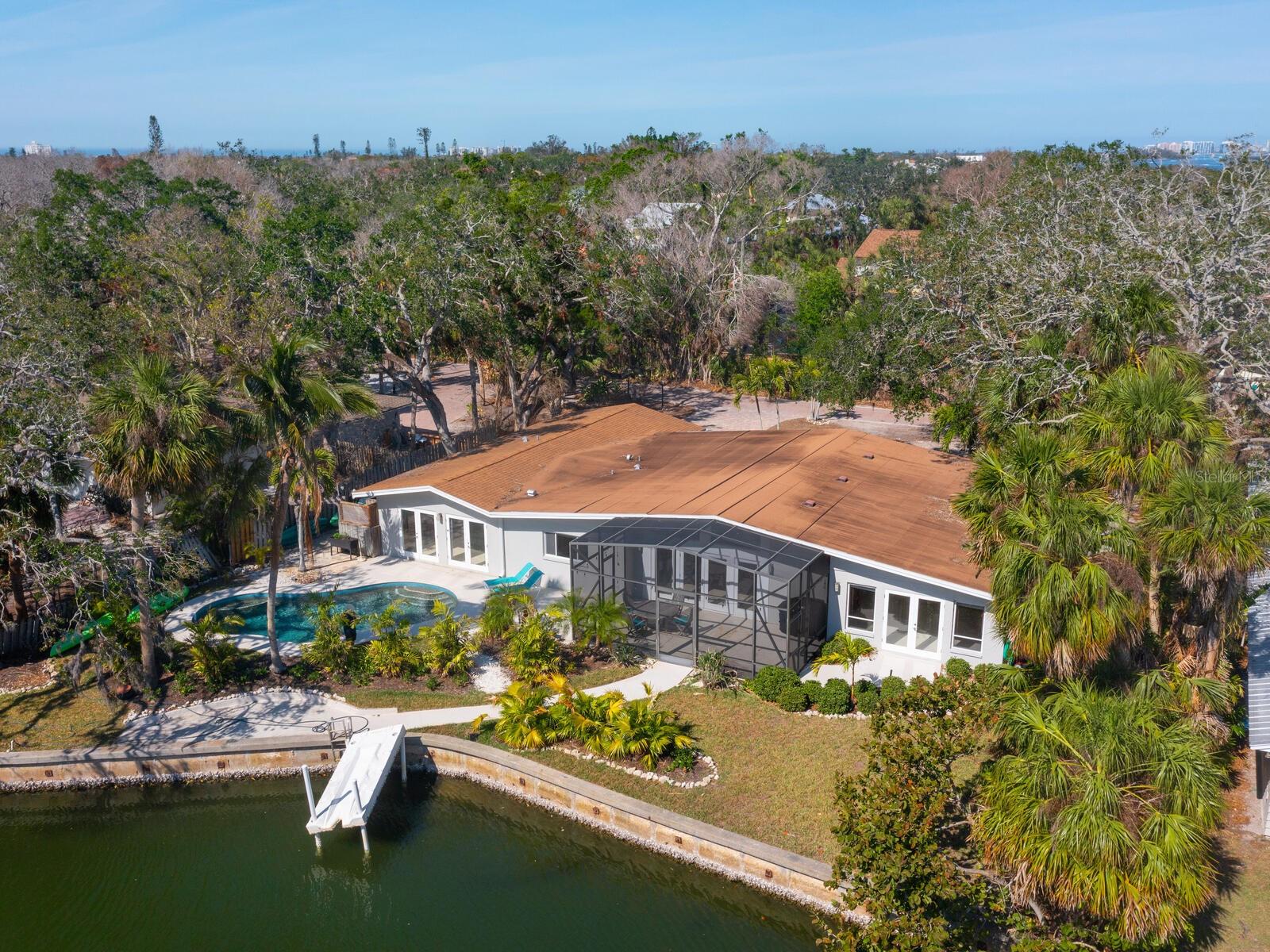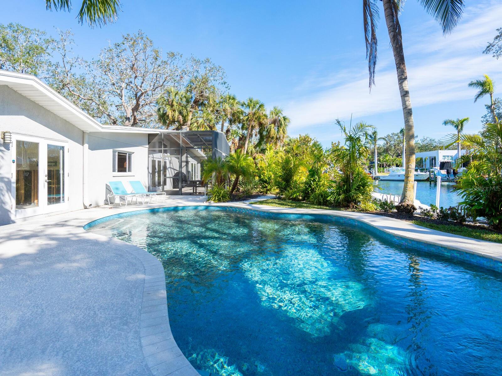 New Price! A rarely available property in Royal Palm Harbor, Siesta Key. Discover the ultimate island lifestyle just half a mile from the world-renowned, powdery white sands of Siesta Beach and the Gulf of Mexico. In a private, lush, tree-canopied community, this spacious three-bedroom, 3.5-bath, two-car garage home sits on a deep sailboat water bayou, just five lots from Sarasota Bay and the Intracoastal Waterway, offering direct gulf access with no fixed bridges. The nearly 18,000-square-foot lot provides endless possibilities to renovate or build your dream waterfront retreat. The home has been professionally remediated and features a sprawling layout that opens to breathtaking water views. French doors lead to a sparkling freeform pool, while the screened patio is surrounded by lush, tropical landscaping, the ideal setting to enjoy Florida’s stunning wildlife and serene sunsets. Boaters will love the 111 feet of seawall, offering plenty of space to dock a powerboat or sailboat. Whether you choose to launch a kayak, paddleboard or cast a fishing line from your backyard, this location is ideal for water enthusiasts. Ideally minutes from Siesta Village, you'll enjoy charming restaurants, boutique shopping and vibrant nightlife. Plus, downtown Sarasota’s arts and entertainment scene is just a short 15-minute drive away. This is a rare waterfront opportunity to create your ideal island getaway. Schedule your private tour today!