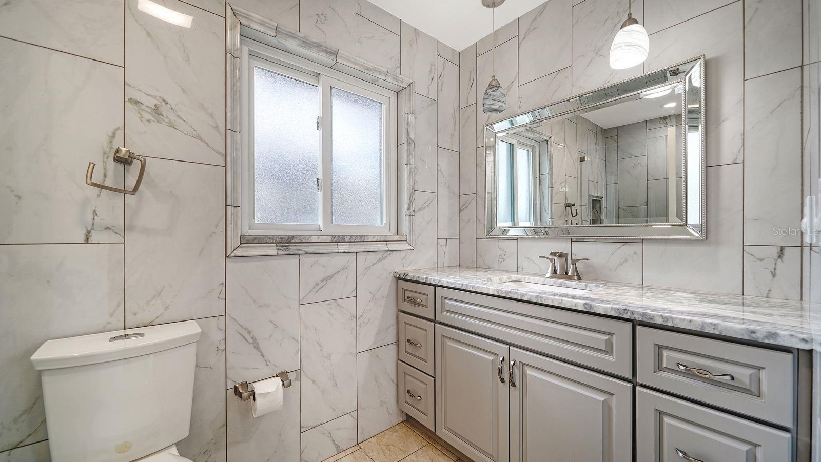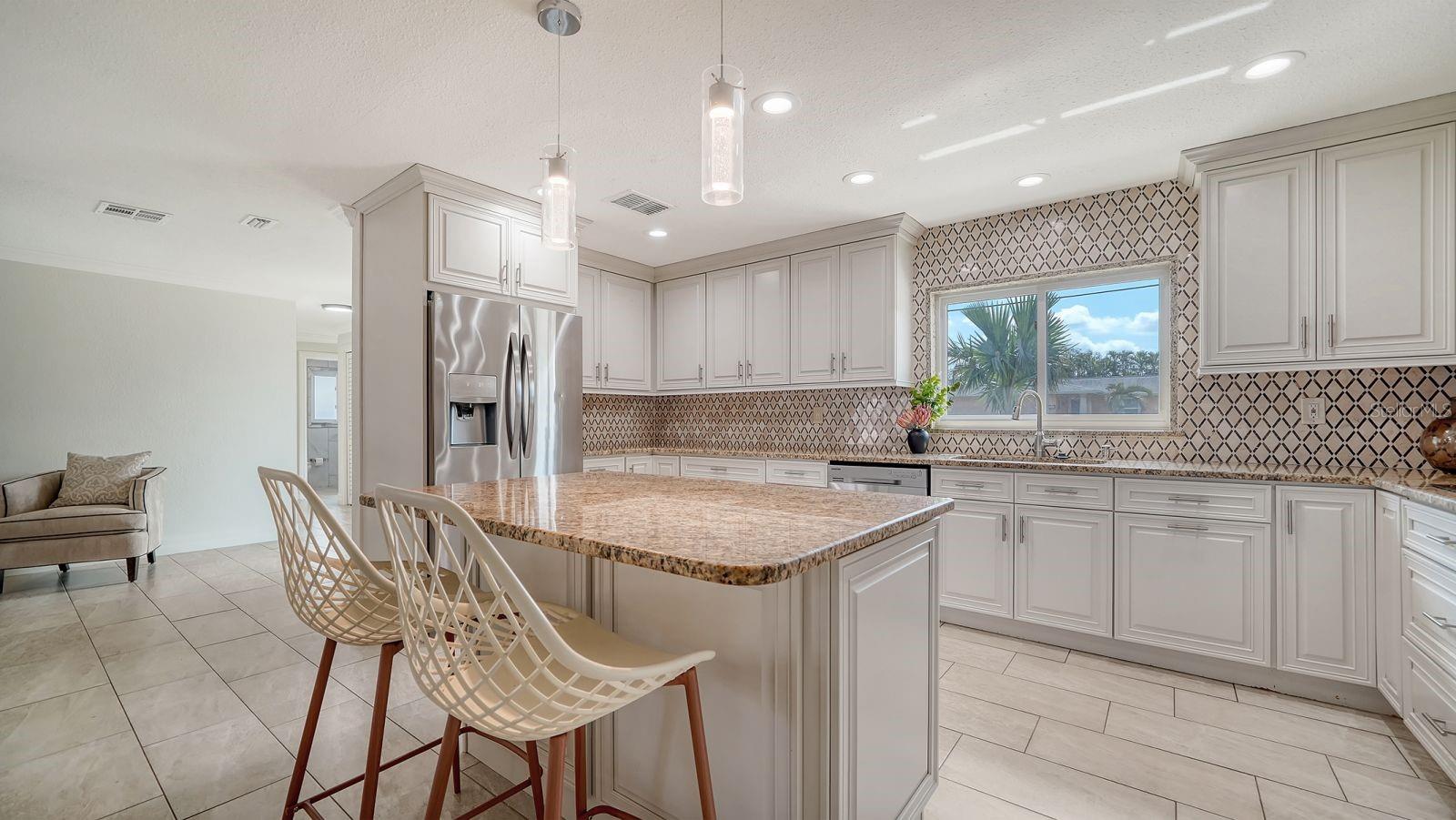 This rejuvenated residence sits on a ¼-acre in the heart of Southgate, a treasured community sought-after by families for its top-ranked school system. Young professionals appreciate the ideal proximity to downtown Sarasota’s arts and cultural venues, prized beaches, tons of recreational activities, and a wide variety of shopping and dining experiences. With 1,608 square feet of openness, this recently refreshed and upgraded home features 3 bedrooms and 3 baths. Casually comfortable interiors offer a pleasing neutral palette of beiges and creams that surround you in a quiet softness for easy Florida living. Natural light permeates this efficiently designed one-level home illuminating its modern conveniences and visual appeal. Adjacent to the living and dining area, the well-planned kitchen is highlighted by granite-topped island, hardwood cabinets, amazing backsplash, smooth surface cooktop, and stainless appliances including a side-by-side fridge, a built-in microwave and oven, a dishwasher, double sink and range hood. The baths feel luxurious with fully tiled walls matching the floors, vanities with granite countertops, and rich wood cabinetry. The three nicely-sized bedrooms are equipped with private baths and walk-in closets. Glass sliders open to a covered screen-enclosed porch that’s cozy and relaxing with a modern fire table adding a sparkle to cooler star-lit evenings. The fenced yard provides a large work shed, play area with swing set for the kiddos, ample area for barbecues with family and friends, or leisurely spot to kick back and enjoy life’s simpler moments. Everything throughout the home is new including ceiling fans, fixtures and finishes, solar panels for energy efficiency, high-volume water heater (2021), kitchen appliances (2019), and roof, A/C, windows and tile flooring (2018). The newly-created ambiance of warmth and style has been done to perfection and will welcome you home with graciousness. Take the time to explore the many amenities at 3085 Goldenrod. Homes in this vicinity are in high demand and often sell quickly. Don’t miss this opportunity to make it yours. It might very well become your ideal place for years to come!