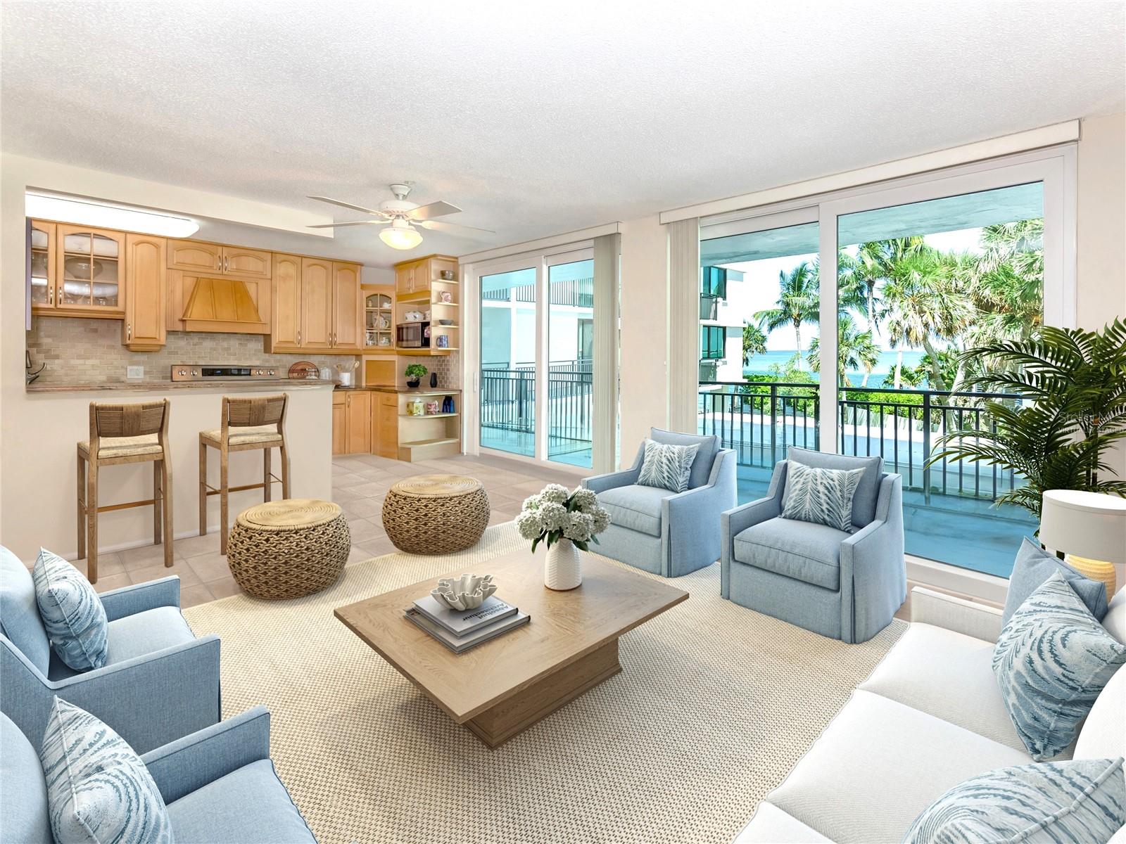 One or more photo(s) has been virtually staged. ONLY UNIT WITH DIRECT GULF VIEWS UNDER $600K. MOTIVATED SELLER! MAKE AN OFFER! (NEW A/C unit installed June, 2025). Exceptional value for a Gulf-front condo on Siesta Key! If you’re looking for a deal... this is the one! 2-bedroom, 2-bathroom condo nestled along the Gulf and Intracoastal Waterway of BIG PASS this condo offers everything you need for laid-back living. Open floor plan with split bedroom layout, ideal for privacy and comfort. Hurricane-rated impact windows and sliding glass doors to ensure peace of mind and showcase views of the Gulf waters. The kitchen is complete with solid wood cabinetry, granite countertops, and stainless-steel appliances. Freshly painted interior, 2024 updated light fixtures, and ceiling fans. Tile flooring throughout, and recently tiled guest shower. Relax and unwind on your HUGE balcony where you can watch sunrises and sunsets over the water. Resort-style amenities take your experience to the next level: Heated waterfront swimming pool, fishing dock, social dock, and new gas grills in the BBQ area. Completely remodeled fitness center with new equipment, remodeled club room, bike storage room and lockers for beach gear. The building has been completely updated from the roof top down to the landscaping and everything in between. Just TWO blocks from Siesta Key Village and beaches, easy access to shopping, dining, and entertainment. 24/7 security features and resident-only access.