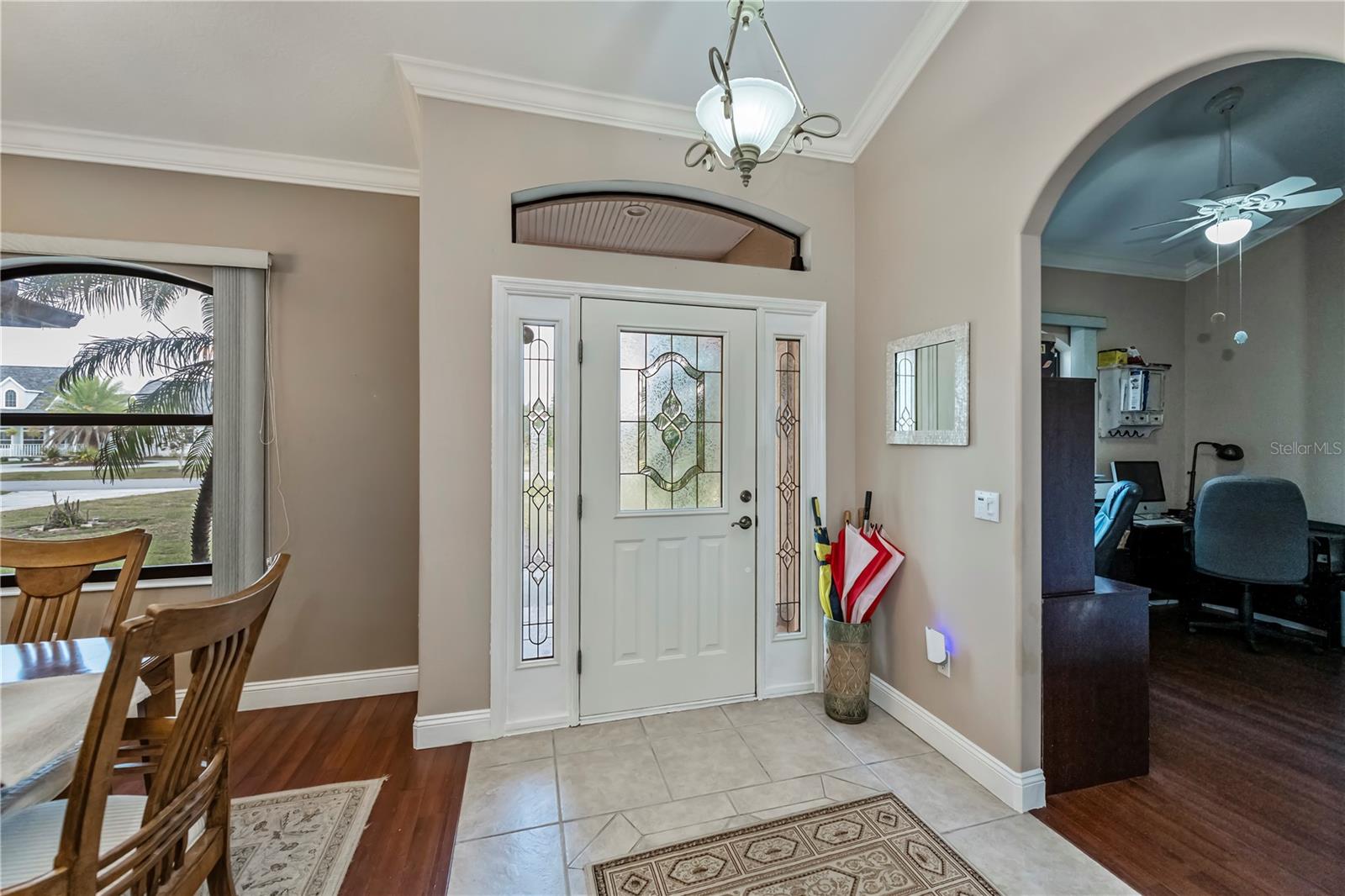 This beautiful four-bedroom, three-bath residence that includes a UNIQUE opportunity with a MAIN house and attached GUEST house situated on nearly an acre of land with water views. It features a corner lot location providing a high degree of privacy that backs up to a conservation area. The main house includes 3 spacious bedrooms, 2 full bathrooms, open floor plan, main level living, a separate dining room, living room, bonus room, office/den, eat-in kitchen and an enclosed lanai. Crown molding is installed throughout the main house and guest house. The sliders in the lanai open to a panoramic view of the screened heated pool, and plenty of space for entertaining and relaxing. The layout provides perfect indoor/outdoor living. The attached GUEST house includes 1 bedroom, 1 full bath, a kitchen, a living room, and a washer and dryer. This GUEST house has a private entrance and a tandem garage; is fully furnished and provides access to the pool. It is perfect for extended family, guests, an office or as an income-producing rental. This fenced property features a new roof (2021), upgraded water treatment system (2025) and a new heat pump (2023). This home with low HOA and no CDD fees truly offers the best of both worlds; peaceful country-style living with modern amenities and INCOME POTENTIAL. Nestled in peaceful lush old Florida forests and pastures, Oak Ford is conveniently close to shopping, beaches and restaurants.