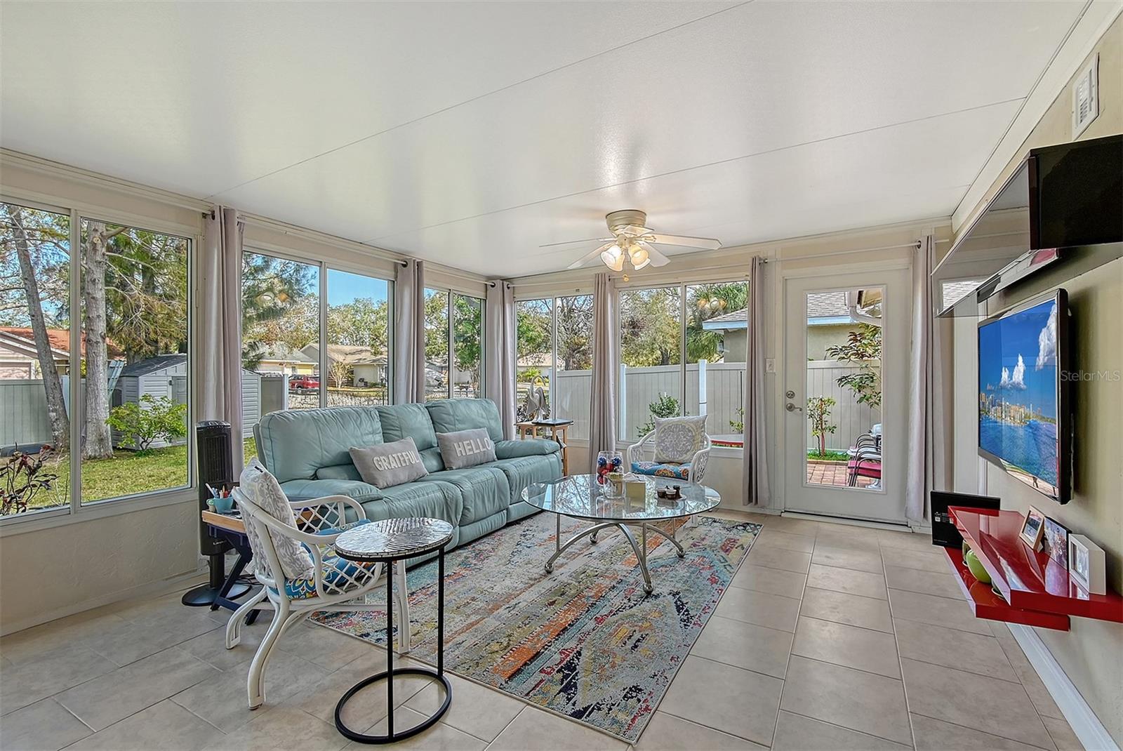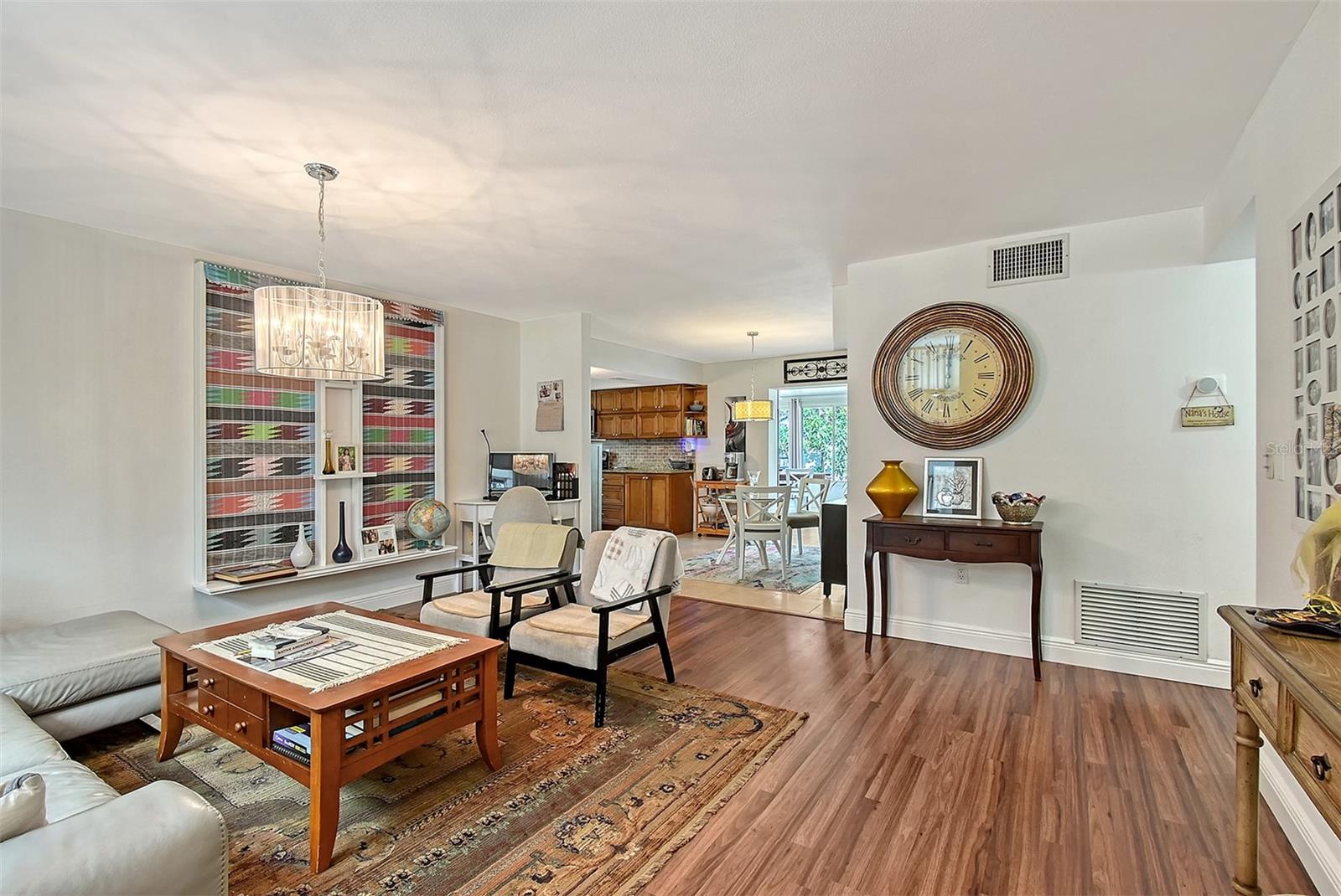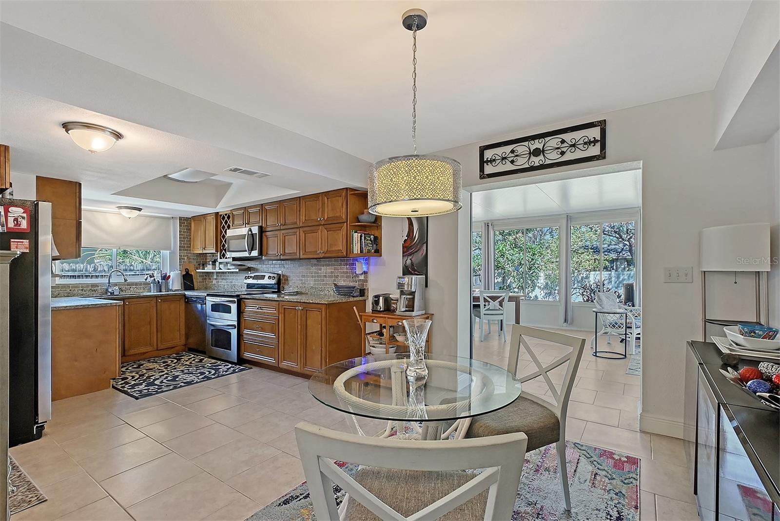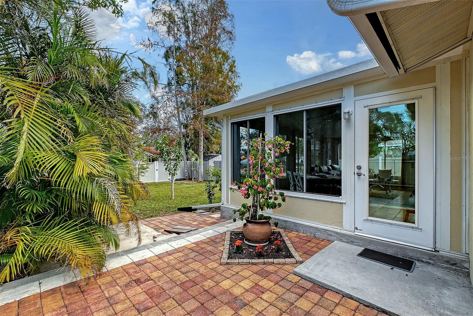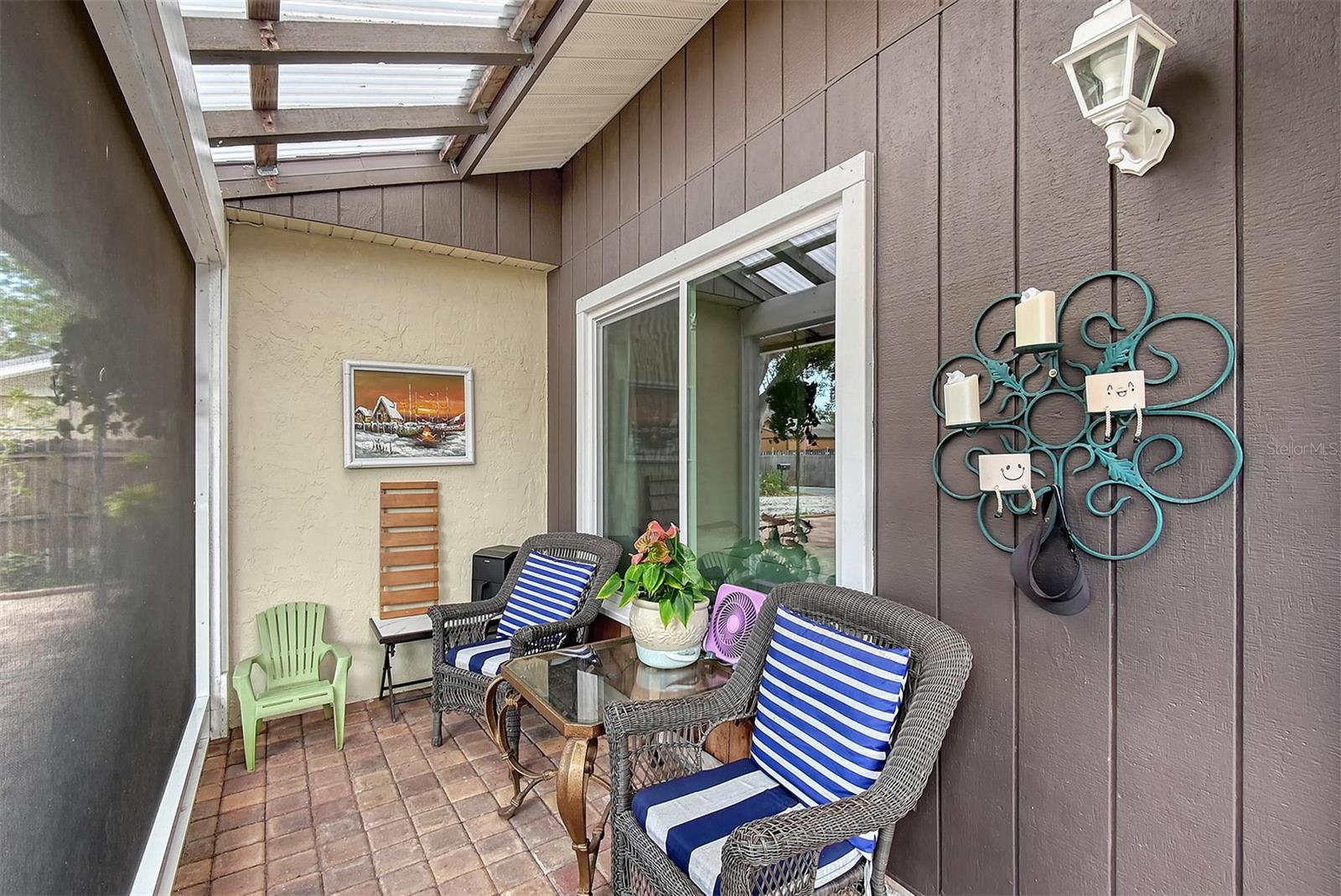 Hurry to this well kept home. It is the cutest home around. This 2 bedroom and 2 bath home has been remodeled tastefully. It is a beautiful open floor plan with a kitchen/dining room connected. The large kitchen has real wood cabinets and granite countertops. The living room and bedrooms have a wood look laminate and the rest of the home is ceramic tile. There is a large sunroom on the back of the house that brings wonderful light throughout the house. This home has hurricane windows and clear hurricane shutters for the sunroom. Enjoy sitting on the front screened in lanai. The backyard is large and very private. The lot attaches to the street behind and you could store a boat or trailer if needed. along with the one car garage there is a newer shed in the backyard. The owner has planted both the front and backyard with many trees and flowers. They finished the driveway and back patio with pavers. This home is centrally located and close to stores, restaurants and the beaches.